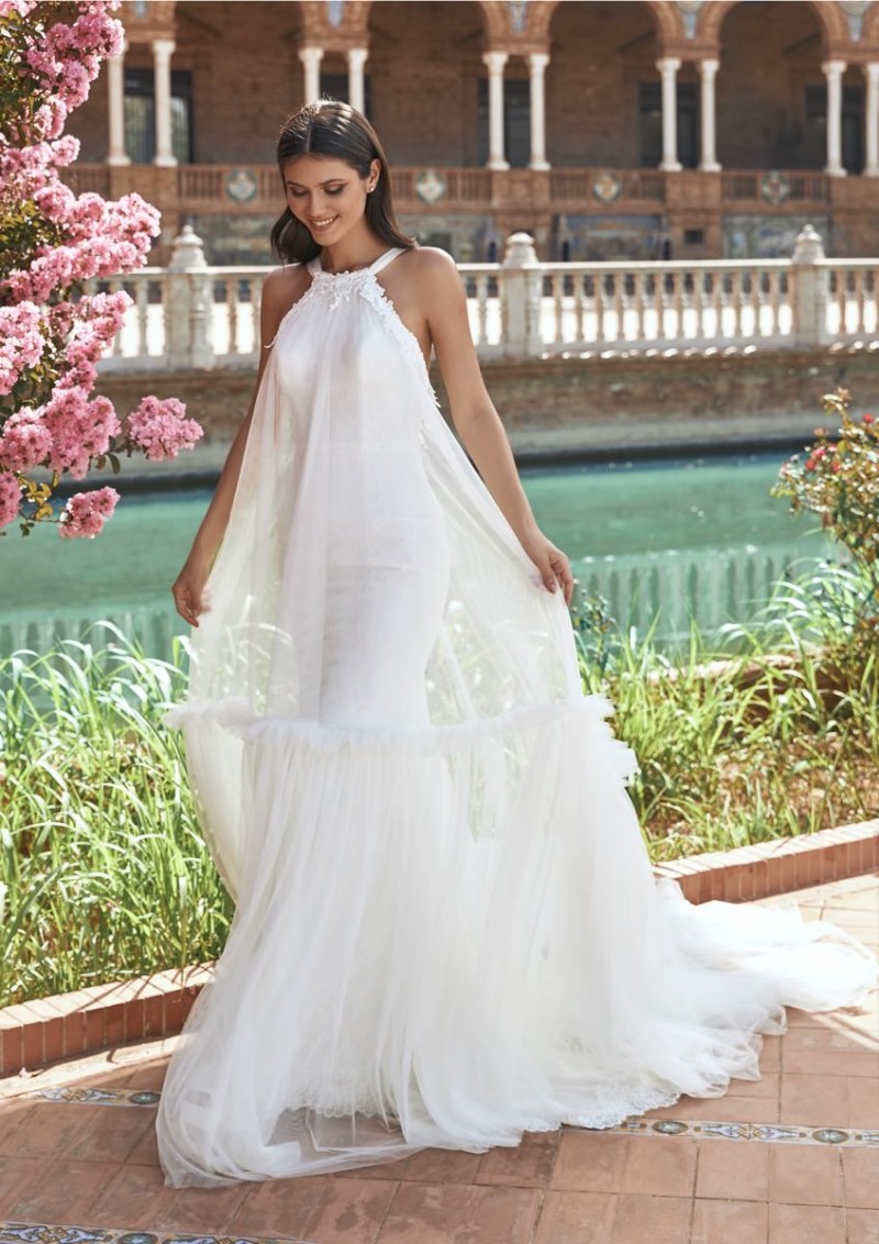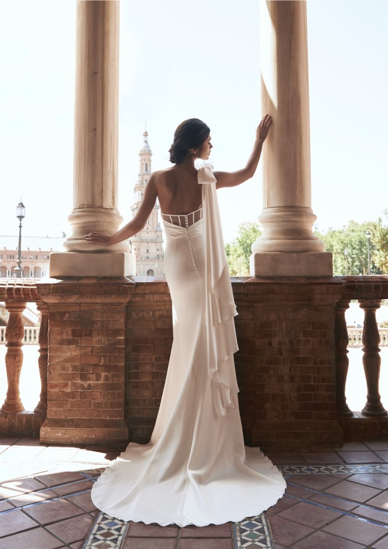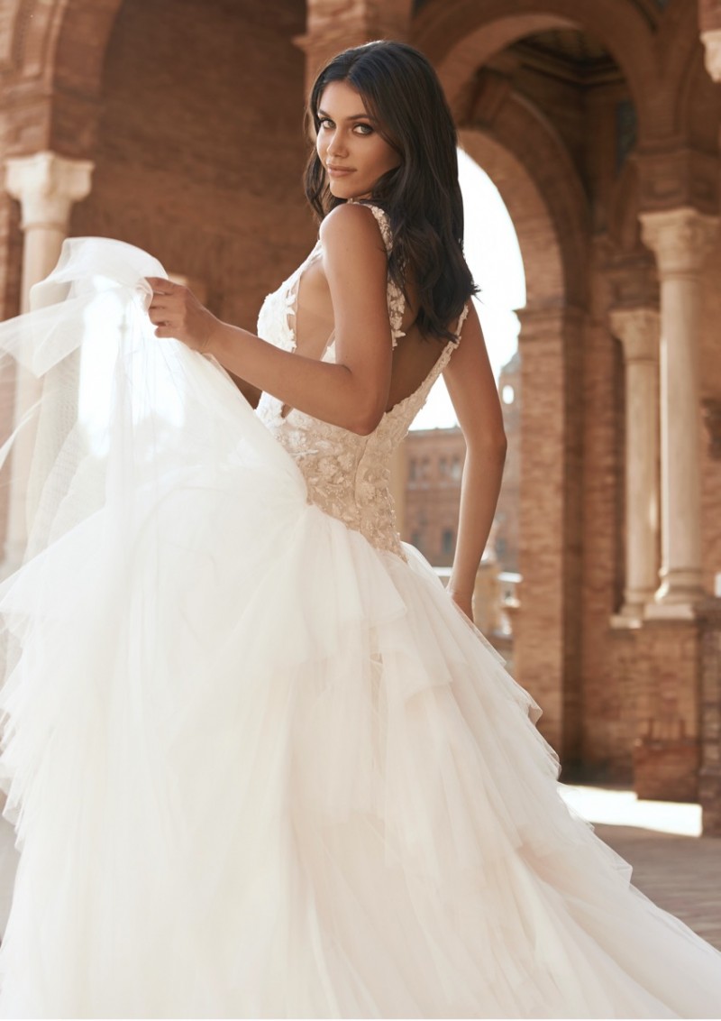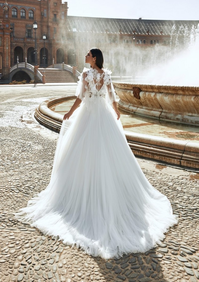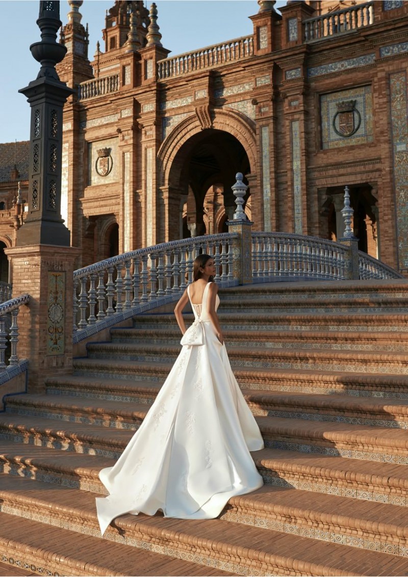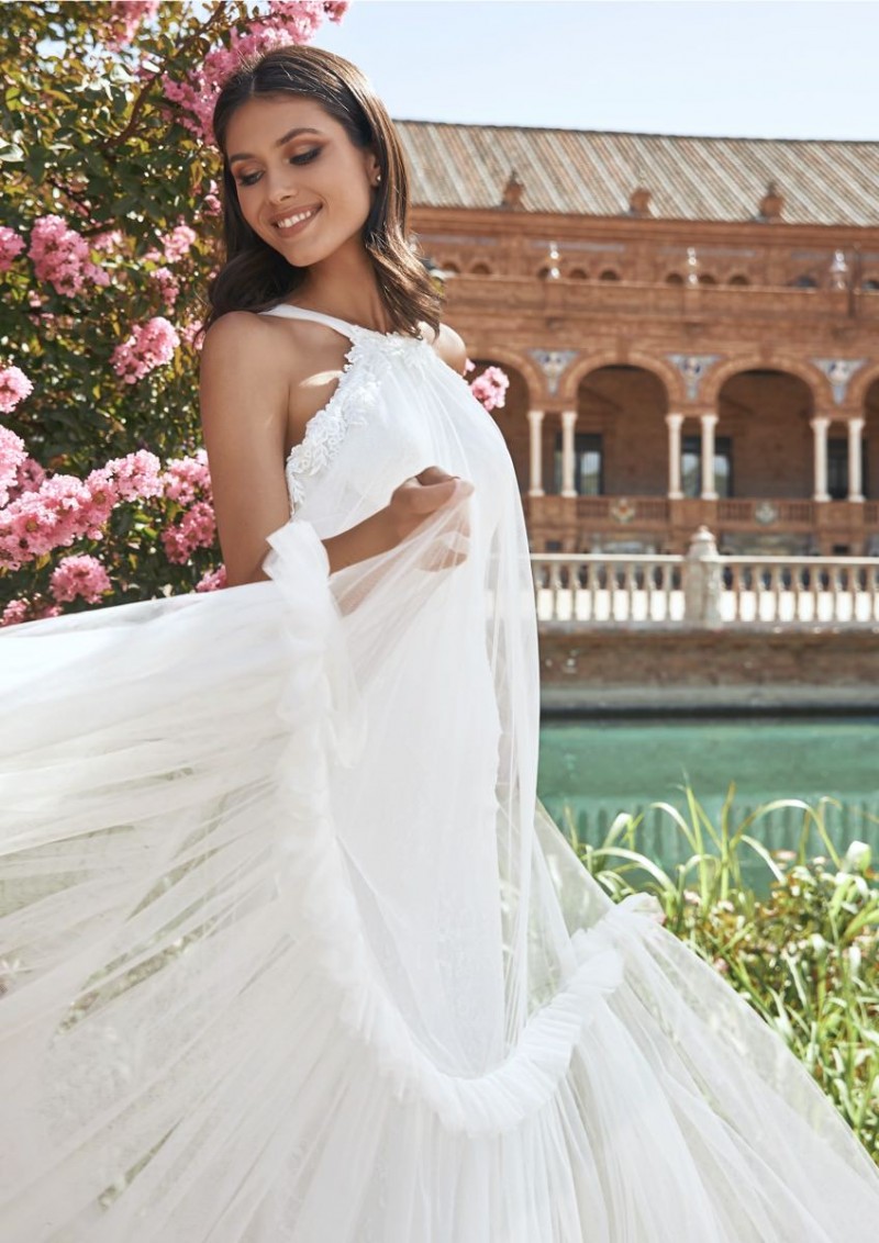 In der Kollektion hat das Brautkleid im Prinzessinnen-Stil einen atemberaubenden Auftritt mit CARRASCO und MARISOL, die beide majestätische, mehrlagige Tüllröcke auf raffinierten Silhouetten mit zarten Blumenapplikationen aufweisen, was sie absolut einzigartig macht. Für einen umwerfenden Meerjungfrauen-Look hat PAULANDA präzise andalusische Einflüsse in ihrer wunderschönen Fischschwanz-Schleppe, die mit Blumenapplikationen und weiten transparenten Ärmeln besticht, gestylt mit dem Flair eines Flamenco-Kleides. Das aus Mikado gefertigte Kleid FERNANDA ist ein Prinzessinnenkleid mit ausgeprägtem V-Ausschnitt und einem fabelhaften Rücken, der mit einer übergroßen bestickten Schleife verziert ist, deren Enden sanft zu einer Schleppe fallen.