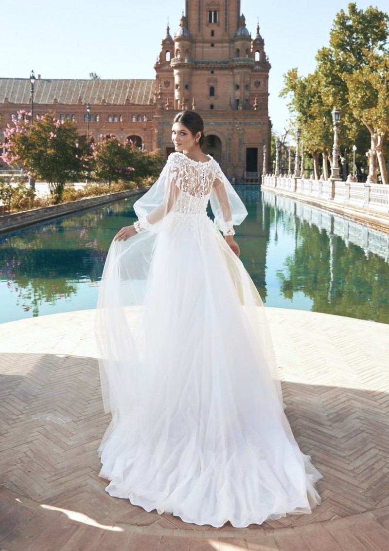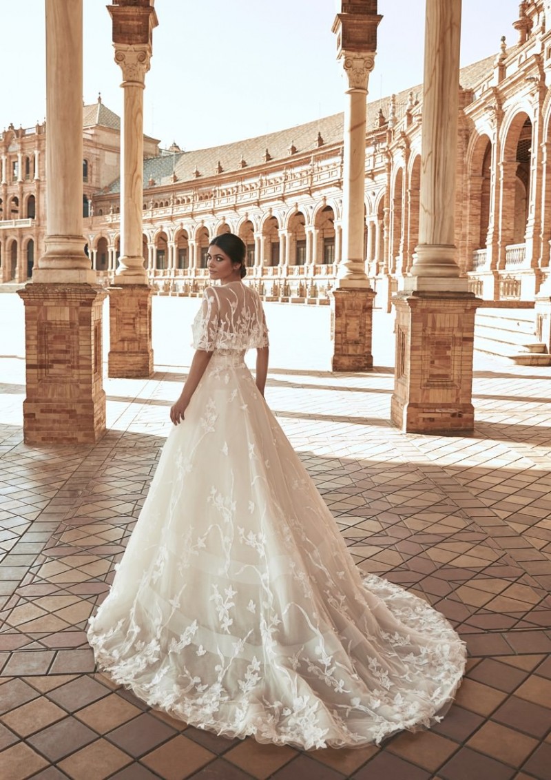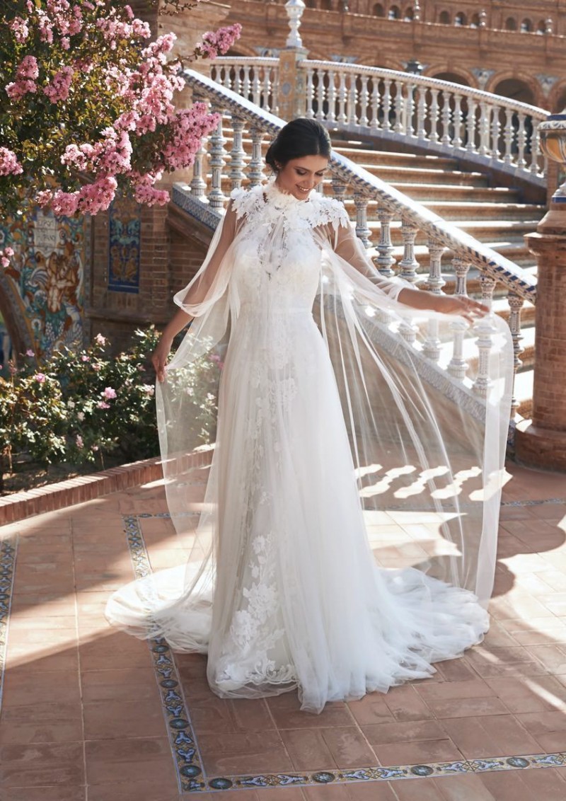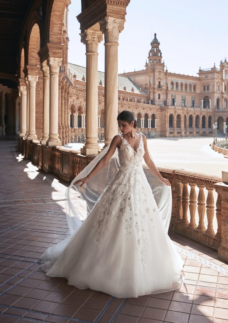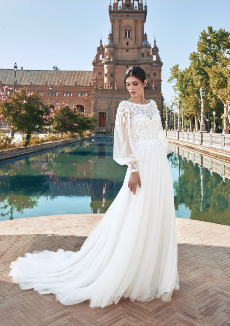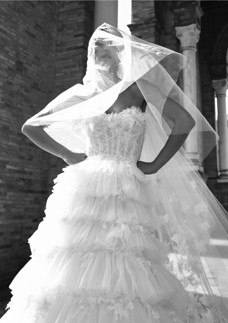 In der Kollektion hat das Brautkleid im Prinzessinnen-Stil einen atemberaubenden Auftritt mit CARRASCO und MARISOL, die beide majestätische, mehrlagige Tüllröcke auf raffinierten Silhouetten mit zarten Blumenapplikationen aufweisen, was sie absolut einzigartig macht. Für einen umwerfenden Meerjungfrauen-Look hat PAULANDA präzise andalusische Einflüsse in ihrer wunderschönen Fischschwanz-Schleppe, die mit Blumenapplikationen und weiten transparenten Ärmeln besticht, gestylt mit dem Flair eines Flamenco-Kleides. Das aus Mikado gefertigte Kleid FERNANDA ist ein Prinzessinnenkleid mit ausgeprägtem V-Ausschnitt und einem fabelhaften Rücken, der mit einer übergroßen bestickten Schleife verziert ist, deren Enden sanft zu einer Schleppe fallen.