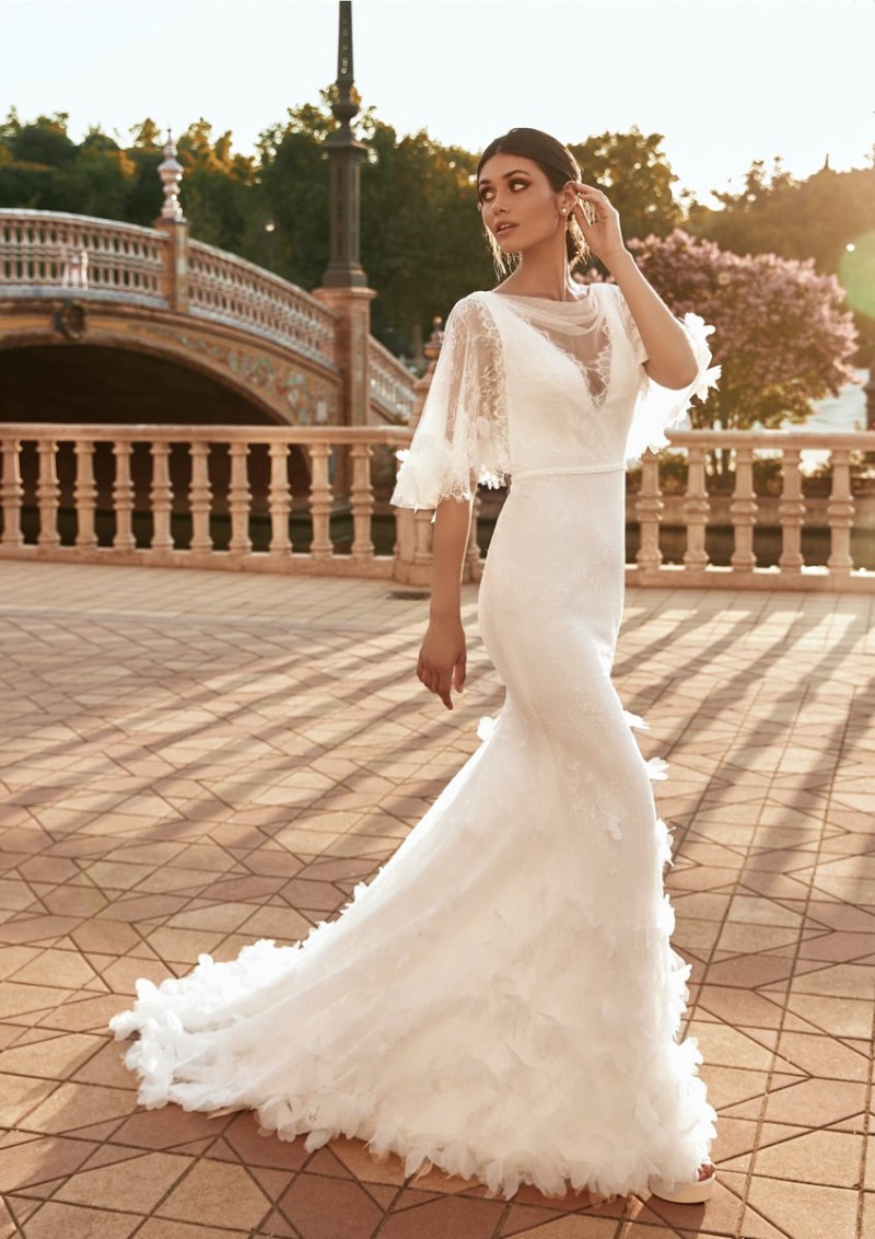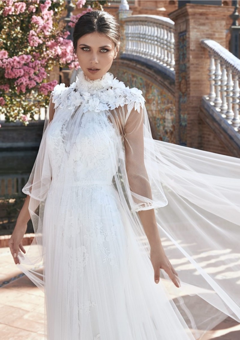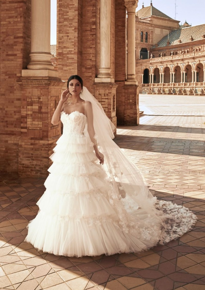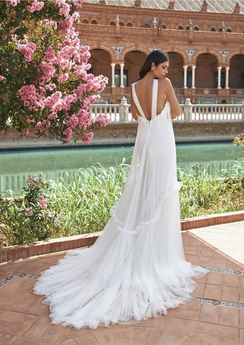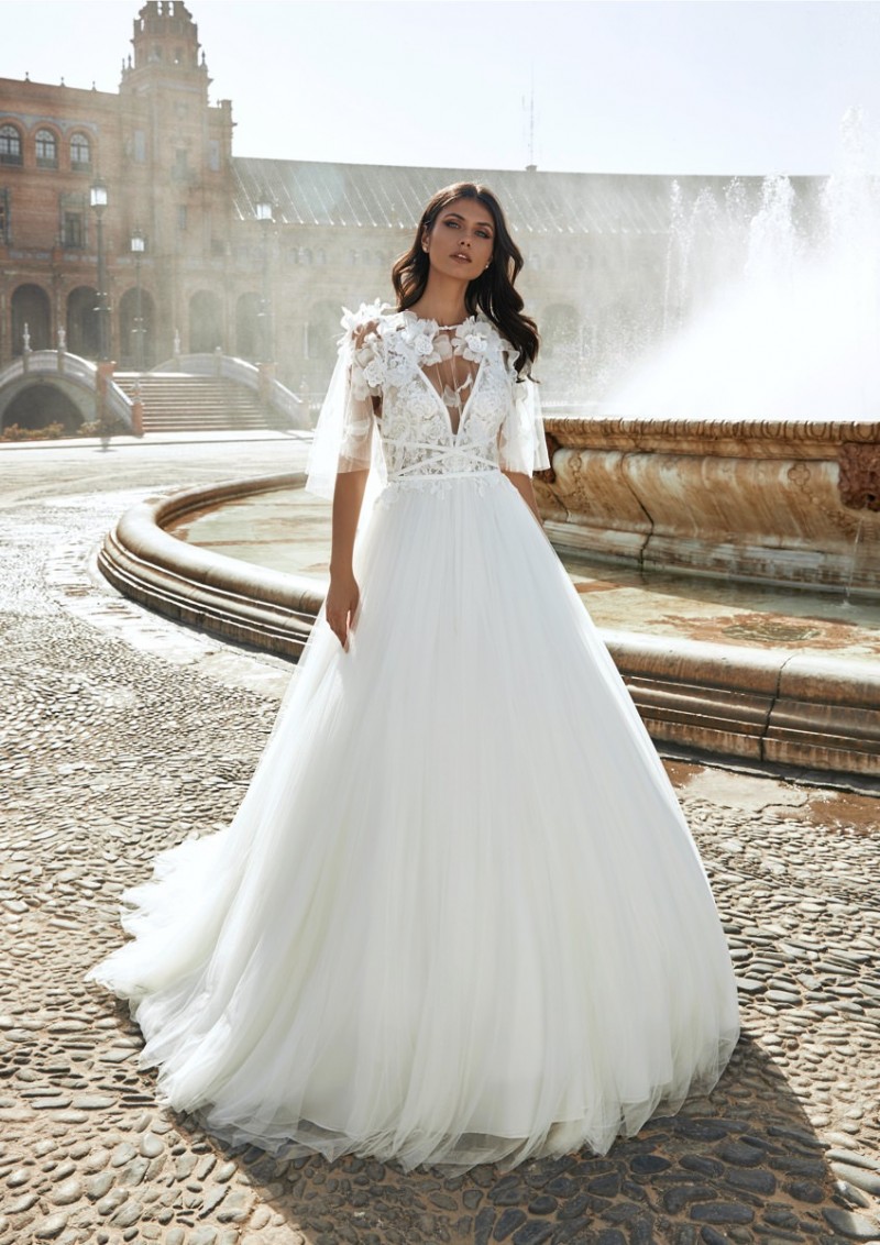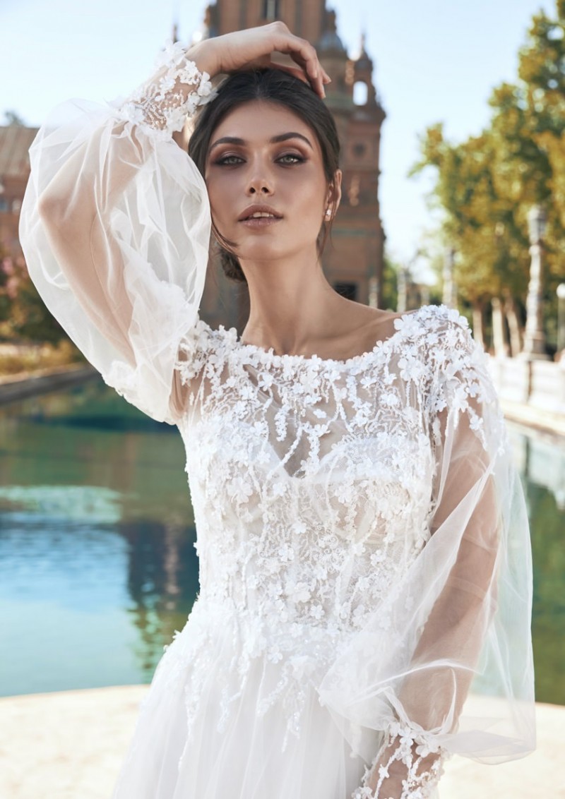 In der Kollektion hat das Brautkleid im Prinzessinnen-Stil einen atemberaubenden Auftritt mit CARRASCO und MARISOL, die beide majestätische, mehrlagige Tüllröcke auf raffinierten Silhouetten mit zarten Blumenapplikationen aufweisen, was sie absolut einzigartig macht. Für einen umwerfenden Meerjungfrauen-Look hat PAULANDA präzise andalusische Einflüsse in ihrer wunderschönen Fischschwanz-Schleppe, die mit Blumenapplikationen und weiten transparenten Ärmeln besticht, gestylt mit dem Flair eines Flamenco-Kleides. Das aus Mikado gefertigte Kleid FERNANDA ist ein Prinzessinnenkleid mit ausgeprägtem V-Ausschnitt und einem fabelhaften Rücken, der mit einer übergroßen bestickten Schleife verziert ist, deren Enden sanft zu einer Schleppe fallen.