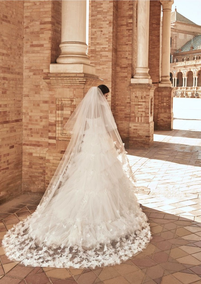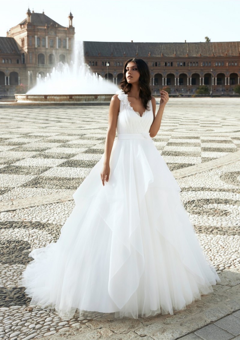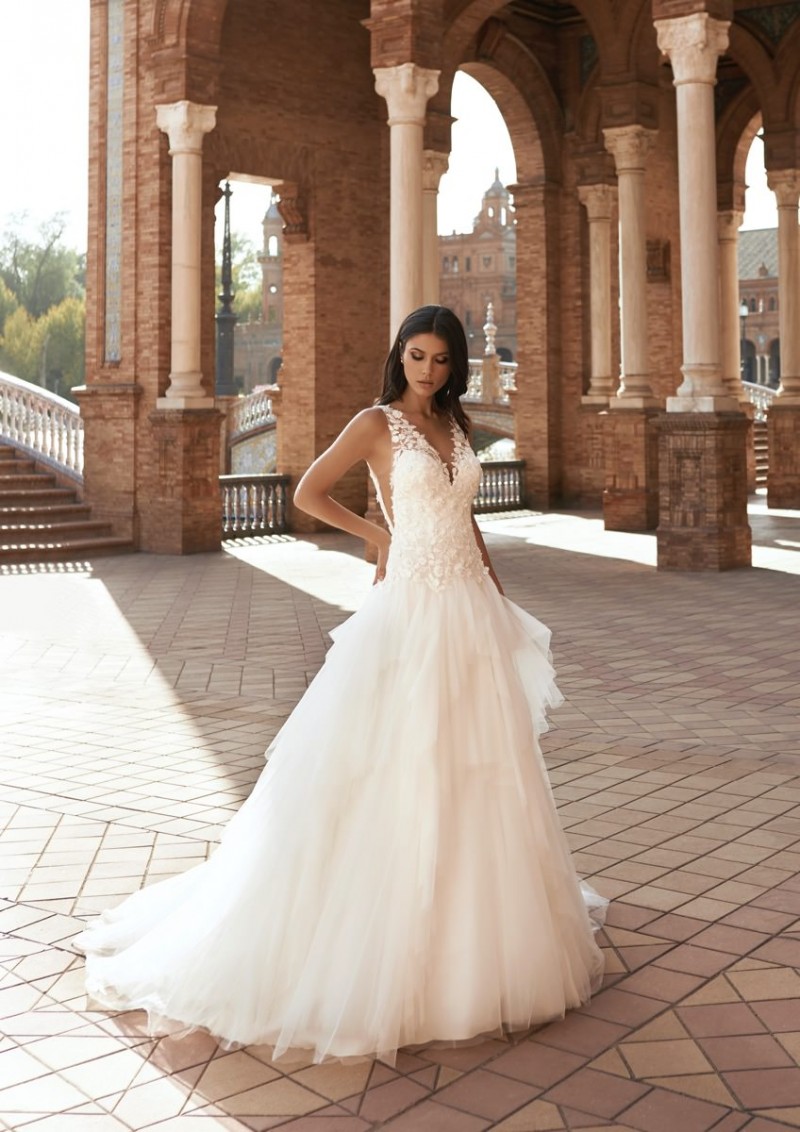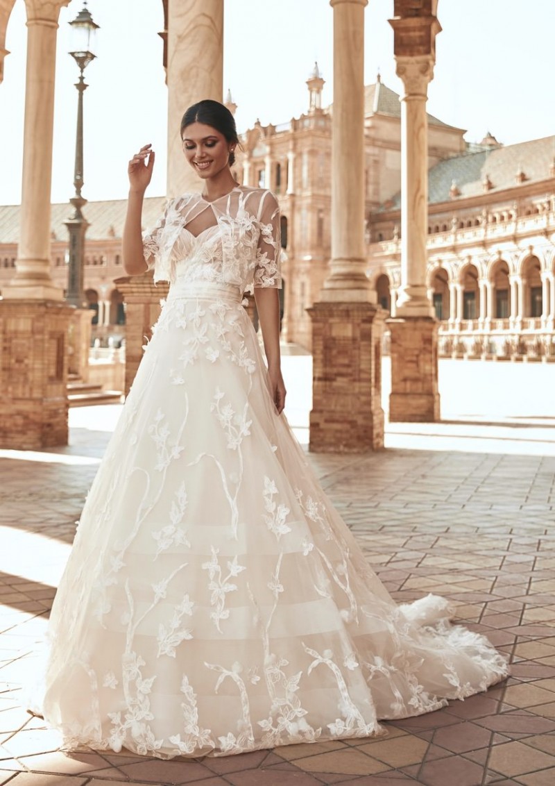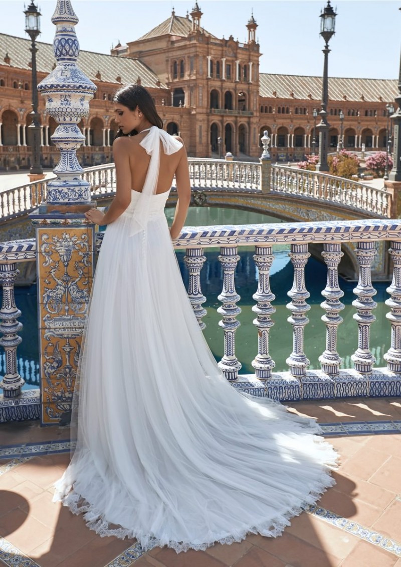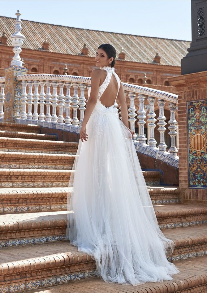In der Kollektion hat das Brautkleid im Prinzessinnen-Stil einen atemberaubenden Auftritt mit CARRASCO und MARISOL, die beide majestätische, mehrlagige Tüllröcke auf raffinierten Silhouetten mit zarten Blumenapplikationen aufweisen, was sie absolut einzigartig macht. Für einen umwerfenden Meerjungfrauen-Look hat PAULANDA präzise andalusische Einflüsse in ihrer wunderschönen Fischschwanz-Schleppe, die mit Blumenapplikationen und weiten transparenten Ärmeln besticht, gestylt mit dem Flair eines Flamenco-Kleides. Das aus Mikado gefertigte Kleid FERNANDA ist ein Prinzessinnenkleid mit ausgeprägtem V-Ausschnitt und einem fabelhaften Rücken, der mit einer übergroßen bestickten Schleife verziert ist, deren Enden sanft zu einer Schleppe fallen.