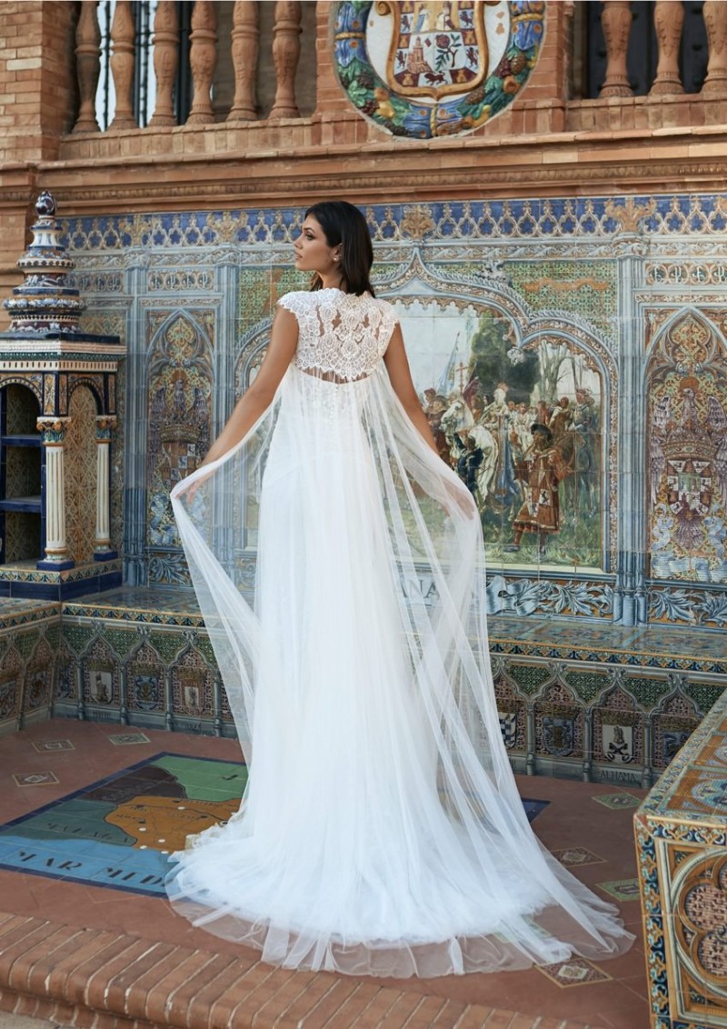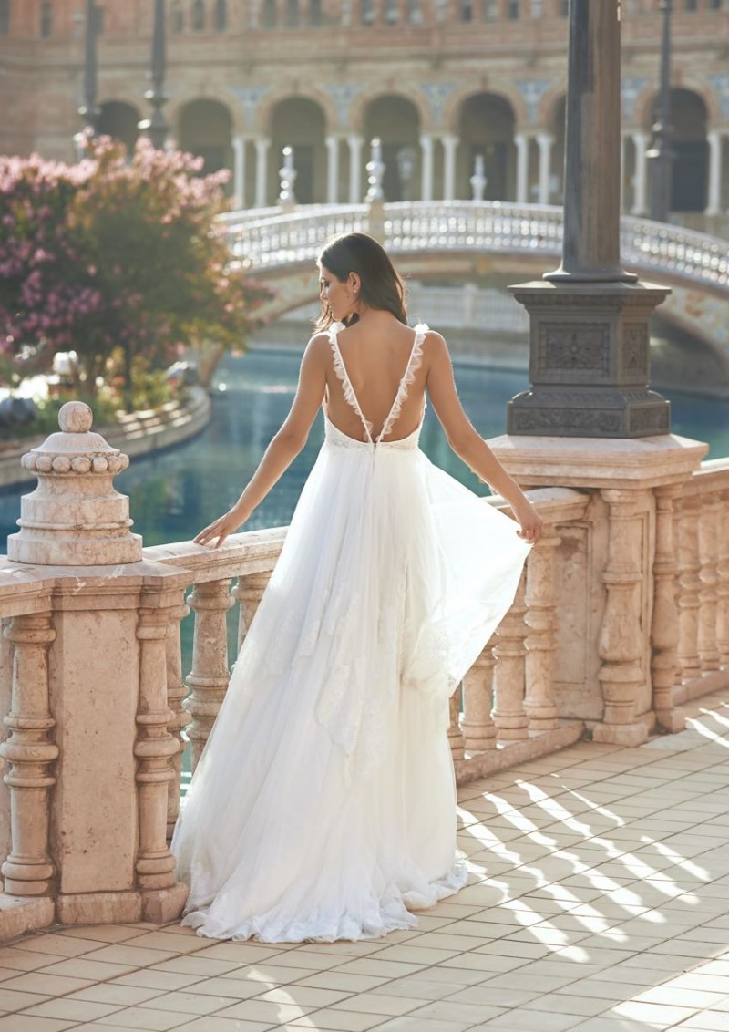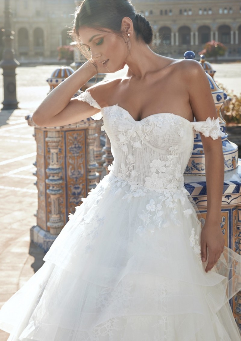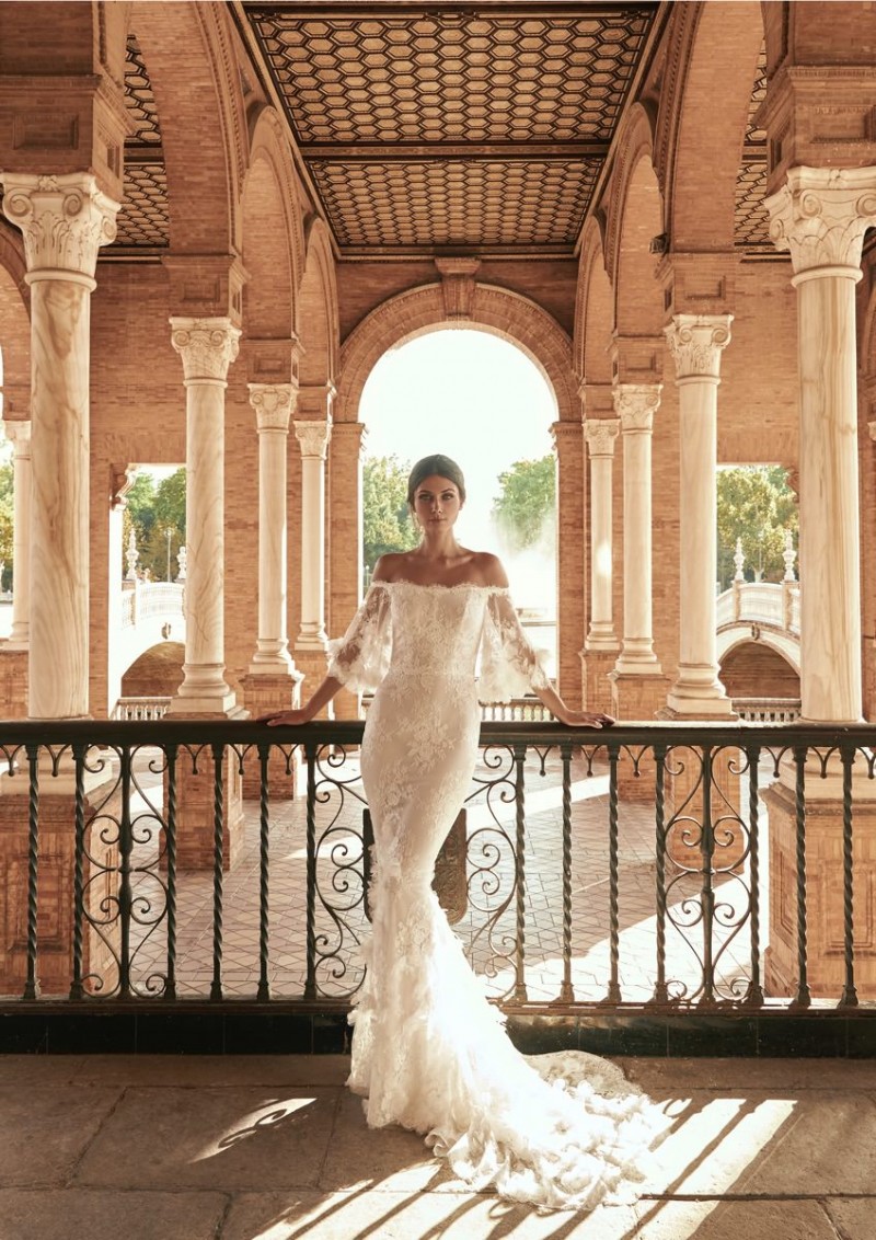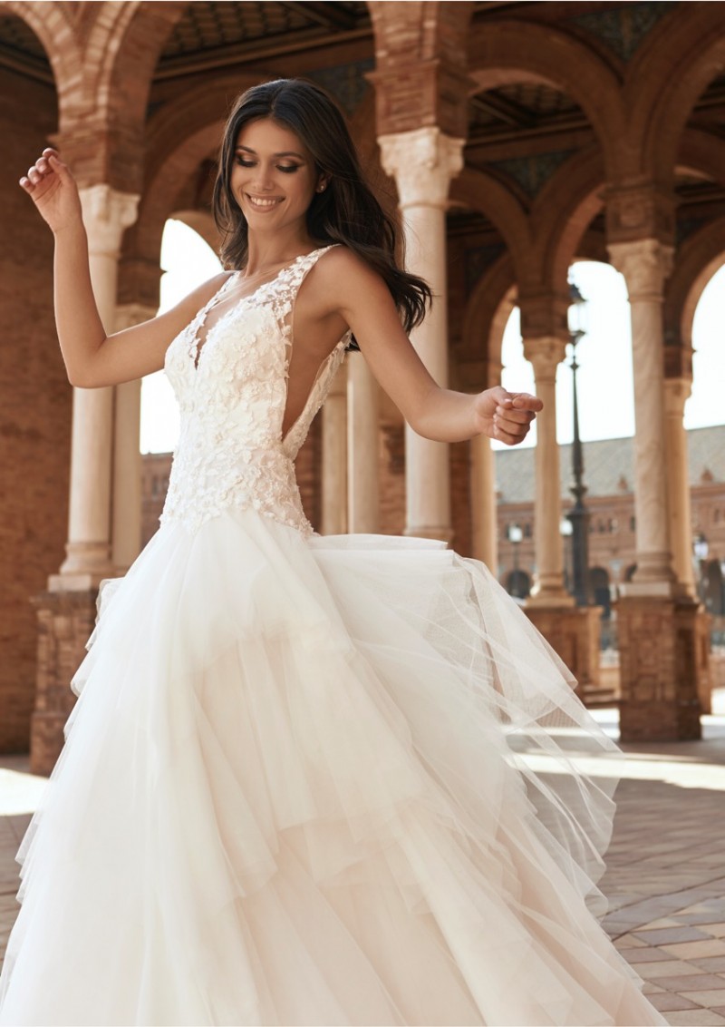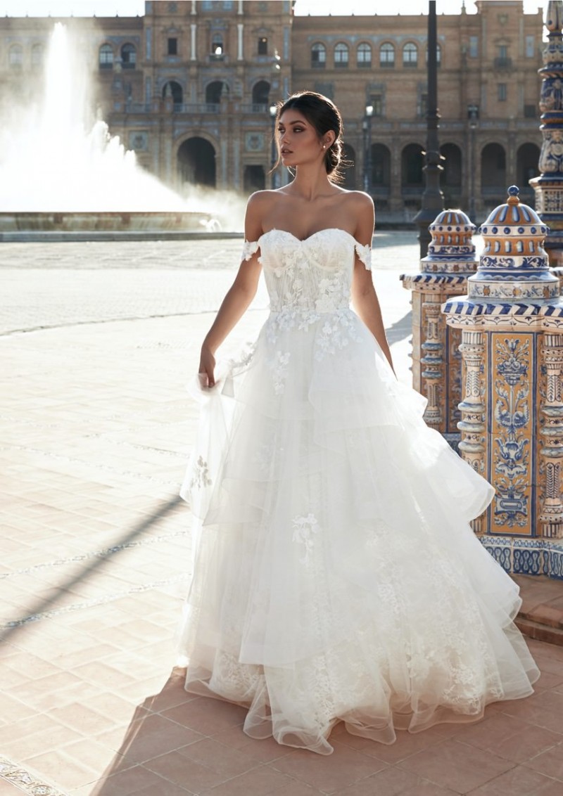 In der Kollektion hat das Brautkleid im Prinzessinnen-Stil einen atemberaubenden Auftritt mit CARRASCO und MARISOL, die beide majestätische, mehrlagige Tüllröcke auf raffinierten Silhouetten mit zarten Blumenapplikationen aufweisen, was sie absolut einzigartig macht. Für einen umwerfenden Meerjungfrauen-Look hat PAULANDA präzise andalusische Einflüsse in ihrer wunderschönen Fischschwanz-Schleppe, die mit Blumenapplikationen und weiten transparenten Ärmeln besticht, gestylt mit dem Flair eines Flamenco-Kleides. Das aus Mikado gefertigte Kleid FERNANDA ist ein Prinzessinnenkleid mit ausgeprägtem V-Ausschnitt und einem fabelhaften Rücken, der mit einer übergroßen bestickten Schleife verziert ist, deren Enden sanft zu einer Schleppe fallen.