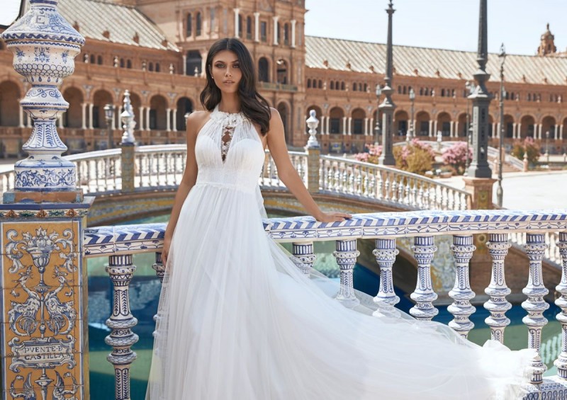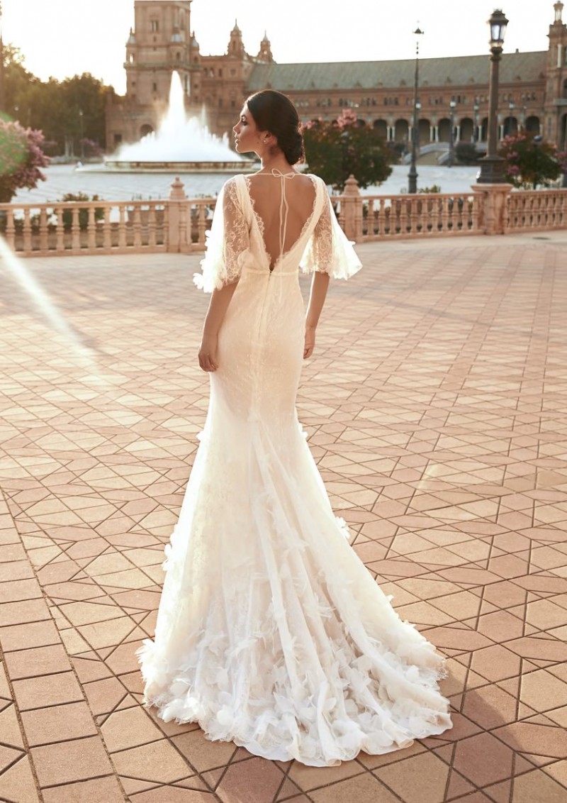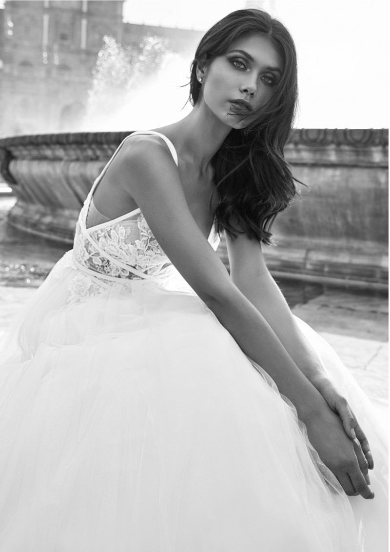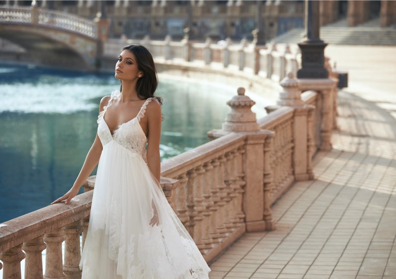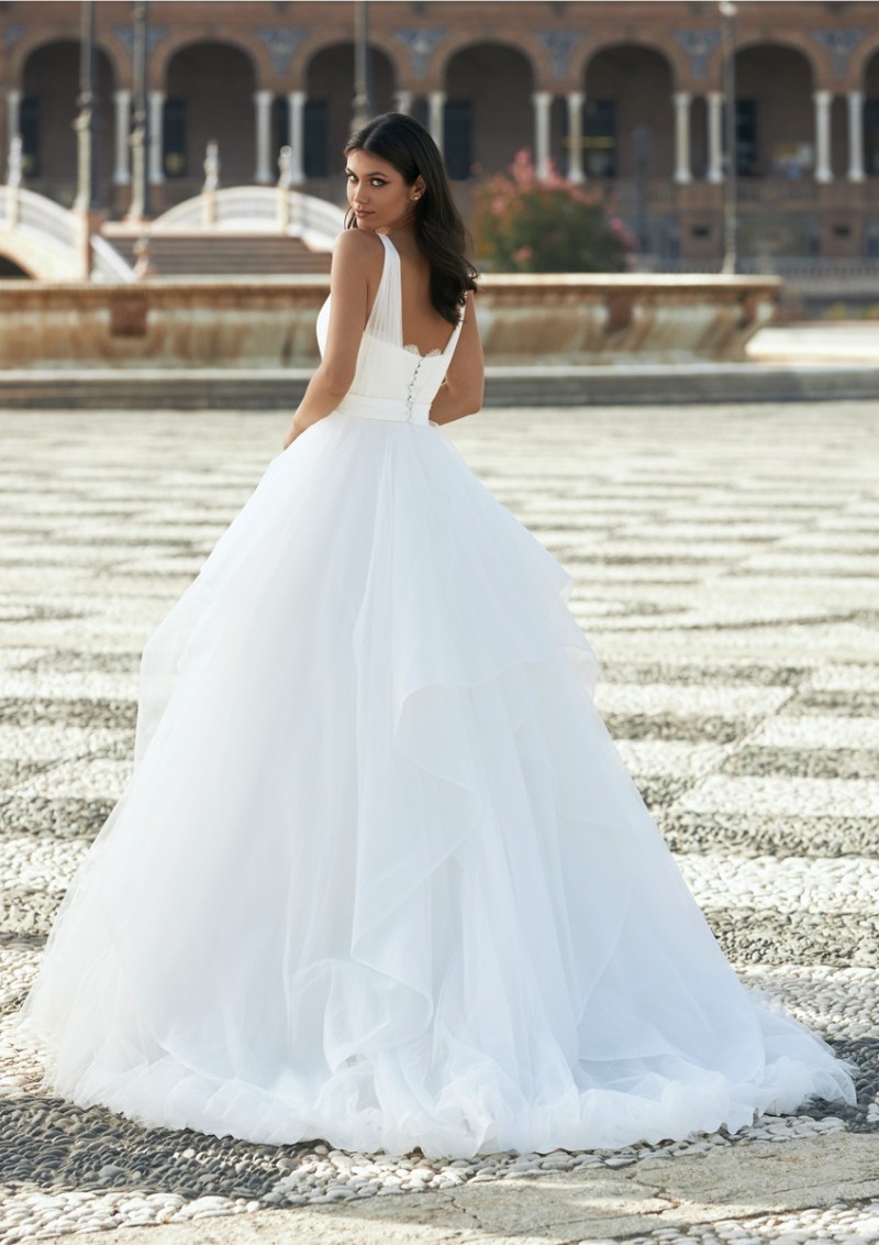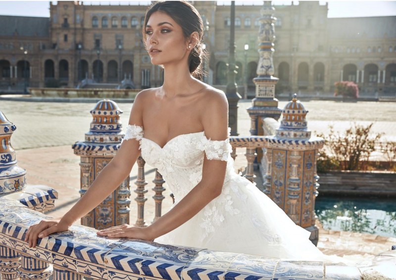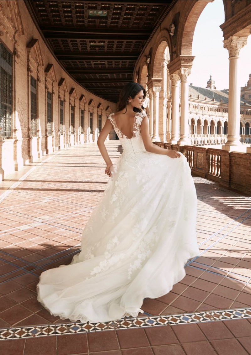 In der Kollektion hat das Brautkleid im Prinzessinnen-Stil einen atemberaubenden Auftritt mit CARRASCO und MARISOL, die beide majestätische, mehrlagige Tüllröcke auf raffinierten Silhouetten mit zarten Blumenapplikationen aufweisen, was sie absolut einzigartig macht. Für einen umwerfenden Meerjungfrauen-Look hat PAULANDA präzise andalusische Einflüsse in ihrer wunderschönen Fischschwanz-Schleppe, die mit Blumenapplikationen und weiten transparenten Ärmeln besticht, gestylt mit dem Flair eines Flamenco-Kleides. Das aus Mikado gefertigte Kleid FERNANDA ist ein Prinzessinnenkleid mit ausgeprägtem V-Ausschnitt und einem fabelhaften Rücken, der mit einer übergroßen bestickten Schleife verziert ist, deren Enden sanft zu einer Schleppe fallen.