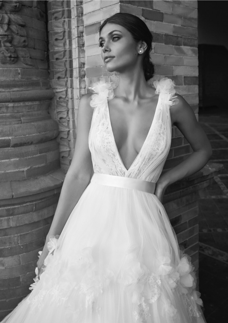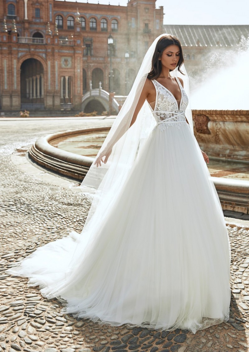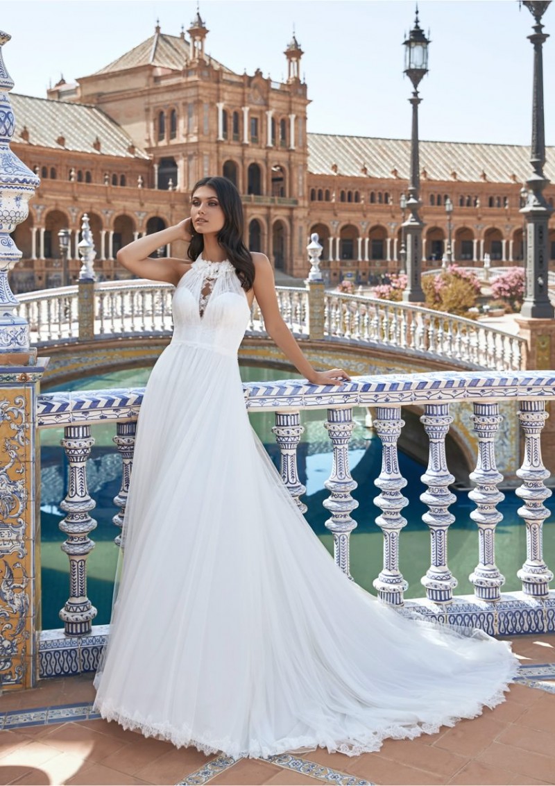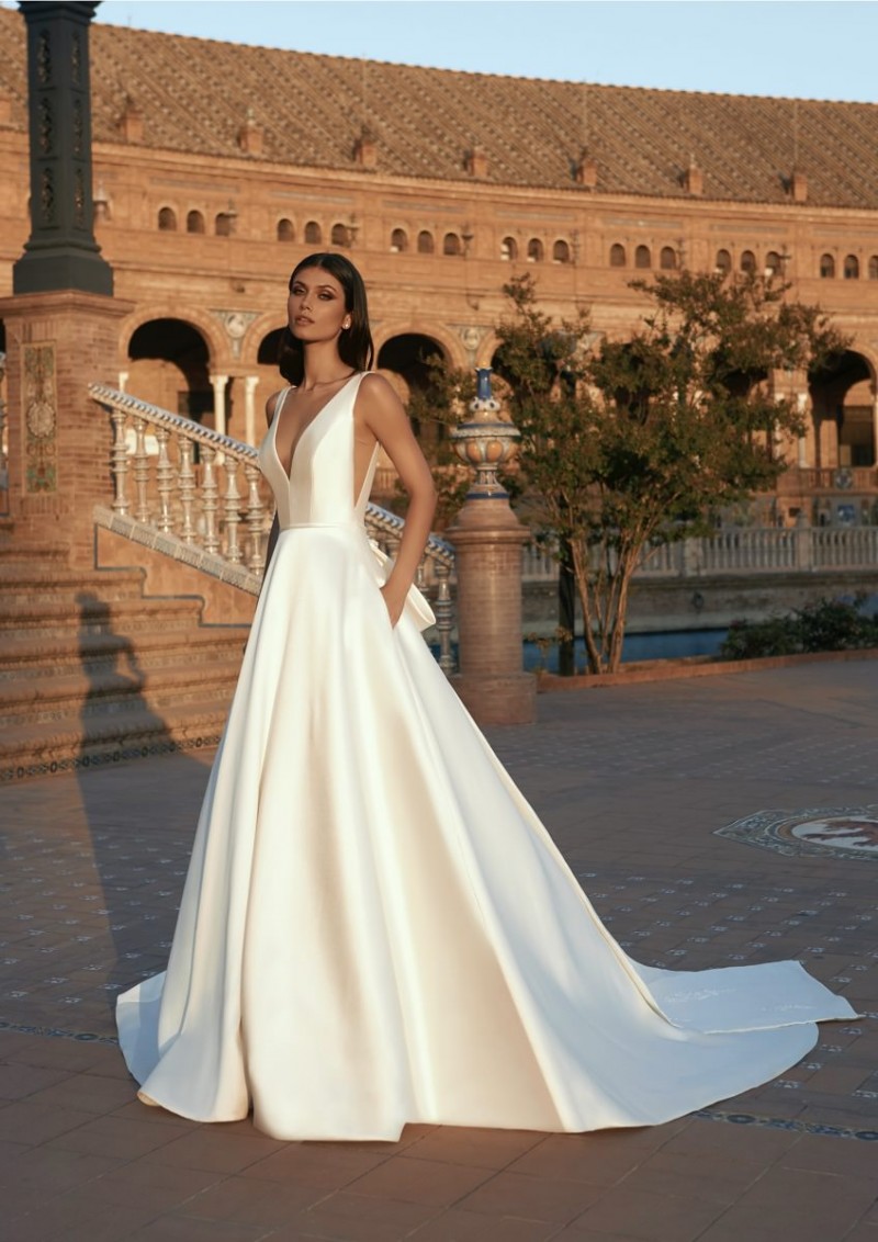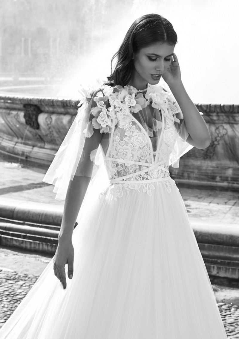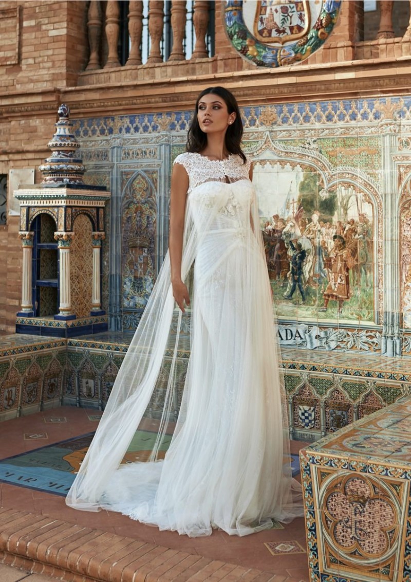 In der Kollektion hat das Brautkleid im Prinzessinnen-Stil einen atemberaubenden Auftritt mit CARRASCO und MARISOL, die beide majestätische, mehrlagige Tüllröcke auf raffinierten Silhouetten mit zarten Blumenapplikationen aufweisen, was sie absolut einzigartig macht. Für einen umwerfenden Meerjungfrauen-Look hat PAULANDA präzise andalusische Einflüsse in ihrer wunderschönen Fischschwanz-Schleppe, die mit Blumenapplikationen und weiten transparenten Ärmeln besticht, gestylt mit dem Flair eines Flamenco-Kleides. Das aus Mikado gefertigte Kleid FERNANDA ist ein Prinzessinnenkleid mit ausgeprägtem V-Ausschnitt und einem fabelhaften Rücken, der mit einer übergroßen bestickten Schleife verziert ist, deren Enden sanft zu einer Schleppe fallen.