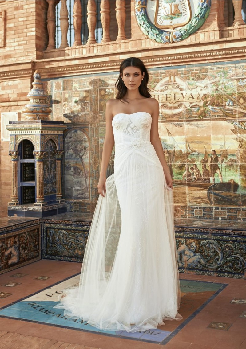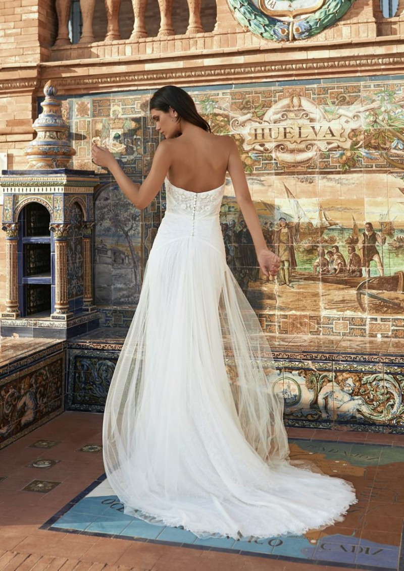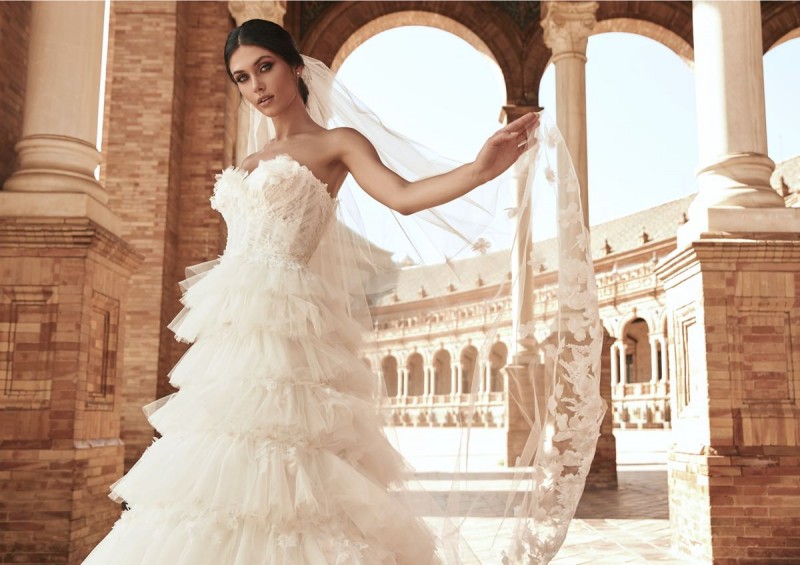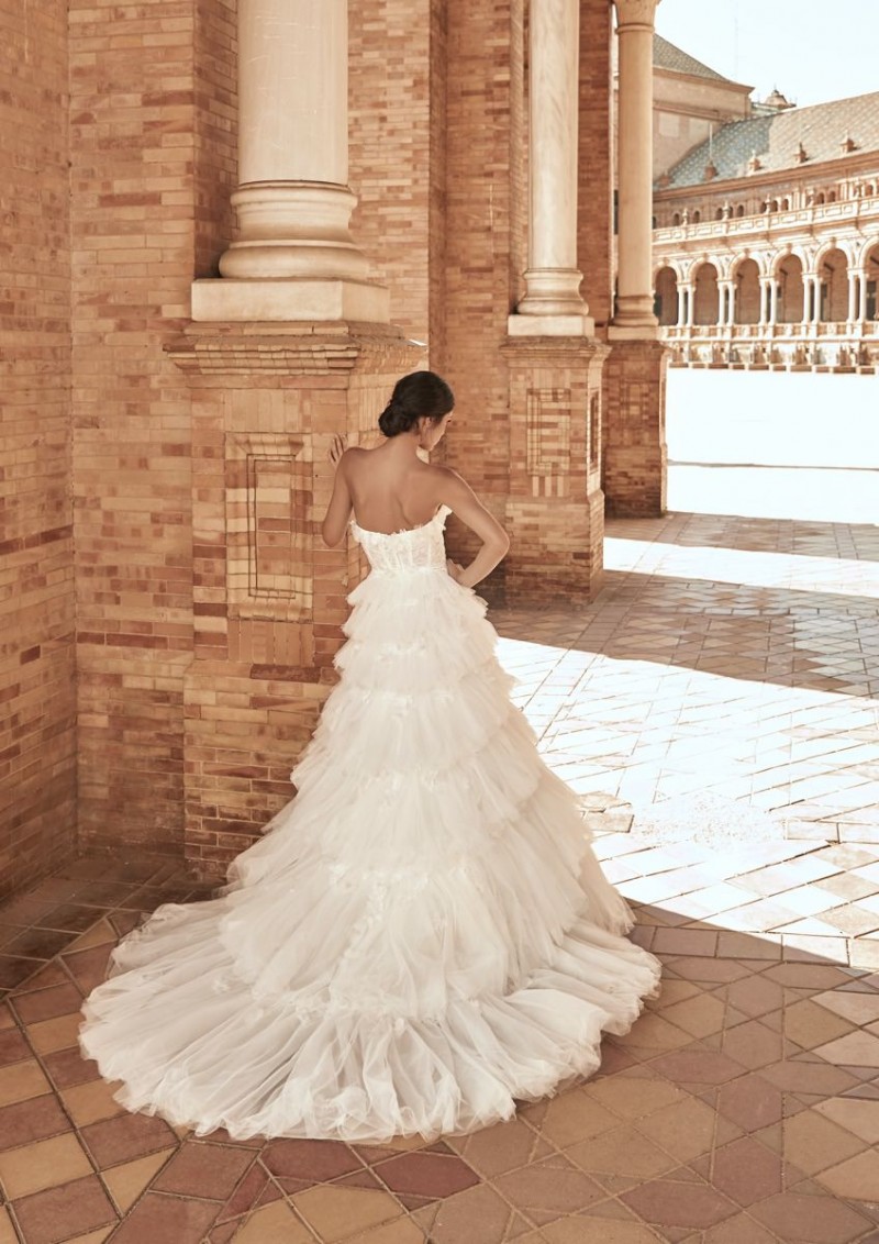 Die Kollektion Marchesa for Pronovias verbindet New Yorker Braut-Couture mit der Leidenschaft Spaniens. Die Entwürfe verbinden das romantische Markenzeichen von Marchesa mit mediterraner Sinnlichkeit. Die Kollektion wurde insbesondere von Sevilla inspiriert und bezieht sich auf die kulturelle Raffinesse, das verführerische Licht und die Farben der Stadt, kombiniert mit einem leidenschaftlichen Flamenco-Backbeat.