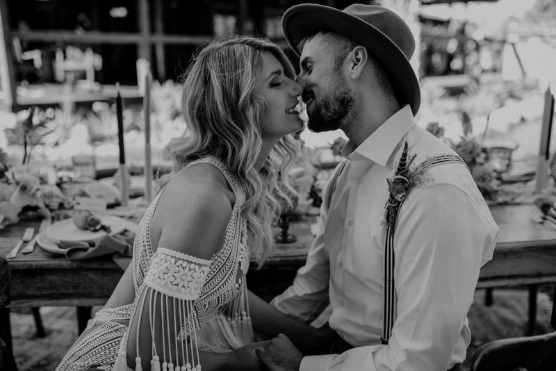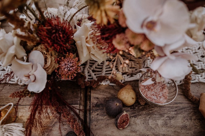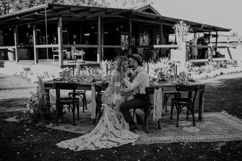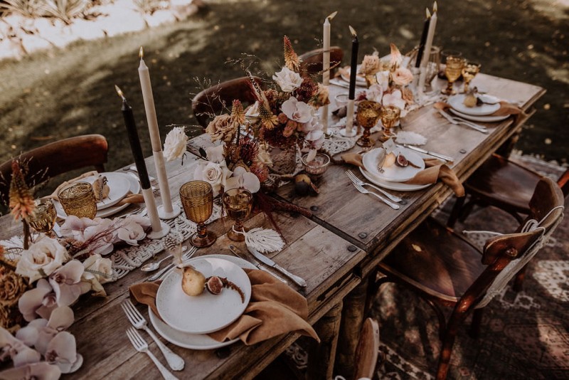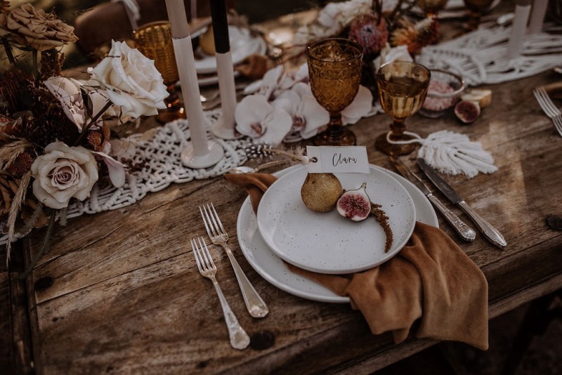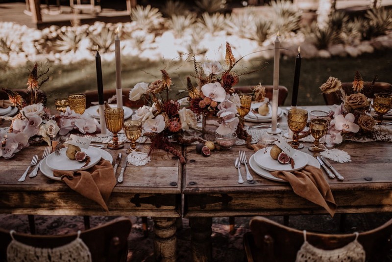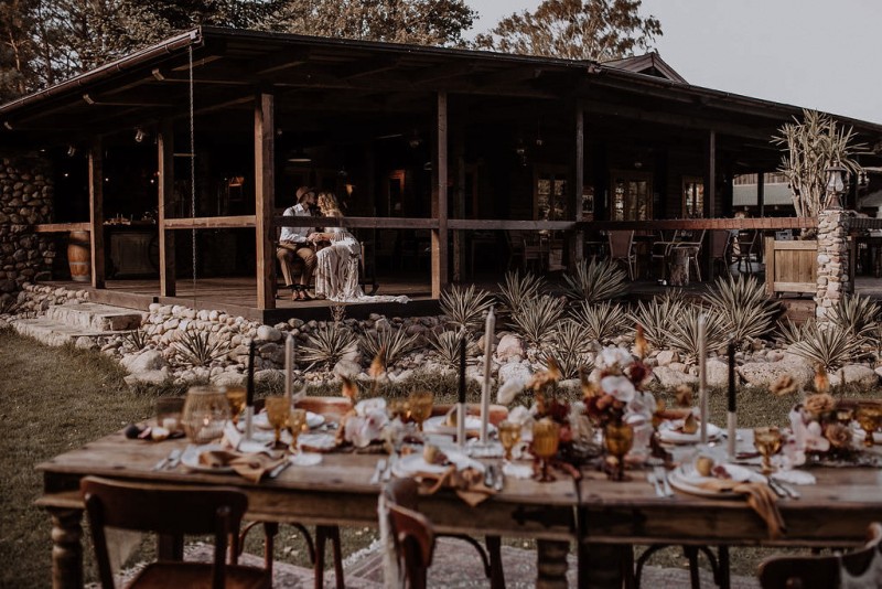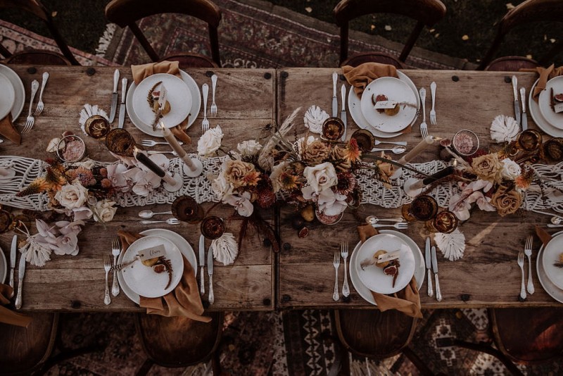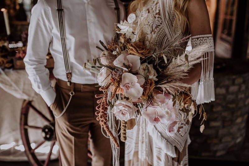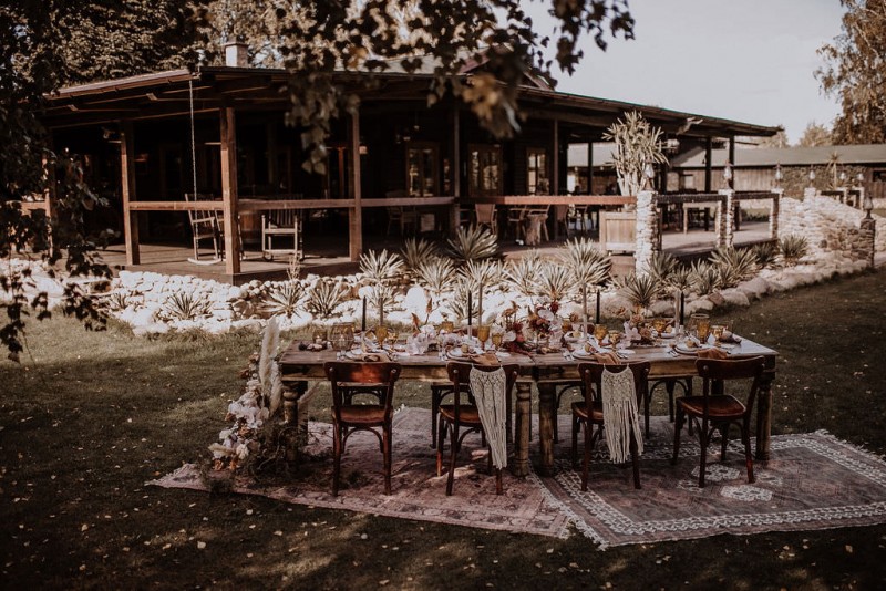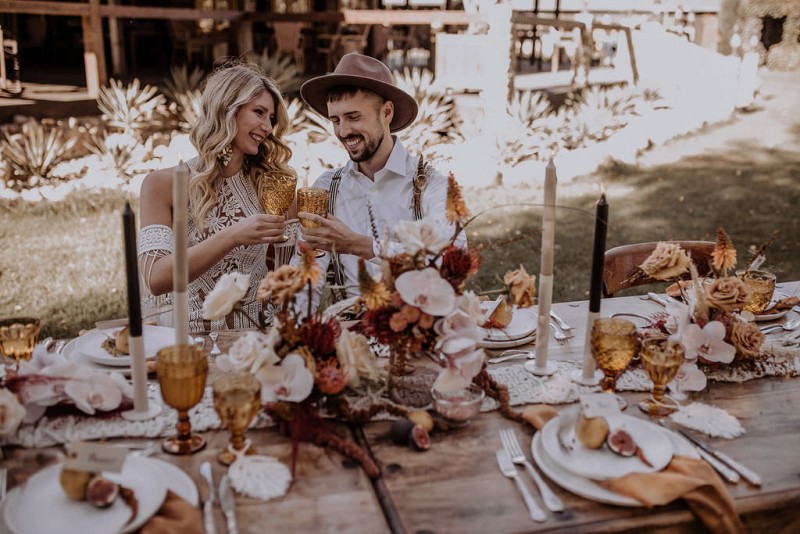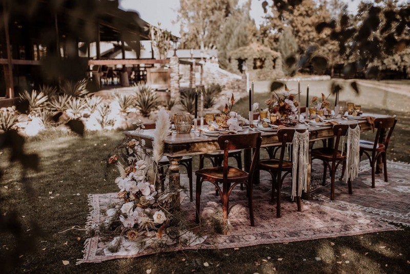 Umgeben vom besonderen Charm der unberührten Ranch findet sich das erste Highlight dieser Inspiration. Eine große Festtafel unter freiem Himmel. Sowohl die wunderschöne Hochzeitdekoration vom Dekorationsverleih One Fancy Fox, als auch die opulente Hochzeitsfloristik von Madelaine Eventfloristik, fügen sich dem eher bodenständigen Country Stil. Keine Traumfänger, dafür viele Makramees, sowie natürliche Materialien wie Leinen, Wolle, Holz, Silber und schwarzes Metall. Auf dem großen rustikalen Holztisch verziert ein Makrameeläufer die natürliche Maserung. Weiße Keramikteller, antikes Besteck aus Silber und Kerzenständer mit langen Stabkerzen in Grau-Beige und Schwarz umspielen die außergewöhnlichen Blumenarrangements dieses Dinnersettings. Männlich und rau schmiegen sich die erdigen sowie rötlichen Farbtöne an die weiblichen Züge der zarten Orchideen. Abgerundet durch die orangene Akzente der Trinkgläser und der Servietten aus Samt, detailverliebt in Szene gesetzt durch die handgeknoteten Makrameefedern an den Gläsern.