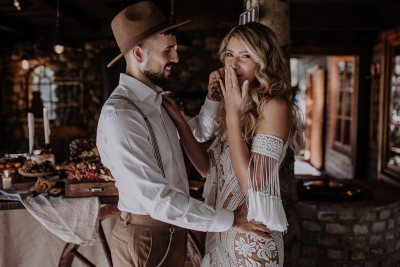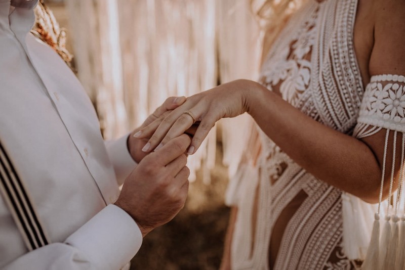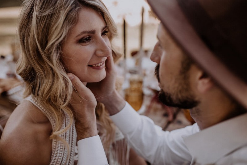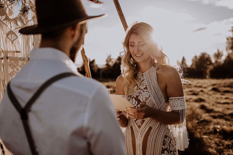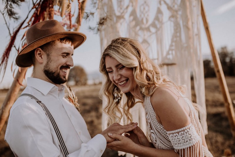 Clara & Max sind es, die dieses außergewöhnliche Hochzeitssetting genießen durften und sich bei einem romantischen Elopement unter einem geschmückten Tipi, und umgeben von Pferden, das Ja-Wort, samt Ringtausch mit den Eheringen von Cirer Manufaktur, gaben. Die wunderschöne Braut trägt dabei einen Bohotraum von Brautkleid vom Label Rue de Seine, das es im Brautmodengeschäft Seeweiss zu erwerben gibt. Zu den feinen Details aus Makramee, Tasseln und den edlen Ornamenten auf dem semitransparenten Stoff in Nude, sowie der ausladenden Schleppe, zauberte ihr Constanze Wendt ein zartes Makeup, ebenfalls in erdigen Tönen, und frisierte ihr langes blondes Haar offen. Der wilde Brautstrauß, ebenfalls kreiert von Madelaine Eventfloristik, umspielte diesen grandiosen Look mit hängenden Trockenblumen und cremefarbenen Edelrosen. Max trug einen schokobraunen Anzug von Monokel Berlin mit passendem Hut und braun gestreiften Hosenträgern.