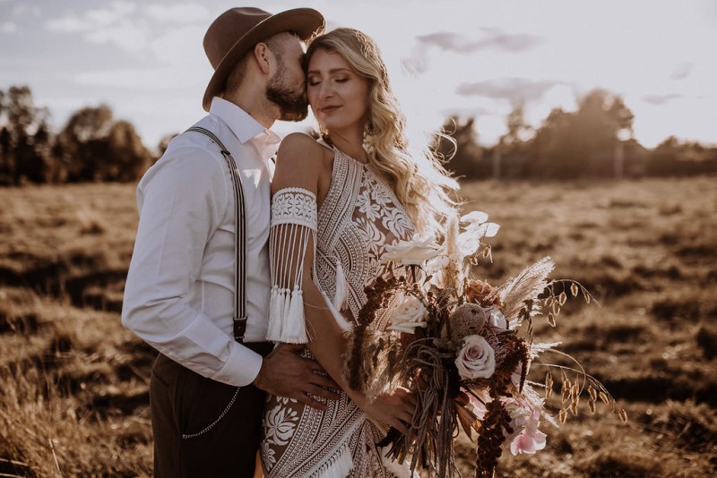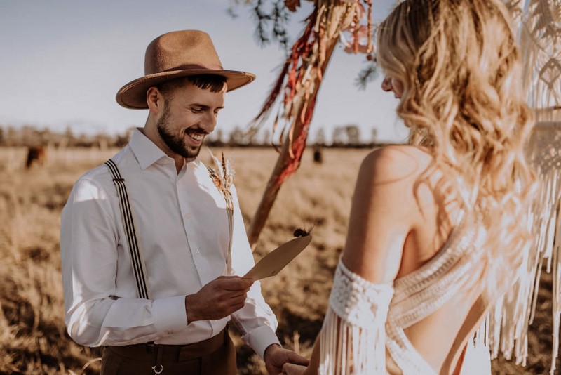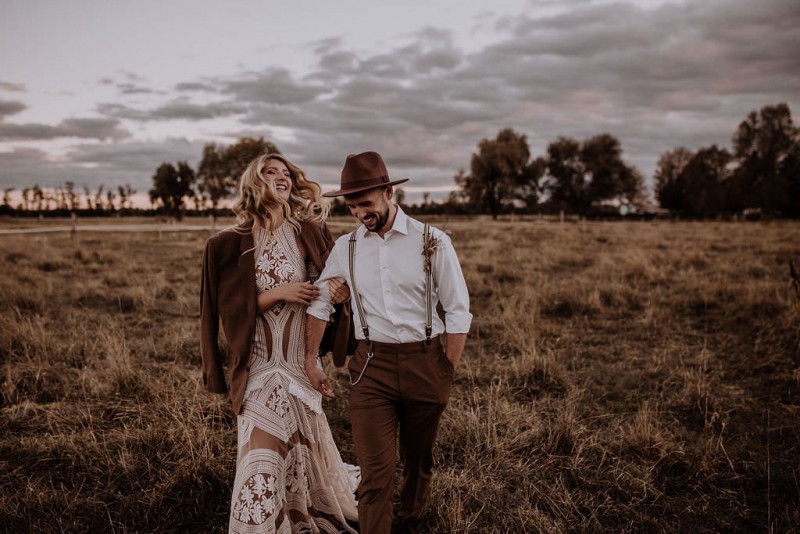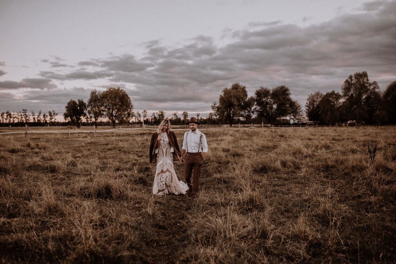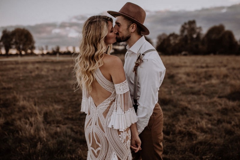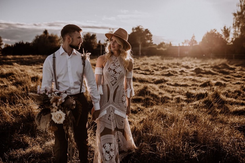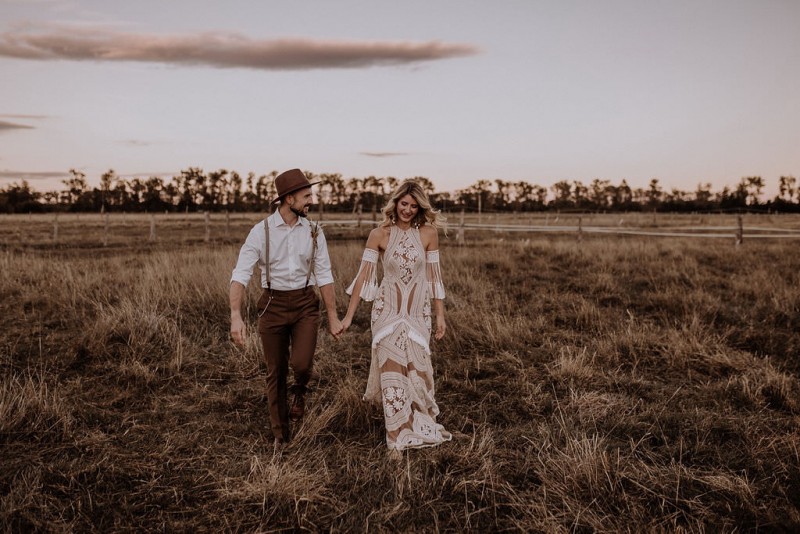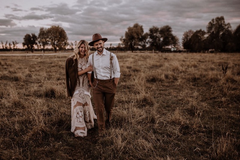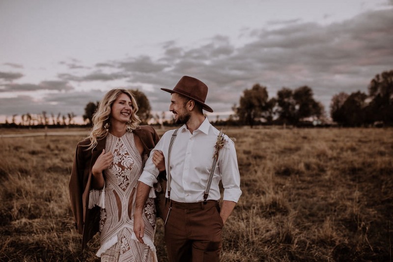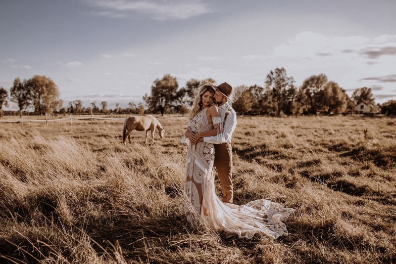 Diesen beiden, auf die Felder der großen Ranch zu folgen ist einfach zu schön um wahr zu sein. Und genau das dürft ihr jetzt tun! Genießt die atemberaubende Szenerie dieser Bohohochzeit im Western Style!