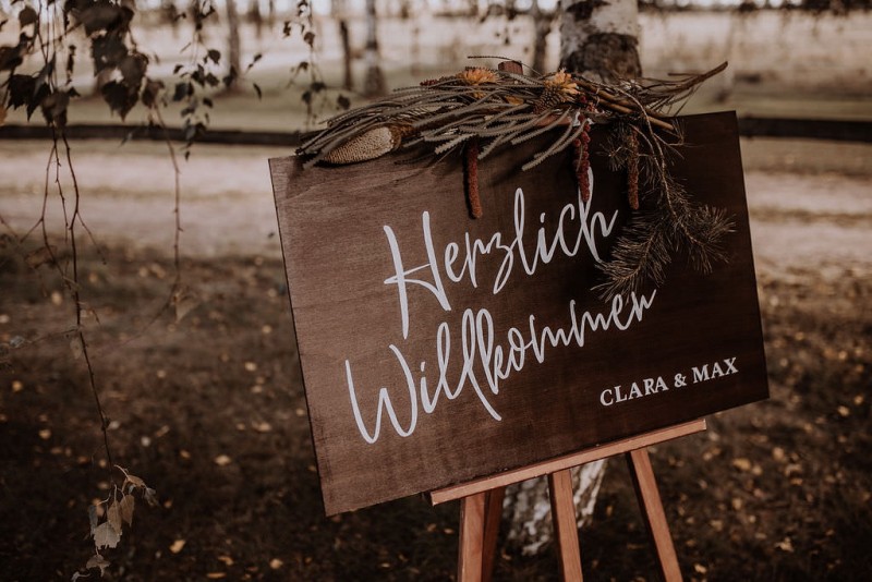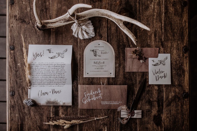 Handbeschriebenes Kraftpapier mit feinen Ornamenten, gehalten von schwarzen Metallständern, verkünden das Menü, während erlesenes Obst auf den Tellern die federbestückten Namensschilder halten. Diese, sowie die gesamte bezaubernde Hochzeitspapeterie von March & May, ist durchzogen vom erdigen Charakter, der natürlichen Maserung von Halz und zartem Lettering. Naturverbunden finden sich feine Zeichnungen von herrschaftlichen Adlern sowie rauchige Akzente.