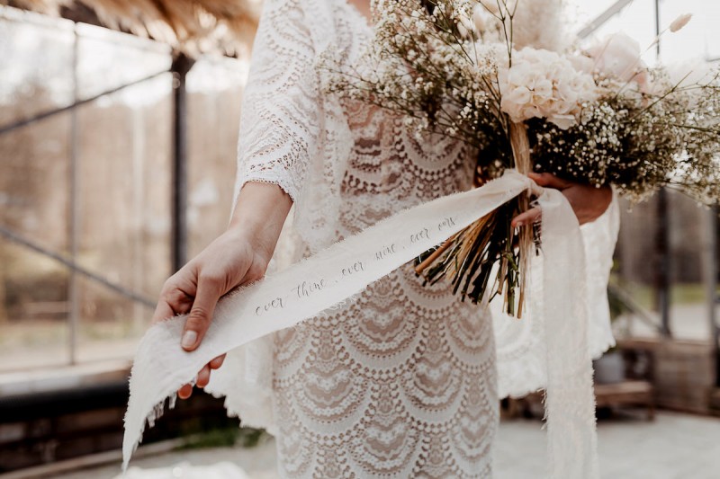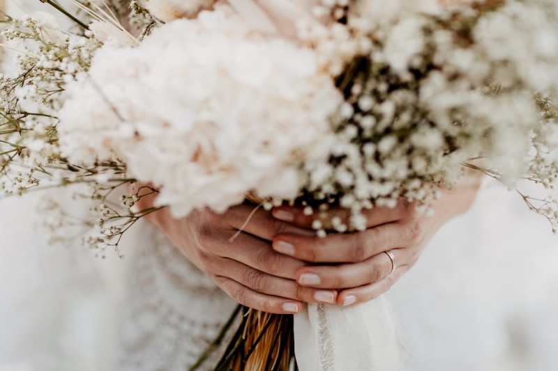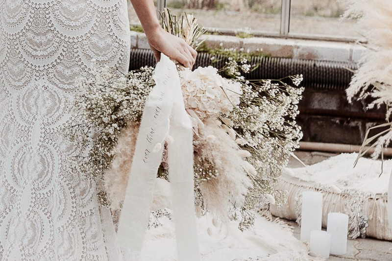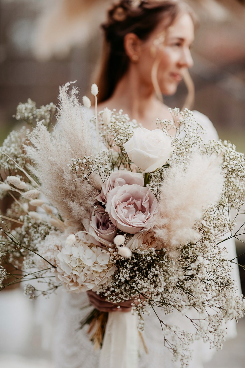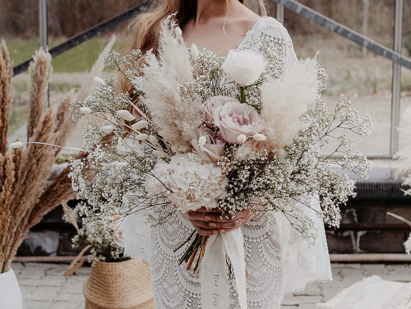 Diese Brautstrauß Inspiration ruft so herrlich laut Boho. Und doch ist er ganz zart, verträumt und sehr elegant. Das weiße Schleierkraut bildet hier den wilden Rahmen für die weißen Hortensien, das gebleichte, puschelige Pampasgras und die gebleichten Phalaris. Inmitten dieser gekonnten Asymmetrie findet sich große Rosen in zartem Rosé und Weiß. Ein grandioser Brautstrauß für Bräute, die es wild, opulent und gleichzeitig zurückhaltend mögen. Ein wahrer Hingucker, den Mehr Konfetti Bitte hier, neben der ebenso schönen Hochzeitsdekoration, entworfen hat. Fotografiert wurde die schöne Hochzeitsinspiration, dessen Konzept Mit Liebe kreiert kreierte, von Capture life photo and film. Brautblüte stellte hierfür dieses wundervolle Bohobrautkleid, das mit feinem Schmuck und dem passenden Hair & Makeup von La Chia ergänzt wurde.