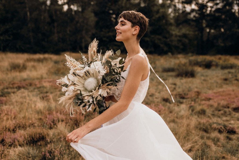 Dieser opulente und wilde Brautstrauß ist der Inbegriff des Bohostils, voller Freiheit und Ungezwungenheit. Langes Pampasgras, verschiedene Sorten von Eukalyptus, gebleichtem Ruscus und zartes Silberblatt formen, gemeinsam mit Lagurus – auch Samtgras genannt – einen wunderschönen Brautstrauß für Bohobräute. Im Zentrum findet sich eine große weiße Protea, die sogenannte Königsprotea “Cynaroides Arctic Ice“. Ein absoluter Blickfang! Tatsächlich ist sie keine Trockenblume, hält aber sehr lang und lässt sich zudem sehr leicht trocknen.