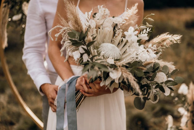 Der hübschen Braut stand dieser Brautstrauß auf ihrer Bohohochzeit unglaublich gut wie ich finde. Und auch der ovale Traubogen der beiden wurde mit diesen Blumen so toll dekoriert.