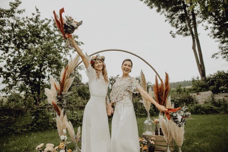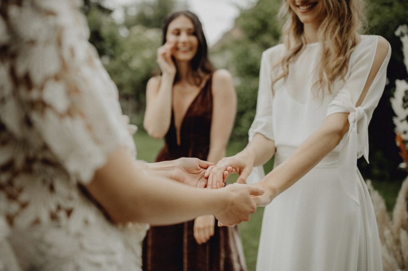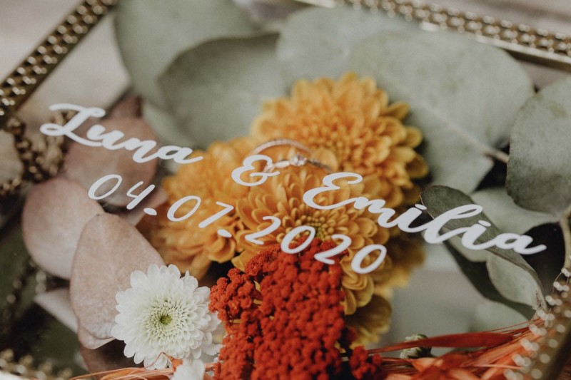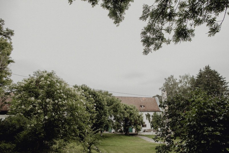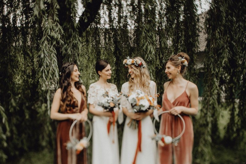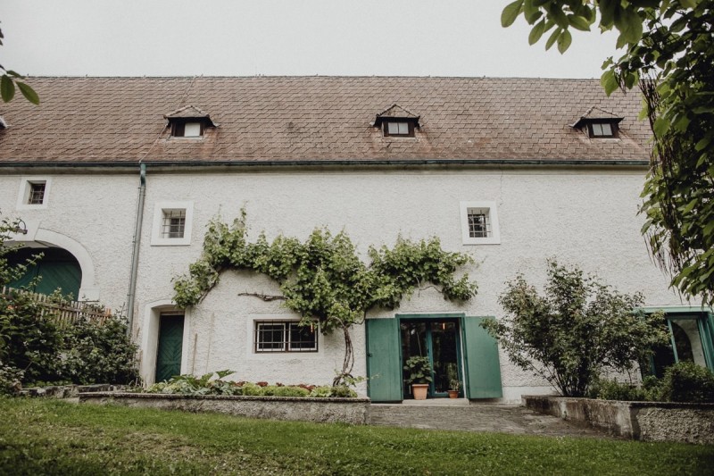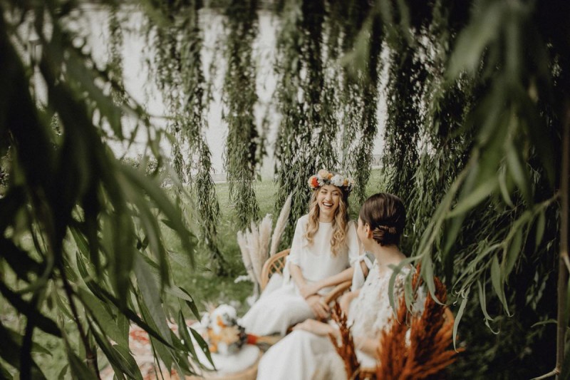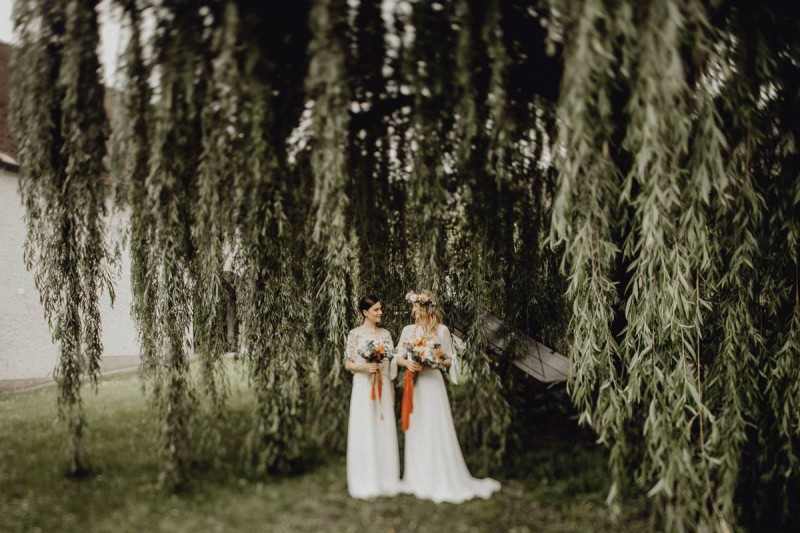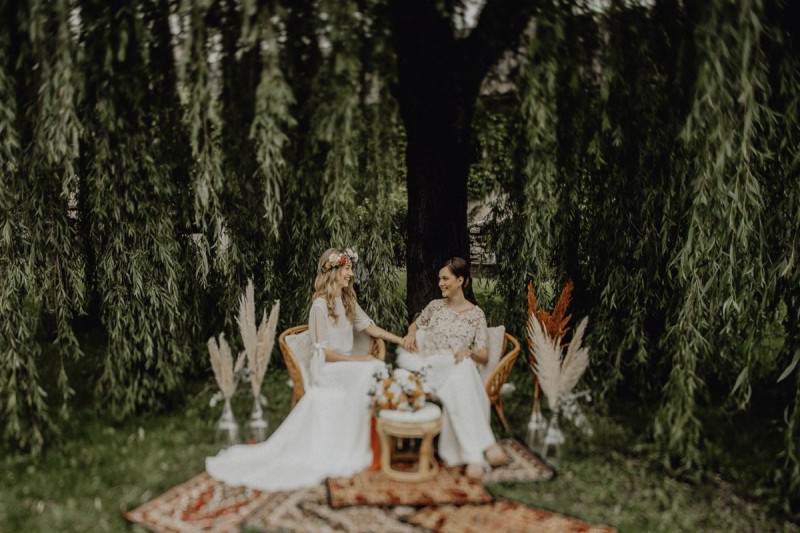 Große wunderschöne Gärten, die in strahlendem Grün von Ruhe durchzogen sind. Ein mystischer Naturteich mit schmalem Steg, eine alte Trauerweide und hohe Bäume die in den Himmel ragen. Auf dem Anwesen der ehemaligen Schlossanlage Zwerbach in Ruprechtshofen erinnert nur noch der nun 400 Jahre alte Meierhof an die prächtige Zeit des Schlosses. Hier steht der Gutshof Szilagyi, der nach liebevollen Renovierungen die charmante Location für diese besondere Green Wedding im Bohemian Chic Stil stellt. Naturverbunden, achtsam umgehend sowohl mit der Umgebung als auch für Bohohochzeiten mit nachhaltigem Konzept entdecken! Gleich vorweg: Es erwarten euch einige Bilder mehr als sonst, denn diese Inspiration ist wirklich ausladend! Ob romantisches Dinner Setting, Wahnsinns Traulocation, köstlicher Sweet Table, Bio Limo Bar oder kuschelige Sitzecke unter der Trauerweide – hier wurde wirklich an alles gedacht. Zudem erwarten euch in dieser Inspiration gleich zwei wirklich wunderschöne Brautlooks, denn hier wurde ein romantisches Elopement eines gleichgeschlechtlichen Paares inszeniert. Und da die beiden bezaubernden Bräute ihre bildhübschen Bridesmaids an der Hand hatten, erwarten euch auch noch zwei ganz tolle Trauzeuginnen-Looks. Bei alle dem wurde das Thema Nachhaltigkeit immer im Auge, oder sagen wir treffender, im Herzen behalten. Alle Beteiligten möchten mit dieser Inspiration zeigen, dass eine fulminante Bohohochzeit ganz wundervoll mit Blick auf das wichtige Thema Nachhaltigkeit kreiert werden kann.