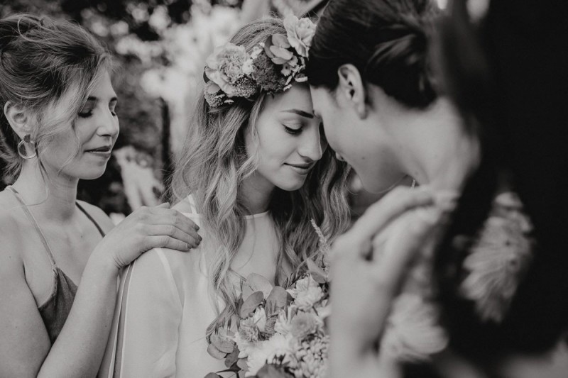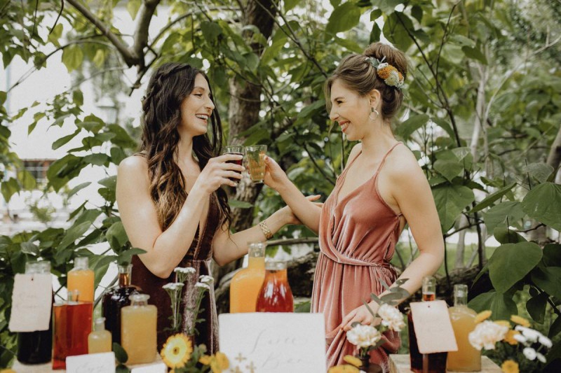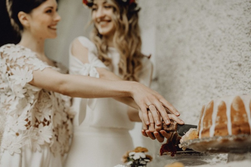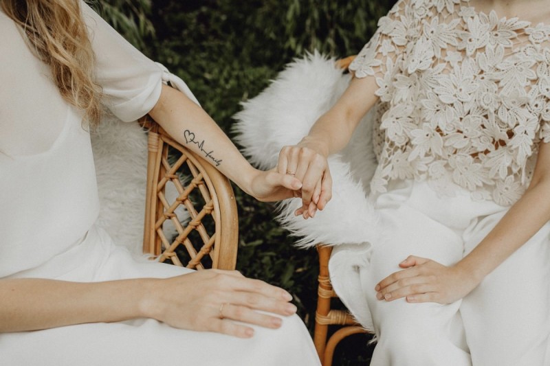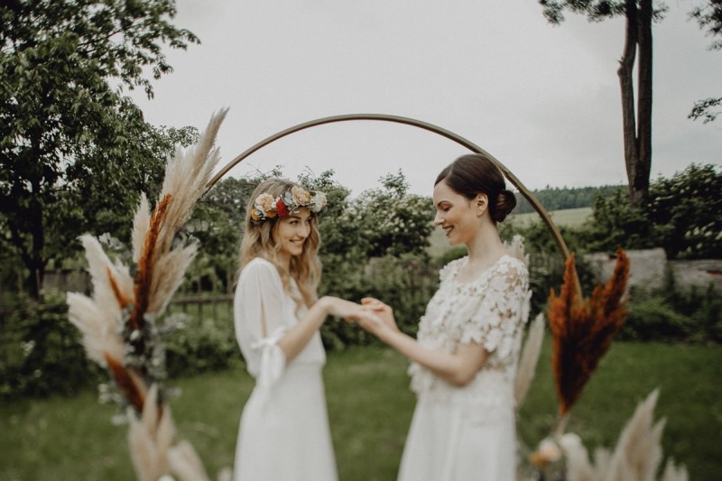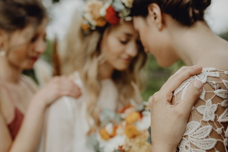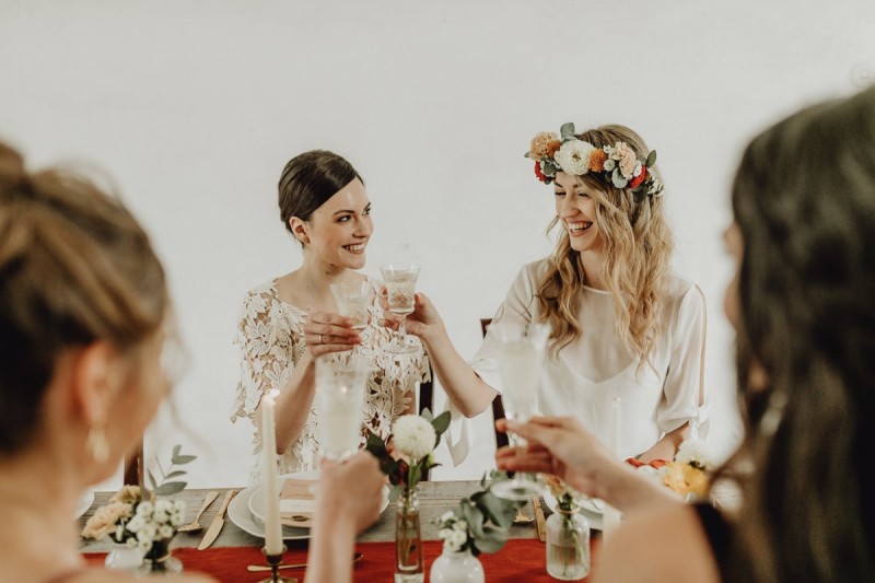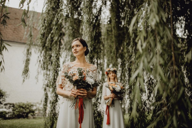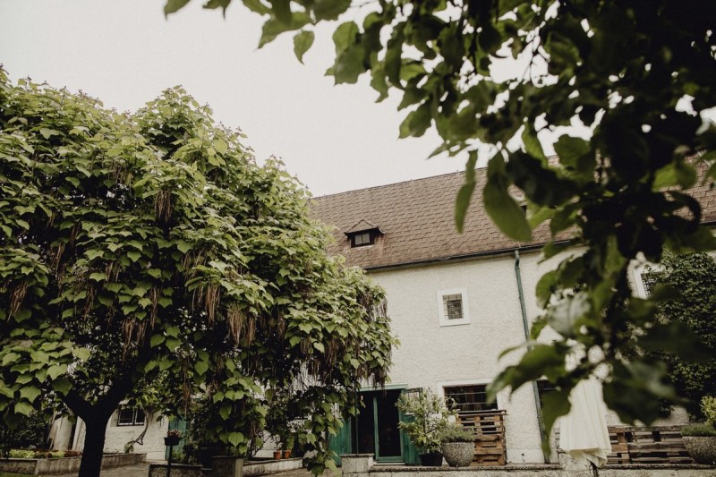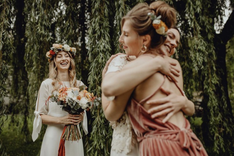 Große wunderschöne Gärten, die in strahlendem Grün von Ruhe durchzogen sind. Ein mystischer Naturteich mit schmalem Steg, eine alte Trauerweide und hohe Bäume die in den Himmel ragen. Auf dem Anwesen der ehemaligen Schlossanlage Zwerbach in Ruprechtshofen erinnert nur noch der nun 400 Jahre alte Meierhof an die prächtige Zeit des Schlosses. Hier steht der Gutshof Szilagyi, der nach liebevollen Renovierungen die charmante Location für diese besondere Green Wedding im Bohemian Chic Stil stellt. Naturverbunden, achtsam umgehend sowohl mit der Umgebung als auch für Bohohochzeiten mit nachhaltigem Konzept entdecken! Gleich vorweg: Es erwarten euch einige Bilder mehr als sonst, denn diese Inspiration ist wirklich ausladend! Ob romantisches Dinner Setting, Wahnsinns Traulocation, köstlicher Sweet Table, Bio Limo Bar oder kuschelige Sitzecke unter der Trauerweide – hier wurde wirklich an alles gedacht. Zudem erwarten euch in dieser Inspiration gleich zwei wirklich wunderschöne Brautlooks, denn hier wurde ein romantisches Elopement eines gleichgeschlechtlichen Paares inszeniert. Und da die beiden bezaubernden Bräute ihre bildhübschen Bridesmaids an der Hand hatten, erwarten euch auch noch zwei ganz tolle Trauzeuginnen-Looks. Bei alle dem wurde das Thema Nachhaltigkeit immer im Auge, oder sagen wir treffender, im Herzen behalten. Alle Beteiligten möchten mit dieser Inspiration zeigen, dass eine fulminante Bohohochzeit ganz wundervoll mit Blick auf das wichtige Thema Nachhaltigkeit kreiert werden kann.