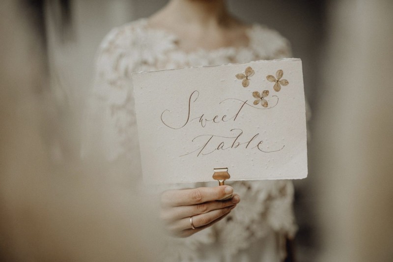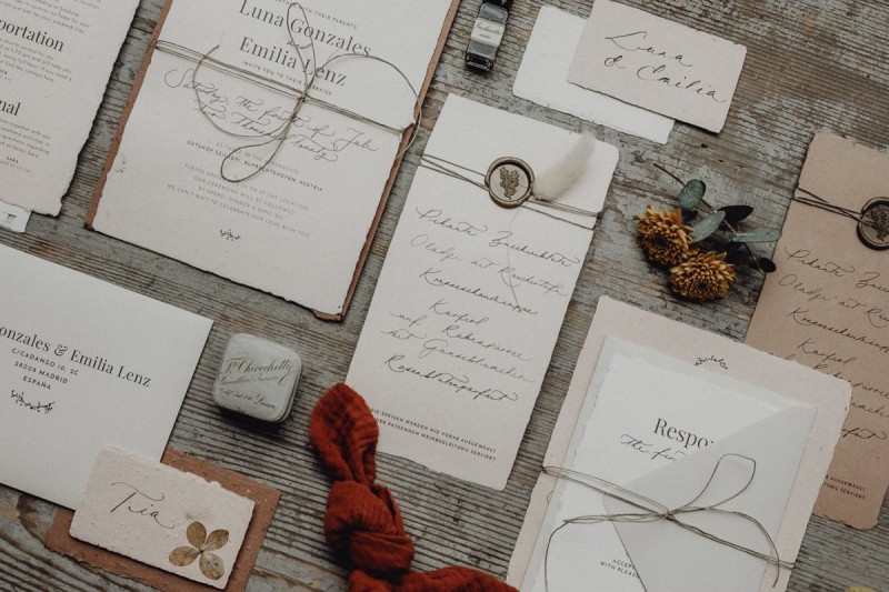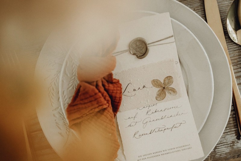 Die Hochzeitspapeterie ist ein weiteres Highlight des Nachhaltigkeitsgedankens: Das Papier, auf dem Atelier Zarah kalligrafierte, ist handgeschöpftes Papier von Seedpap, in welches Wildblumen- und Kräutersamen eingearbeitet werden, die auf die heimischen Wildbienen abgestimmt sind. So kann die wunderschöne Hochzeitspapeterie nach der Hochzeit im eigenen Garten verpflanzt werden. Das Papier für diese Inspiration wurde auf Wunsch mit Thymiansamen kreiert.