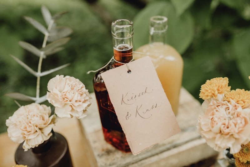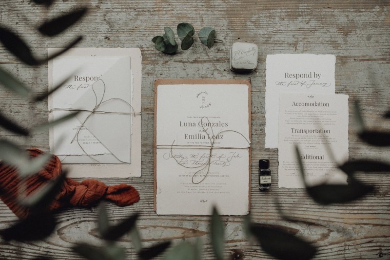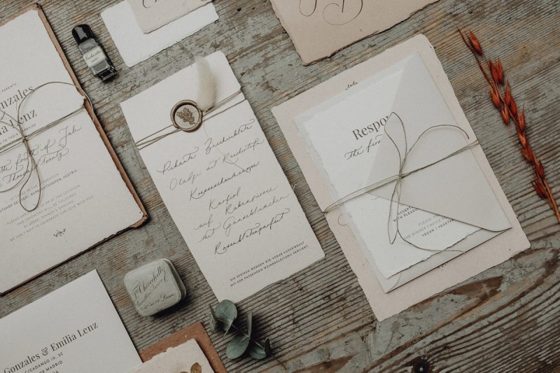 Doch kommen wir nochmal auf die liebe Sarah von Atelier Zarah zurück. Denn selbst die Kalligrafie ist hier sehr besonders! Sie verwendete natürliche, traditionelle Walnusstinte, die eine Bekannte von ihr selbst angesetzt hat. Handmade, regional, natürlich. Diese Tinte besteht aus der Außenschale der Walnüsse und Alkohol und hat eine wunderschöne Farbe mit eher feiner Deckkraft. Mit der Kalligrafe gelang es Sarah den Stil und den Spirit der Hochzeit aufzufassen und in den Karten wiederzugeben. Die Papeterie ist natürlich, luftig, dynamisch und zugleich fein, daher wählte sie einen Stil, der nicht zu verspielt und feminin, aber auch nicht zu wild und hart wirkt. Er wirkt wie eine schöne, natürliche Handschrift – und dieser handmade Stil zieht sich letztendlich durchs ganze Shooting.