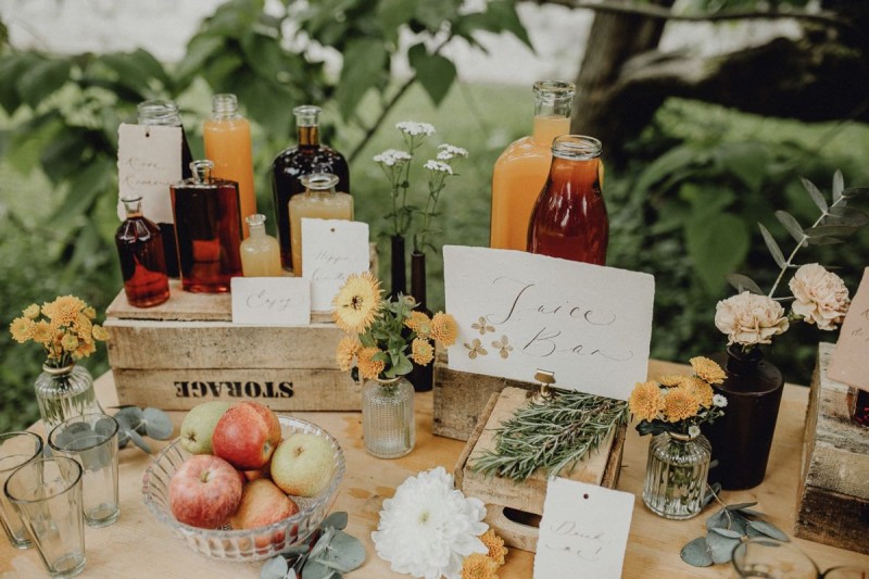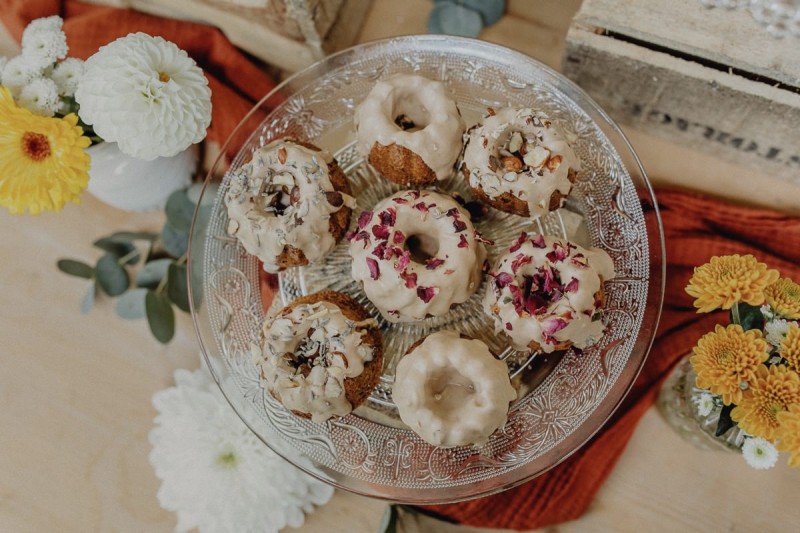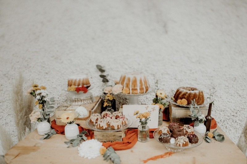 Der bezaubernde Sweet Table trägt den nachhaltigen Charakter selbstredend ebenfalls weiter. Auf eine große Torte wurde hier bewusst verzichtet und anstelle dessen wurden viele, individuelle vegane Guglhupfe wie von Oma angeboten. Regionale Zutaten, hausgemacht. Einfach, unkompliziert und durch die Individualität sowohl sehr schön anzusehen als auch köstlich im Geschmack.