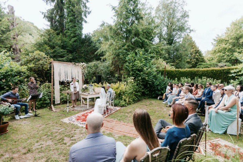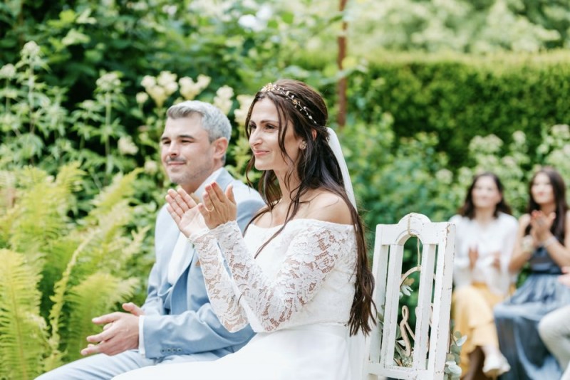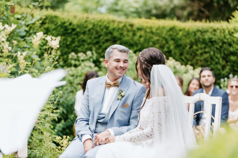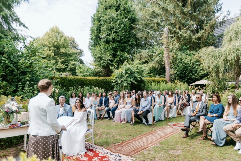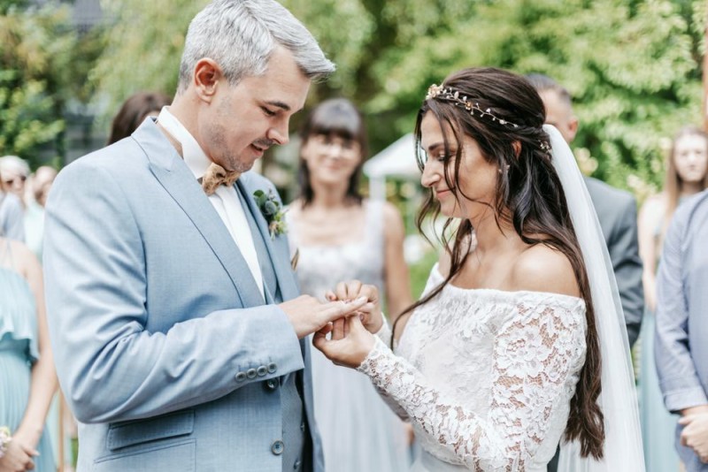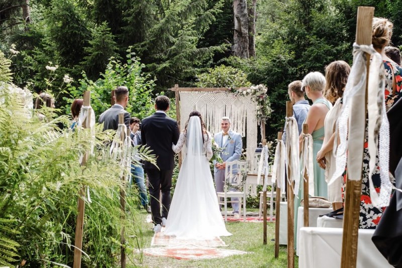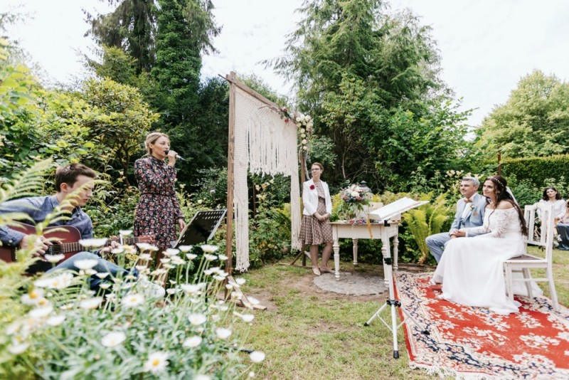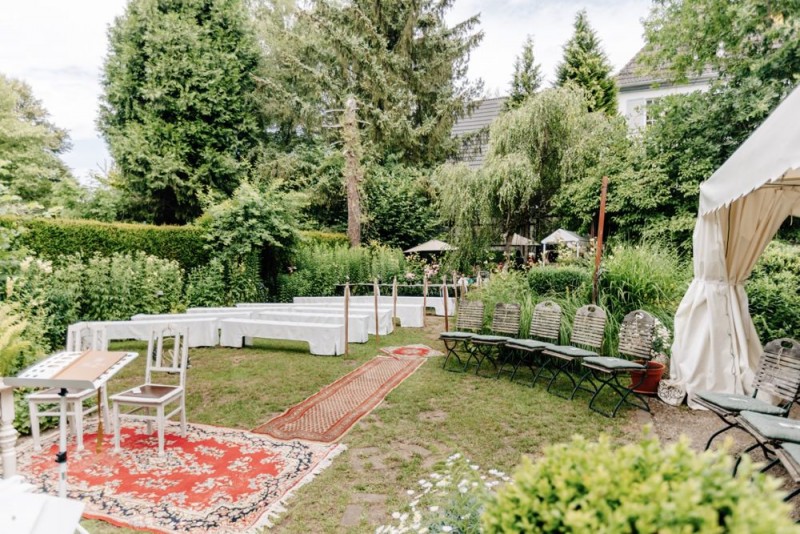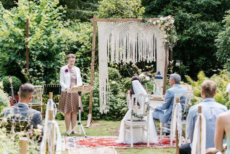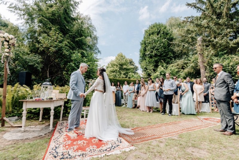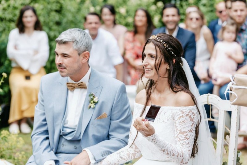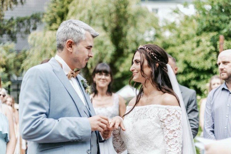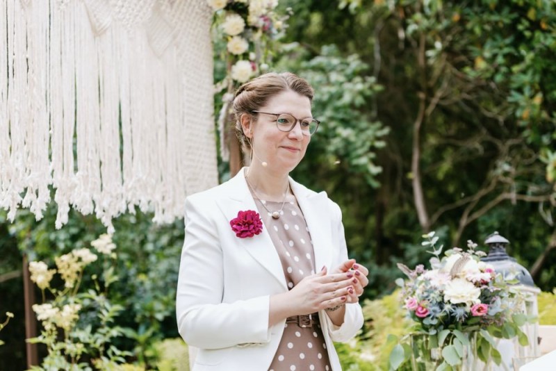 Oh ich freu mich sehr, dass ich euch heute die wunderschöne Sommerhochzeit von Janine & Oliver zeigen darf. Es ist eine zauberhafte Bohohochzeit, die am 5. Juli letztens Jahres, umgeben von Grün, mit einer romantischen freien Trauung im Der Garten in Wissen stattgefunden hat. Bei schönstem Sonnenschein feierte das süße Brautpaar eine so wunderschöne Bohohochzeit unter freiem Himmel, die der Hochzeitsfotograf Frank Herzmann für die beiden festgehalten hat. Janine war eine so bezaubernde Braut in ihrem Zweiteiler von Brautkleid mit einem langärmeligen Spitzenoberteil mit Carmen-Ausschnitt, dem fließenden Rock und ihrem langen Schleier. Dieser wurde kombiniert zu einem Headpiece von Refined Bohemia, das auf die leicht nach hinten geflochtenen Haare gesetzt wurde. Ihr langes dunkles Haar trug sie ansonsten offen. Dieses schöne Brautstyling hat Lydia Gerzen kreiert. Zu ihrem Brautkleid von Brautmoden Hartmann trug sie feine Brautschuhe von Magosisters. Aber auch Oliver strahlte in einem sommerlichen Anzug in Hellblau mit beigen Details im Korklook vom Herrenausstatter Iserlohe. Und so schritten sie zu ihrer wunderschönen freien Trauung mit Traurednerin Anja von Goldröschen. Vor dem tollen Traubogen aus Holz, der mit einem großen Makramee geschmückt wurde, nahmen sie auf geschmückten weißen Stühlen Platz. Der Traubogen, sowie das Mobiliar, war von NIMMPLATZ. Die wilde Floristik am Traubogen war ebenso, wie der grandiose Brautstrauß und die gesamte florale Dekoration, von der Hochzeitslocation selbst. Neben dieser schönen Traulocation gab es auch so viele Highlights während der Trauung der beiden. Zu Beginn schritten die Mütter des Paares nach Vorne und zündeten die Traukerze an. Ein liebevolles Ritual, das leider(!) oft als altmodisch verschien ist. Von Hochzeitssängerin Mona Babberger begleitet, gab es während der Trauzeremonie ein besonderes Ring Warming. Die Gäste selbst knoteten die Schnüre dafür zusammen. Die engsten Herzmenschen des Paares legten ihnen jeweils ein Band über die Hände für das rituelle Hand Fasting. Und zum Ende hin gab es als Überraschung einen Singmob, bei dem alle Gäste für das Brautpaar die Stimme erhoben. Kein Wunder, dass bei dieser Trauung so viele Freudentränen flossen. Nach dieser zauberhaften Trauung erwartete das Brautpaar und ihre Gäste draußen sowie drinnen eine so schön dekorierte Feierlocation. Dazu gab es eine mega Candy Bar und natürlich den Anschnitt der Hochzeitstorte. Diese kreierte Netti’s Tortenschätze und sie passte einfach perfekt zu diesem Traum einer Sommerhochzeit. Ein Semi Naked Drip Cake, dessen drei Etagen mit frischen Beeren dekoriert wurde. Bei diesen schönen Bildern lässt es sich so wunderbar vom Sommer träumen. Genießt die tollen Bohovibes und all die schönen Eindrücke dieses besonderen Tages im Leben von Janine & Oliver!