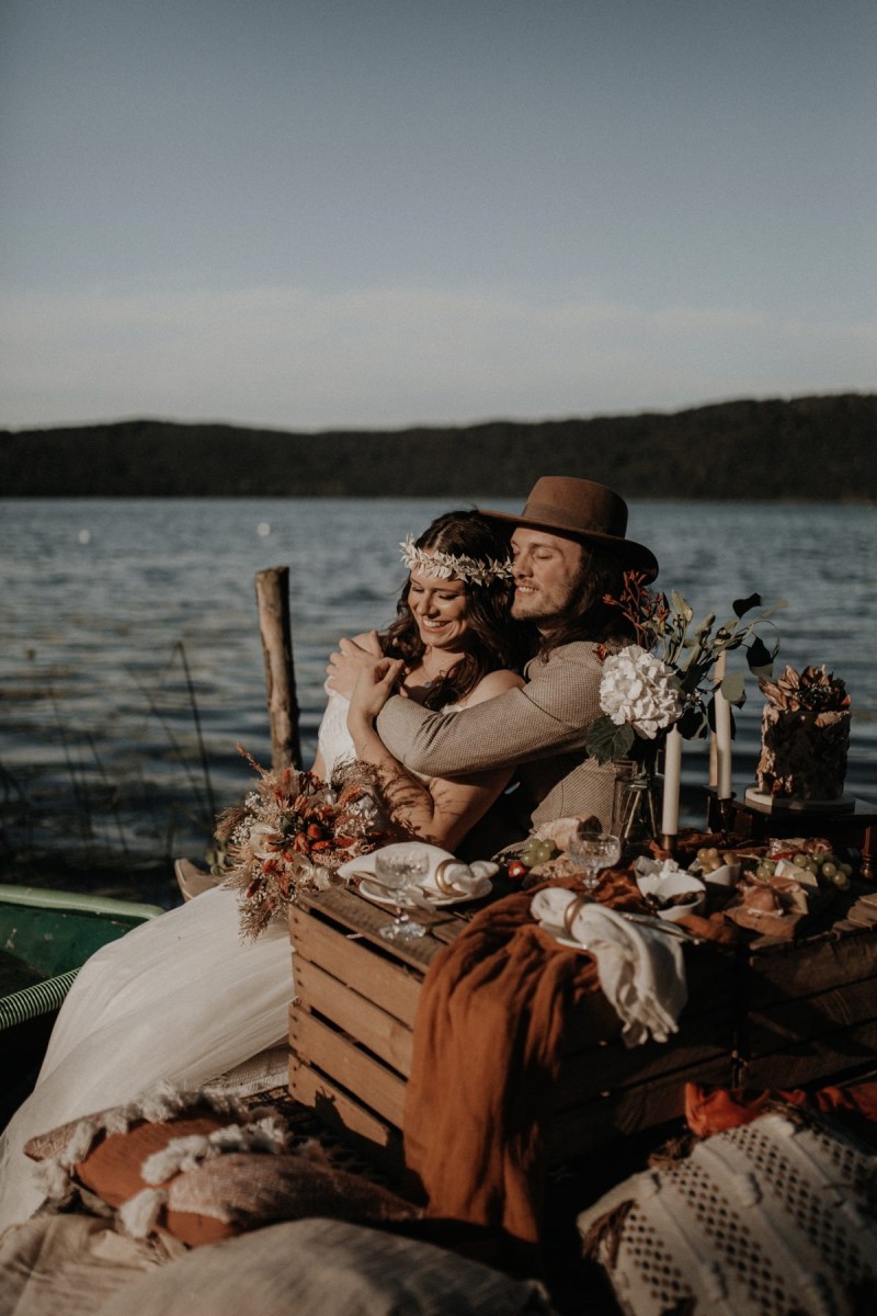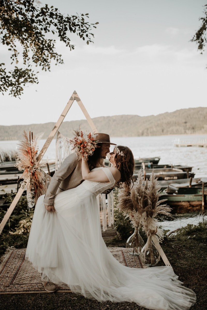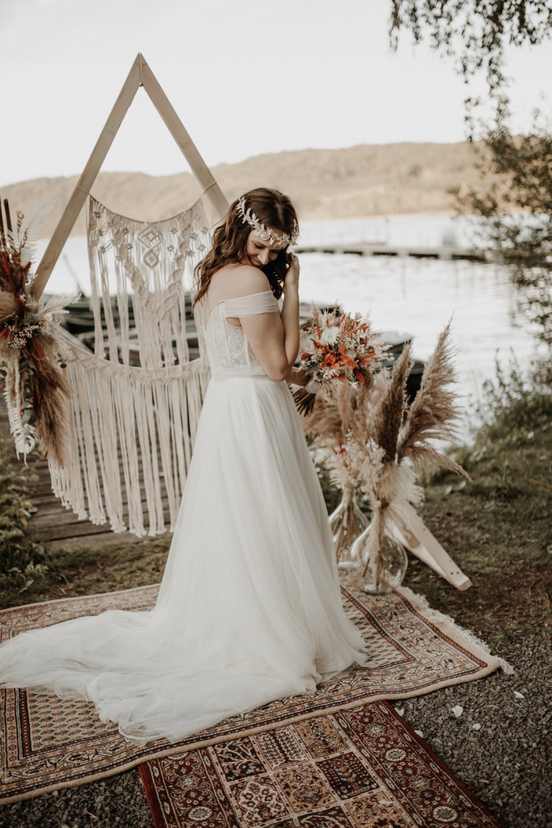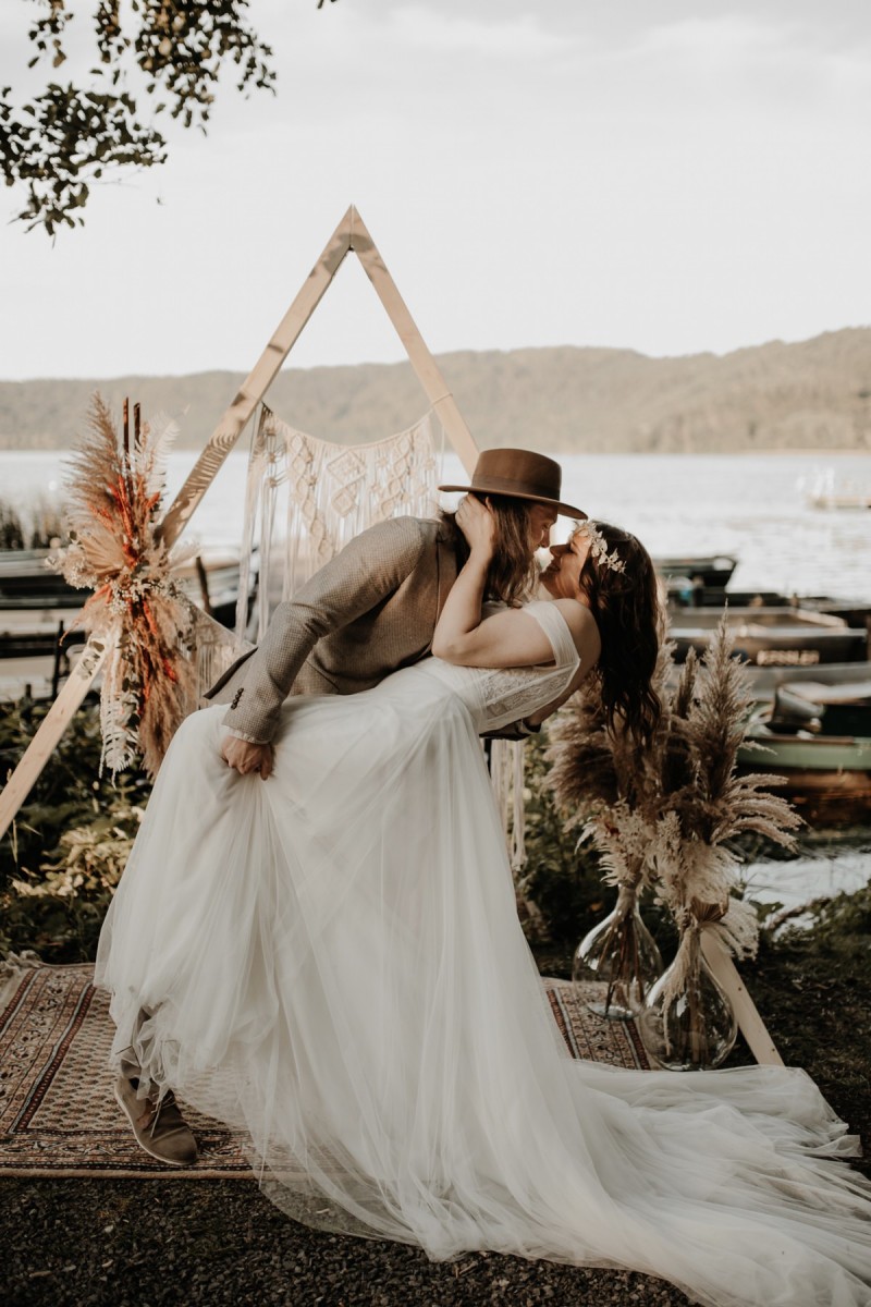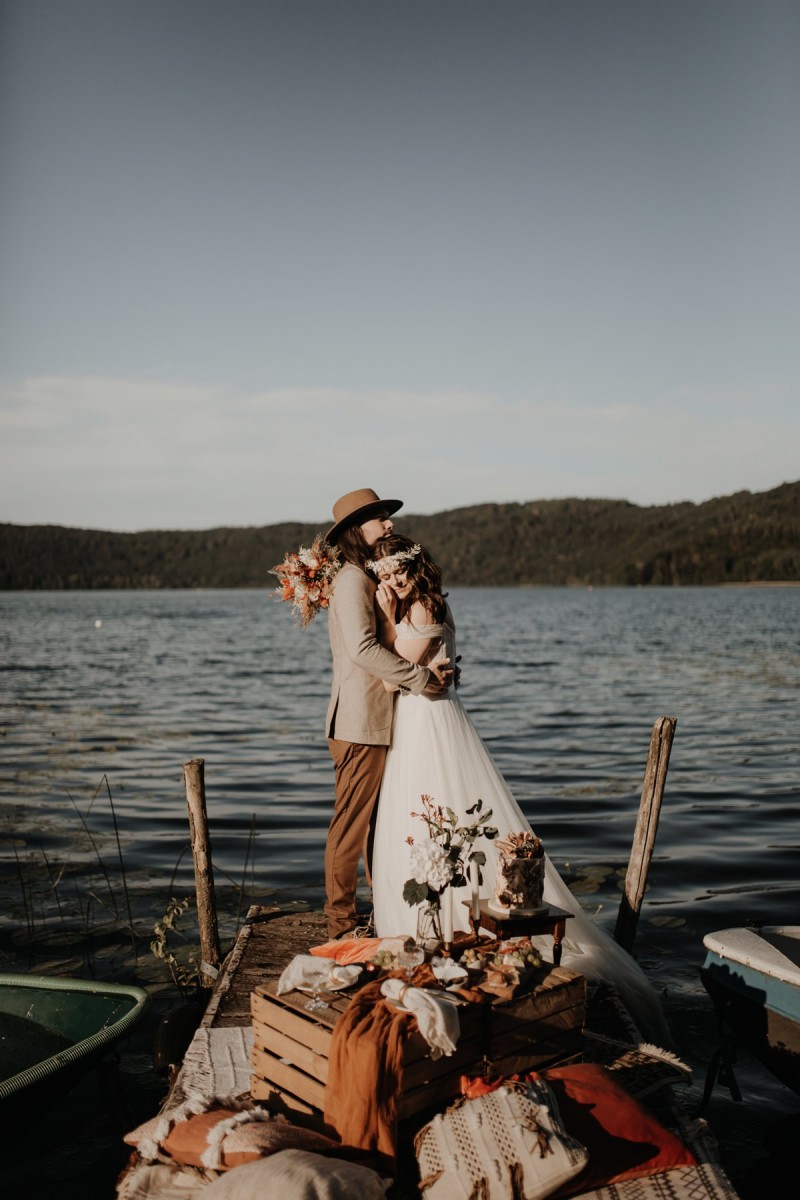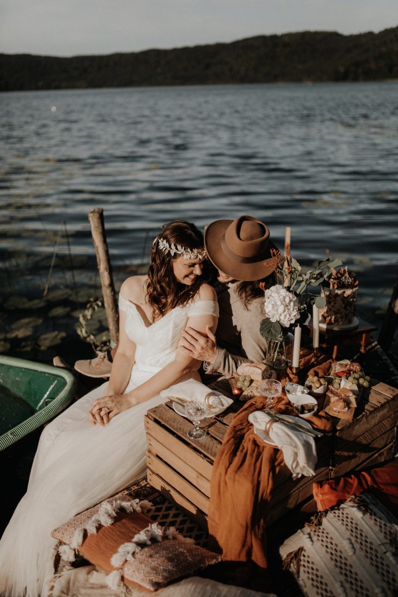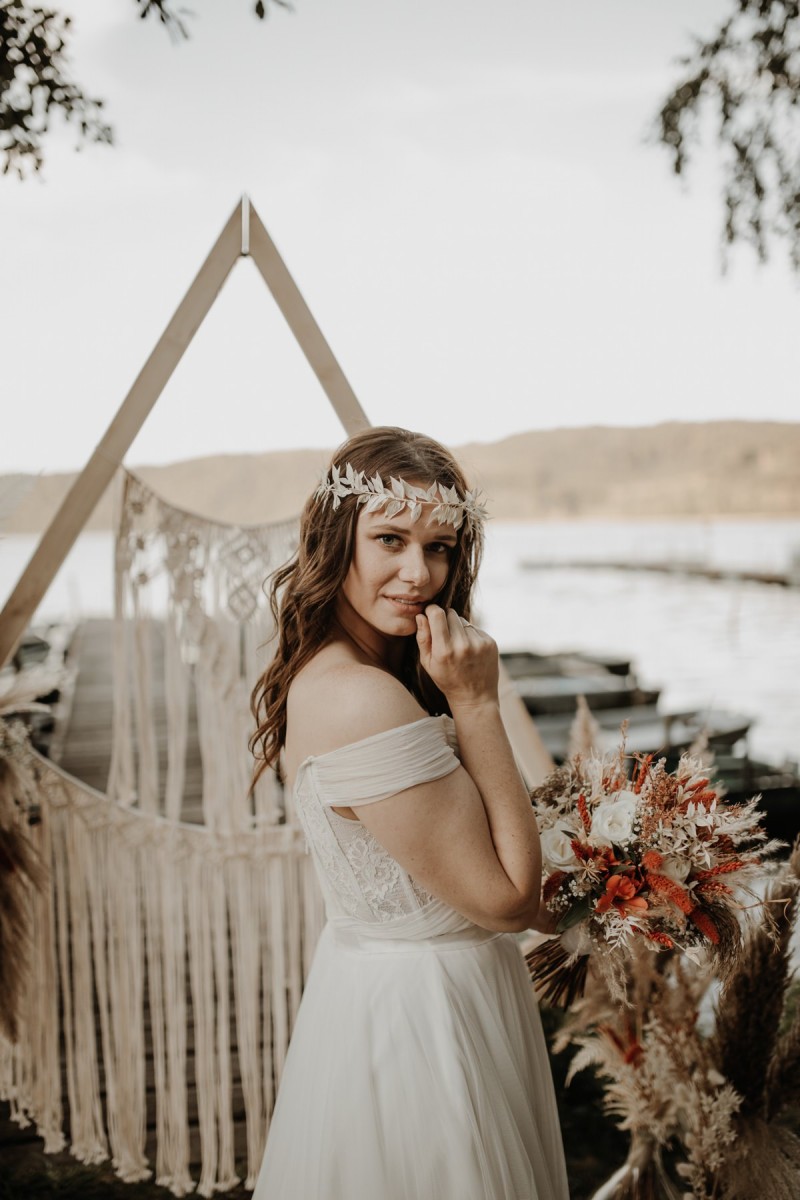 Nur du und ich auf einem verlassenen Bootssteg, die tiefstehende Sonne und die leichten Bewegungen des Seewassers. Klingt das nicht himmlisch? Ich würde sagen HELL YES! Und das ist nur der Beginn dieser wunderschönen Inspiration einer Elopement Wedding im Bohostil am schönen Laacher See! Wundervoll fotografiert von Hochzeitsfotografin Karina Wiebe, erwartete das bezaubernde Brautpaar Alina & Timm ein romantisches Picknick mit allerlei herzhaften Köstlichkeiten, auf dem Bootssteg am Seeufer. Kuschelig, dank Kissen und Decken, und romantisch, dank feinen Kerzenständern und frischen Blumen, inszenierte Hochzeitsplanerin From Sophie with love ein einmaliges Dinnersetting, mit einem Ausblick der Superlative. Hier begann für das Brautpaar ein außergewöhnlicher Tag, den sie so sicher nie vergessen werden. In einem eleganten Off-Shoulder Brautkleid mit opulent fließendem Rock von Audrey Wedding Salon und einem leichten Styling, kreiert von Styling by Sweta, stieß Alina mit ihrem Bräutigam Timm, der in einer braun-beigen Kombination aus Anzughose, lockerem Jacket und Hut glänzte, auf diesen besonderen Tag an. Neben den herzhaften Köstlichkeiten erwartete sie zudem eine Hochzeitstorte von Maggie’s Kuchen, dessen Cremedesign und Zuckerdekor seinesgleichen sucht. Doch ist dieses feine Plätzchen, wie bereits erwähnt, nur der Beginn dieser Wahnsinns Inspiration! Hochzeitsplanerin From Sophie with love hat das schöne Konzept dieser Inspiration kreiert und sich in der Planung so einiges einfallen lassen, das sie hier auch noch dekoriert hat. Denn nach den romantischen Stunden auf dem verlassenen Pier, erwartete das Brautpaar eine freie Trauzeremonie mit der lieben Sarah von Who is Karma – anyway, die diese intime Elopement Wedding perfekt machte. Vor einem großen, blumengeschmückten Traubogen aus Holz, mit Blick auf den See, wurde hier herzlich gelacht aber auch vor Freude geweint. Unterstützung bei der Dekoration dieses Elopements bekam die liebe Sophie von From Sophie with love von der Hochzeitsbouquetterie. Jess und ihr Team zauberten sowohl beim romantischen Dinnersetting, der opulenten Traulocation als auch beim Brautstrauß ganze Träume aus Trockenblumen. Passend zur Dekoration wurden vor allem erdige Töne gewählt, wie Braun, Beige und Creme, die mit warmen Rot- und zarten Weißtönen akzentuiert wurden. Ein Mix aus verschiedenen Strukturen gibt diesem harmonischen Konzept sowohl in der Floristik als auch in der Dekoration den herrlich rustikalen Bohocharm. Schon beim Dinnersetting setze From Sophie with love auf verschiedene Strukturen in den Details. Grobe, gehäkelte sowie glatte Stoffe treffen auf das unbehandelte Holz der Kisten und werden durch das glatte, glänzende Gold komplementiert. Wer noch nach Inspirationen für seine spätsommerliche oder herbstliche Bohohochzeit sucht, der ist hier in jedem Fall goldrichtig!