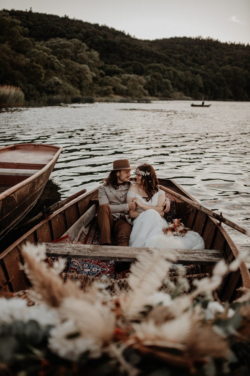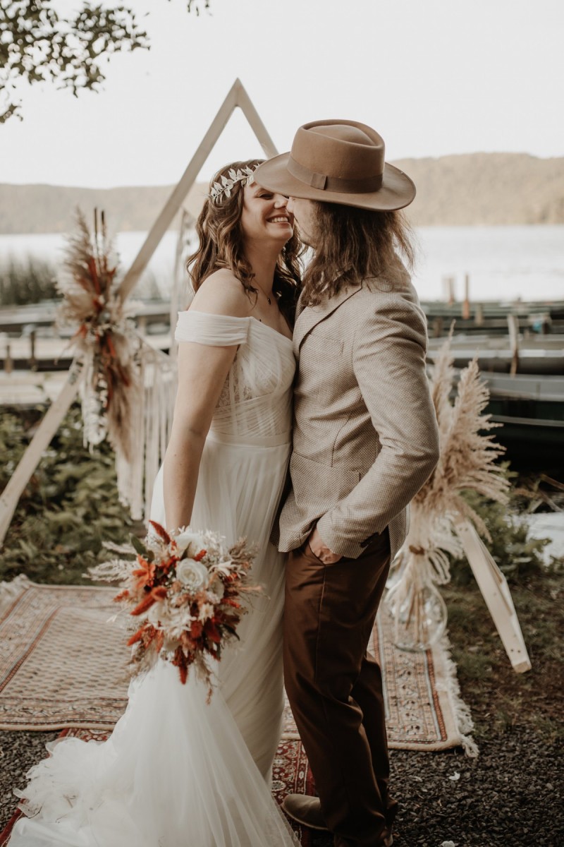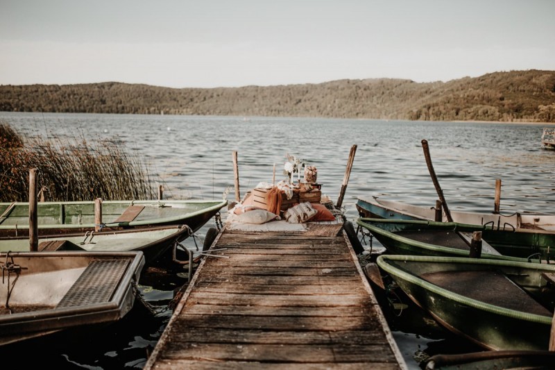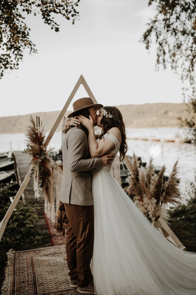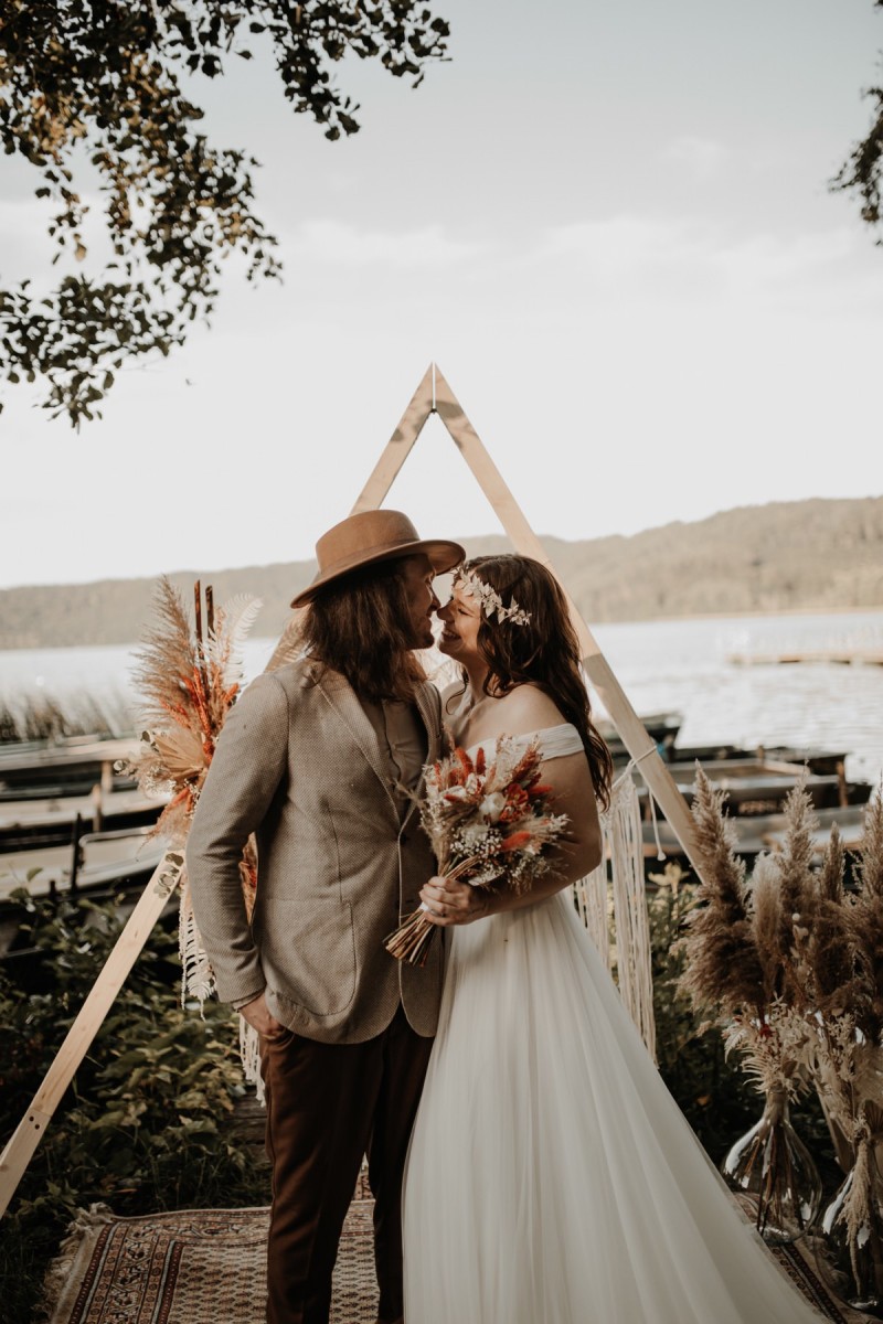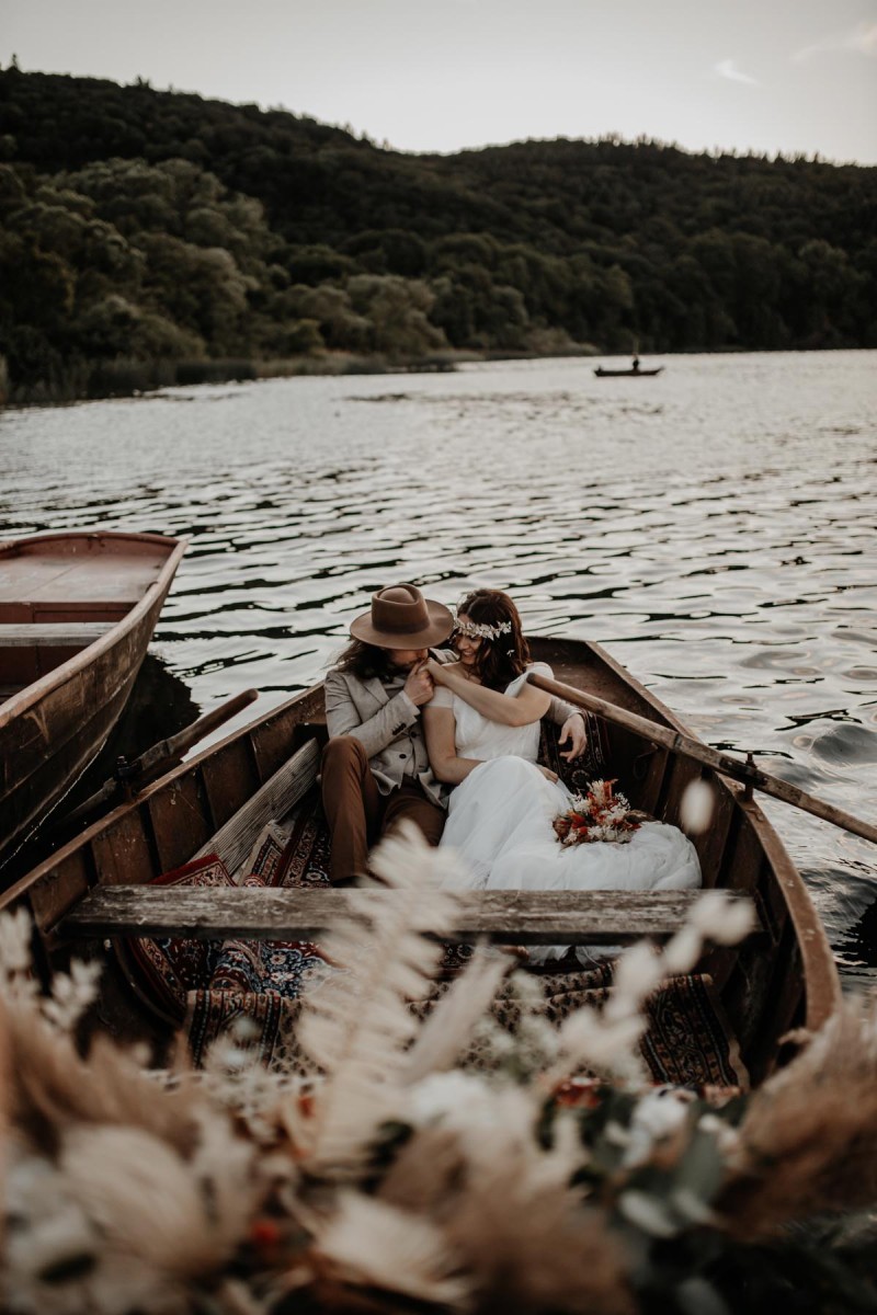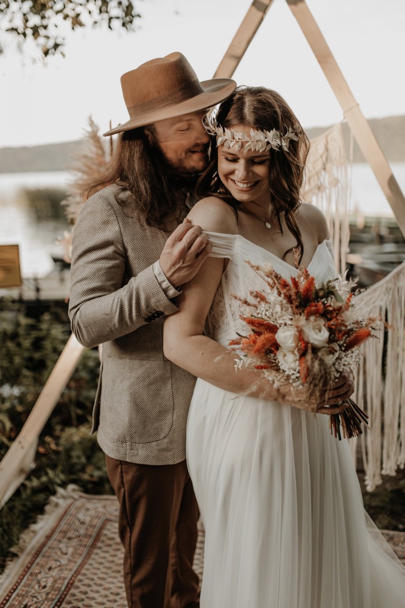 Nur du und ich auf einem verlassenen Bootssteg, die tiefstehende Sonne und die leichten Bewegungen des Seewassers. Klingt das nicht himmlisch? Ich würde sagen HELL YES! Und das ist nur der Beginn dieser wunderschönen Inspiration einer Elopement Wedding im Bohostil am schönen Laacher See! Wundervoll fotografiert von Hochzeitsfotografin Karina Wiebe, erwartete das bezaubernde Brautpaar Alina & Timm ein romantisches Picknick mit allerlei herzhaften Köstlichkeiten, auf dem Bootssteg am Seeufer. Kuschelig, dank Kissen und Decken, und romantisch, dank feinen Kerzenständern und frischen Blumen, inszenierte Hochzeitsplanerin From Sophie with love ein einmaliges Dinnersetting, mit einem Ausblick der Superlative. Hier begann für das Brautpaar ein außergewöhnlicher Tag, den sie so sicher nie vergessen werden. In einem eleganten Off-Shoulder Brautkleid mit opulent fließendem Rock von Audrey Wedding Salon und einem leichten Styling, kreiert von Styling by Sweta, stieß Alina mit ihrem Bräutigam Timm, der in einer braun-beigen Kombination aus Anzughose, lockerem Jacket und Hut glänzte, auf diesen besonderen Tag an. Neben den herzhaften Köstlichkeiten erwartete sie zudem eine Hochzeitstorte von Maggie’s Kuchen, dessen Cremedesign und Zuckerdekor seinesgleichen sucht. Doch ist dieses feine Plätzchen, wie bereits erwähnt, nur der Beginn dieser Wahnsinns Inspiration! Hochzeitsplanerin From Sophie with love hat das schöne Konzept dieser Inspiration kreiert und sich in der Planung so einiges einfallen lassen, das sie hier auch noch dekoriert hat. Denn nach den romantischen Stunden auf dem verlassenen Pier, erwartete das Brautpaar eine freie Trauzeremonie mit der lieben Sarah von Who is Karma – anyway, die diese intime Elopement Wedding perfekt machte. Vor einem großen, blumengeschmückten Traubogen aus Holz, mit Blick auf den See, wurde hier herzlich gelacht aber auch vor Freude geweint. Unterstützung bei der Dekoration dieses Elopements bekam die liebe Sophie von From Sophie with love von der Hochzeitsbouquetterie. Jess und ihr Team zauberten sowohl beim romantischen Dinnersetting, der opulenten Traulocation als auch beim Brautstrauß ganze Träume aus Trockenblumen. Passend zur Dekoration wurden vor allem erdige Töne gewählt, wie Braun, Beige und Creme, die mit warmen Rot- und zarten Weißtönen akzentuiert wurden. Ein Mix aus verschiedenen Strukturen gibt diesem harmonischen Konzept sowohl in der Floristik als auch in der Dekoration den herrlich rustikalen Bohocharm. Schon beim Dinnersetting setze From Sophie with love auf verschiedene Strukturen in den Details. Grobe, gehäkelte sowie glatte Stoffe treffen auf das unbehandelte Holz der Kisten und werden durch das glatte, glänzende Gold komplementiert. Wer noch nach Inspirationen für seine spätsommerliche oder herbstliche Bohohochzeit sucht, der ist hier in jedem Fall goldrichtig!