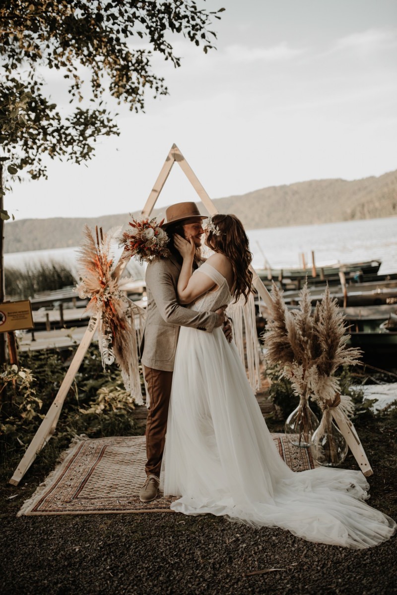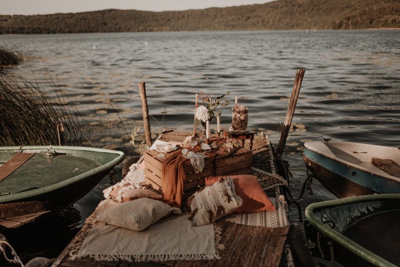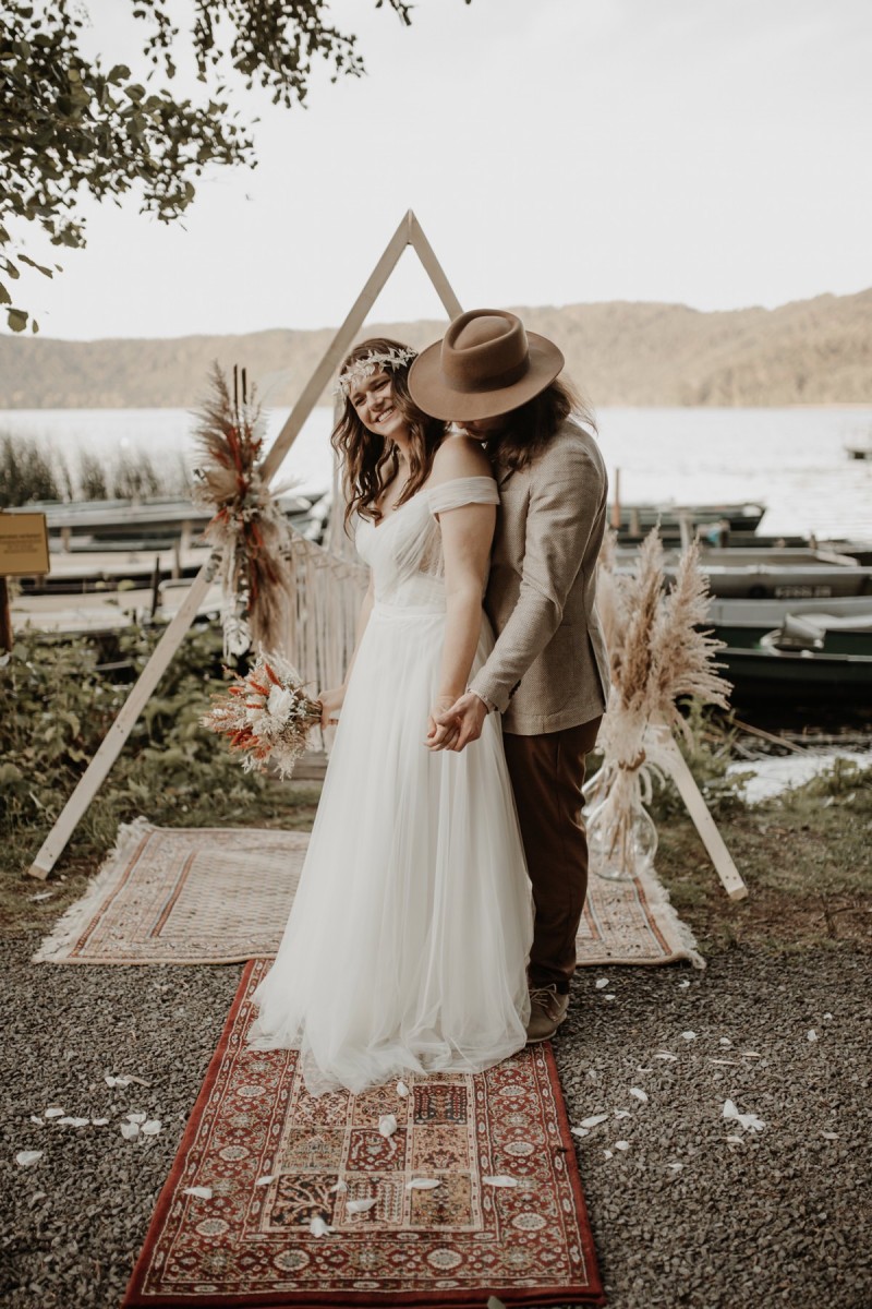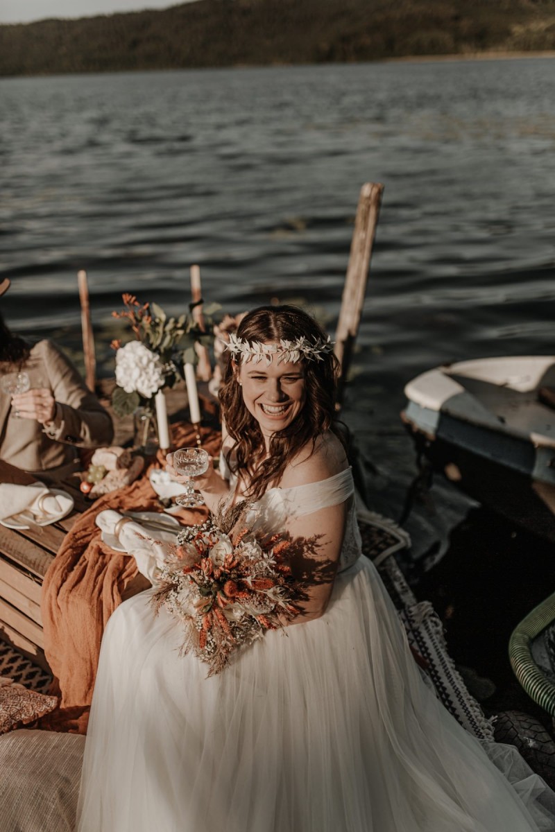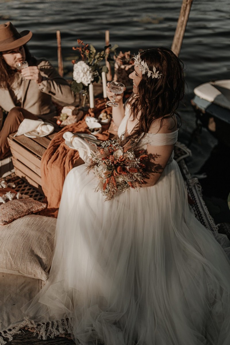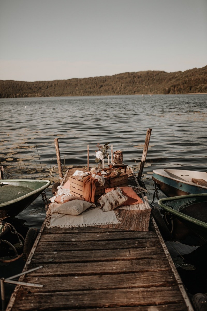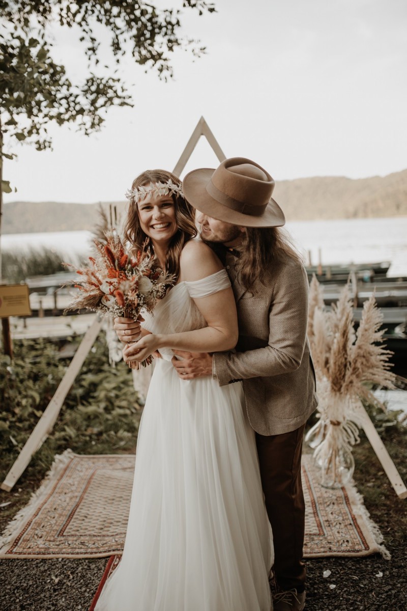 Nur du und ich auf einem verlassenen Bootssteg, die tiefstehende Sonne und die leichten Bewegungen des Seewassers. Klingt das nicht himmlisch? Ich würde sagen HELL YES! Und das ist nur der Beginn dieser wunderschönen Inspiration einer Elopement Wedding im Bohostil am schönen Laacher See! Wundervoll fotografiert von Hochzeitsfotografin Karina Wiebe, erwartete das bezaubernde Brautpaar Alina & Timm ein romantisches Picknick mit allerlei herzhaften Köstlichkeiten, auf dem Bootssteg am Seeufer. Kuschelig, dank Kissen und Decken, und romantisch, dank feinen Kerzenständern und frischen Blumen, inszenierte Hochzeitsplanerin From Sophie with love ein einmaliges Dinnersetting, mit einem Ausblick der Superlative. Hier begann für das Brautpaar ein außergewöhnlicher Tag, den sie so sicher nie vergessen werden. In einem eleganten Off-Shoulder Brautkleid mit opulent fließendem Rock von Audrey Wedding Salon und einem leichten Styling, kreiert von Styling by Sweta, stieß Alina mit ihrem Bräutigam Timm, der in einer braun-beigen Kombination aus Anzughose, lockerem Jacket und Hut glänzte, auf diesen besonderen Tag an. Neben den herzhaften Köstlichkeiten erwartete sie zudem eine Hochzeitstorte von Maggie’s Kuchen, dessen Cremedesign und Zuckerdekor seinesgleichen sucht. Doch ist dieses feine Plätzchen, wie bereits erwähnt, nur der Beginn dieser Wahnsinns Inspiration! Hochzeitsplanerin From Sophie with love hat das schöne Konzept dieser Inspiration kreiert und sich in der Planung so einiges einfallen lassen, das sie hier auch noch dekoriert hat. Denn nach den romantischen Stunden auf dem verlassenen Pier, erwartete das Brautpaar eine freie Trauzeremonie mit der lieben Sarah von Who is Karma – anyway, die diese intime Elopement Wedding perfekt machte. Vor einem großen, blumengeschmückten Traubogen aus Holz, mit Blick auf den See, wurde hier herzlich gelacht aber auch vor Freude geweint. Unterstützung bei der Dekoration dieses Elopements bekam die liebe Sophie von From Sophie with love von der Hochzeitsbouquetterie. Jess und ihr Team zauberten sowohl beim romantischen Dinnersetting, der opulenten Traulocation als auch beim Brautstrauß ganze Träume aus Trockenblumen. Passend zur Dekoration wurden vor allem erdige Töne gewählt, wie Braun, Beige und Creme, die mit warmen Rot- und zarten Weißtönen akzentuiert wurden. Ein Mix aus verschiedenen Strukturen gibt diesem harmonischen Konzept sowohl in der Floristik als auch in der Dekoration den herrlich rustikalen Bohocharm. Schon beim Dinnersetting setze From Sophie with love auf verschiedene Strukturen in den Details. Grobe, gehäkelte sowie glatte Stoffe treffen auf das unbehandelte Holz der Kisten und werden durch das glatte, glänzende Gold komplementiert. Wer noch nach Inspirationen für seine spätsommerliche oder herbstliche Bohohochzeit sucht, der ist hier in jedem Fall goldrichtig!