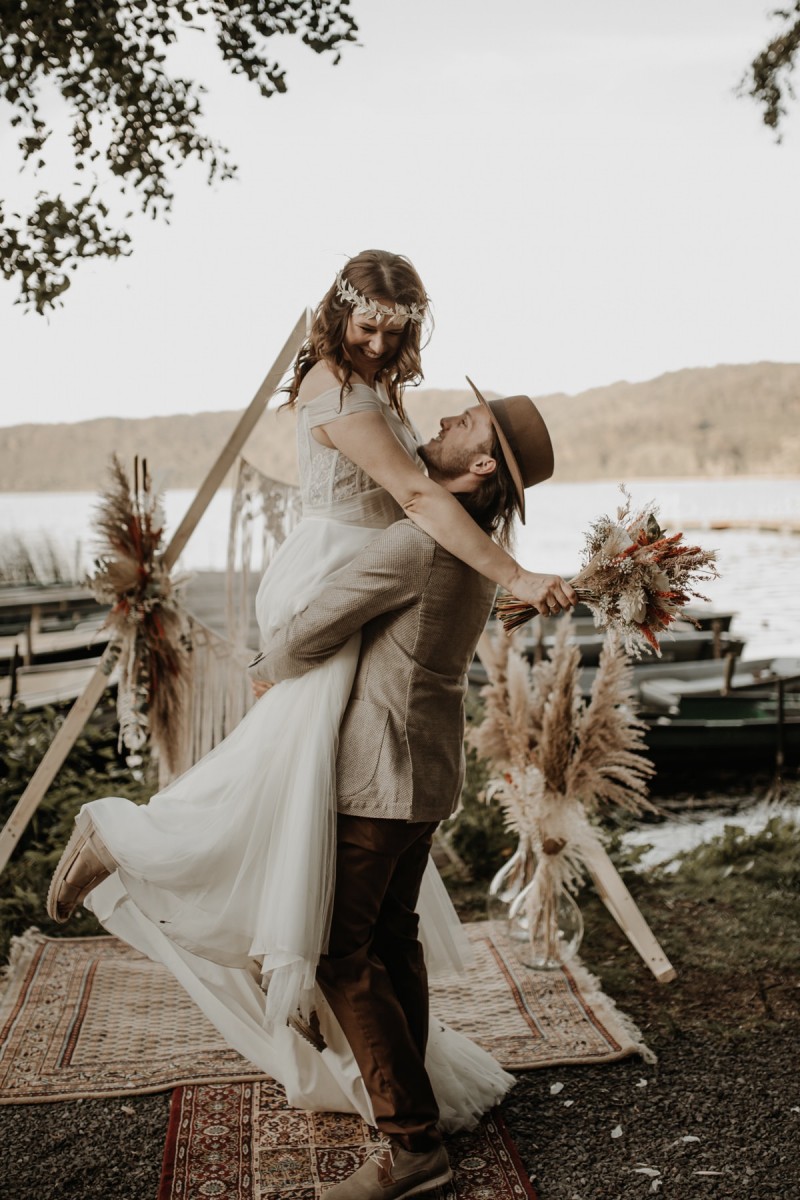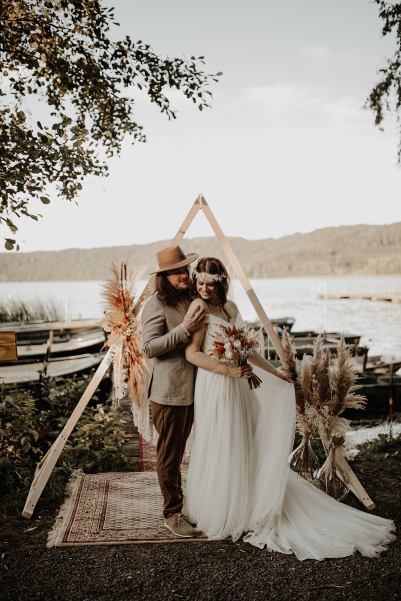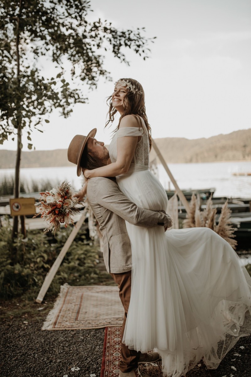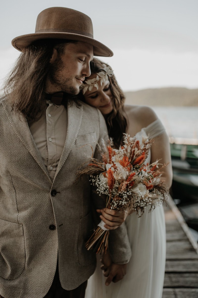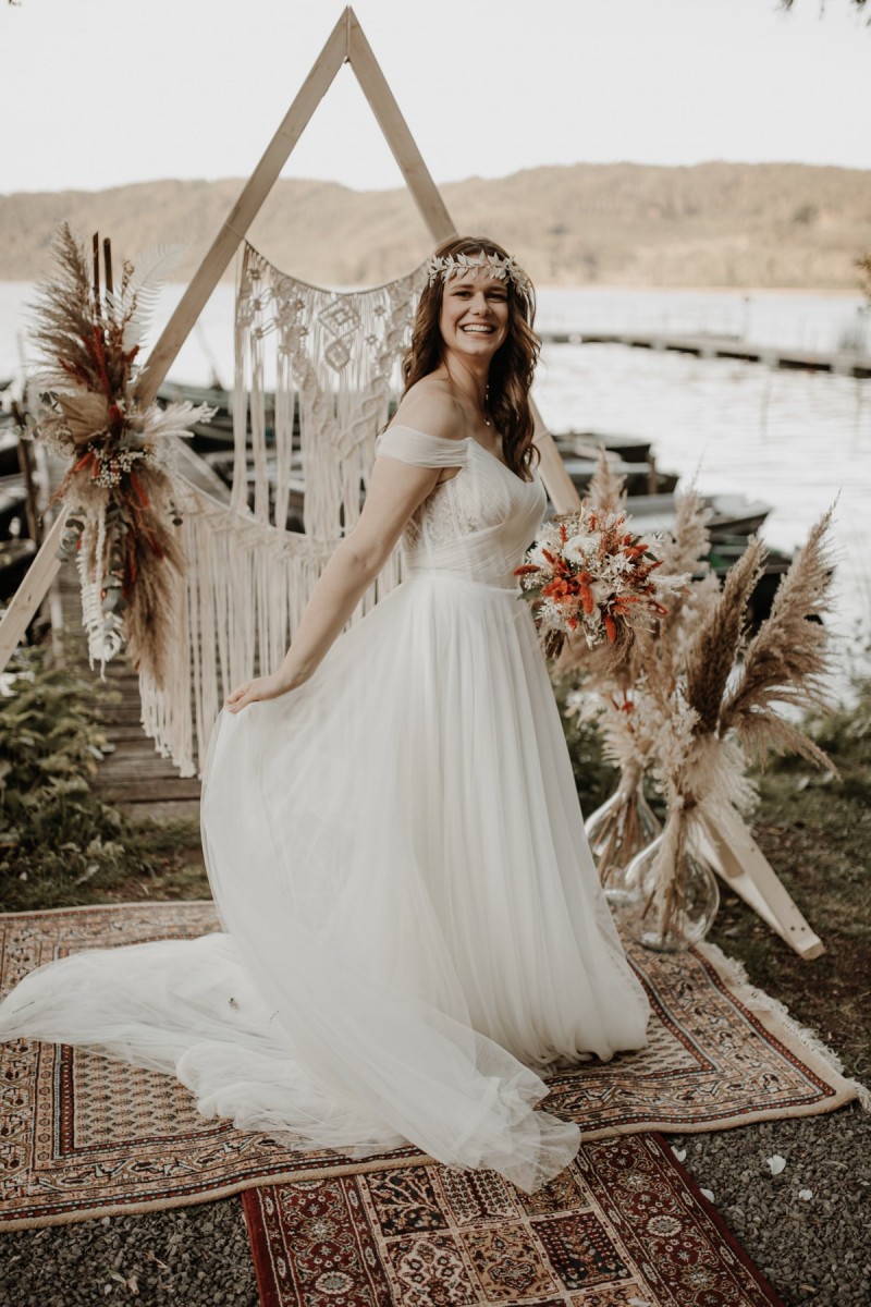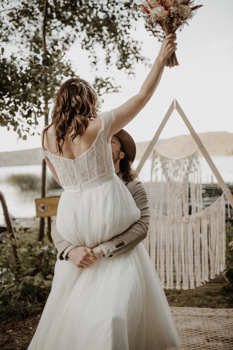 Nur du und ich auf einem verlassenen Bootssteg, die tiefstehende Sonne und die leichten Bewegungen des Seewassers. Klingt das nicht himmlisch? Ich würde sagen HELL YES! Und das ist nur der Beginn dieser wunderschönen Inspiration einer Elopement Wedding im Bohostil am schönen Laacher See! Wundervoll fotografiert von Hochzeitsfotografin Karina Wiebe, erwartete das bezaubernde Brautpaar Alina & Timm ein romantisches Picknick mit allerlei herzhaften Köstlichkeiten, auf dem Bootssteg am Seeufer. Kuschelig, dank Kissen und Decken, und romantisch, dank feinen Kerzenständern und frischen Blumen, inszenierte Hochzeitsplanerin From Sophie with love ein einmaliges Dinnersetting, mit einem Ausblick der Superlative. Hier begann für das Brautpaar ein außergewöhnlicher Tag, den sie so sicher nie vergessen werden. In einem eleganten Off-Shoulder Brautkleid mit opulent fließendem Rock von Audrey Wedding Salon und einem leichten Styling, kreiert von Styling by Sweta, stieß Alina mit ihrem Bräutigam Timm, der in einer braun-beigen Kombination aus Anzughose, lockerem Jacket und Hut glänzte, auf diesen besonderen Tag an. Neben den herzhaften Köstlichkeiten erwartete sie zudem eine Hochzeitstorte von Maggie’s Kuchen, dessen Cremedesign und Zuckerdekor seinesgleichen sucht. Doch ist dieses feine Plätzchen, wie bereits erwähnt, nur der Beginn dieser Wahnsinns Inspiration! Hochzeitsplanerin From Sophie with love hat das schöne Konzept dieser Inspiration kreiert und sich in der Planung so einiges einfallen lassen, das sie hier auch noch dekoriert hat. Denn nach den romantischen Stunden auf dem verlassenen Pier, erwartete das Brautpaar eine freie Trauzeremonie mit der lieben Sarah von Who is Karma – anyway, die diese intime Elopement Wedding perfekt machte. Vor einem großen, blumengeschmückten Traubogen aus Holz, mit Blick auf den See, wurde hier herzlich gelacht aber auch vor Freude geweint. Unterstützung bei der Dekoration dieses Elopements bekam die liebe Sophie von From Sophie with love von der Hochzeitsbouquetterie. Jess und ihr Team zauberten sowohl beim romantischen Dinnersetting, der opulenten Traulocation als auch beim Brautstrauß ganze Träume aus Trockenblumen. Passend zur Dekoration wurden vor allem erdige Töne gewählt, wie Braun, Beige und Creme, die mit warmen Rot- und zarten Weißtönen akzentuiert wurden. Ein Mix aus verschiedenen Strukturen gibt diesem harmonischen Konzept sowohl in der Floristik als auch in der Dekoration den herrlich rustikalen Bohocharm. Schon beim Dinnersetting setze From Sophie with love auf verschiedene Strukturen in den Details. Grobe, gehäkelte sowie glatte Stoffe treffen auf das unbehandelte Holz der Kisten und werden durch das glatte, glänzende Gold komplementiert. Wer noch nach Inspirationen für seine spätsommerliche oder herbstliche Bohohochzeit sucht, der ist hier in jedem Fall goldrichtig!