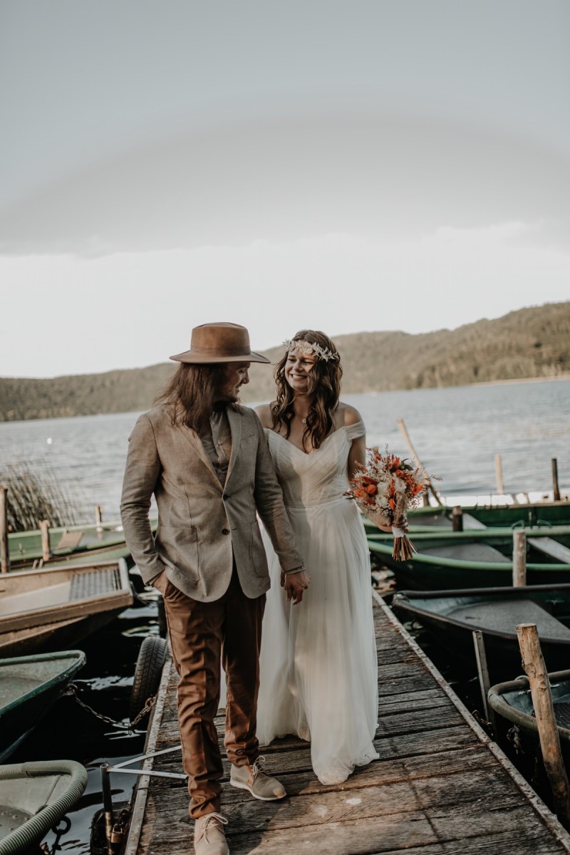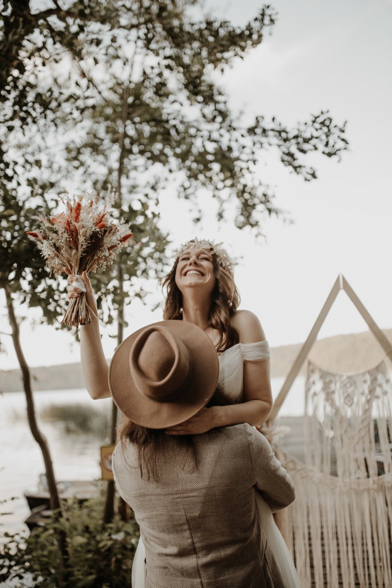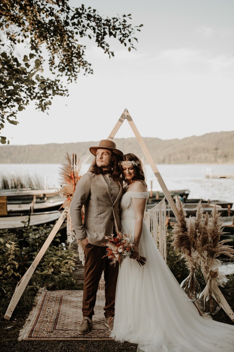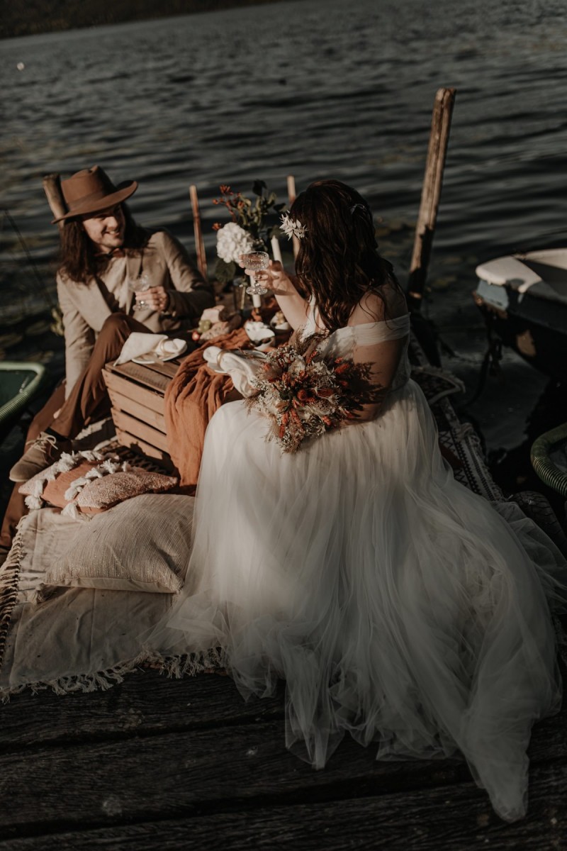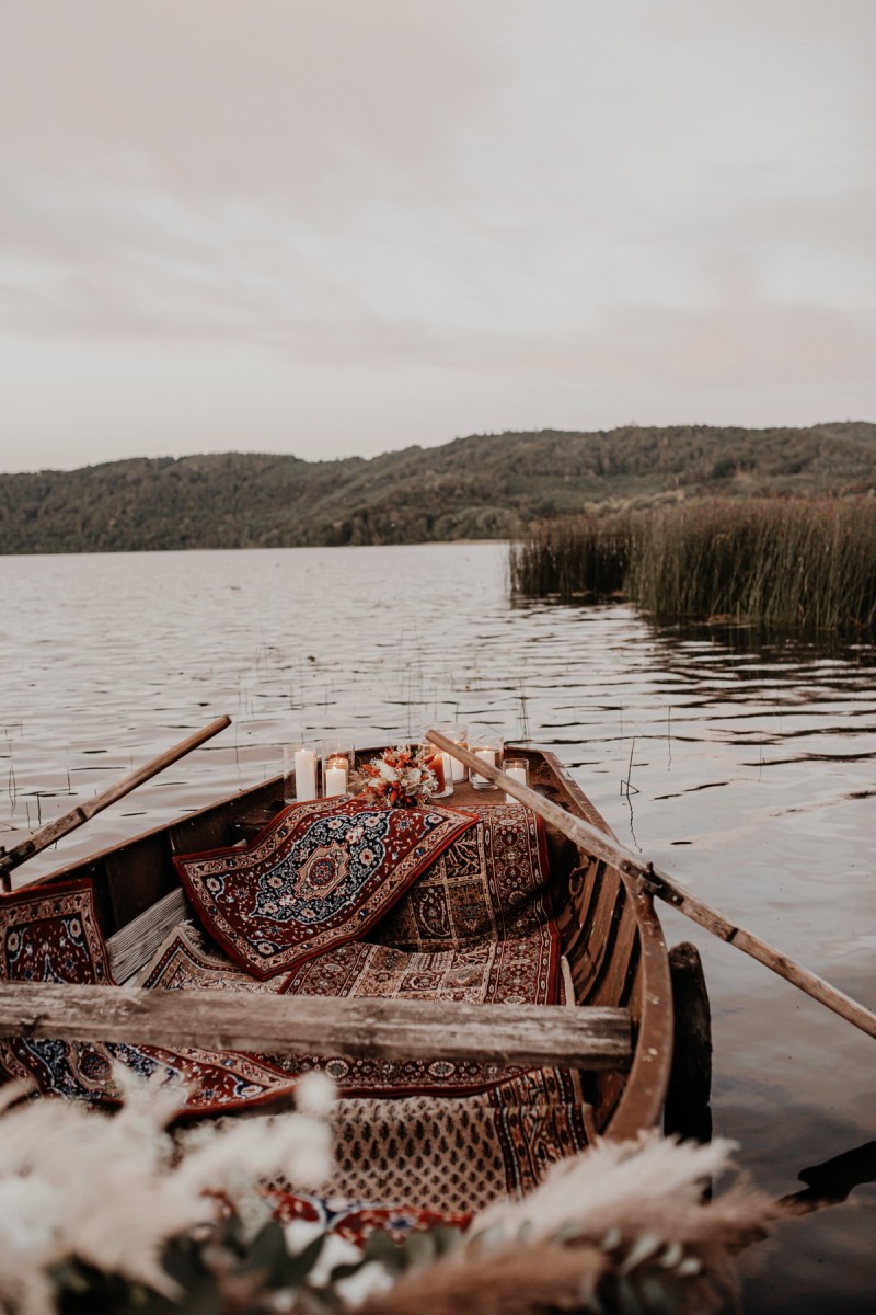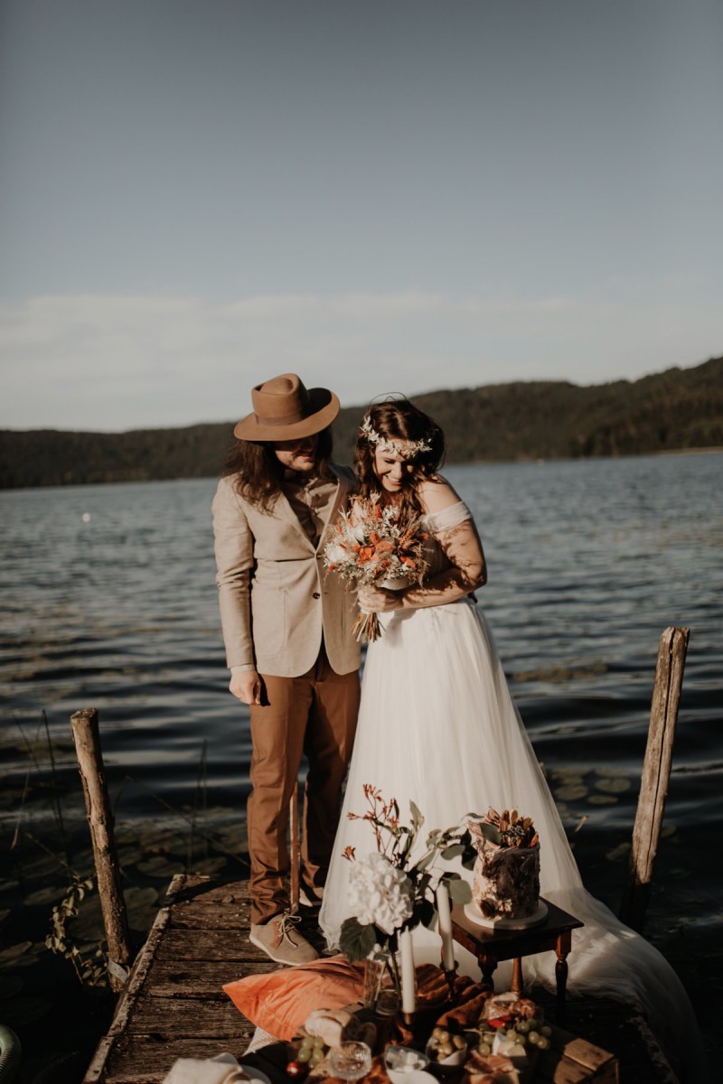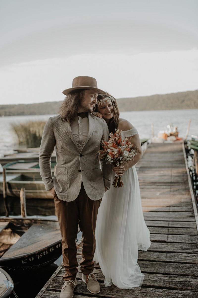 Nur du und ich auf einem verlassenen Bootssteg, die tiefstehende Sonne und die leichten Bewegungen des Seewassers. Klingt das nicht himmlisch? Ich würde sagen HELL YES! Und das ist nur der Beginn dieser wunderschönen Inspiration einer Elopement Wedding im Bohostil am schönen Laacher See! Wundervoll fotografiert von Hochzeitsfotografin Karina Wiebe, erwartete das bezaubernde Brautpaar Alina & Timm ein romantisches Picknick mit allerlei herzhaften Köstlichkeiten, auf dem Bootssteg am Seeufer. Kuschelig, dank Kissen und Decken, und romantisch, dank feinen Kerzenständern und frischen Blumen, inszenierte Hochzeitsplanerin From Sophie with love ein einmaliges Dinnersetting, mit einem Ausblick der Superlative. Hier begann für das Brautpaar ein außergewöhnlicher Tag, den sie so sicher nie vergessen werden. In einem eleganten Off-Shoulder Brautkleid mit opulent fließendem Rock von Audrey Wedding Salon und einem leichten Styling, kreiert von Styling by Sweta, stieß Alina mit ihrem Bräutigam Timm, der in einer braun-beigen Kombination aus Anzughose, lockerem Jacket und Hut glänzte, auf diesen besonderen Tag an. Neben den herzhaften Köstlichkeiten erwartete sie zudem eine Hochzeitstorte von Maggie’s Kuchen, dessen Cremedesign und Zuckerdekor seinesgleichen sucht. Doch ist dieses feine Plätzchen, wie bereits erwähnt, nur der Beginn dieser Wahnsinns Inspiration! Hochzeitsplanerin From Sophie with love hat das schöne Konzept dieser Inspiration kreiert und sich in der Planung so einiges einfallen lassen, das sie hier auch noch dekoriert hat. Denn nach den romantischen Stunden auf dem verlassenen Pier, erwartete das Brautpaar eine freie Trauzeremonie mit der lieben Sarah von Who is Karma – anyway, die diese intime Elopement Wedding perfekt machte. Vor einem großen, blumengeschmückten Traubogen aus Holz, mit Blick auf den See, wurde hier herzlich gelacht aber auch vor Freude geweint. Unterstützung bei der Dekoration dieses Elopements bekam die liebe Sophie von From Sophie with love von der Hochzeitsbouquetterie. Jess und ihr Team zauberten sowohl beim romantischen Dinnersetting, der opulenten Traulocation als auch beim Brautstrauß ganze Träume aus Trockenblumen. Passend zur Dekoration wurden vor allem erdige Töne gewählt, wie Braun, Beige und Creme, die mit warmen Rot- und zarten Weißtönen akzentuiert wurden. Ein Mix aus verschiedenen Strukturen gibt diesem harmonischen Konzept sowohl in der Floristik als auch in der Dekoration den herrlich rustikalen Bohocharm. Schon beim Dinnersetting setze From Sophie with love auf verschiedene Strukturen in den Details. Grobe, gehäkelte sowie glatte Stoffe treffen auf das unbehandelte Holz der Kisten und werden durch das glatte, glänzende Gold komplementiert. Wer noch nach Inspirationen für seine spätsommerliche oder herbstliche Bohohochzeit sucht, der ist hier in jedem Fall goldrichtig!