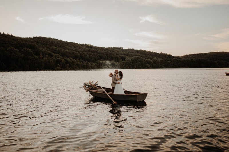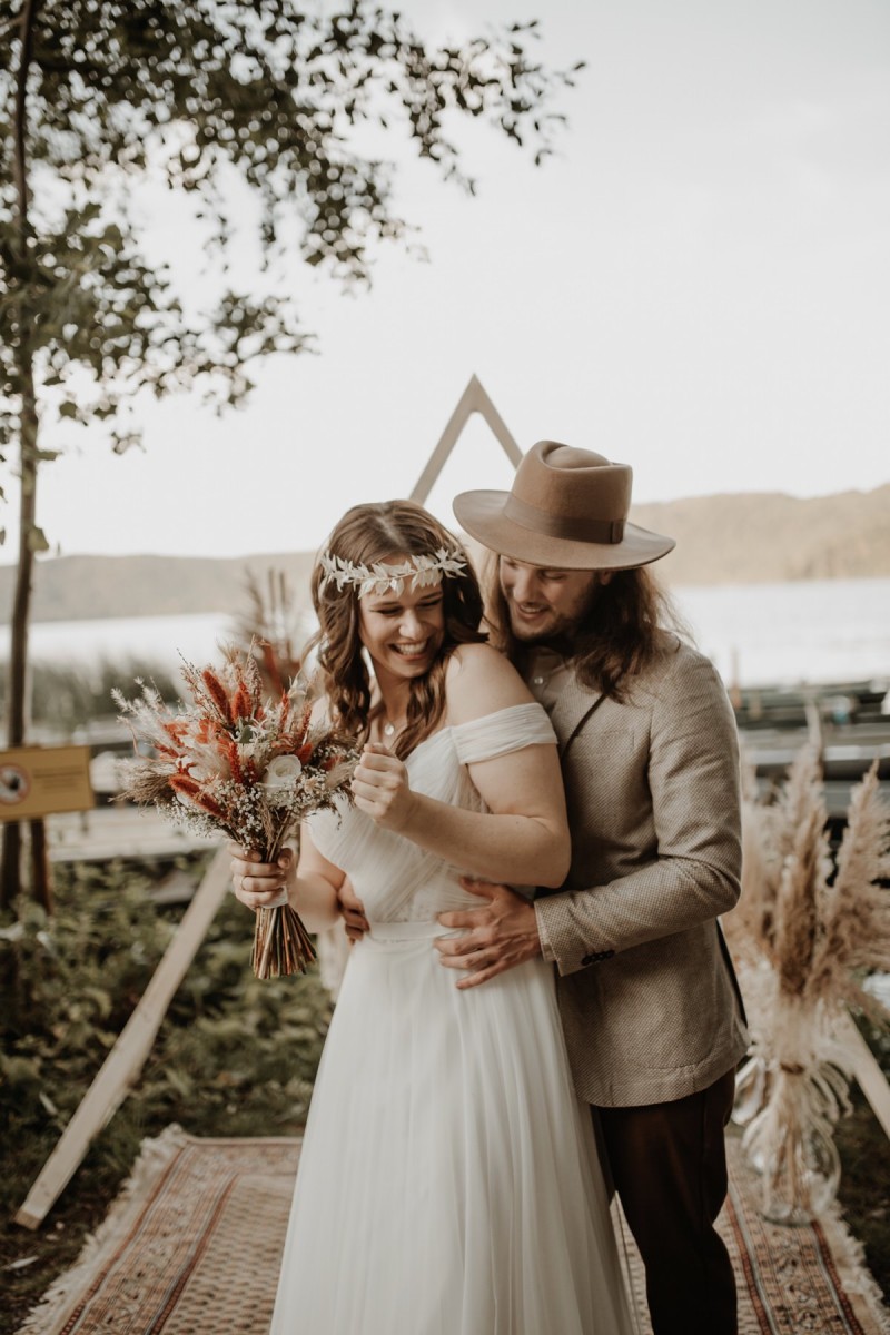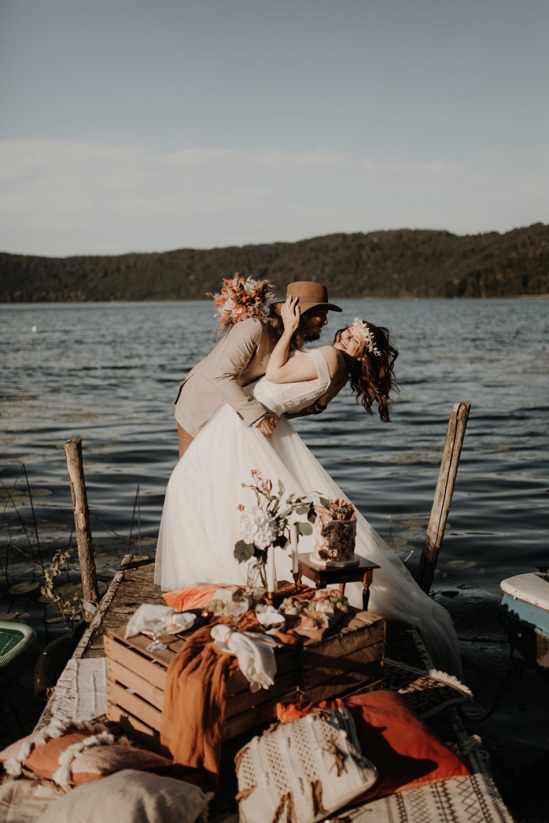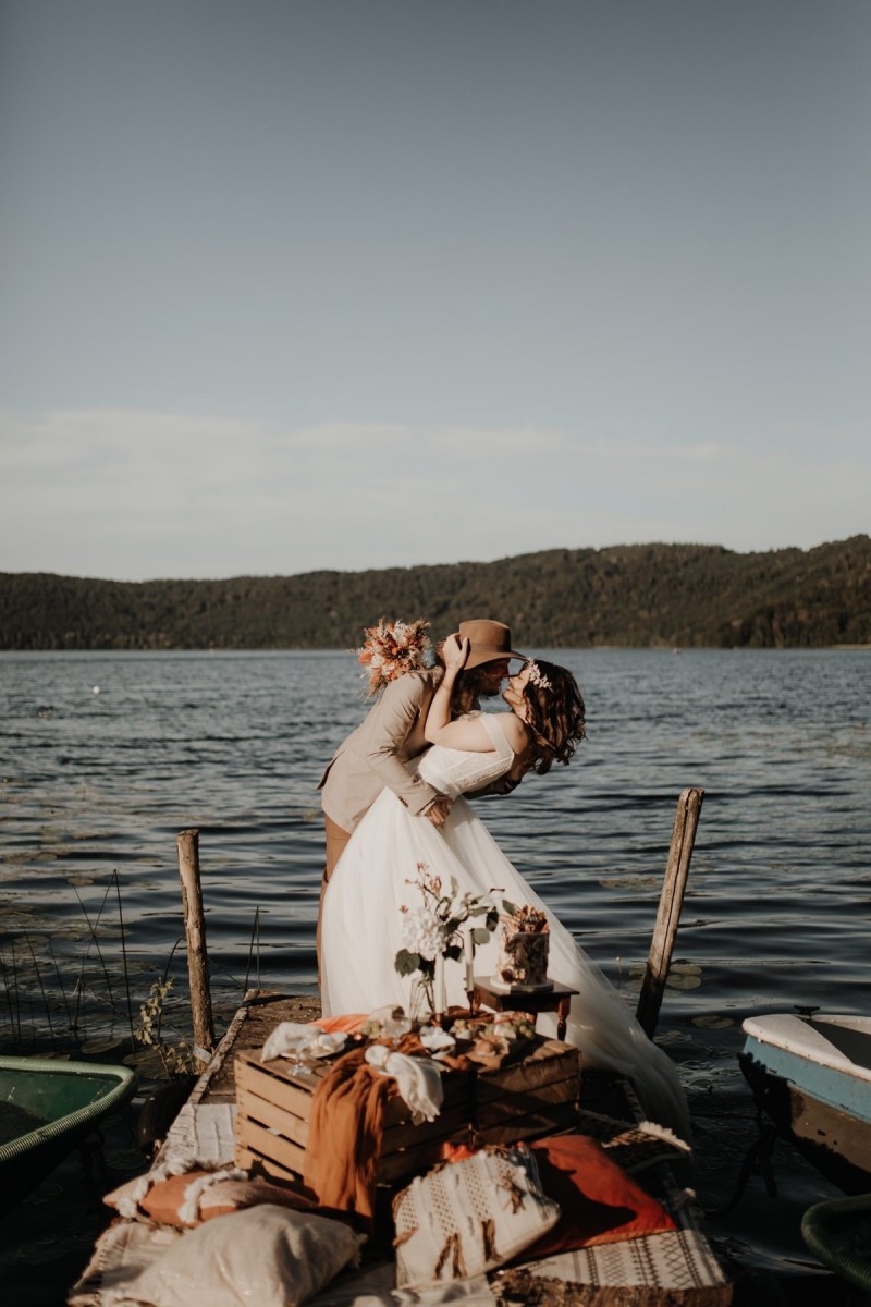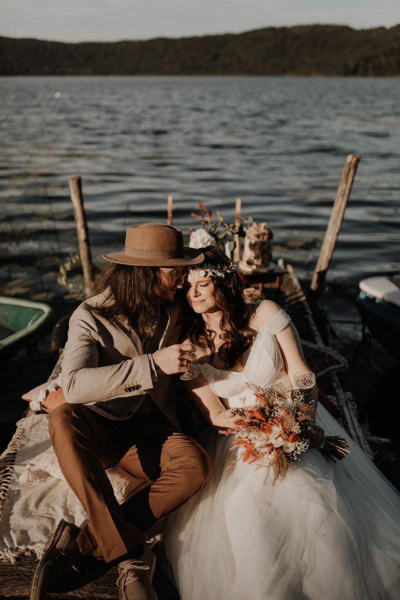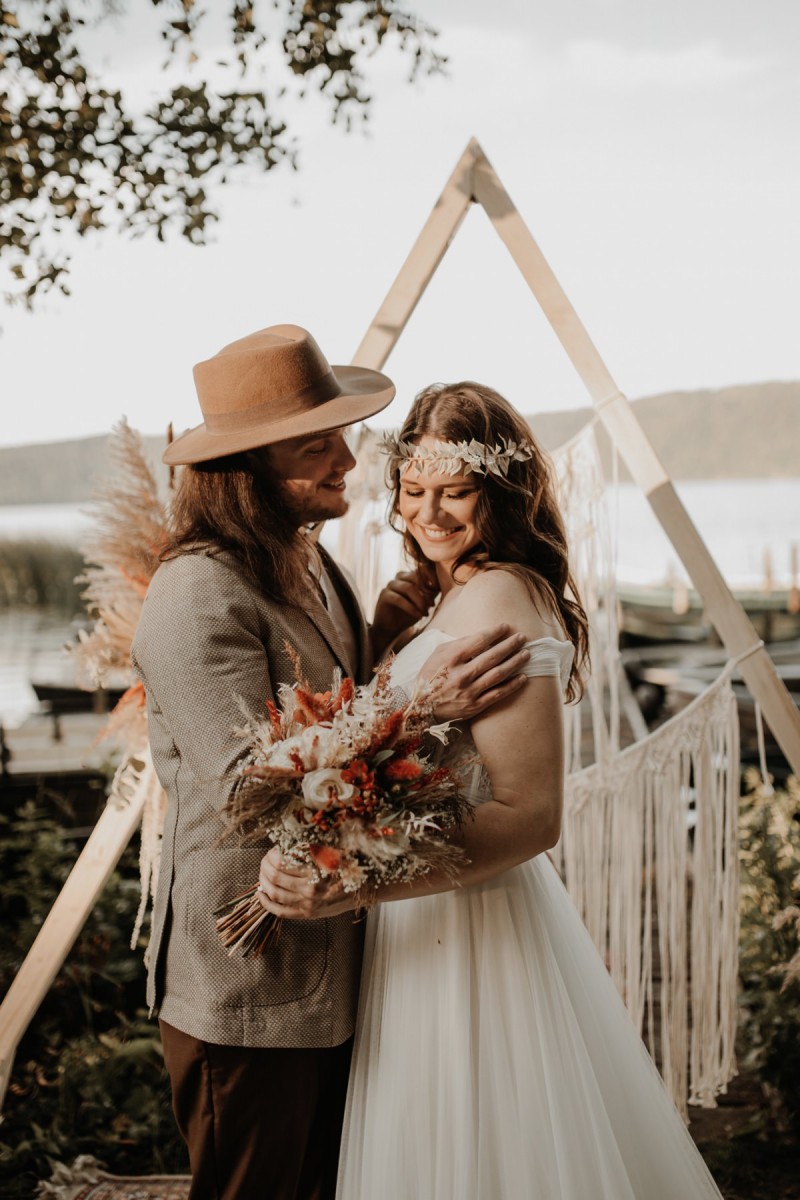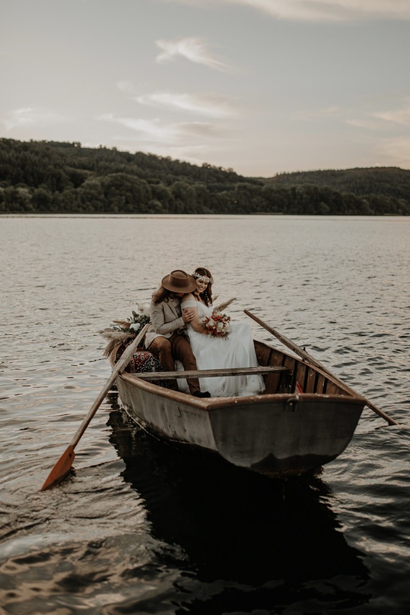 Nur du und ich auf einem verlassenen Bootssteg, die tiefstehende Sonne und die leichten Bewegungen des Seewassers. Klingt das nicht himmlisch? Ich würde sagen HELL YES! Und das ist nur der Beginn dieser wunderschönen Inspiration einer Elopement Wedding im Bohostil am schönen Laacher See! Wundervoll fotografiert von Hochzeitsfotografin Karina Wiebe, erwartete das bezaubernde Brautpaar Alina & Timm ein romantisches Picknick mit allerlei herzhaften Köstlichkeiten, auf dem Bootssteg am Seeufer. Kuschelig, dank Kissen und Decken, und romantisch, dank feinen Kerzenständern und frischen Blumen, inszenierte Hochzeitsplanerin From Sophie with love ein einmaliges Dinnersetting, mit einem Ausblick der Superlative. Hier begann für das Brautpaar ein außergewöhnlicher Tag, den sie so sicher nie vergessen werden. In einem eleganten Off-Shoulder Brautkleid mit opulent fließendem Rock von Audrey Wedding Salon und einem leichten Styling, kreiert von Styling by Sweta, stieß Alina mit ihrem Bräutigam Timm, der in einer braun-beigen Kombination aus Anzughose, lockerem Jacket und Hut glänzte, auf diesen besonderen Tag an. Neben den herzhaften Köstlichkeiten erwartete sie zudem eine Hochzeitstorte von Maggie’s Kuchen, dessen Cremedesign und Zuckerdekor seinesgleichen sucht. Doch ist dieses feine Plätzchen, wie bereits erwähnt, nur der Beginn dieser Wahnsinns Inspiration! Hochzeitsplanerin From Sophie with love hat das schöne Konzept dieser Inspiration kreiert und sich in der Planung so einiges einfallen lassen, das sie hier auch noch dekoriert hat. Denn nach den romantischen Stunden auf dem verlassenen Pier, erwartete das Brautpaar eine freie Trauzeremonie mit der lieben Sarah von Who is Karma – anyway, die diese intime Elopement Wedding perfekt machte. Vor einem großen, blumengeschmückten Traubogen aus Holz, mit Blick auf den See, wurde hier herzlich gelacht aber auch vor Freude geweint. Unterstützung bei der Dekoration dieses Elopements bekam die liebe Sophie von From Sophie with love von der Hochzeitsbouquetterie. Jess und ihr Team zauberten sowohl beim romantischen Dinnersetting, der opulenten Traulocation als auch beim Brautstrauß ganze Träume aus Trockenblumen. Passend zur Dekoration wurden vor allem erdige Töne gewählt, wie Braun, Beige und Creme, die mit warmen Rot- und zarten Weißtönen akzentuiert wurden. Ein Mix aus verschiedenen Strukturen gibt diesem harmonischen Konzept sowohl in der Floristik als auch in der Dekoration den herrlich rustikalen Bohocharm. Schon beim Dinnersetting setze From Sophie with love auf verschiedene Strukturen in den Details. Grobe, gehäkelte sowie glatte Stoffe treffen auf das unbehandelte Holz der Kisten und werden durch das glatte, glänzende Gold komplementiert. Wer noch nach Inspirationen für seine spätsommerliche oder herbstliche Bohohochzeit sucht, der ist hier in jedem Fall goldrichtig!