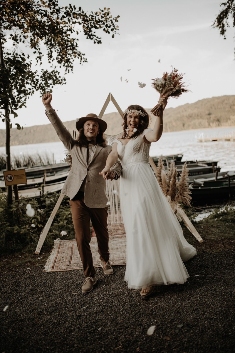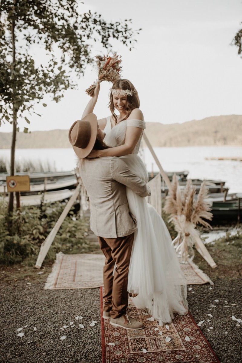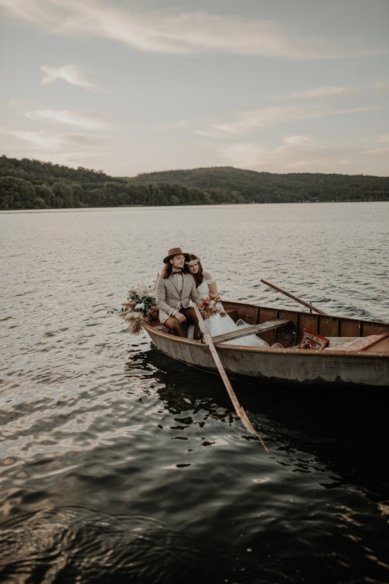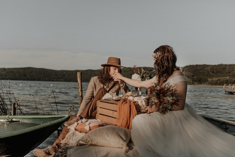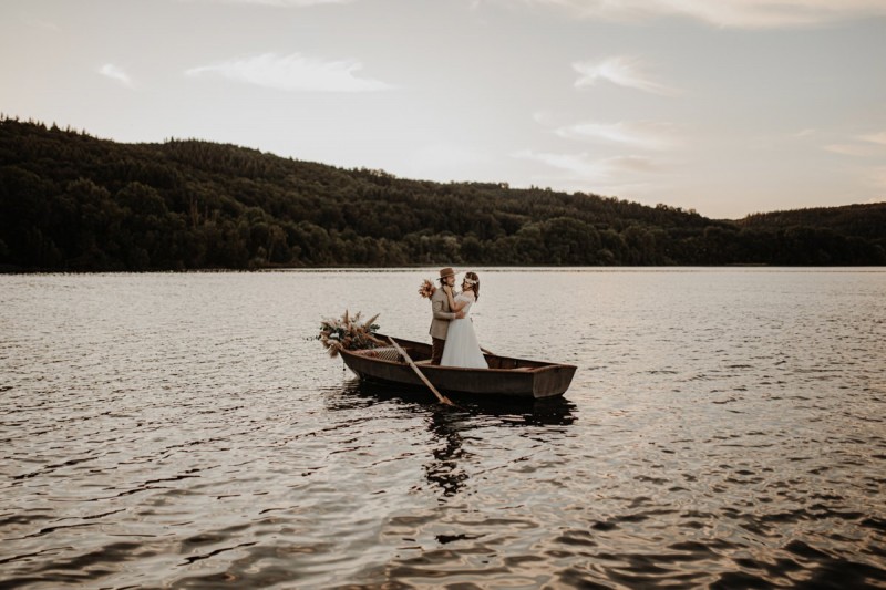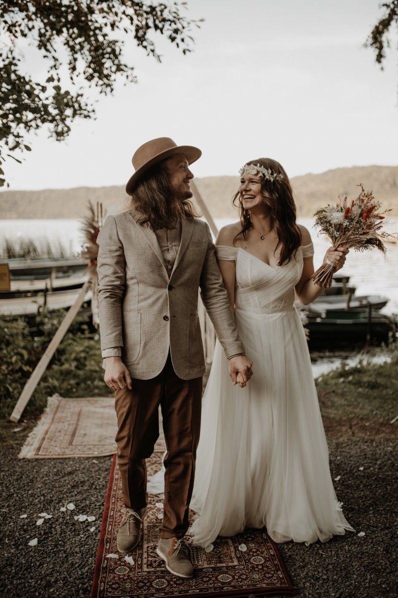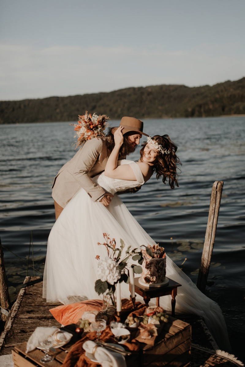 Nur du und ich auf einem verlassenen Bootssteg, die tiefstehende Sonne und die leichten Bewegungen des Seewassers. Klingt das nicht himmlisch? Ich würde sagen HELL YES! Und das ist nur der Beginn dieser wunderschönen Inspiration einer Elopement Wedding im Bohostil am schönen Laacher See! Wundervoll fotografiert von Hochzeitsfotografin Karina Wiebe, erwartete das bezaubernde Brautpaar Alina & Timm ein romantisches Picknick mit allerlei herzhaften Köstlichkeiten, auf dem Bootssteg am Seeufer. Kuschelig, dank Kissen und Decken, und romantisch, dank feinen Kerzenständern und frischen Blumen, inszenierte Hochzeitsplanerin From Sophie with love ein einmaliges Dinnersetting, mit einem Ausblick der Superlative. Hier begann für das Brautpaar ein außergewöhnlicher Tag, den sie so sicher nie vergessen werden. In einem eleganten Off-Shoulder Brautkleid mit opulent fließendem Rock von Audrey Wedding Salon und einem leichten Styling, kreiert von Styling by Sweta, stieß Alina mit ihrem Bräutigam Timm, der in einer braun-beigen Kombination aus Anzughose, lockerem Jacket und Hut glänzte, auf diesen besonderen Tag an. Neben den herzhaften Köstlichkeiten erwartete sie zudem eine Hochzeitstorte von Maggie’s Kuchen, dessen Cremedesign und Zuckerdekor seinesgleichen sucht. Doch ist dieses feine Plätzchen, wie bereits erwähnt, nur der Beginn dieser Wahnsinns Inspiration! Hochzeitsplanerin From Sophie with love hat das schöne Konzept dieser Inspiration kreiert und sich in der Planung so einiges einfallen lassen, das sie hier auch noch dekoriert hat. Denn nach den romantischen Stunden auf dem verlassenen Pier, erwartete das Brautpaar eine freie Trauzeremonie mit der lieben Sarah von Who is Karma – anyway, die diese intime Elopement Wedding perfekt machte. Vor einem großen, blumengeschmückten Traubogen aus Holz, mit Blick auf den See, wurde hier herzlich gelacht aber auch vor Freude geweint. Unterstützung bei der Dekoration dieses Elopements bekam die liebe Sophie von From Sophie with love von der Hochzeitsbouquetterie. Jess und ihr Team zauberten sowohl beim romantischen Dinnersetting, der opulenten Traulocation als auch beim Brautstrauß ganze Träume aus Trockenblumen. Passend zur Dekoration wurden vor allem erdige Töne gewählt, wie Braun, Beige und Creme, die mit warmen Rot- und zarten Weißtönen akzentuiert wurden. Ein Mix aus verschiedenen Strukturen gibt diesem harmonischen Konzept sowohl in der Floristik als auch in der Dekoration den herrlich rustikalen Bohocharm. Schon beim Dinnersetting setze From Sophie with love auf verschiedene Strukturen in den Details. Grobe, gehäkelte sowie glatte Stoffe treffen auf das unbehandelte Holz der Kisten und werden durch das glatte, glänzende Gold komplementiert. Wer noch nach Inspirationen für seine spätsommerliche oder herbstliche Bohohochzeit sucht, der ist hier in jedem Fall goldrichtig!