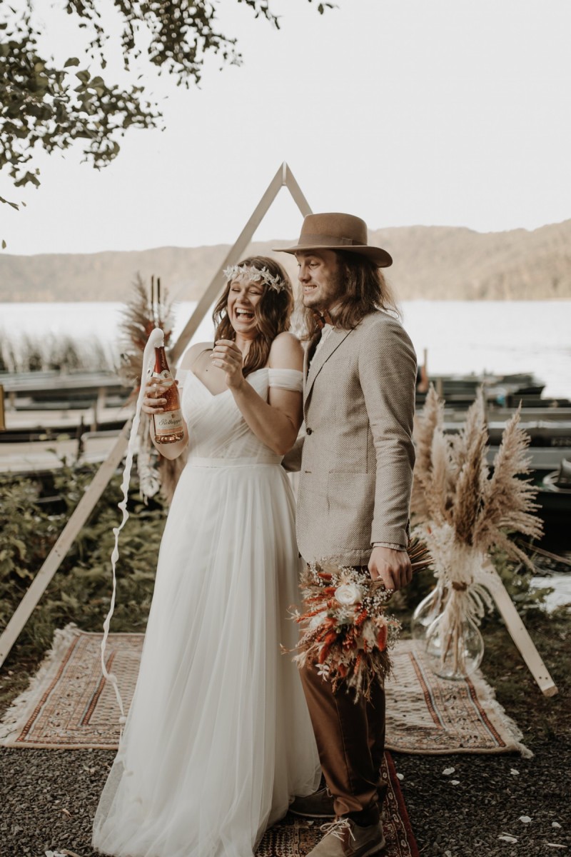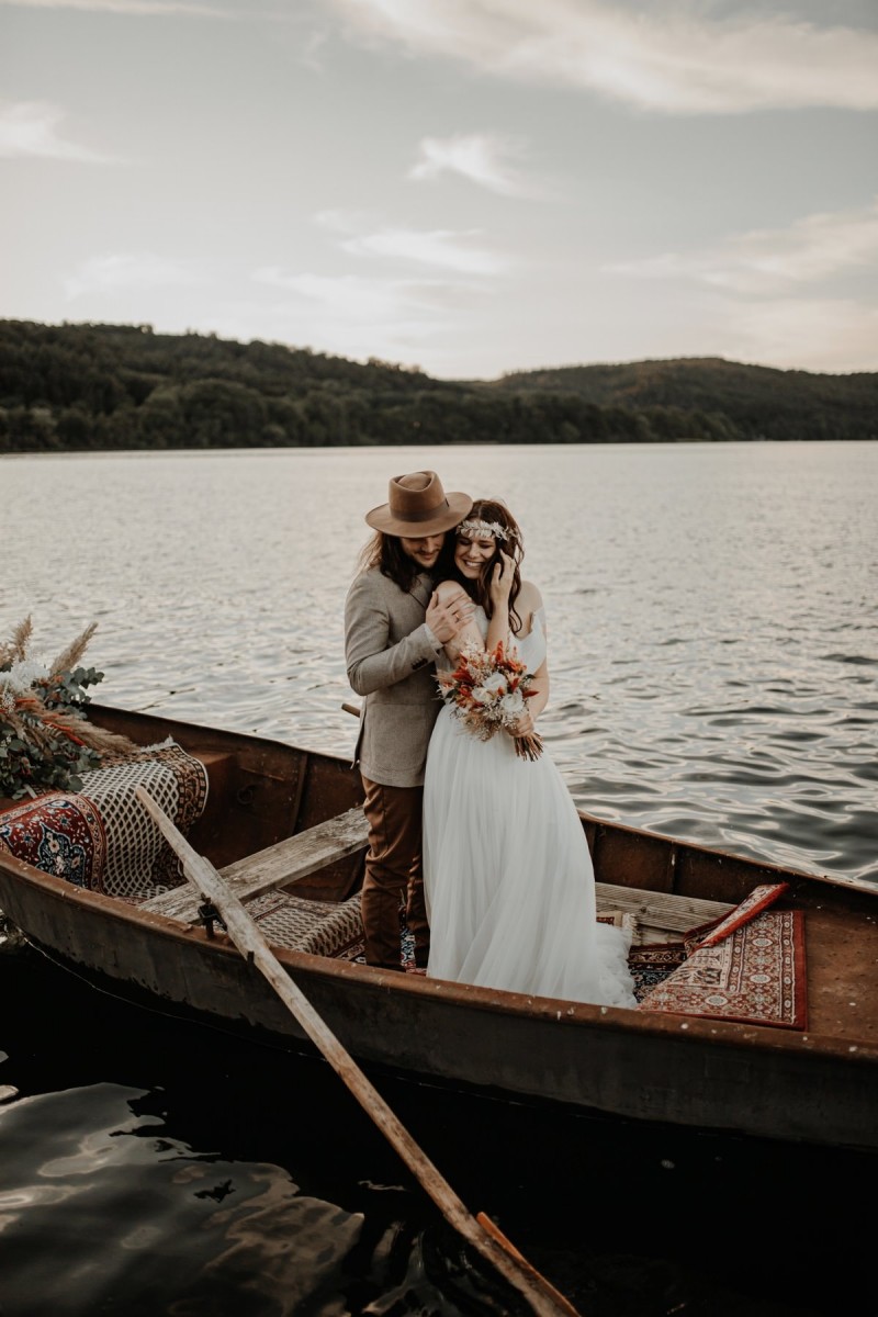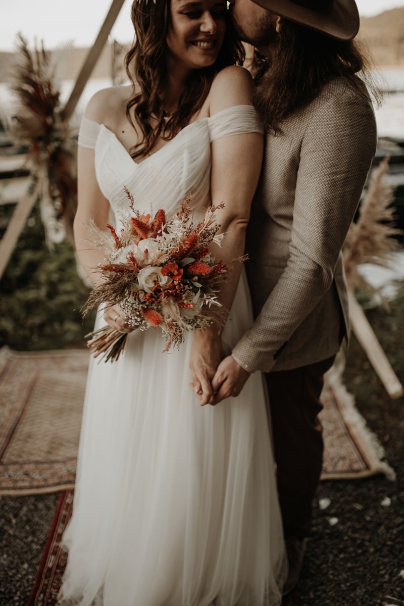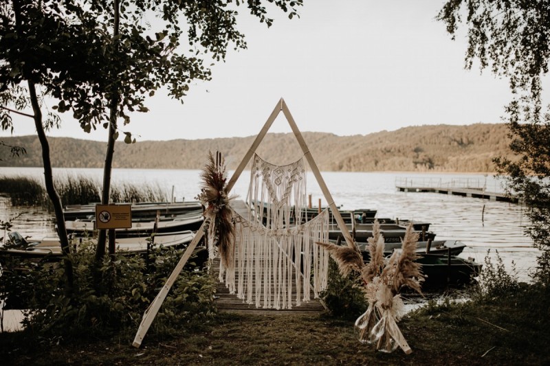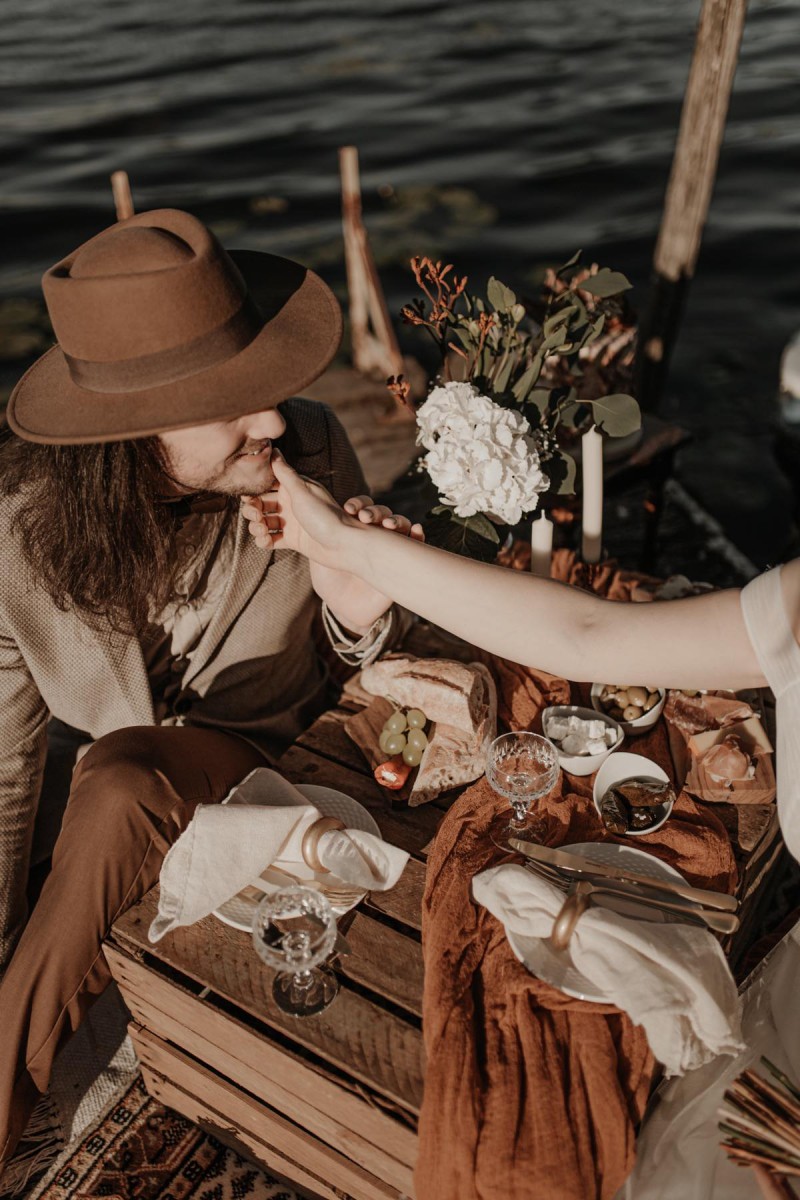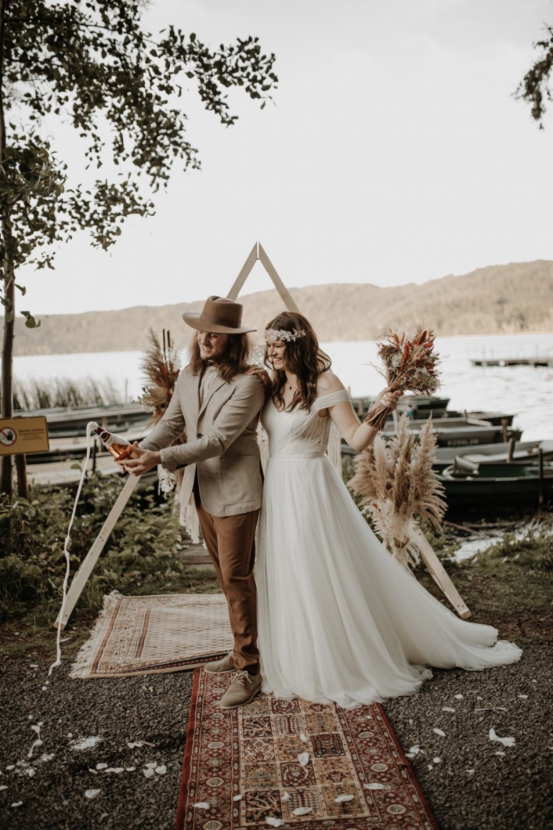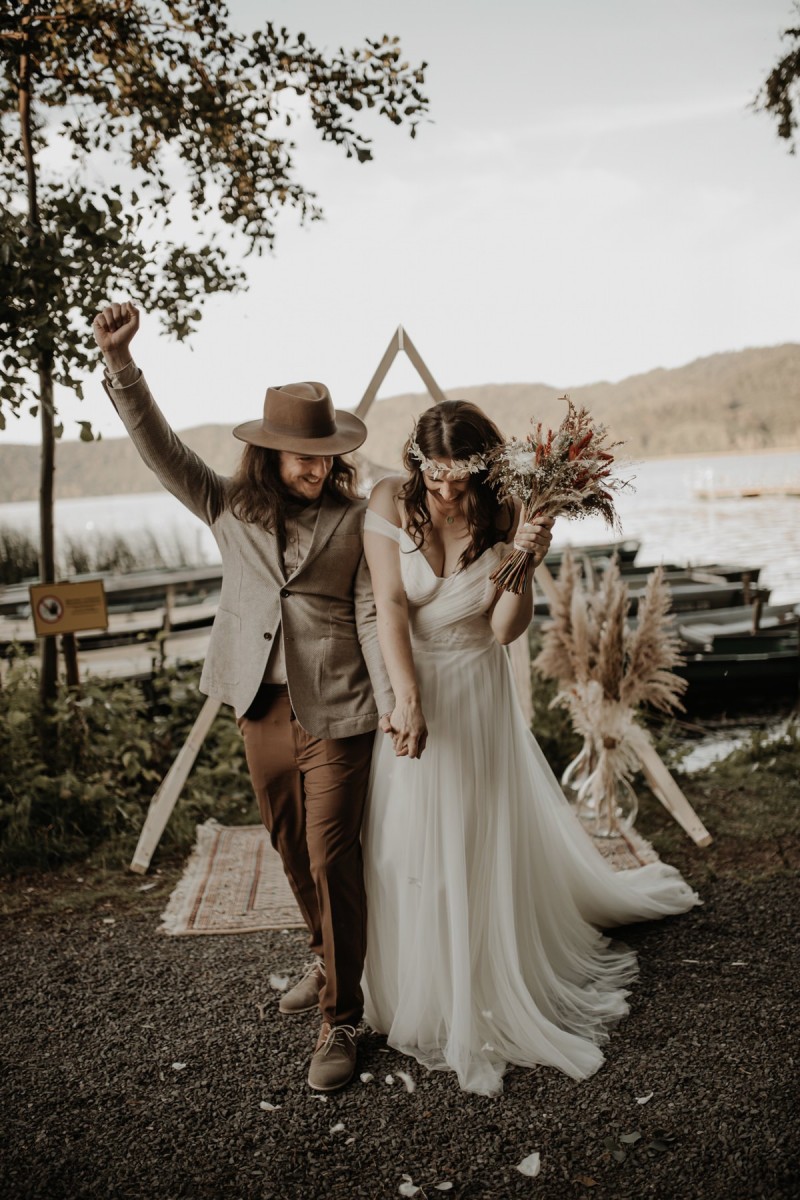Nur du und ich auf einem verlassenen Bootssteg, die tiefstehende Sonne und die leichten Bewegungen des Seewassers. Klingt das nicht himmlisch? Ich würde sagen HELL YES! Und das ist nur der Beginn dieser wunderschönen Inspiration einer Elopement Wedding im Bohostil am schönen Laacher See! Wundervoll fotografiert von Hochzeitsfotografin Karina Wiebe, erwartete das bezaubernde Brautpaar Alina & Timm ein romantisches Picknick mit allerlei herzhaften Köstlichkeiten, auf dem Bootssteg am Seeufer. Kuschelig, dank Kissen und Decken, und romantisch, dank feinen Kerzenständern und frischen Blumen, inszenierte Hochzeitsplanerin From Sophie with love ein einmaliges Dinnersetting, mit einem Ausblick der Superlative. Hier begann für das Brautpaar ein außergewöhnlicher Tag, den sie so sicher nie vergessen werden. In einem eleganten Off-Shoulder Brautkleid mit opulent fließendem Rock von Audrey Wedding Salon und einem leichten Styling, kreiert von Styling by Sweta, stieß Alina mit ihrem Bräutigam Timm, der in einer braun-beigen Kombination aus Anzughose, lockerem Jacket und Hut glänzte, auf diesen besonderen Tag an. Neben den herzhaften Köstlichkeiten erwartete sie zudem eine Hochzeitstorte von Maggie’s Kuchen, dessen Cremedesign und Zuckerdekor seinesgleichen sucht. Doch ist dieses feine Plätzchen, wie bereits erwähnt, nur der Beginn dieser Wahnsinns Inspiration! Hochzeitsplanerin From Sophie with love hat das schöne Konzept dieser Inspiration kreiert und sich in der Planung so einiges einfallen lassen, das sie hier auch noch dekoriert hat. Denn nach den romantischen Stunden auf dem verlassenen Pier, erwartete das Brautpaar eine freie Trauzeremonie mit der lieben Sarah von Who is Karma – anyway, die diese intime Elopement Wedding perfekt machte. Vor einem großen, blumengeschmückten Traubogen aus Holz, mit Blick auf den See, wurde hier herzlich gelacht aber auch vor Freude geweint. Unterstützung bei der Dekoration dieses Elopements bekam die liebe Sophie von From Sophie with love von der Hochzeitsbouquetterie. Jess und ihr Team zauberten sowohl beim romantischen Dinnersetting, der opulenten Traulocation als auch beim Brautstrauß ganze Träume aus Trockenblumen. Passend zur Dekoration wurden vor allem erdige Töne gewählt, wie Braun, Beige und Creme, die mit warmen Rot- und zarten Weißtönen akzentuiert wurden. Ein Mix aus verschiedenen Strukturen gibt diesem harmonischen Konzept sowohl in der Floristik als auch in der Dekoration den herrlich rustikalen Bohocharm. Schon beim Dinnersetting setze From Sophie with love auf verschiedene Strukturen in den Details. Grobe, gehäkelte sowie glatte Stoffe treffen auf das unbehandelte Holz der Kisten und werden durch das glatte, glänzende Gold komplementiert. Wer noch nach Inspirationen für seine spätsommerliche oder herbstliche Bohohochzeit sucht, der ist hier in jedem Fall goldrichtig!
