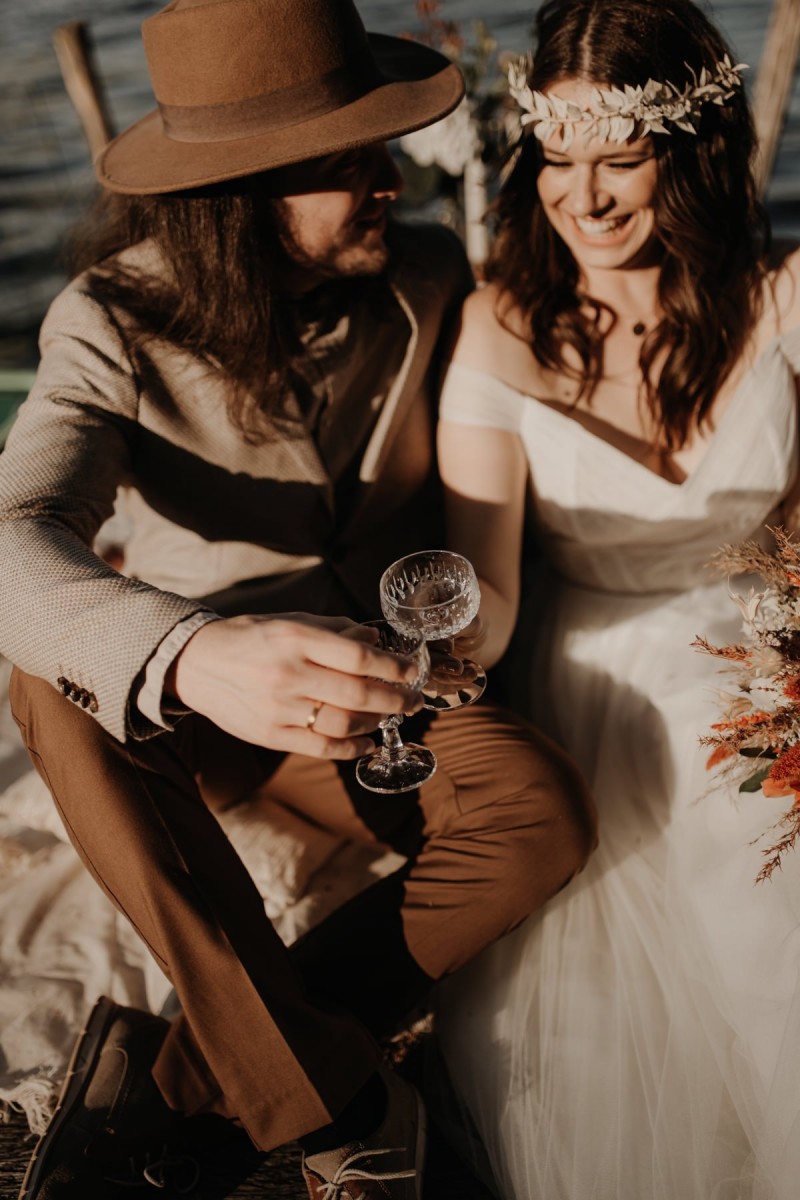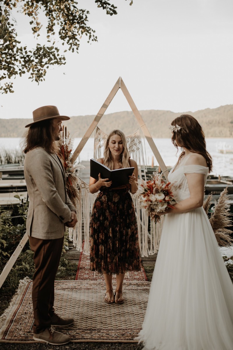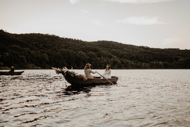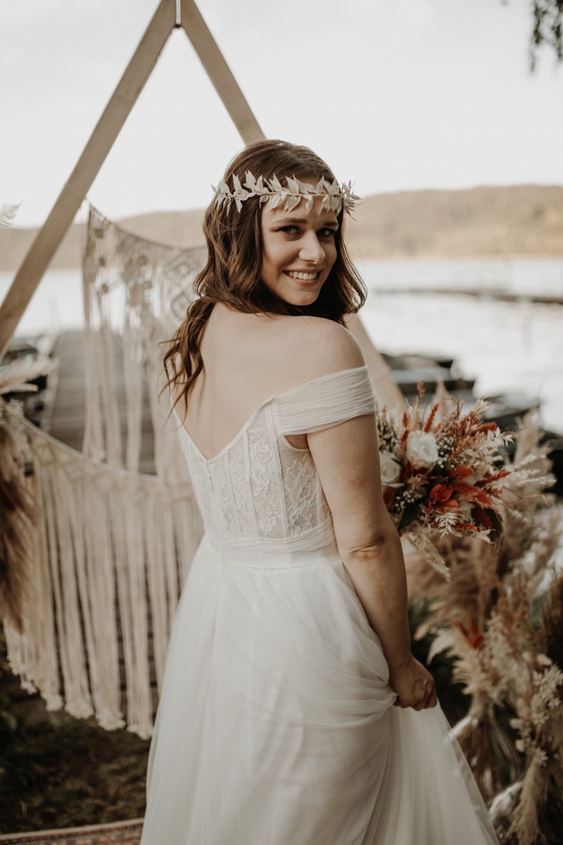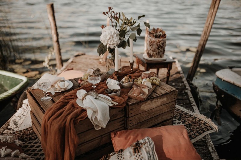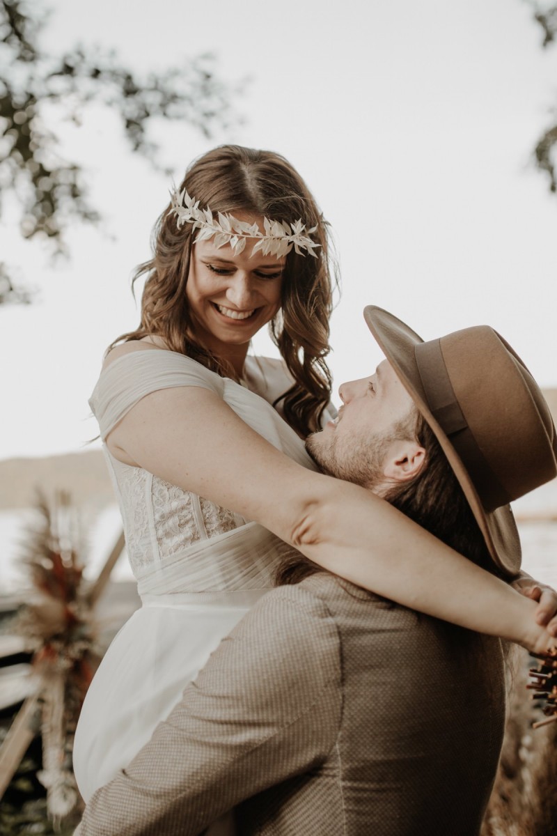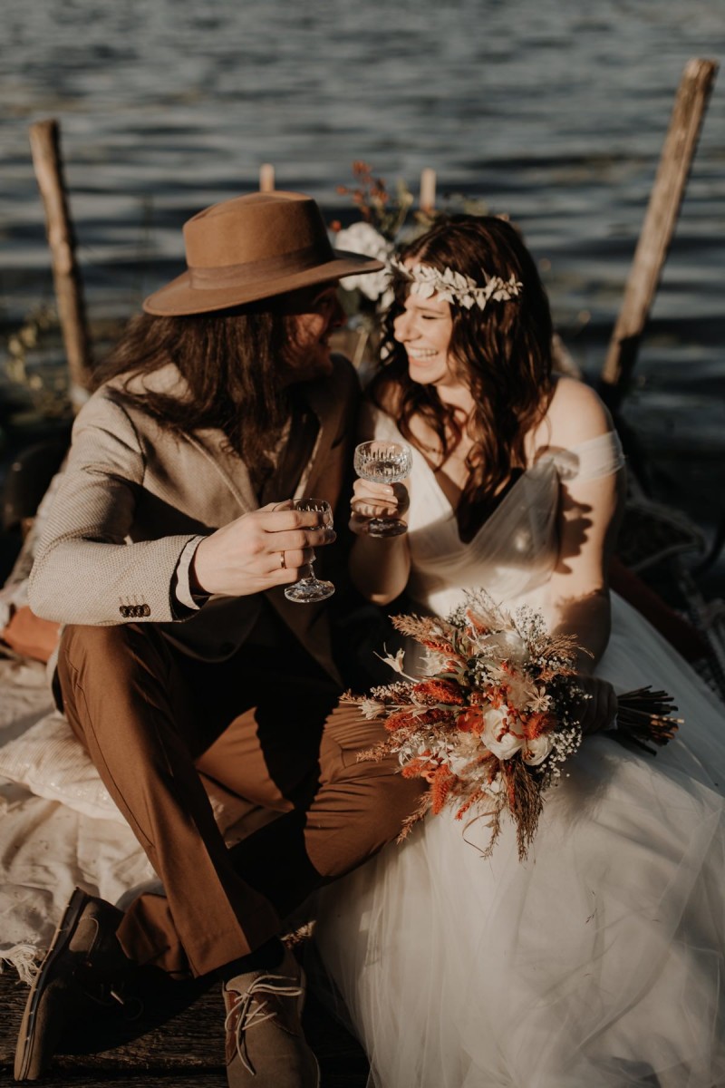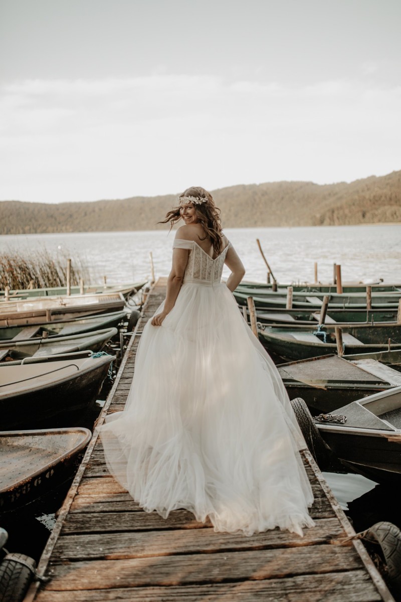 Nur du und ich auf einem verlassenen Bootssteg, die tiefstehende Sonne und die leichten Bewegungen des Seewassers. Klingt das nicht himmlisch? Ich würde sagen HELL YES! Und das ist nur der Beginn dieser wunderschönen Inspiration einer Elopement Wedding im Bohostil am schönen Laacher See! Wundervoll fotografiert von Hochzeitsfotografin Karina Wiebe, erwartete das bezaubernde Brautpaar Alina & Timm ein romantisches Picknick mit allerlei herzhaften Köstlichkeiten, auf dem Bootssteg am Seeufer. Kuschelig, dank Kissen und Decken, und romantisch, dank feinen Kerzenständern und frischen Blumen, inszenierte Hochzeitsplanerin From Sophie with love ein einmaliges Dinnersetting, mit einem Ausblick der Superlative. Hier begann für das Brautpaar ein außergewöhnlicher Tag, den sie so sicher nie vergessen werden. In einem eleganten Off-Shoulder Brautkleid mit opulent fließendem Rock von Audrey Wedding Salon und einem leichten Styling, kreiert von Styling by Sweta, stieß Alina mit ihrem Bräutigam Timm, der in einer braun-beigen Kombination aus Anzughose, lockerem Jacket und Hut glänzte, auf diesen besonderen Tag an. Neben den herzhaften Köstlichkeiten erwartete sie zudem eine Hochzeitstorte von Maggie’s Kuchen, dessen Cremedesign und Zuckerdekor seinesgleichen sucht. Doch ist dieses feine Plätzchen, wie bereits erwähnt, nur der Beginn dieser Wahnsinns Inspiration! Hochzeitsplanerin From Sophie with love hat das schöne Konzept dieser Inspiration kreiert und sich in der Planung so einiges einfallen lassen, das sie hier auch noch dekoriert hat. Denn nach den romantischen Stunden auf dem verlassenen Pier, erwartete das Brautpaar eine freie Trauzeremonie mit der lieben Sarah von Who is Karma – anyway, die diese intime Elopement Wedding perfekt machte. Vor einem großen, blumengeschmückten Traubogen aus Holz, mit Blick auf den See, wurde hier herzlich gelacht aber auch vor Freude geweint. Unterstützung bei der Dekoration dieses Elopements bekam die liebe Sophie von From Sophie with love von der Hochzeitsbouquetterie. Jess und ihr Team zauberten sowohl beim romantischen Dinnersetting, der opulenten Traulocation als auch beim Brautstrauß ganze Träume aus Trockenblumen. Passend zur Dekoration wurden vor allem erdige Töne gewählt, wie Braun, Beige und Creme, die mit warmen Rot- und zarten Weißtönen akzentuiert wurden. Ein Mix aus verschiedenen Strukturen gibt diesem harmonischen Konzept sowohl in der Floristik als auch in der Dekoration den herrlich rustikalen Bohocharm. Schon beim Dinnersetting setze From Sophie with love auf verschiedene Strukturen in den Details. Grobe, gehäkelte sowie glatte Stoffe treffen auf das unbehandelte Holz der Kisten und werden durch das glatte, glänzende Gold komplementiert. Wer noch nach Inspirationen für seine spätsommerliche oder herbstliche Bohohochzeit sucht, der ist hier in jedem Fall goldrichtig!