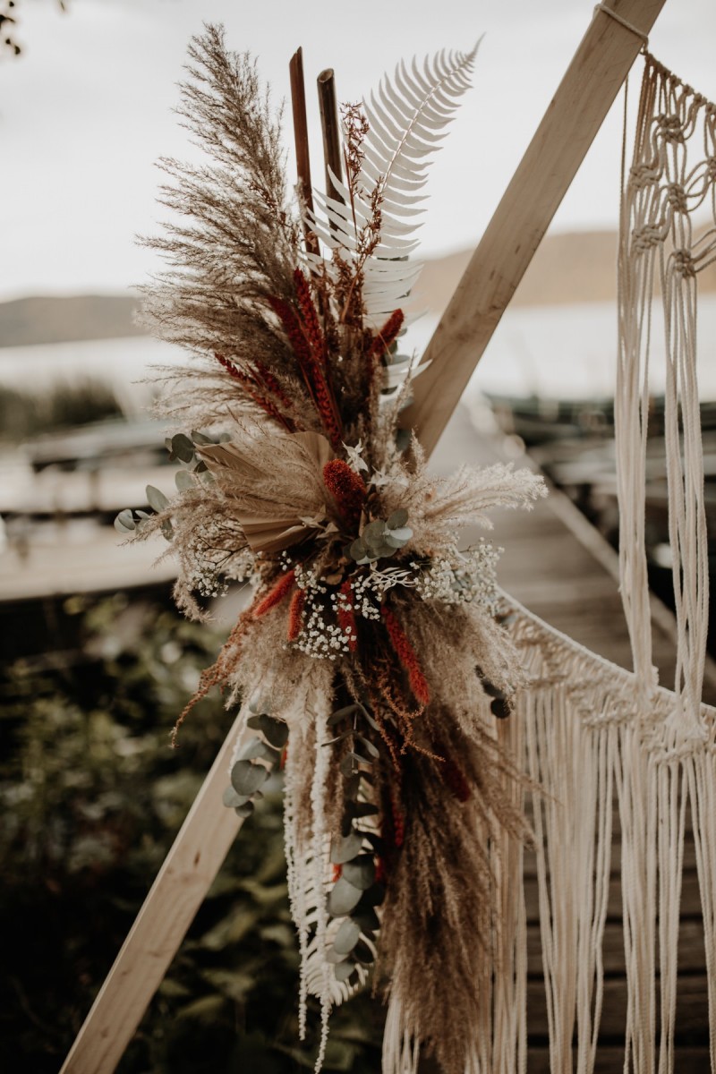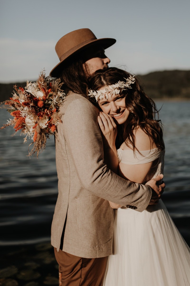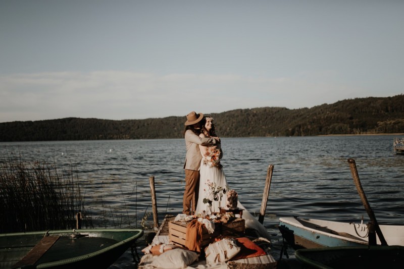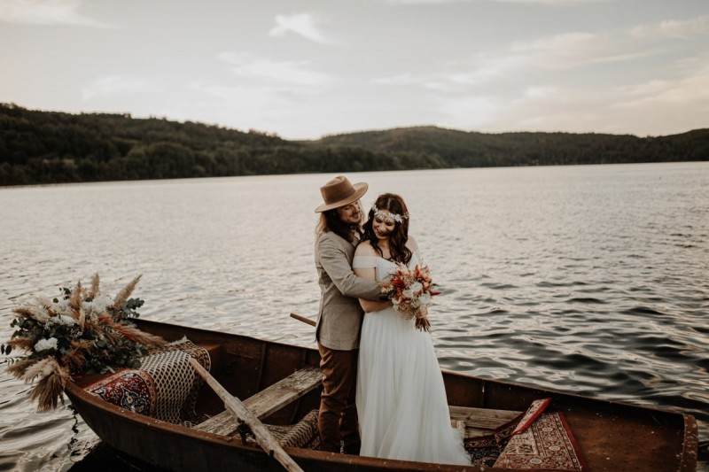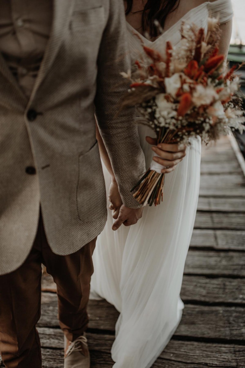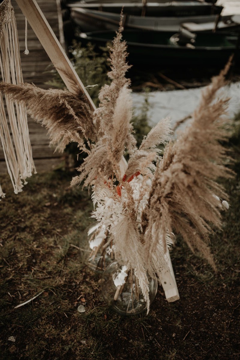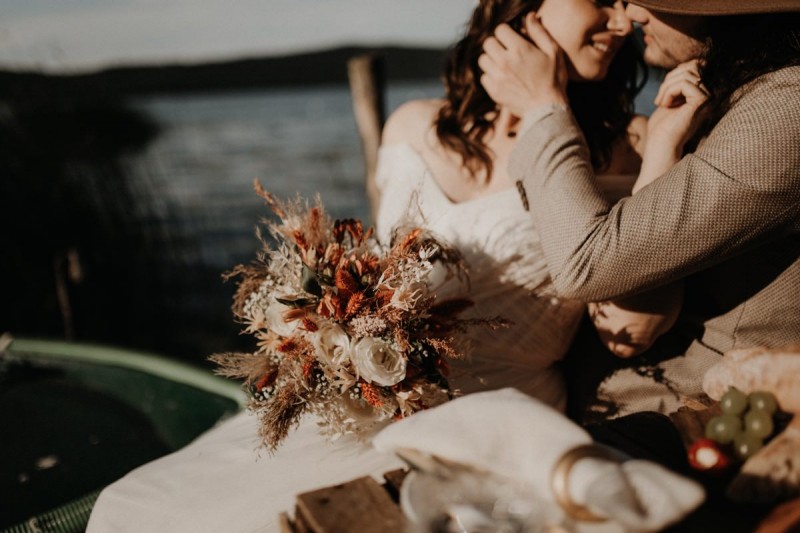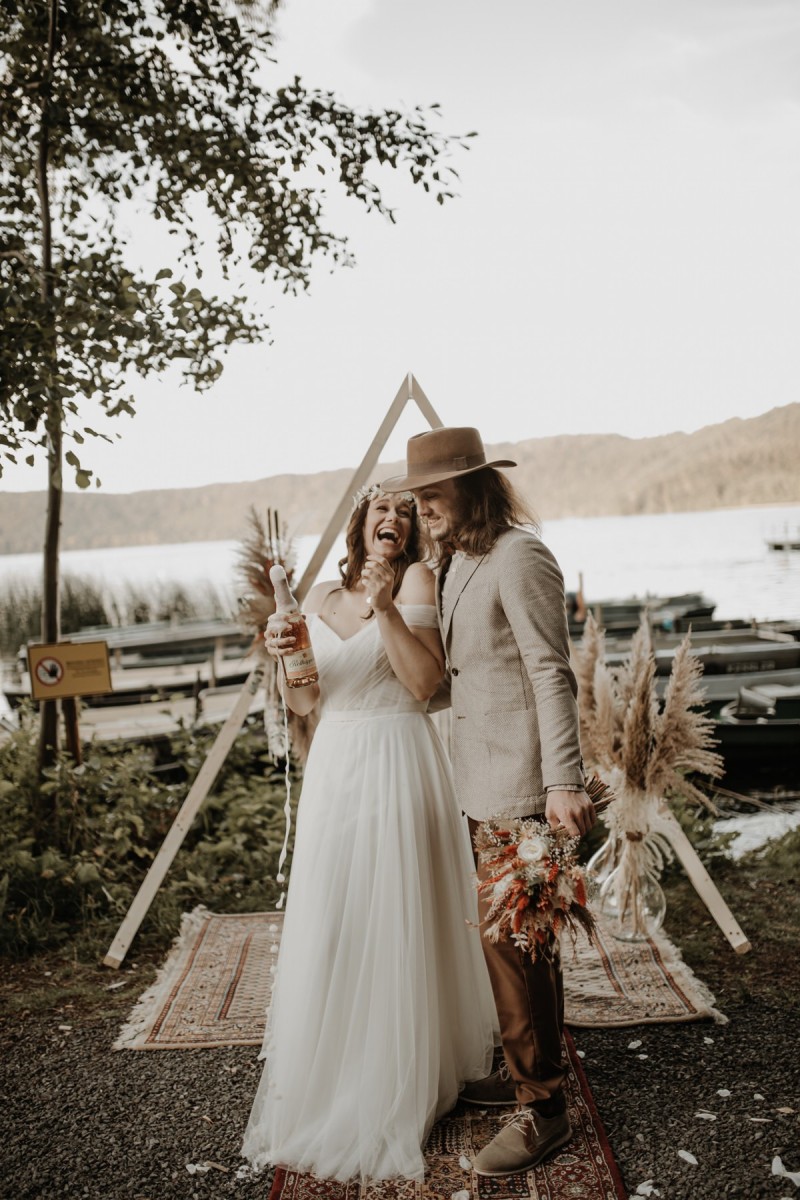 Nur du und ich auf einem verlassenen Bootssteg, die tiefstehende Sonne und die leichten Bewegungen des Seewassers. Klingt das nicht himmlisch? Ich würde sagen HELL YES! Und das ist nur der Beginn dieser wunderschönen Inspiration einer Elopement Wedding im Bohostil am schönen Laacher See! Wundervoll fotografiert von Hochzeitsfotografin Karina Wiebe, erwartete das bezaubernde Brautpaar Alina & Timm ein romantisches Picknick mit allerlei herzhaften Köstlichkeiten, auf dem Bootssteg am Seeufer. Kuschelig, dank Kissen und Decken, und romantisch, dank feinen Kerzenständern und frischen Blumen, inszenierte Hochzeitsplanerin From Sophie with love ein einmaliges Dinnersetting, mit einem Ausblick der Superlative. Hier begann für das Brautpaar ein außergewöhnlicher Tag, den sie so sicher nie vergessen werden. In einem eleganten Off-Shoulder Brautkleid mit opulent fließendem Rock von Audrey Wedding Salon und einem leichten Styling, kreiert von Styling by Sweta, stieß Alina mit ihrem Bräutigam Timm, der in einer braun-beigen Kombination aus Anzughose, lockerem Jacket und Hut glänzte, auf diesen besonderen Tag an. Neben den herzhaften Köstlichkeiten erwartete sie zudem eine Hochzeitstorte von Maggie’s Kuchen, dessen Cremedesign und Zuckerdekor seinesgleichen sucht. Doch ist dieses feine Plätzchen, wie bereits erwähnt, nur der Beginn dieser Wahnsinns Inspiration! Hochzeitsplanerin From Sophie with love hat das schöne Konzept dieser Inspiration kreiert und sich in der Planung so einiges einfallen lassen, das sie hier auch noch dekoriert hat. Denn nach den romantischen Stunden auf dem verlassenen Pier, erwartete das Brautpaar eine freie Trauzeremonie mit der lieben Sarah von Who is Karma – anyway, die diese intime Elopement Wedding perfekt machte. Vor einem großen, blumengeschmückten Traubogen aus Holz, mit Blick auf den See, wurde hier herzlich gelacht aber auch vor Freude geweint. Unterstützung bei der Dekoration dieses Elopements bekam die liebe Sophie von From Sophie with love von der Hochzeitsbouquetterie. Jess und ihr Team zauberten sowohl beim romantischen Dinnersetting, der opulenten Traulocation als auch beim Brautstrauß ganze Träume aus Trockenblumen. Passend zur Dekoration wurden vor allem erdige Töne gewählt, wie Braun, Beige und Creme, die mit warmen Rot- und zarten Weißtönen akzentuiert wurden. Ein Mix aus verschiedenen Strukturen gibt diesem harmonischen Konzept sowohl in der Floristik als auch in der Dekoration den herrlich rustikalen Bohocharm. Schon beim Dinnersetting setze From Sophie with love auf verschiedene Strukturen in den Details. Grobe, gehäkelte sowie glatte Stoffe treffen auf das unbehandelte Holz der Kisten und werden durch das glatte, glänzende Gold komplementiert. Wer noch nach Inspirationen für seine spätsommerliche oder herbstliche Bohohochzeit sucht, der ist hier in jedem Fall goldrichtig!