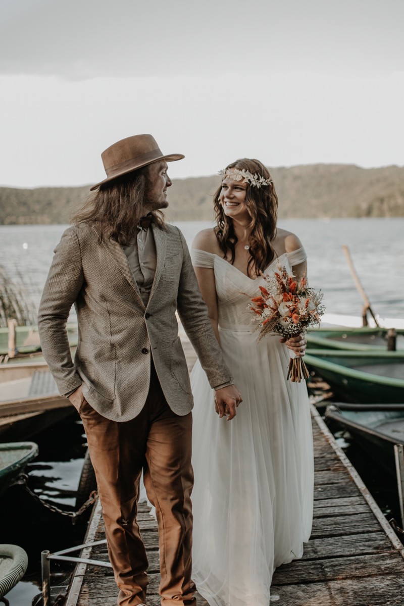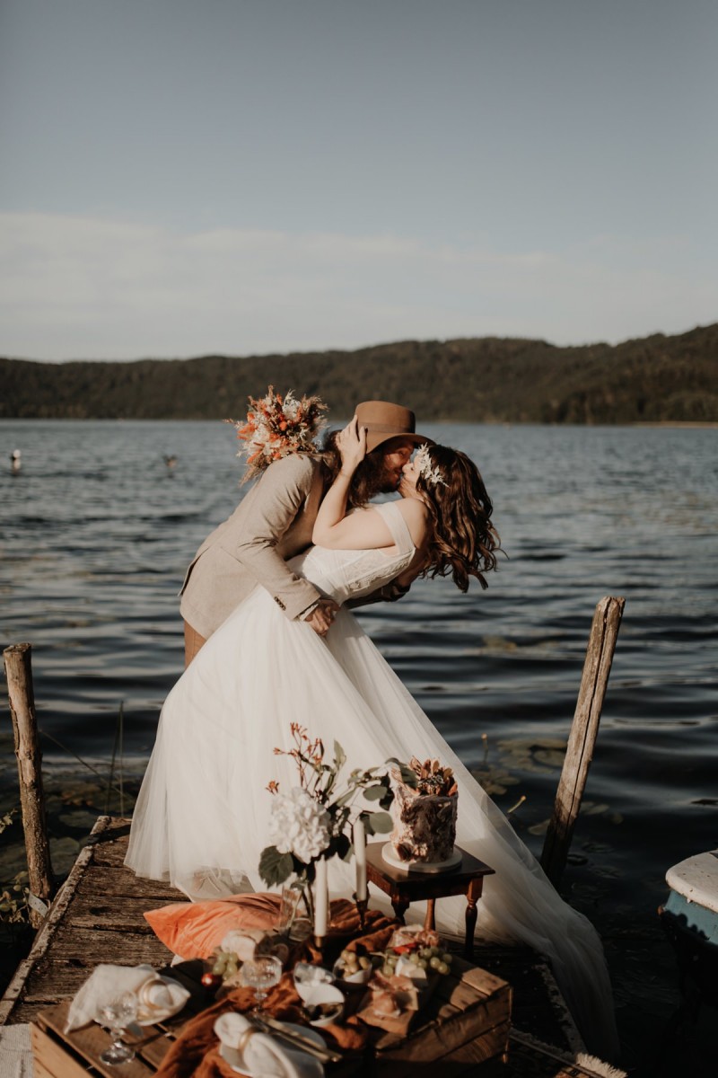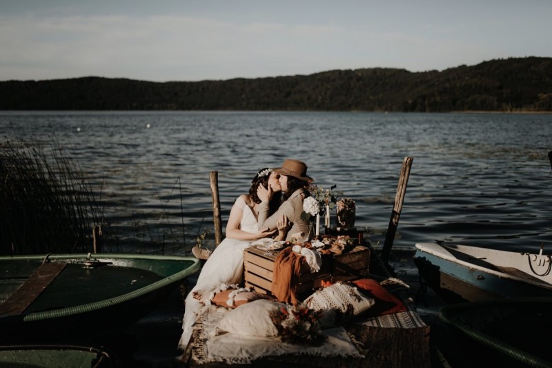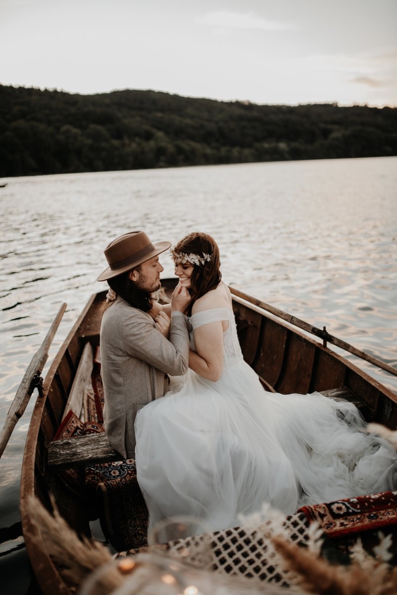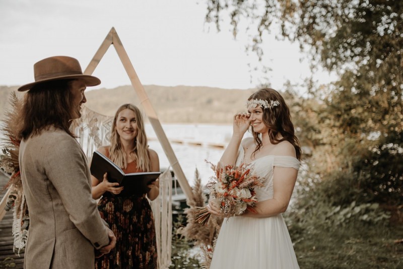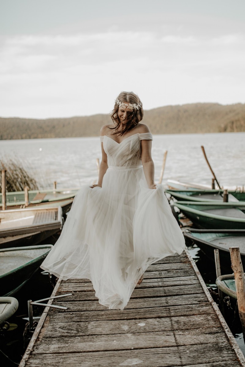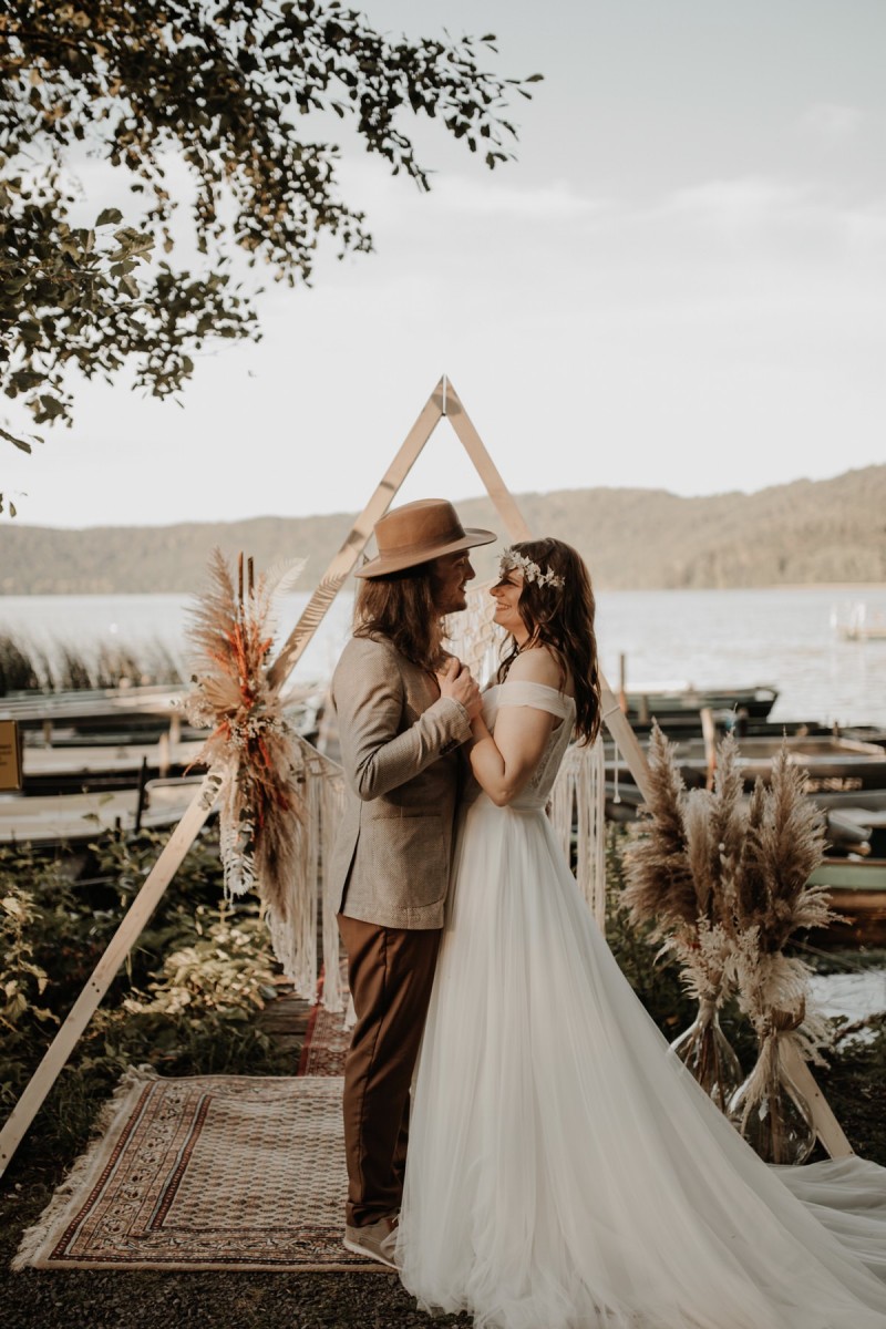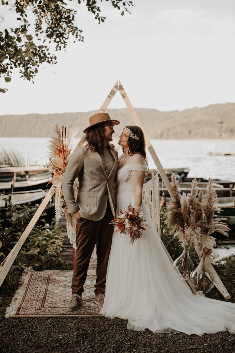 Nur du und ich auf einem verlassenen Bootssteg, die tiefstehende Sonne und die leichten Bewegungen des Seewassers. Klingt das nicht himmlisch? Ich würde sagen HELL YES! Und das ist nur der Beginn dieser wunderschönen Inspiration einer Elopement Wedding im Bohostil am schönen Laacher See! Wundervoll fotografiert von Hochzeitsfotografin Karina Wiebe, erwartete das bezaubernde Brautpaar Alina & Timm ein romantisches Picknick mit allerlei herzhaften Köstlichkeiten, auf dem Bootssteg am Seeufer. Kuschelig, dank Kissen und Decken, und romantisch, dank feinen Kerzenständern und frischen Blumen, inszenierte Hochzeitsplanerin From Sophie with love ein einmaliges Dinnersetting, mit einem Ausblick der Superlative. Hier begann für das Brautpaar ein außergewöhnlicher Tag, den sie so sicher nie vergessen werden. In einem eleganten Off-Shoulder Brautkleid mit opulent fließendem Rock von Audrey Wedding Salon und einem leichten Styling, kreiert von Styling by Sweta, stieß Alina mit ihrem Bräutigam Timm, der in einer braun-beigen Kombination aus Anzughose, lockerem Jacket und Hut glänzte, auf diesen besonderen Tag an. Neben den herzhaften Köstlichkeiten erwartete sie zudem eine Hochzeitstorte von Maggie’s Kuchen, dessen Cremedesign und Zuckerdekor seinesgleichen sucht. Doch ist dieses feine Plätzchen, wie bereits erwähnt, nur der Beginn dieser Wahnsinns Inspiration! Hochzeitsplanerin From Sophie with love hat das schöne Konzept dieser Inspiration kreiert und sich in der Planung so einiges einfallen lassen, das sie hier auch noch dekoriert hat. Denn nach den romantischen Stunden auf dem verlassenen Pier, erwartete das Brautpaar eine freie Trauzeremonie mit der lieben Sarah von Who is Karma – anyway, die diese intime Elopement Wedding perfekt machte. Vor einem großen, blumengeschmückten Traubogen aus Holz, mit Blick auf den See, wurde hier herzlich gelacht aber auch vor Freude geweint. Unterstützung bei der Dekoration dieses Elopements bekam die liebe Sophie von From Sophie with love von der Hochzeitsbouquetterie. Jess und ihr Team zauberten sowohl beim romantischen Dinnersetting, der opulenten Traulocation als auch beim Brautstrauß ganze Träume aus Trockenblumen. Passend zur Dekoration wurden vor allem erdige Töne gewählt, wie Braun, Beige und Creme, die mit warmen Rot- und zarten Weißtönen akzentuiert wurden. Ein Mix aus verschiedenen Strukturen gibt diesem harmonischen Konzept sowohl in der Floristik als auch in der Dekoration den herrlich rustikalen Bohocharm. Schon beim Dinnersetting setze From Sophie with love auf verschiedene Strukturen in den Details. Grobe, gehäkelte sowie glatte Stoffe treffen auf das unbehandelte Holz der Kisten und werden durch das glatte, glänzende Gold komplementiert. Wer noch nach Inspirationen für seine spätsommerliche oder herbstliche Bohohochzeit sucht, der ist hier in jedem Fall goldrichtig!