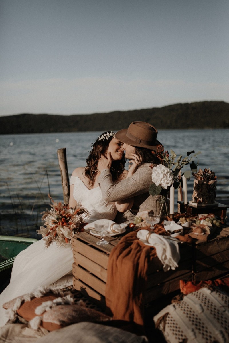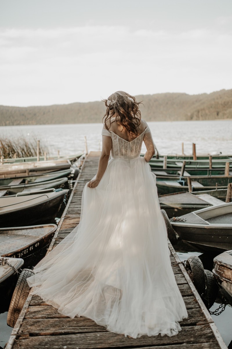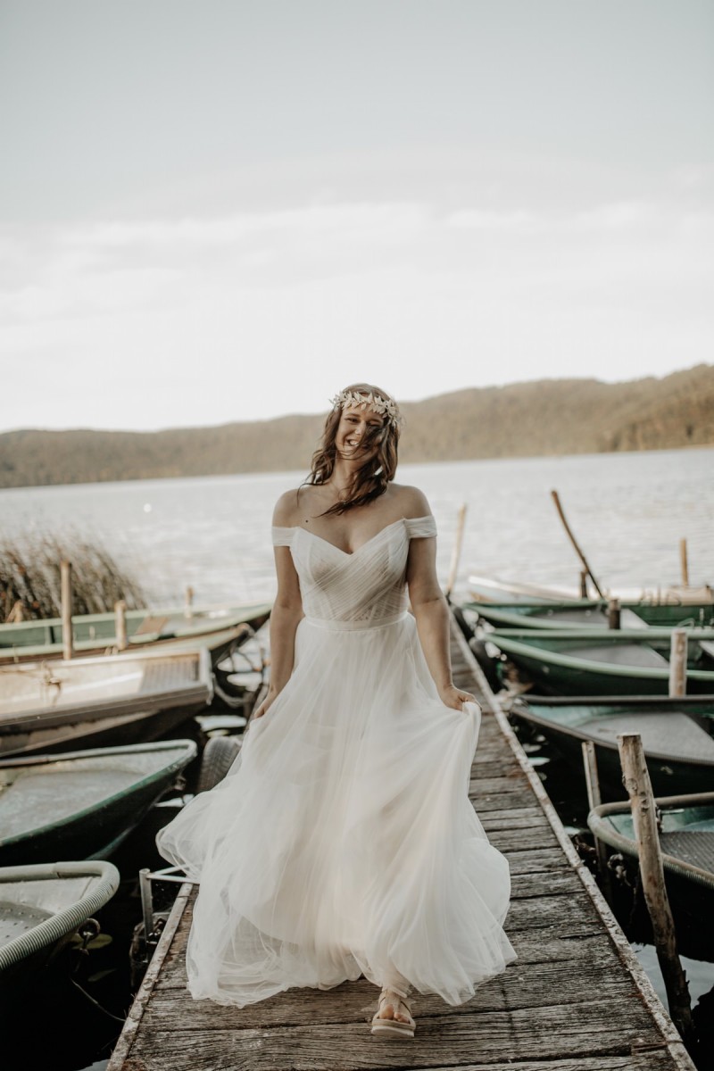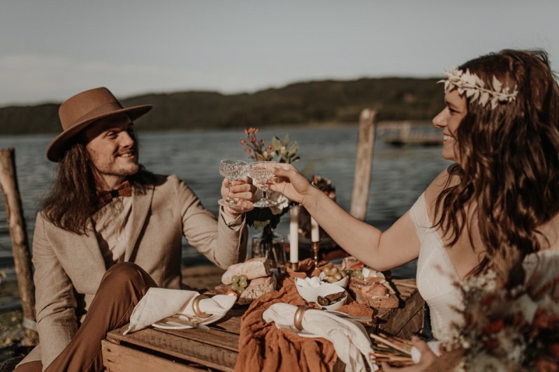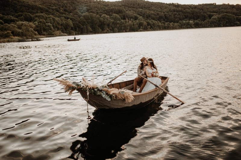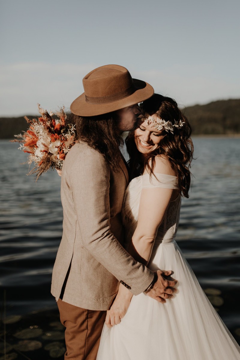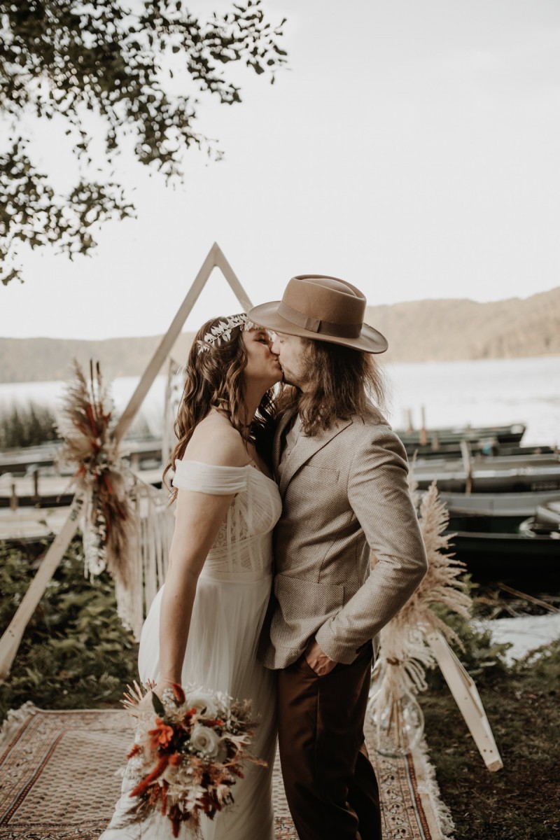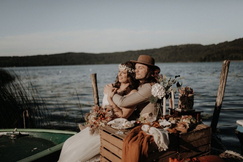 Nur du und ich auf einem verlassenen Bootssteg, die tiefstehende Sonne und die leichten Bewegungen des Seewassers. Klingt das nicht himmlisch? Ich würde sagen HELL YES! Und das ist nur der Beginn dieser wunderschönen Inspiration einer Elopement Wedding im Bohostil am schönen Laacher See! Wundervoll fotografiert von Hochzeitsfotografin Karina Wiebe, erwartete das bezaubernde Brautpaar Alina & Timm ein romantisches Picknick mit allerlei herzhaften Köstlichkeiten, auf dem Bootssteg am Seeufer. Kuschelig, dank Kissen und Decken, und romantisch, dank feinen Kerzenständern und frischen Blumen, inszenierte Hochzeitsplanerin From Sophie with love ein einmaliges Dinnersetting, mit einem Ausblick der Superlative. Hier begann für das Brautpaar ein außergewöhnlicher Tag, den sie so sicher nie vergessen werden. In einem eleganten Off-Shoulder Brautkleid mit opulent fließendem Rock von Audrey Wedding Salon und einem leichten Styling, kreiert von Styling by Sweta, stieß Alina mit ihrem Bräutigam Timm, der in einer braun-beigen Kombination aus Anzughose, lockerem Jacket und Hut glänzte, auf diesen besonderen Tag an. Neben den herzhaften Köstlichkeiten erwartete sie zudem eine Hochzeitstorte von Maggie’s Kuchen, dessen Cremedesign und Zuckerdekor seinesgleichen sucht. Doch ist dieses feine Plätzchen, wie bereits erwähnt, nur der Beginn dieser Wahnsinns Inspiration! Hochzeitsplanerin From Sophie with love hat das schöne Konzept dieser Inspiration kreiert und sich in der Planung so einiges einfallen lassen, das sie hier auch noch dekoriert hat. Denn nach den romantischen Stunden auf dem verlassenen Pier, erwartete das Brautpaar eine freie Trauzeremonie mit der lieben Sarah von Who is Karma – anyway, die diese intime Elopement Wedding perfekt machte. Vor einem großen, blumengeschmückten Traubogen aus Holz, mit Blick auf den See, wurde hier herzlich gelacht aber auch vor Freude geweint. Unterstützung bei der Dekoration dieses Elopements bekam die liebe Sophie von From Sophie with love von der Hochzeitsbouquetterie. Jess und ihr Team zauberten sowohl beim romantischen Dinnersetting, der opulenten Traulocation als auch beim Brautstrauß ganze Träume aus Trockenblumen. Passend zur Dekoration wurden vor allem erdige Töne gewählt, wie Braun, Beige und Creme, die mit warmen Rot- und zarten Weißtönen akzentuiert wurden. Ein Mix aus verschiedenen Strukturen gibt diesem harmonischen Konzept sowohl in der Floristik als auch in der Dekoration den herrlich rustikalen Bohocharm. Schon beim Dinnersetting setze From Sophie with love auf verschiedene Strukturen in den Details. Grobe, gehäkelte sowie glatte Stoffe treffen auf das unbehandelte Holz der Kisten und werden durch das glatte, glänzende Gold komplementiert. Wer noch nach Inspirationen für seine spätsommerliche oder herbstliche Bohohochzeit sucht, der ist hier in jedem Fall goldrichtig!