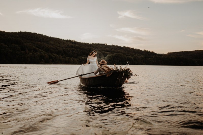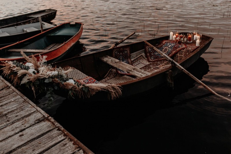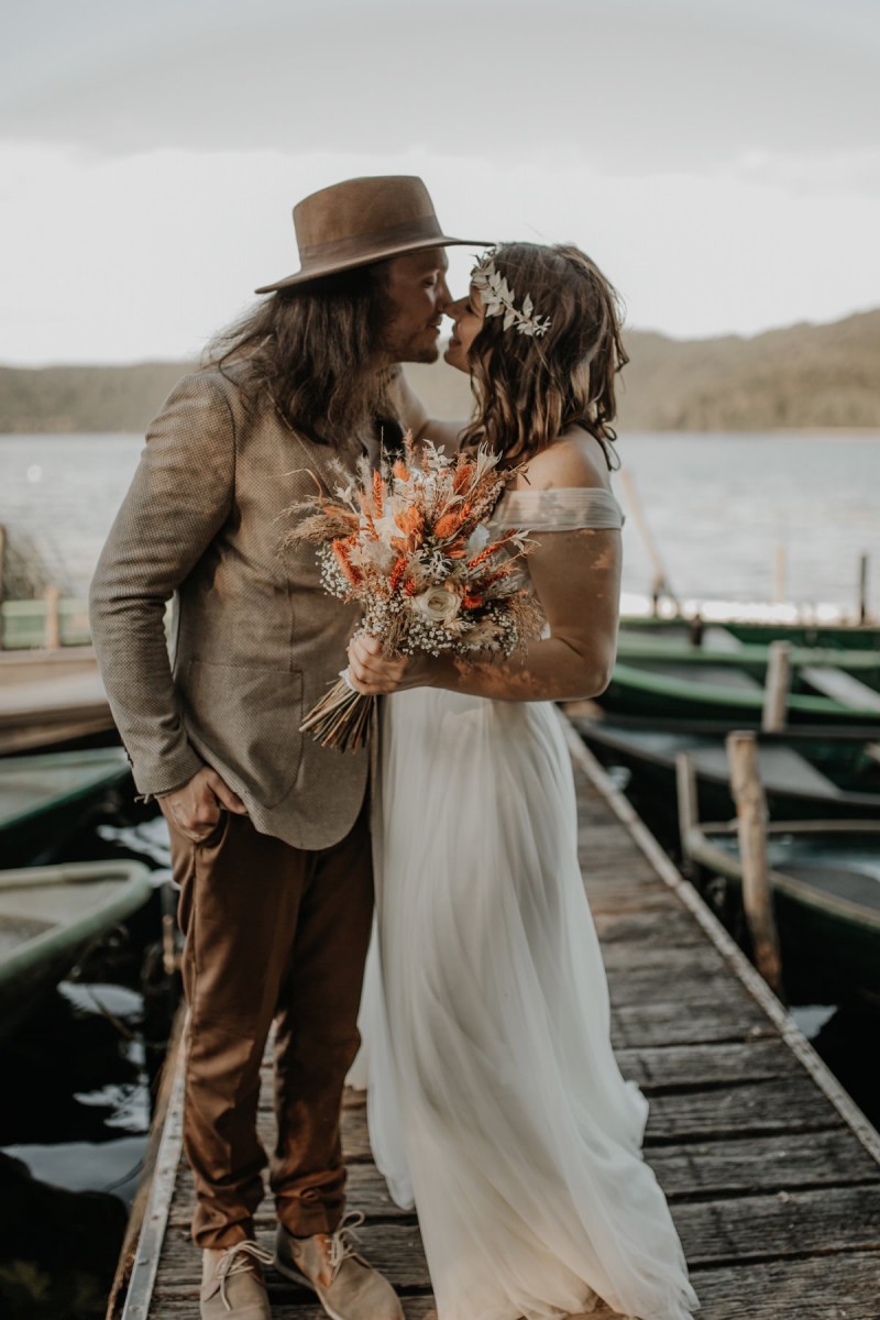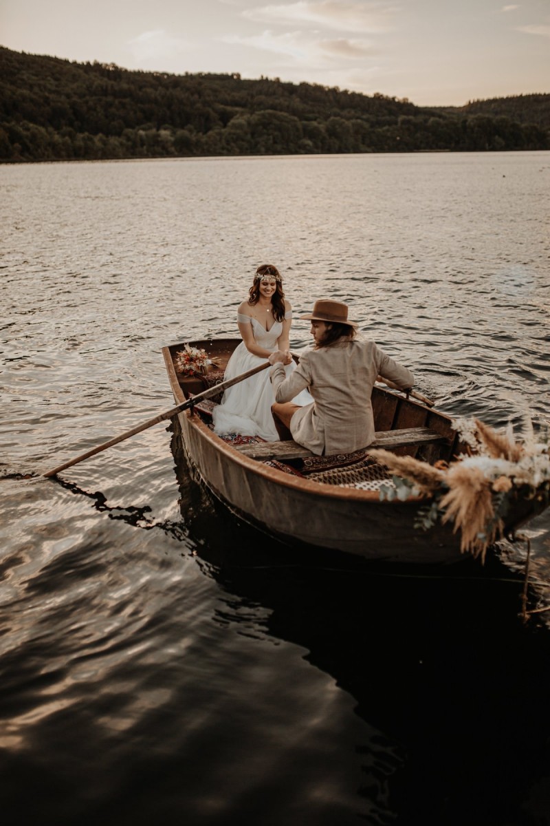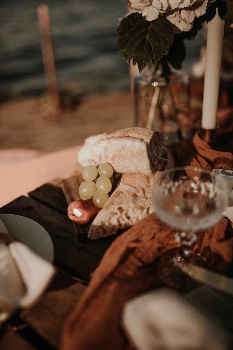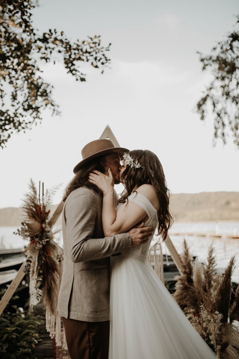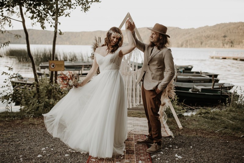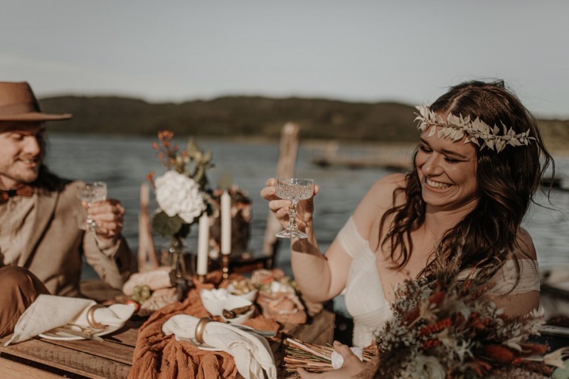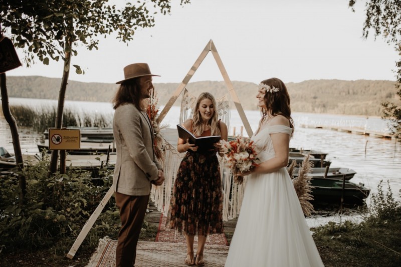 Nur du und ich auf einem verlassenen Bootssteg, die tiefstehende Sonne und die leichten Bewegungen des Seewassers. Klingt das nicht himmlisch? Ich würde sagen HELL YES! Und das ist nur der Beginn dieser wunderschönen Inspiration einer Elopement Wedding im Bohostil am schönen Laacher See! Wundervoll fotografiert von Hochzeitsfotografin Karina Wiebe, erwartete das bezaubernde Brautpaar Alina & Timm ein romantisches Picknick mit allerlei herzhaften Köstlichkeiten, auf dem Bootssteg am Seeufer. Kuschelig, dank Kissen und Decken, und romantisch, dank feinen Kerzenständern und frischen Blumen, inszenierte Hochzeitsplanerin From Sophie with love ein einmaliges Dinnersetting, mit einem Ausblick der Superlative. Hier begann für das Brautpaar ein außergewöhnlicher Tag, den sie so sicher nie vergessen werden. In einem eleganten Off-Shoulder Brautkleid mit opulent fließendem Rock von Audrey Wedding Salon und einem leichten Styling, kreiert von Styling by Sweta, stieß Alina mit ihrem Bräutigam Timm, der in einer braun-beigen Kombination aus Anzughose, lockerem Jacket und Hut glänzte, auf diesen besonderen Tag an. Neben den herzhaften Köstlichkeiten erwartete sie zudem eine Hochzeitstorte von Maggie’s Kuchen, dessen Cremedesign und Zuckerdekor seinesgleichen sucht. Doch ist dieses feine Plätzchen, wie bereits erwähnt, nur der Beginn dieser Wahnsinns Inspiration! Hochzeitsplanerin From Sophie with love hat das schöne Konzept dieser Inspiration kreiert und sich in der Planung so einiges einfallen lassen, das sie hier auch noch dekoriert hat. Denn nach den romantischen Stunden auf dem verlassenen Pier, erwartete das Brautpaar eine freie Trauzeremonie mit der lieben Sarah von Who is Karma – anyway, die diese intime Elopement Wedding perfekt machte. Vor einem großen, blumengeschmückten Traubogen aus Holz, mit Blick auf den See, wurde hier herzlich gelacht aber auch vor Freude geweint. Unterstützung bei der Dekoration dieses Elopements bekam die liebe Sophie von From Sophie with love von der Hochzeitsbouquetterie. Jess und ihr Team zauberten sowohl beim romantischen Dinnersetting, der opulenten Traulocation als auch beim Brautstrauß ganze Träume aus Trockenblumen. Passend zur Dekoration wurden vor allem erdige Töne gewählt, wie Braun, Beige und Creme, die mit warmen Rot- und zarten Weißtönen akzentuiert wurden. Ein Mix aus verschiedenen Strukturen gibt diesem harmonischen Konzept sowohl in der Floristik als auch in der Dekoration den herrlich rustikalen Bohocharm. Schon beim Dinnersetting setze From Sophie with love auf verschiedene Strukturen in den Details. Grobe, gehäkelte sowie glatte Stoffe treffen auf das unbehandelte Holz der Kisten und werden durch das glatte, glänzende Gold komplementiert. Wer noch nach Inspirationen für seine spätsommerliche oder herbstliche Bohohochzeit sucht, der ist hier in jedem Fall goldrichtig!