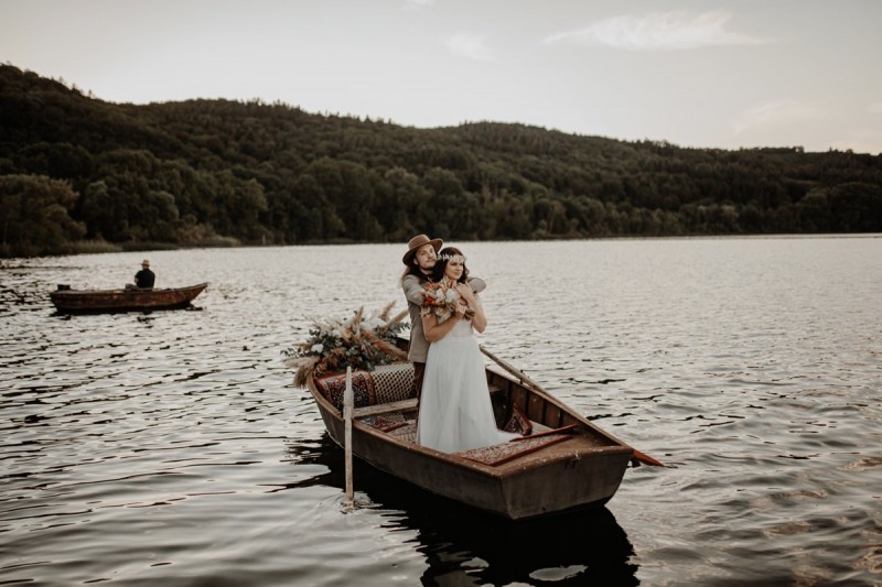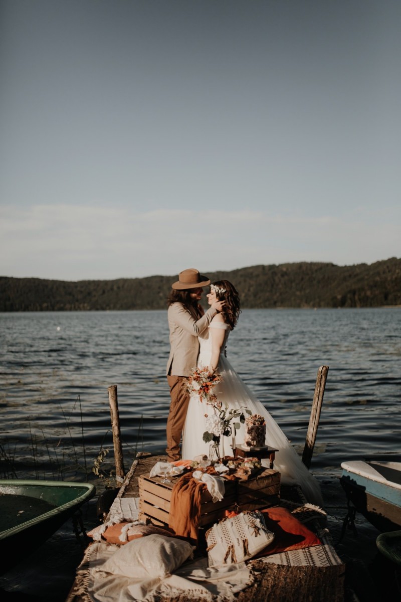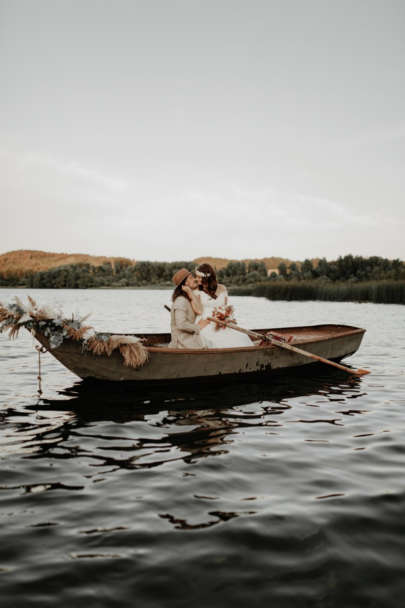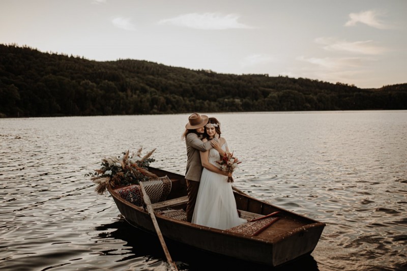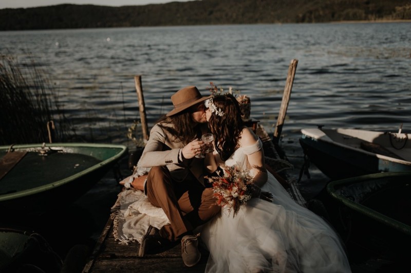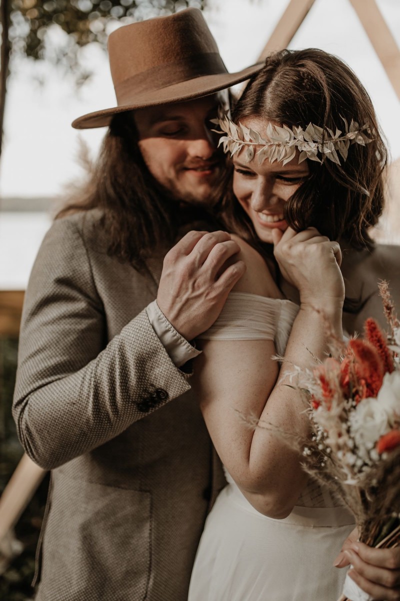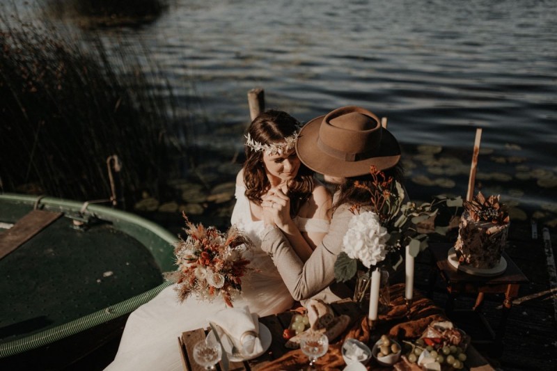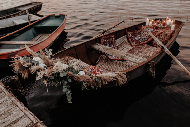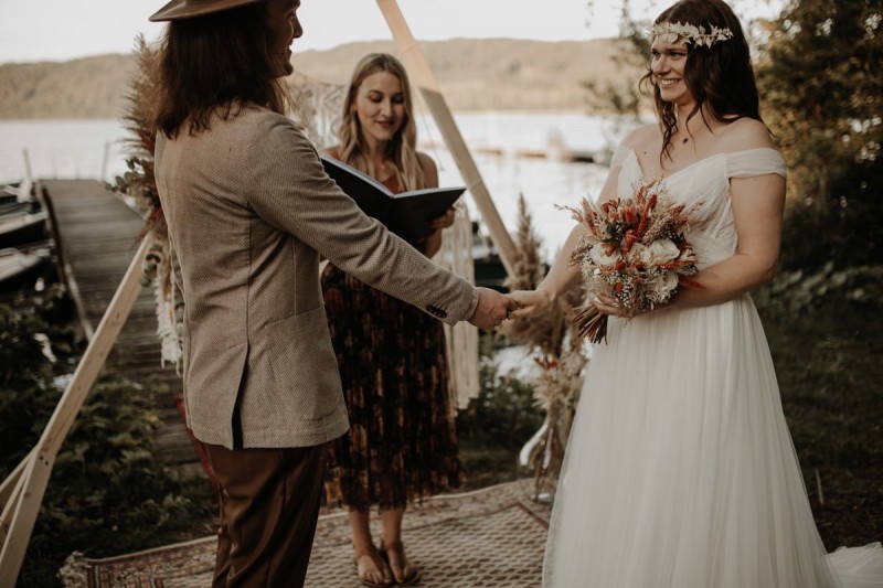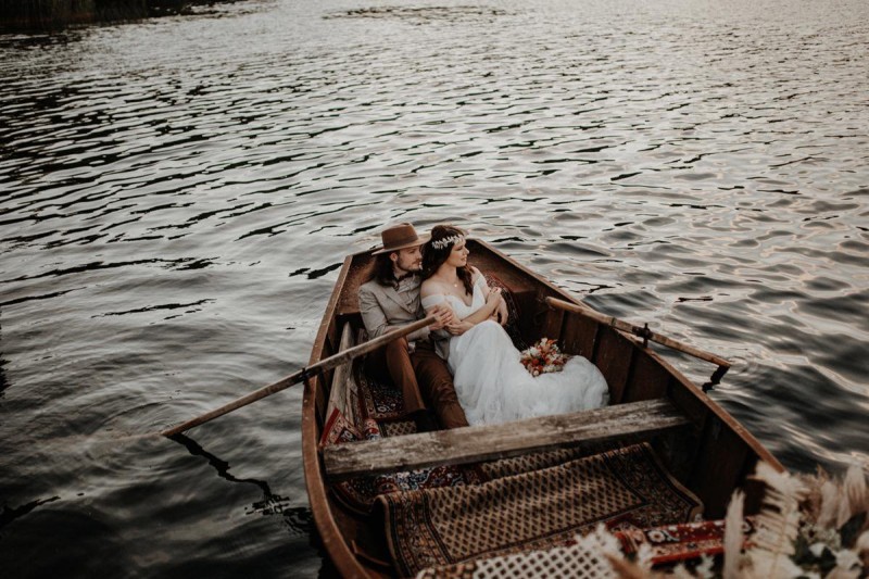Nur du und ich auf einem verlassenen Bootssteg, die tiefstehende Sonne und die leichten Bewegungen des Seewassers. Klingt das nicht himmlisch? Ich würde sagen HELL YES! Und das ist nur der Beginn dieser wunderschönen Inspiration einer Elopement Wedding im Bohostil am schönen Laacher See! Wundervoll fotografiert von Hochzeitsfotografin Karina Wiebe, erwartete das bezaubernde Brautpaar Alina & Timm ein romantisches Picknick mit allerlei herzhaften Köstlichkeiten, auf dem Bootssteg am Seeufer. Kuschelig, dank Kissen und Decken, und romantisch, dank feinen Kerzenständern und frischen Blumen, inszenierte Hochzeitsplanerin From Sophie with love ein einmaliges Dinnersetting, mit einem Ausblick der Superlative. Hier begann für das Brautpaar ein außergewöhnlicher Tag, den sie so sicher nie vergessen werden. In einem eleganten Off-Shoulder Brautkleid mit opulent fließendem Rock von Audrey Wedding Salon und einem leichten Styling, kreiert von Styling by Sweta, stieß Alina mit ihrem Bräutigam Timm, der in einer braun-beigen Kombination aus Anzughose, lockerem Jacket und Hut glänzte, auf diesen besonderen Tag an. Neben den herzhaften Köstlichkeiten erwartete sie zudem eine Hochzeitstorte von Maggie’s Kuchen, dessen Cremedesign und Zuckerdekor seinesgleichen sucht. Doch ist dieses feine Plätzchen, wie bereits erwähnt, nur der Beginn dieser Wahnsinns Inspiration! Hochzeitsplanerin From Sophie with love hat das schöne Konzept dieser Inspiration kreiert und sich in der Planung so einiges einfallen lassen, das sie hier auch noch dekoriert hat. Denn nach den romantischen Stunden auf dem verlassenen Pier, erwartete das Brautpaar eine freie Trauzeremonie mit der lieben Sarah von Who is Karma – anyway, die diese intime Elopement Wedding perfekt machte. Vor einem großen, blumengeschmückten Traubogen aus Holz, mit Blick auf den See, wurde hier herzlich gelacht aber auch vor Freude geweint. Unterstützung bei der Dekoration dieses Elopements bekam die liebe Sophie von From Sophie with love von der Hochzeitsbouquetterie. Jess und ihr Team zauberten sowohl beim romantischen Dinnersetting, der opulenten Traulocation als auch beim Brautstrauß ganze Träume aus Trockenblumen. Passend zur Dekoration wurden vor allem erdige Töne gewählt, wie Braun, Beige und Creme, die mit warmen Rot- und zarten Weißtönen akzentuiert wurden. Ein Mix aus verschiedenen Strukturen gibt diesem harmonischen Konzept sowohl in der Floristik als auch in der Dekoration den herrlich rustikalen Bohocharm. Schon beim Dinnersetting setze From Sophie with love auf verschiedene Strukturen in den Details. Grobe, gehäkelte sowie glatte Stoffe treffen auf das unbehandelte Holz der Kisten und werden durch das glatte, glänzende Gold komplementiert. Wer noch nach Inspirationen für seine spätsommerliche oder herbstliche Bohohochzeit sucht, der ist hier in jedem Fall goldrichtig!