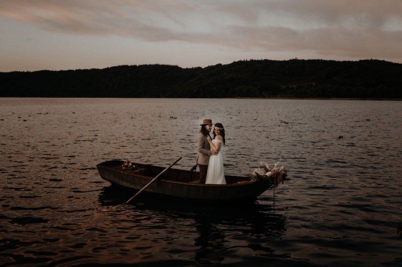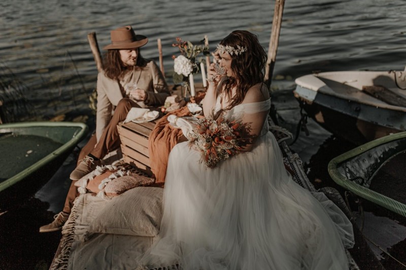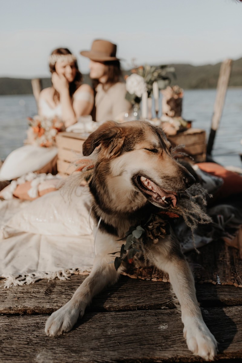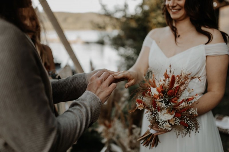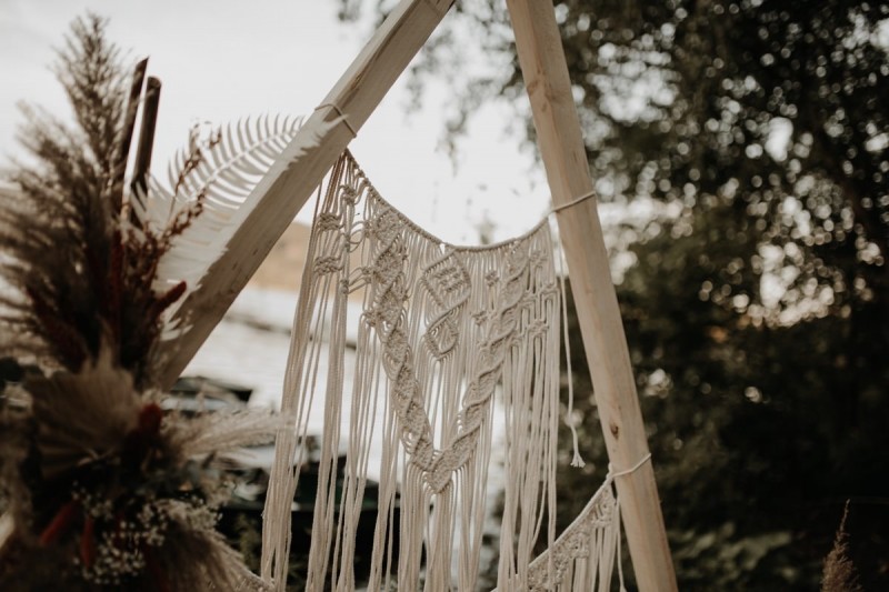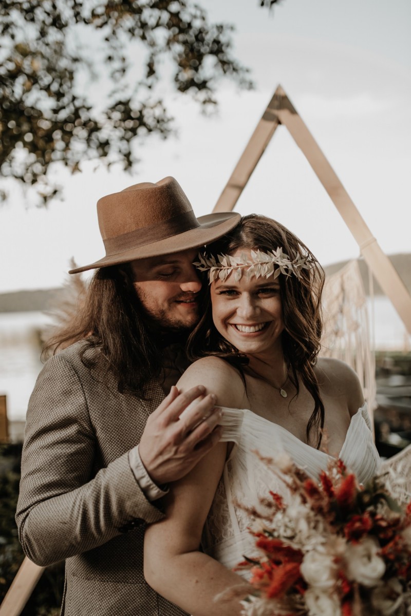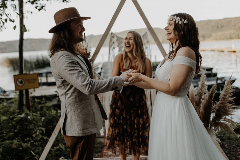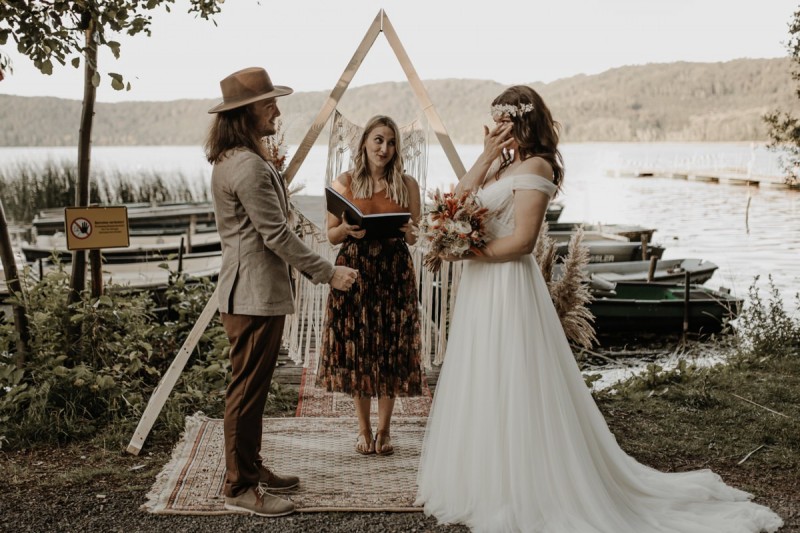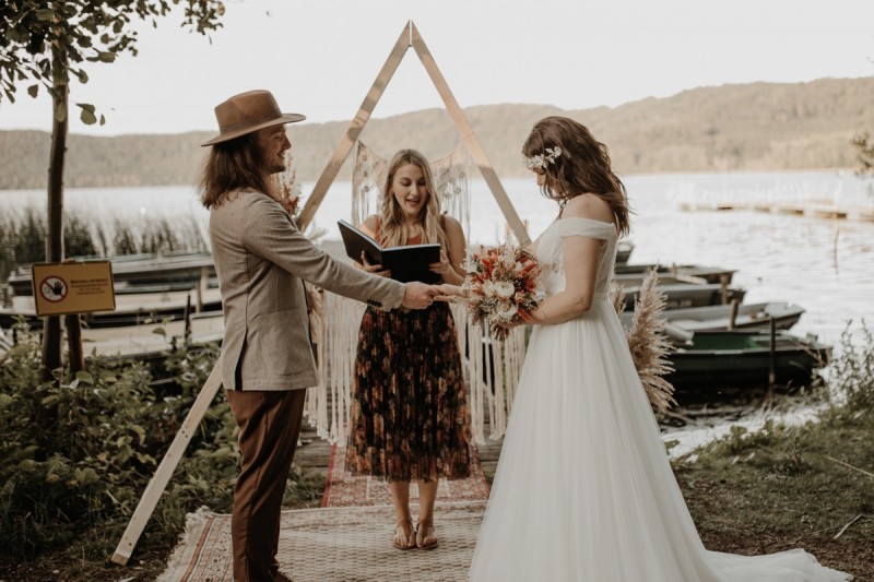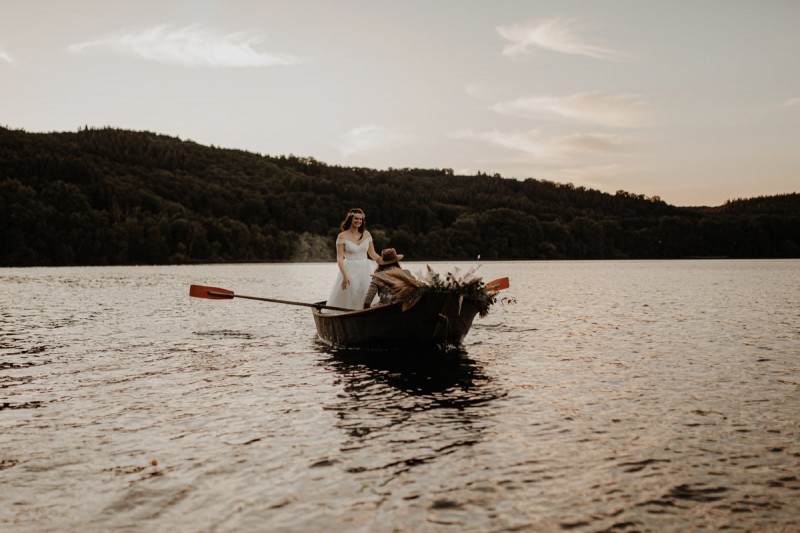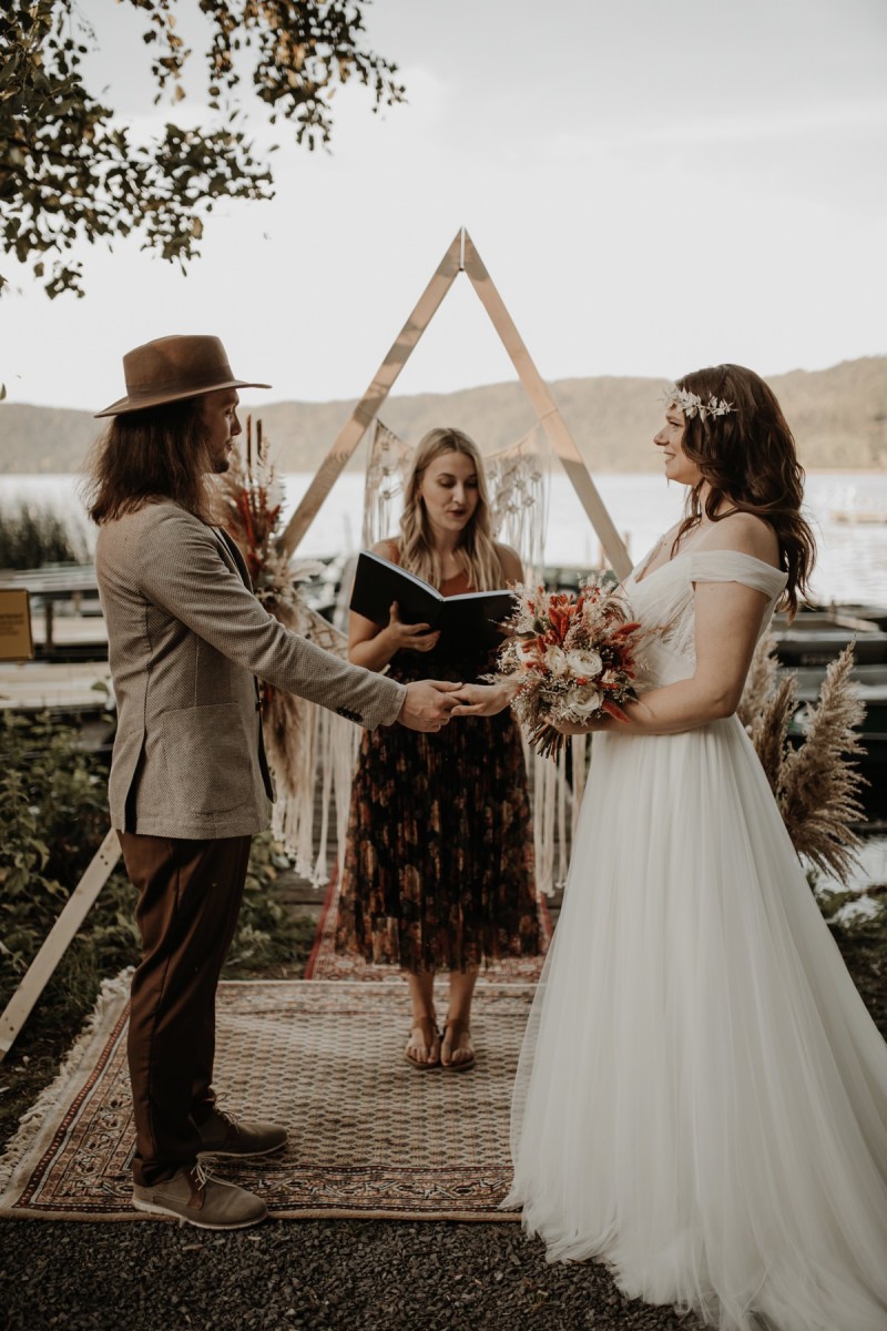 Nur du und ich auf einem verlassenen Bootssteg, die tiefstehende Sonne und die leichten Bewegungen des Seewassers. Klingt das nicht himmlisch? Ich würde sagen HELL YES! Und das ist nur der Beginn dieser wunderschönen Inspiration einer Elopement Wedding im Bohostil am schönen Laacher See! Wundervoll fotografiert von Hochzeitsfotografin Karina Wiebe, erwartete das bezaubernde Brautpaar Alina & Timm ein romantisches Picknick mit allerlei herzhaften Köstlichkeiten, auf dem Bootssteg am Seeufer. Kuschelig, dank Kissen und Decken, und romantisch, dank feinen Kerzenständern und frischen Blumen, inszenierte Hochzeitsplanerin From Sophie with love ein einmaliges Dinnersetting, mit einem Ausblick der Superlative. Hier begann für das Brautpaar ein außergewöhnlicher Tag, den sie so sicher nie vergessen werden. In einem eleganten Off-Shoulder Brautkleid mit opulent fließendem Rock von Audrey Wedding Salon und einem leichten Styling, kreiert von Styling by Sweta, stieß Alina mit ihrem Bräutigam Timm, der in einer braun-beigen Kombination aus Anzughose, lockerem Jacket und Hut glänzte, auf diesen besonderen Tag an. Neben den herzhaften Köstlichkeiten erwartete sie zudem eine Hochzeitstorte von Maggie’s Kuchen, dessen Cremedesign und Zuckerdekor seinesgleichen sucht. Doch ist dieses feine Plätzchen, wie bereits erwähnt, nur der Beginn dieser Wahnsinns Inspiration! Hochzeitsplanerin From Sophie with love hat das schöne Konzept dieser Inspiration kreiert und sich in der Planung so einiges einfallen lassen, das sie hier auch noch dekoriert hat. Denn nach den romantischen Stunden auf dem verlassenen Pier, erwartete das Brautpaar eine freie Trauzeremonie mit der lieben Sarah von Who is Karma – anyway, die diese intime Elopement Wedding perfekt machte. Vor einem großen, blumengeschmückten Traubogen aus Holz, mit Blick auf den See, wurde hier herzlich gelacht aber auch vor Freude geweint. Unterstützung bei der Dekoration dieses Elopements bekam die liebe Sophie von From Sophie with love von der Hochzeitsbouquetterie. Jess und ihr Team zauberten sowohl beim romantischen Dinnersetting, der opulenten Traulocation als auch beim Brautstrauß ganze Träume aus Trockenblumen. Passend zur Dekoration wurden vor allem erdige Töne gewählt, wie Braun, Beige und Creme, die mit warmen Rot- und zarten Weißtönen akzentuiert wurden. Ein Mix aus verschiedenen Strukturen gibt diesem harmonischen Konzept sowohl in der Floristik als auch in der Dekoration den herrlich rustikalen Bohocharm. Schon beim Dinnersetting setze From Sophie with love auf verschiedene Strukturen in den Details. Grobe, gehäkelte sowie glatte Stoffe treffen auf das unbehandelte Holz der Kisten und werden durch das glatte, glänzende Gold komplementiert. Wer noch nach Inspirationen für seine spätsommerliche oder herbstliche Bohohochzeit sucht, der ist hier in jedem Fall goldrichtig!