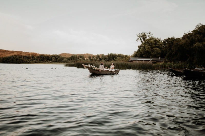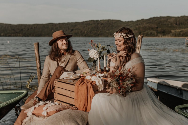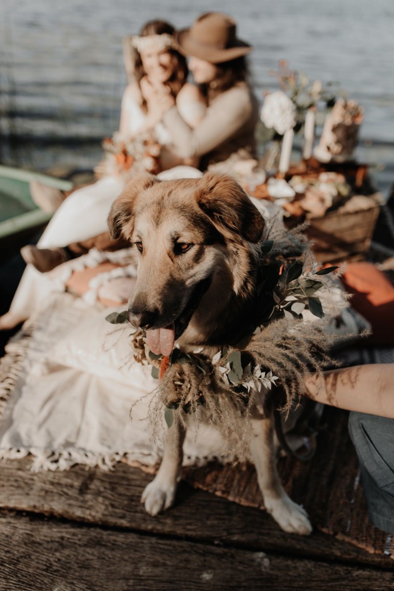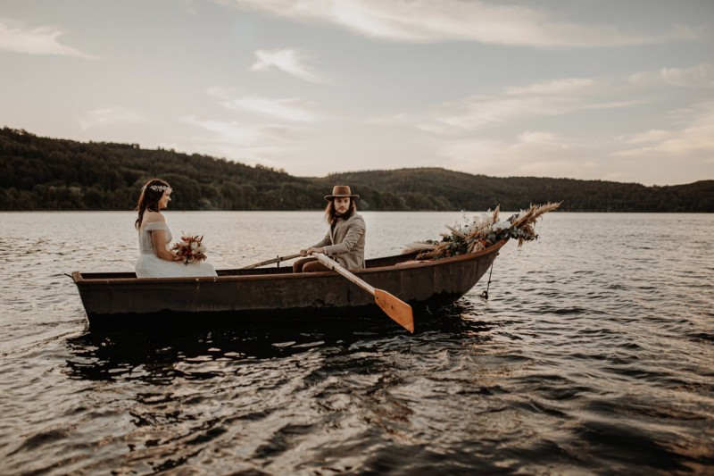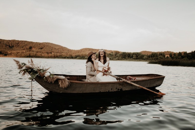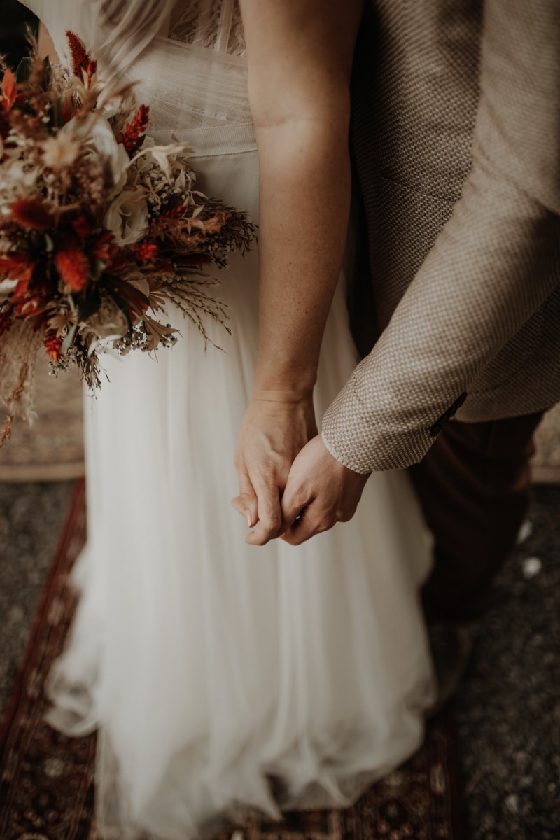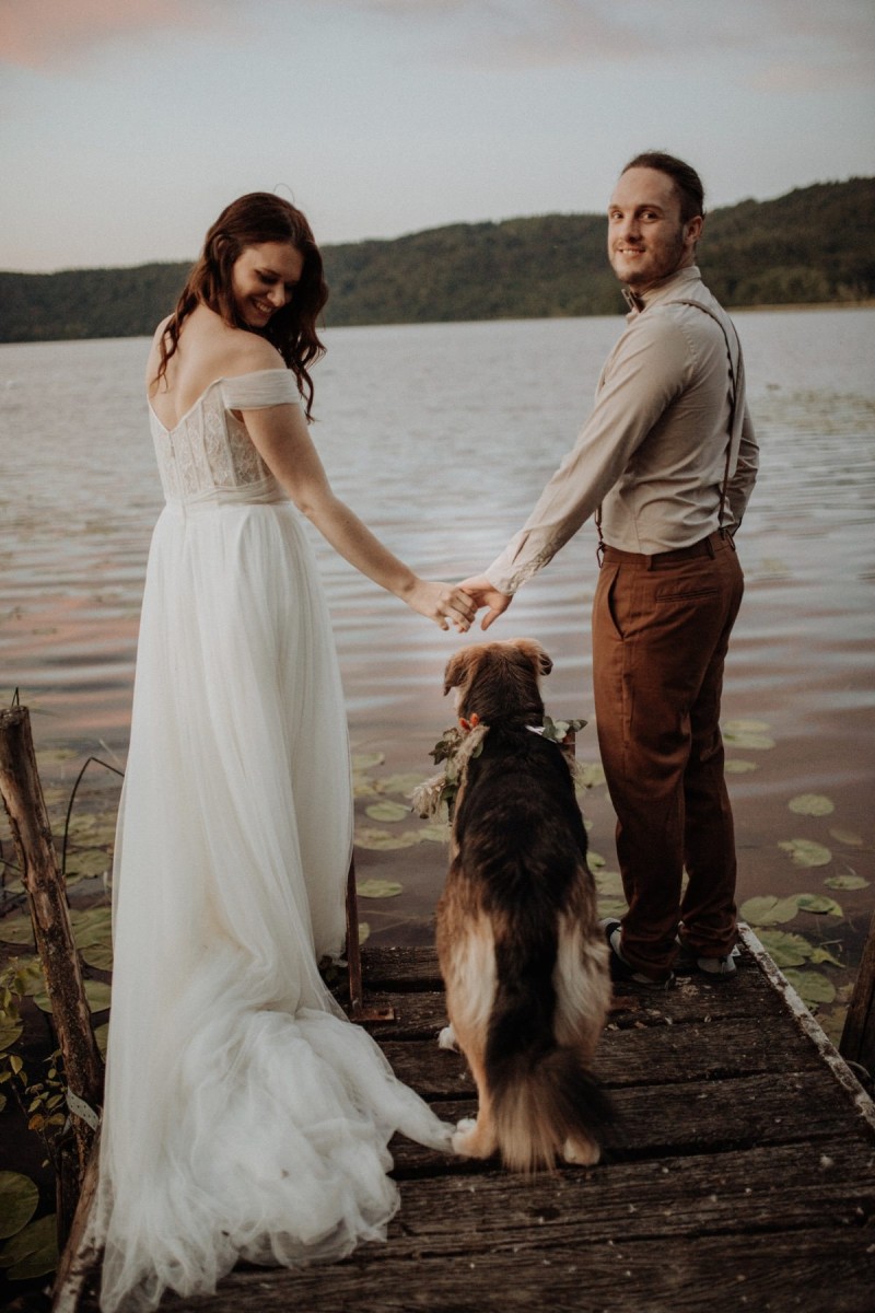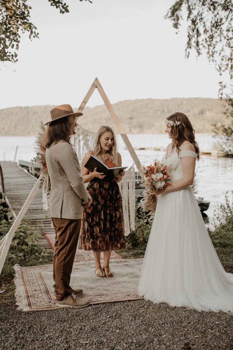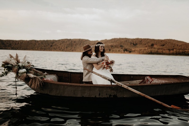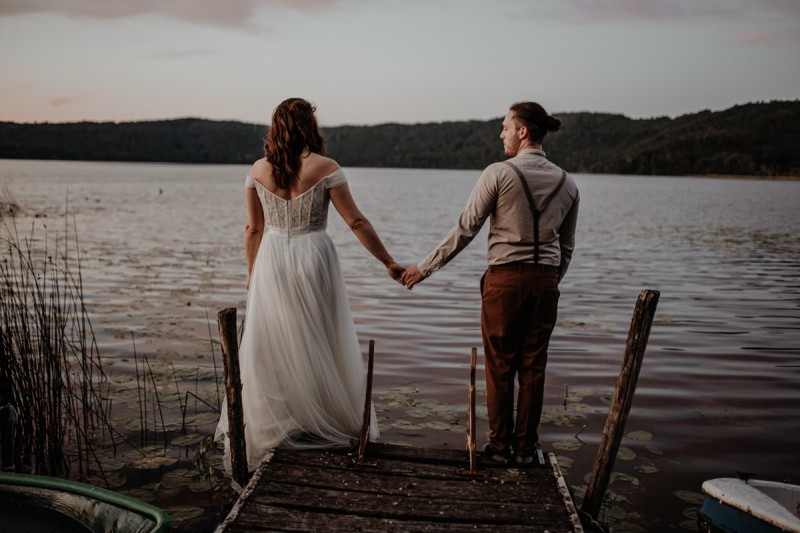 Nur du und ich auf einem verlassenen Bootssteg, die tiefstehende Sonne und die leichten Bewegungen des Seewassers. Klingt das nicht himmlisch? Ich würde sagen HELL YES! Und das ist nur der Beginn dieser wunderschönen Inspiration einer Elopement Wedding im Bohostil am schönen Laacher See! Wundervoll fotografiert von Hochzeitsfotografin Karina Wiebe, erwartete das bezaubernde Brautpaar Alina & Timm ein romantisches Picknick mit allerlei herzhaften Köstlichkeiten, auf dem Bootssteg am Seeufer. Kuschelig, dank Kissen und Decken, und romantisch, dank feinen Kerzenständern und frischen Blumen, inszenierte Hochzeitsplanerin From Sophie with love ein einmaliges Dinnersetting, mit einem Ausblick der Superlative. Hier begann für das Brautpaar ein außergewöhnlicher Tag, den sie so sicher nie vergessen werden. In einem eleganten Off-Shoulder Brautkleid mit opulent fließendem Rock von Audrey Wedding Salon und einem leichten Styling, kreiert von Styling by Sweta, stieß Alina mit ihrem Bräutigam Timm, der in einer braun-beigen Kombination aus Anzughose, lockerem Jacket und Hut glänzte, auf diesen besonderen Tag an. Neben den herzhaften Köstlichkeiten erwartete sie zudem eine Hochzeitstorte von Maggie’s Kuchen, dessen Cremedesign und Zuckerdekor seinesgleichen sucht. Doch ist dieses feine Plätzchen, wie bereits erwähnt, nur der Beginn dieser Wahnsinns Inspiration! Hochzeitsplanerin From Sophie with love hat das schöne Konzept dieser Inspiration kreiert und sich in der Planung so einiges einfallen lassen, das sie hier auch noch dekoriert hat. Denn nach den romantischen Stunden auf dem verlassenen Pier, erwartete das Brautpaar eine freie Trauzeremonie mit der lieben Sarah von Who is Karma – anyway, die diese intime Elopement Wedding perfekt machte. Vor einem großen, blumengeschmückten Traubogen aus Holz, mit Blick auf den See, wurde hier herzlich gelacht aber auch vor Freude geweint. Unterstützung bei der Dekoration dieses Elopements bekam die liebe Sophie von From Sophie with love von der Hochzeitsbouquetterie. Jess und ihr Team zauberten sowohl beim romantischen Dinnersetting, der opulenten Traulocation als auch beim Brautstrauß ganze Träume aus Trockenblumen. Passend zur Dekoration wurden vor allem erdige Töne gewählt, wie Braun, Beige und Creme, die mit warmen Rot- und zarten Weißtönen akzentuiert wurden. Ein Mix aus verschiedenen Strukturen gibt diesem harmonischen Konzept sowohl in der Floristik als auch in der Dekoration den herrlich rustikalen Bohocharm. Schon beim Dinnersetting setze From Sophie with love auf verschiedene Strukturen in den Details. Grobe, gehäkelte sowie glatte Stoffe treffen auf das unbehandelte Holz der Kisten und werden durch das glatte, glänzende Gold komplementiert. Wer noch nach Inspirationen für seine spätsommerliche oder herbstliche Bohohochzeit sucht, der ist hier in jedem Fall goldrichtig!