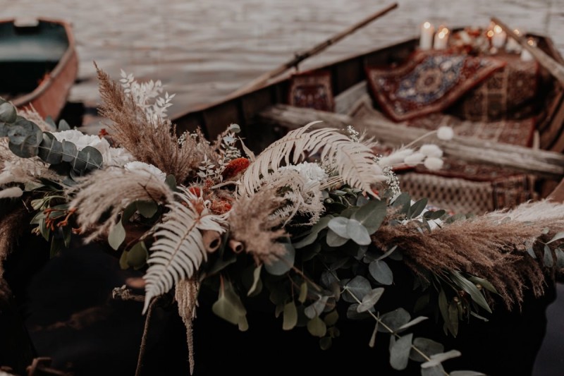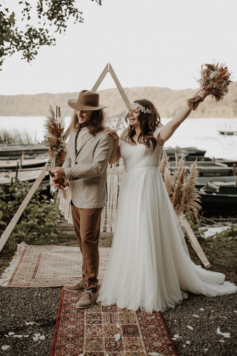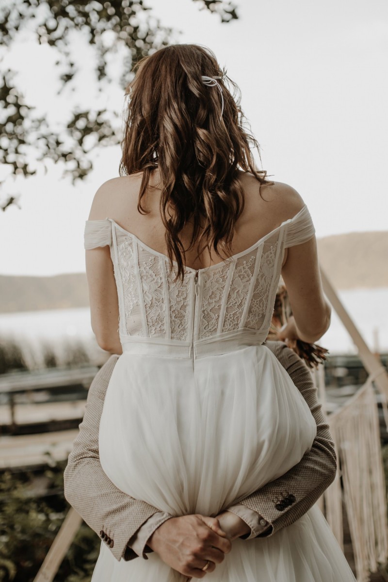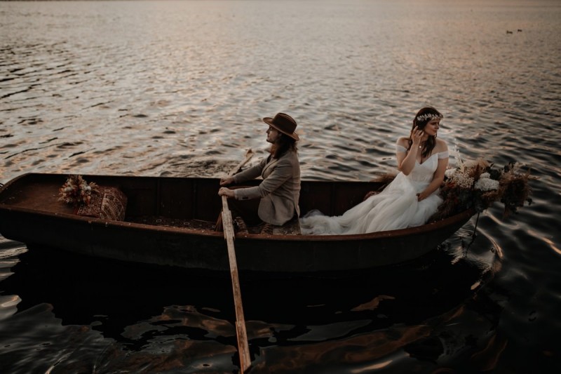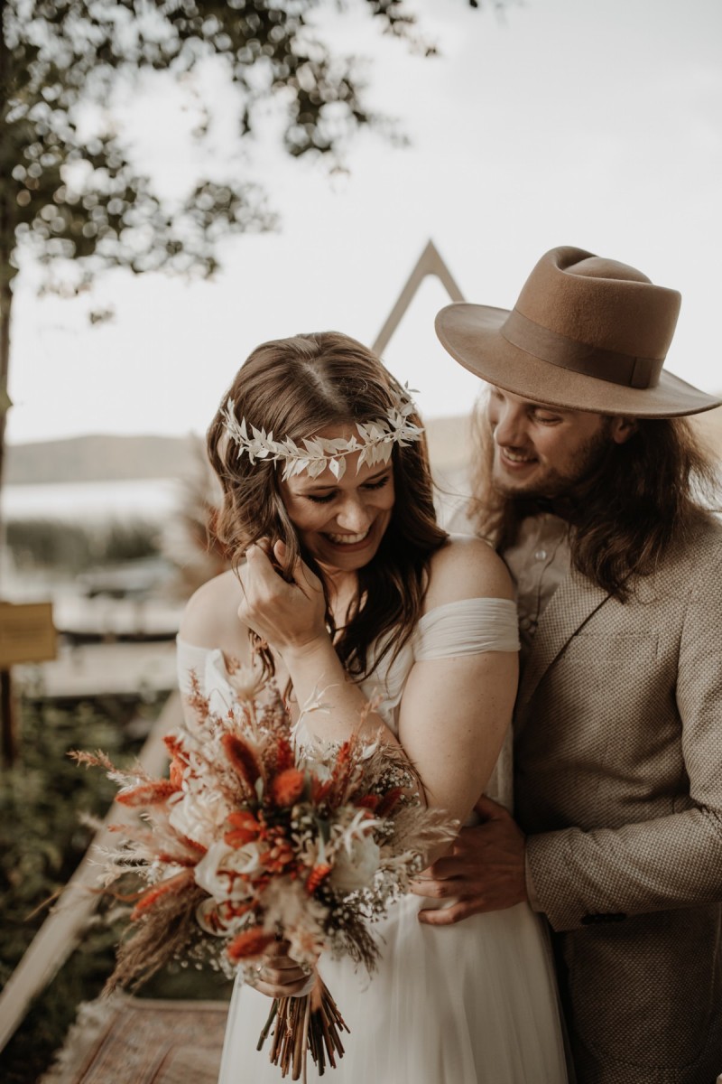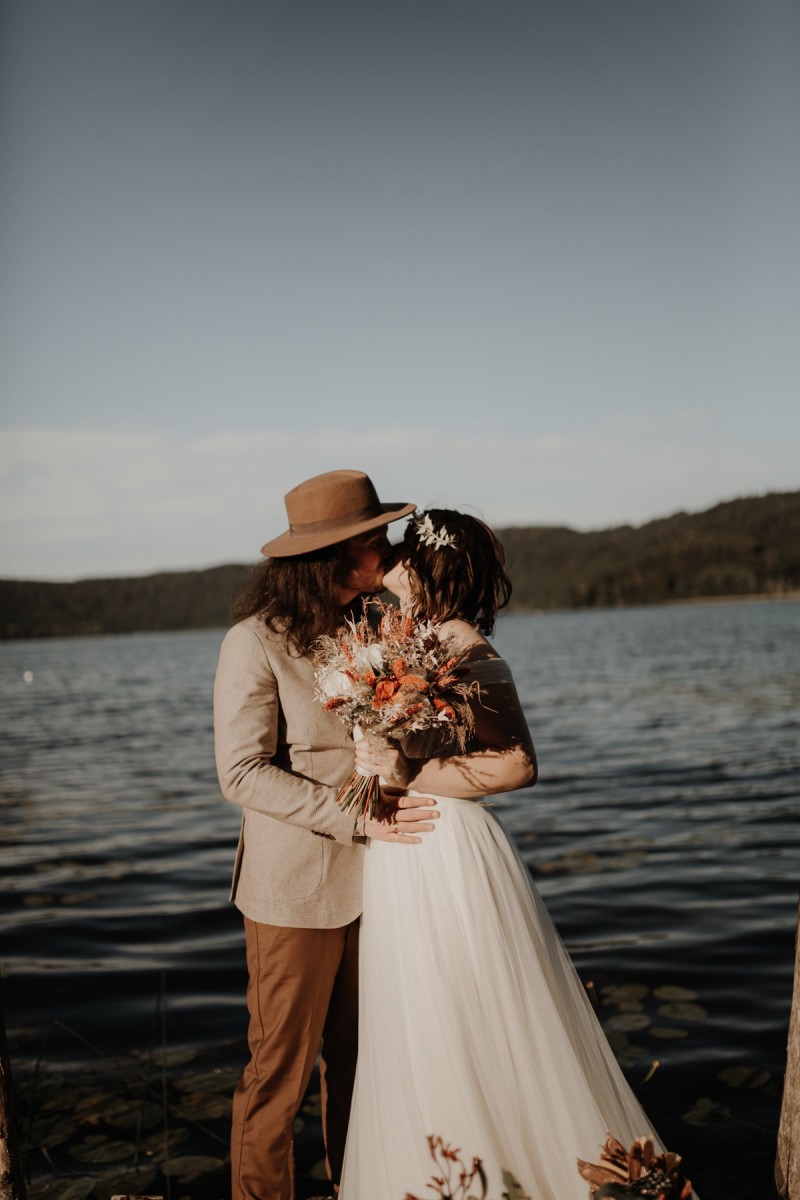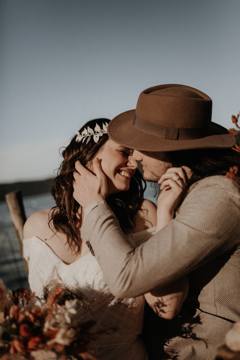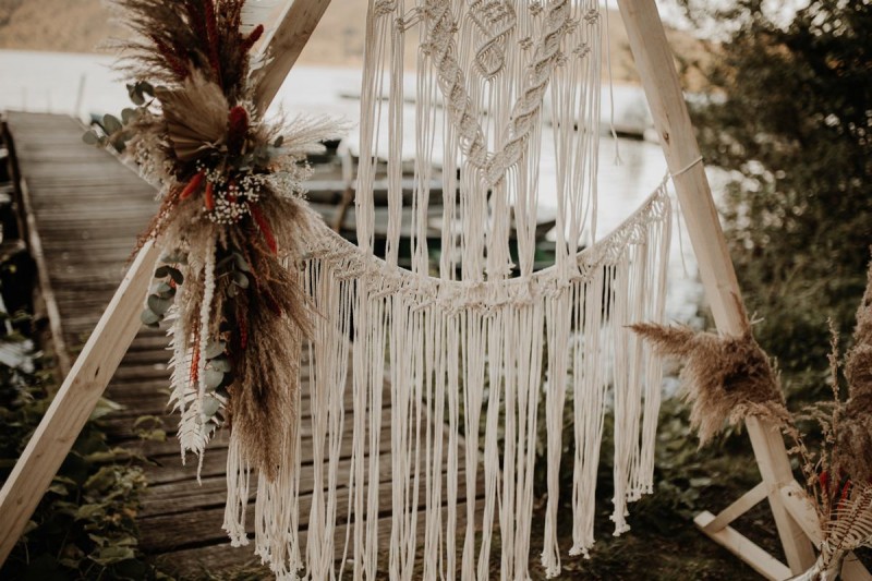 Nur du und ich auf einem verlassenen Bootssteg, die tiefstehende Sonne und die leichten Bewegungen des Seewassers. Klingt das nicht himmlisch? Ich würde sagen HELL YES! Und das ist nur der Beginn dieser wunderschönen Inspiration einer Elopement Wedding im Bohostil am schönen Laacher See! Wundervoll fotografiert von Hochzeitsfotografin Karina Wiebe, erwartete das bezaubernde Brautpaar Alina & Timm ein romantisches Picknick mit allerlei herzhaften Köstlichkeiten, auf dem Bootssteg am Seeufer. Kuschelig, dank Kissen und Decken, und romantisch, dank feinen Kerzenständern und frischen Blumen, inszenierte Hochzeitsplanerin From Sophie with love ein einmaliges Dinnersetting, mit einem Ausblick der Superlative. Hier begann für das Brautpaar ein außergewöhnlicher Tag, den sie so sicher nie vergessen werden. In einem eleganten Off-Shoulder Brautkleid mit opulent fließendem Rock von Audrey Wedding Salon und einem leichten Styling, kreiert von Styling by Sweta, stieß Alina mit ihrem Bräutigam Timm, der in einer braun-beigen Kombination aus Anzughose, lockerem Jacket und Hut glänzte, auf diesen besonderen Tag an. Neben den herzhaften Köstlichkeiten erwartete sie zudem eine Hochzeitstorte von Maggie’s Kuchen, dessen Cremedesign und Zuckerdekor seinesgleichen sucht. Doch ist dieses feine Plätzchen, wie bereits erwähnt, nur der Beginn dieser Wahnsinns Inspiration! Hochzeitsplanerin From Sophie with love hat das schöne Konzept dieser Inspiration kreiert und sich in der Planung so einiges einfallen lassen, das sie hier auch noch dekoriert hat. Denn nach den romantischen Stunden auf dem verlassenen Pier, erwartete das Brautpaar eine freie Trauzeremonie mit der lieben Sarah von Who is Karma – anyway, die diese intime Elopement Wedding perfekt machte. Vor einem großen, blumengeschmückten Traubogen aus Holz, mit Blick auf den See, wurde hier herzlich gelacht aber auch vor Freude geweint. Unterstützung bei der Dekoration dieses Elopements bekam die liebe Sophie von From Sophie with love von der Hochzeitsbouquetterie. Jess und ihr Team zauberten sowohl beim romantischen Dinnersetting, der opulenten Traulocation als auch beim Brautstrauß ganze Träume aus Trockenblumen. Passend zur Dekoration wurden vor allem erdige Töne gewählt, wie Braun, Beige und Creme, die mit warmen Rot- und zarten Weißtönen akzentuiert wurden. Ein Mix aus verschiedenen Strukturen gibt diesem harmonischen Konzept sowohl in der Floristik als auch in der Dekoration den herrlich rustikalen Bohocharm. Schon beim Dinnersetting setze From Sophie with love auf verschiedene Strukturen in den Details. Grobe, gehäkelte sowie glatte Stoffe treffen auf das unbehandelte Holz der Kisten und werden durch das glatte, glänzende Gold komplementiert. Wer noch nach Inspirationen für seine spätsommerliche oder herbstliche Bohohochzeit sucht, der ist hier in jedem Fall goldrichtig!