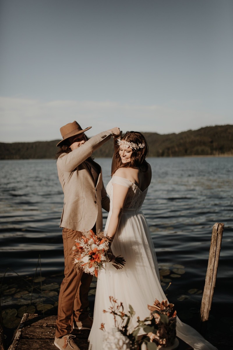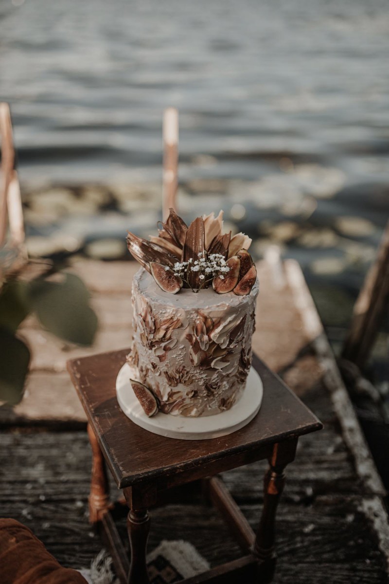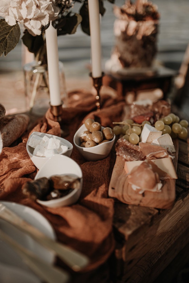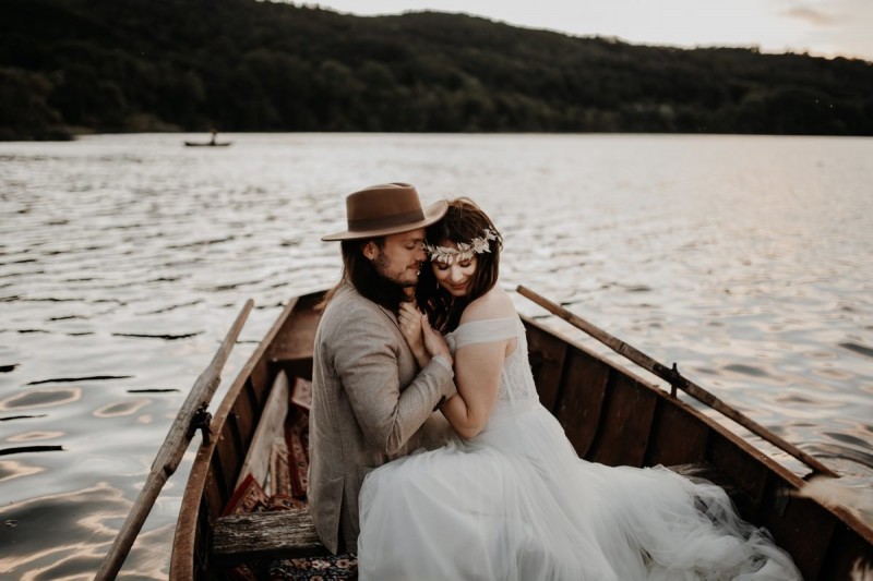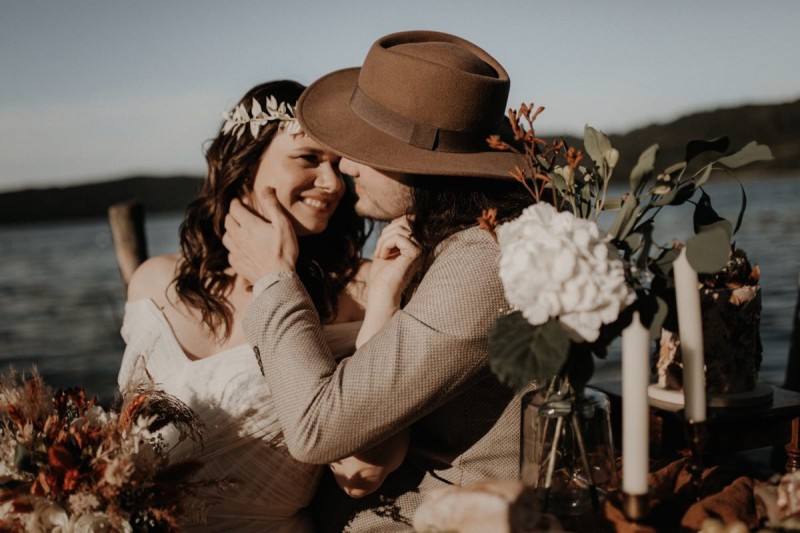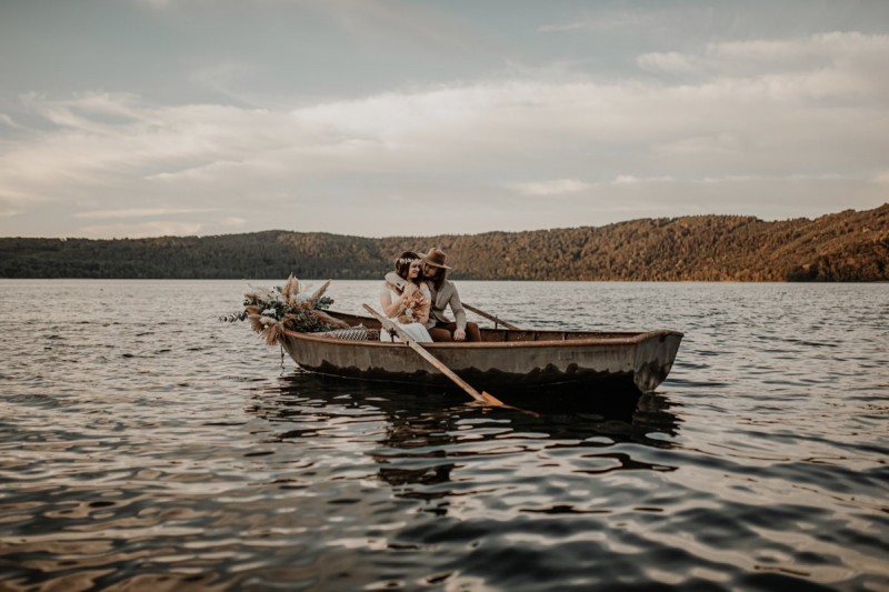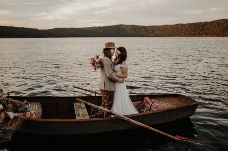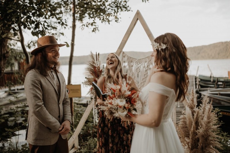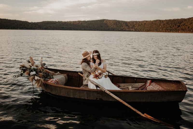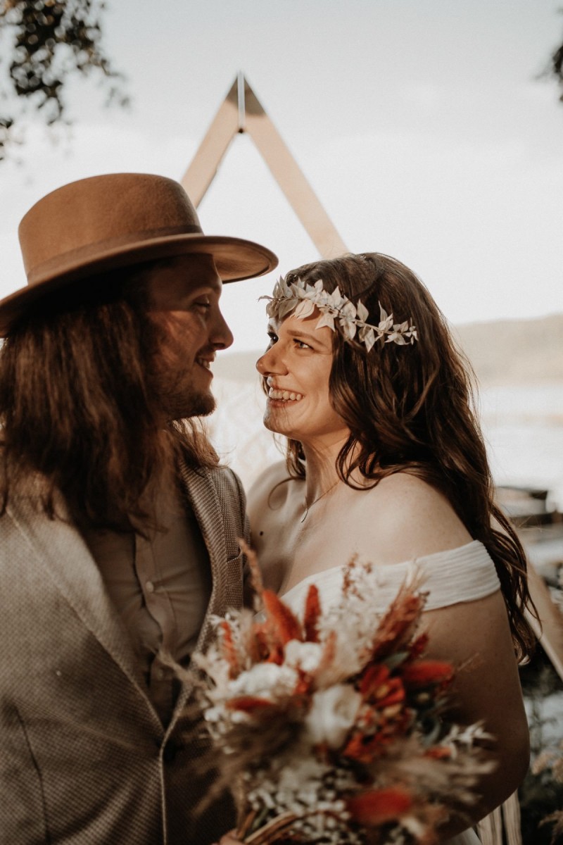 Nur du und ich auf einem verlassenen Bootssteg, die tiefstehende Sonne und die leichten Bewegungen des Seewassers. Klingt das nicht himmlisch? Ich würde sagen HELL YES! Und das ist nur der Beginn dieser wunderschönen Inspiration einer Elopement Wedding im Bohostil am schönen Laacher See! Wundervoll fotografiert von Hochzeitsfotografin Karina Wiebe, erwartete das bezaubernde Brautpaar Alina & Timm ein romantisches Picknick mit allerlei herzhaften Köstlichkeiten, auf dem Bootssteg am Seeufer. Kuschelig, dank Kissen und Decken, und romantisch, dank feinen Kerzenständern und frischen Blumen, inszenierte Hochzeitsplanerin From Sophie with love ein einmaliges Dinnersetting, mit einem Ausblick der Superlative. Hier begann für das Brautpaar ein außergewöhnlicher Tag, den sie so sicher nie vergessen werden. In einem eleganten Off-Shoulder Brautkleid mit opulent fließendem Rock von Audrey Wedding Salon und einem leichten Styling, kreiert von Styling by Sweta, stieß Alina mit ihrem Bräutigam Timm, der in einer braun-beigen Kombination aus Anzughose, lockerem Jacket und Hut glänzte, auf diesen besonderen Tag an. Neben den herzhaften Köstlichkeiten erwartete sie zudem eine Hochzeitstorte von Maggie’s Kuchen, dessen Cremedesign und Zuckerdekor seinesgleichen sucht. Doch ist dieses feine Plätzchen, wie bereits erwähnt, nur der Beginn dieser Wahnsinns Inspiration! Hochzeitsplanerin From Sophie with love hat das schöne Konzept dieser Inspiration kreiert und sich in der Planung so einiges einfallen lassen, das sie hier auch noch dekoriert hat. Denn nach den romantischen Stunden auf dem verlassenen Pier, erwartete das Brautpaar eine freie Trauzeremonie mit der lieben Sarah von Who is Karma – anyway, die diese intime Elopement Wedding perfekt machte. Vor einem großen, blumengeschmückten Traubogen aus Holz, mit Blick auf den See, wurde hier herzlich gelacht aber auch vor Freude geweint. Unterstützung bei der Dekoration dieses Elopements bekam die liebe Sophie von From Sophie with love von der Hochzeitsbouquetterie. Jess und ihr Team zauberten sowohl beim romantischen Dinnersetting, der opulenten Traulocation als auch beim Brautstrauß ganze Träume aus Trockenblumen. Passend zur Dekoration wurden vor allem erdige Töne gewählt, wie Braun, Beige und Creme, die mit warmen Rot- und zarten Weißtönen akzentuiert wurden. Ein Mix aus verschiedenen Strukturen gibt diesem harmonischen Konzept sowohl in der Floristik als auch in der Dekoration den herrlich rustikalen Bohocharm. Schon beim Dinnersetting setze From Sophie with love auf verschiedene Strukturen in den Details. Grobe, gehäkelte sowie glatte Stoffe treffen auf das unbehandelte Holz der Kisten und werden durch das glatte, glänzende Gold komplementiert. Wer noch nach Inspirationen für seine spätsommerliche oder herbstliche Bohohochzeit sucht, der ist hier in jedem Fall goldrichtig!