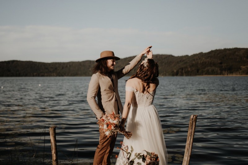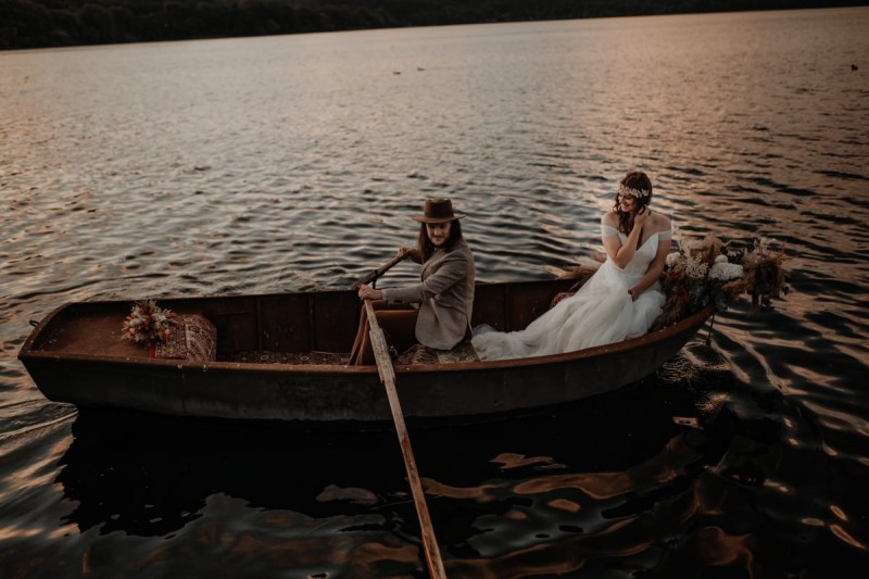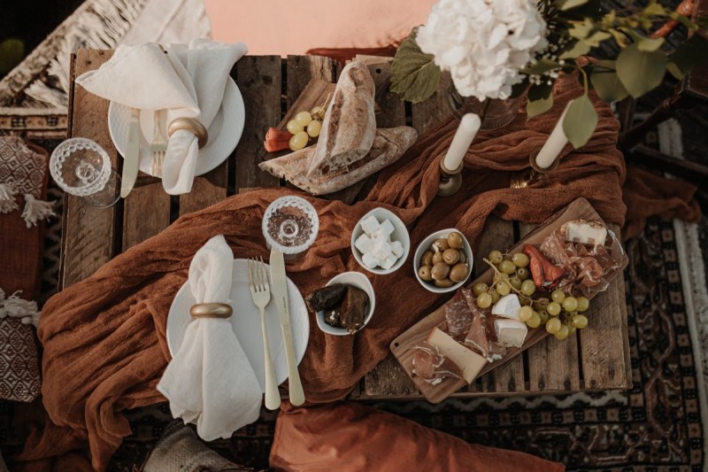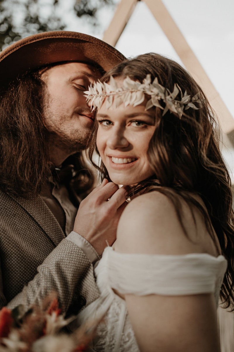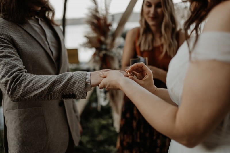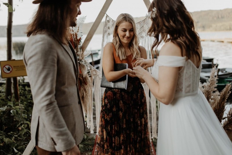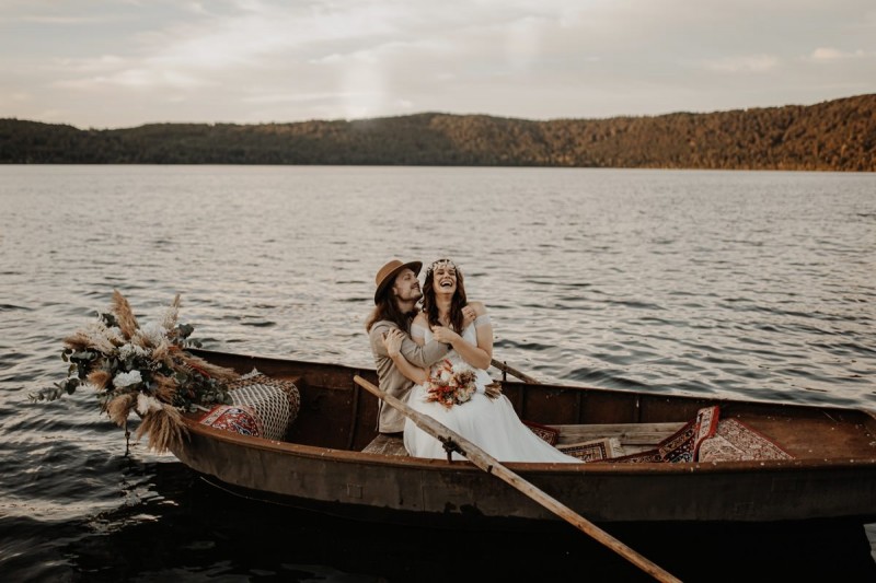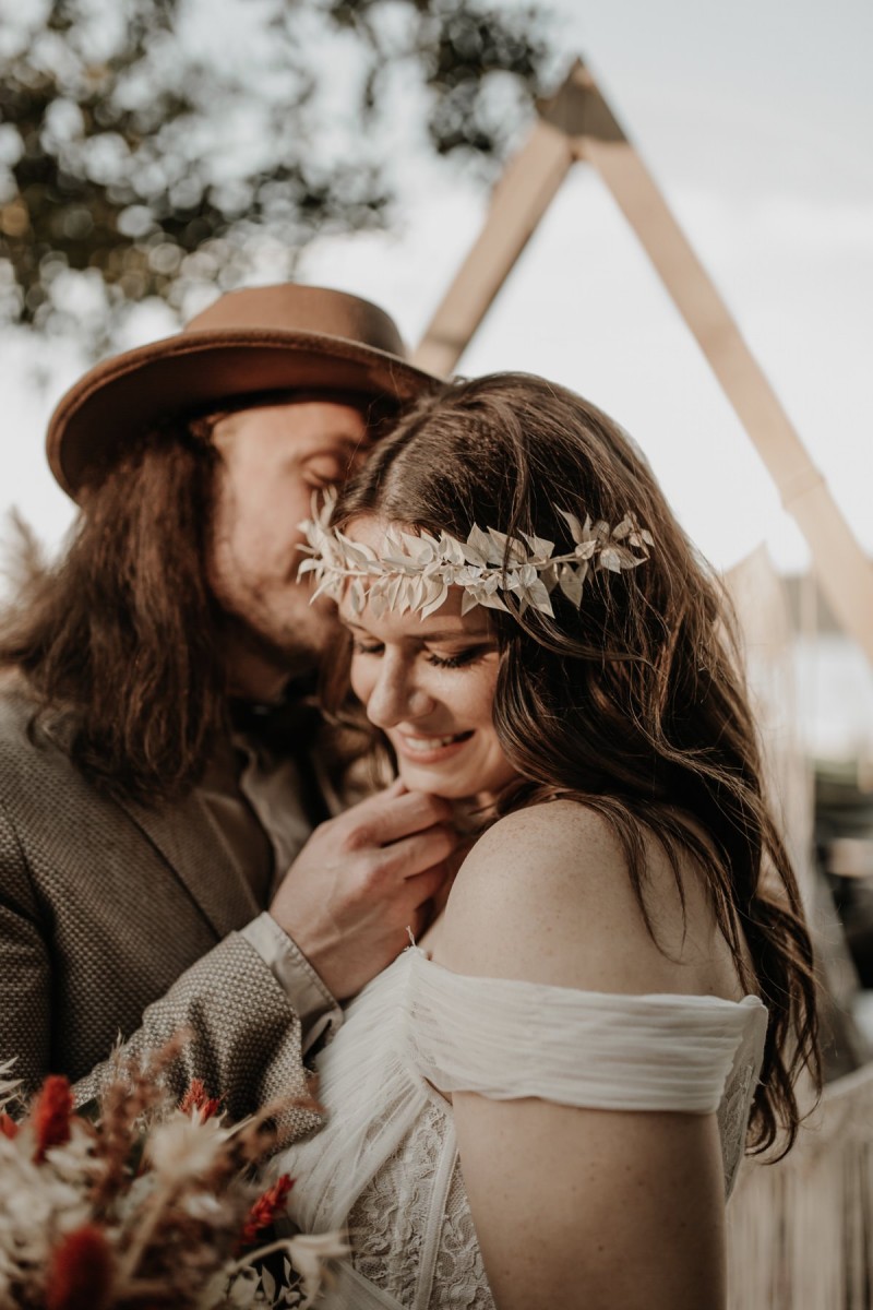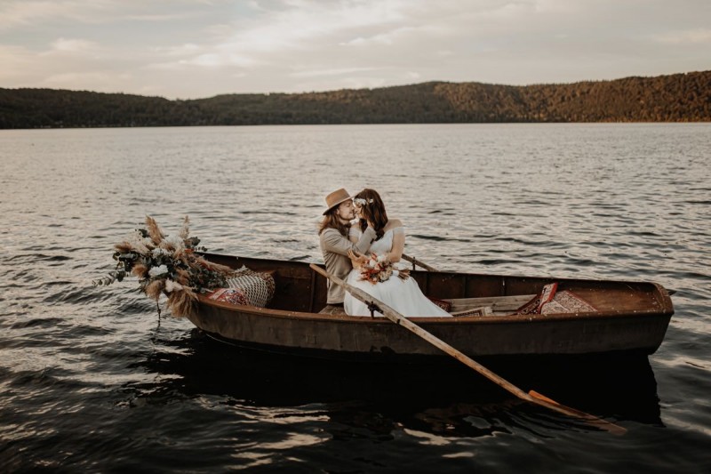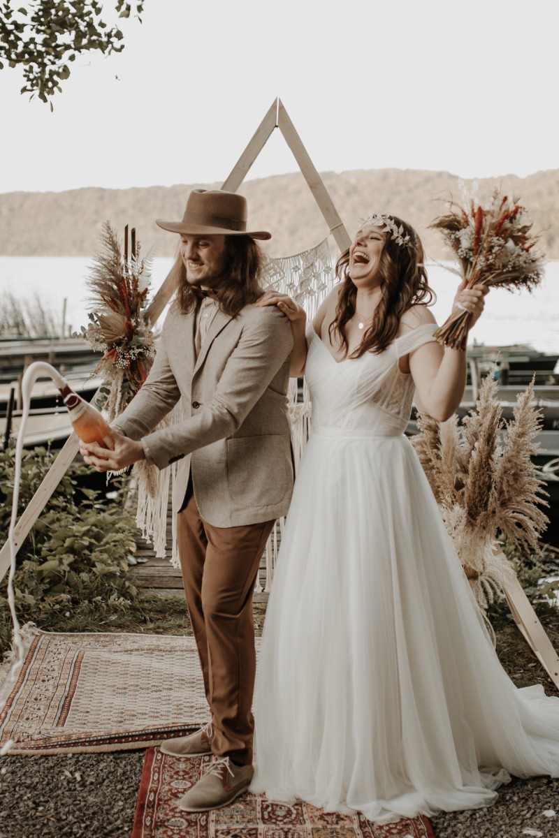 Nur du und ich auf einem verlassenen Bootssteg, die tiefstehende Sonne und die leichten Bewegungen des Seewassers. Klingt das nicht himmlisch? Ich würde sagen HELL YES! Und das ist nur der Beginn dieser wunderschönen Inspiration einer Elopement Wedding im Bohostil am schönen Laacher See! Wundervoll fotografiert von Hochzeitsfotografin Karina Wiebe, erwartete das bezaubernde Brautpaar Alina & Timm ein romantisches Picknick mit allerlei herzhaften Köstlichkeiten, auf dem Bootssteg am Seeufer. Kuschelig, dank Kissen und Decken, und romantisch, dank feinen Kerzenständern und frischen Blumen, inszenierte Hochzeitsplanerin From Sophie with love ein einmaliges Dinnersetting, mit einem Ausblick der Superlative. Hier begann für das Brautpaar ein außergewöhnlicher Tag, den sie so sicher nie vergessen werden. In einem eleganten Off-Shoulder Brautkleid mit opulent fließendem Rock von Audrey Wedding Salon und einem leichten Styling, kreiert von Styling by Sweta, stieß Alina mit ihrem Bräutigam Timm, der in einer braun-beigen Kombination aus Anzughose, lockerem Jacket und Hut glänzte, auf diesen besonderen Tag an. Neben den herzhaften Köstlichkeiten erwartete sie zudem eine Hochzeitstorte von Maggie’s Kuchen, dessen Cremedesign und Zuckerdekor seinesgleichen sucht. Doch ist dieses feine Plätzchen, wie bereits erwähnt, nur der Beginn dieser Wahnsinns Inspiration! Hochzeitsplanerin From Sophie with love hat das schöne Konzept dieser Inspiration kreiert und sich in der Planung so einiges einfallen lassen, das sie hier auch noch dekoriert hat. Denn nach den romantischen Stunden auf dem verlassenen Pier, erwartete das Brautpaar eine freie Trauzeremonie mit der lieben Sarah von Who is Karma – anyway, die diese intime Elopement Wedding perfekt machte. Vor einem großen, blumengeschmückten Traubogen aus Holz, mit Blick auf den See, wurde hier herzlich gelacht aber auch vor Freude geweint. Unterstützung bei der Dekoration dieses Elopements bekam die liebe Sophie von From Sophie with love von der Hochzeitsbouquetterie. Jess und ihr Team zauberten sowohl beim romantischen Dinnersetting, der opulenten Traulocation als auch beim Brautstrauß ganze Träume aus Trockenblumen. Passend zur Dekoration wurden vor allem erdige Töne gewählt, wie Braun, Beige und Creme, die mit warmen Rot- und zarten Weißtönen akzentuiert wurden. Ein Mix aus verschiedenen Strukturen gibt diesem harmonischen Konzept sowohl in der Floristik als auch in der Dekoration den herrlich rustikalen Bohocharm. Schon beim Dinnersetting setze From Sophie with love auf verschiedene Strukturen in den Details. Grobe, gehäkelte sowie glatte Stoffe treffen auf das unbehandelte Holz der Kisten und werden durch das glatte, glänzende Gold komplementiert. Wer noch nach Inspirationen für seine spätsommerliche oder herbstliche Bohohochzeit sucht, der ist hier in jedem Fall goldrichtig!
