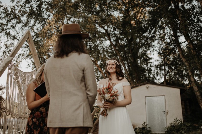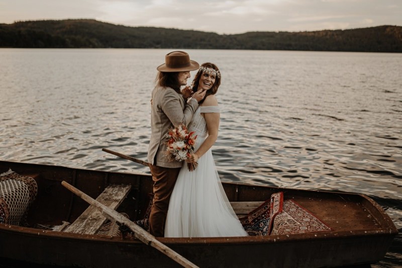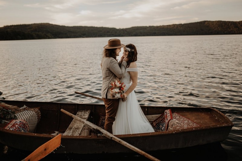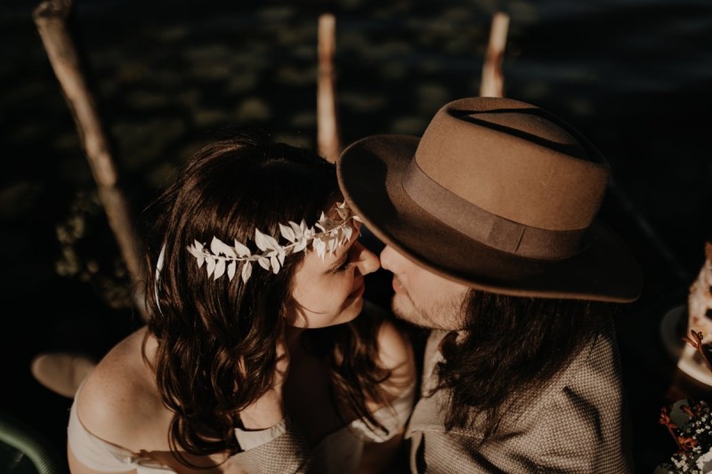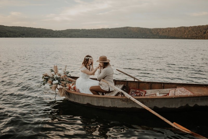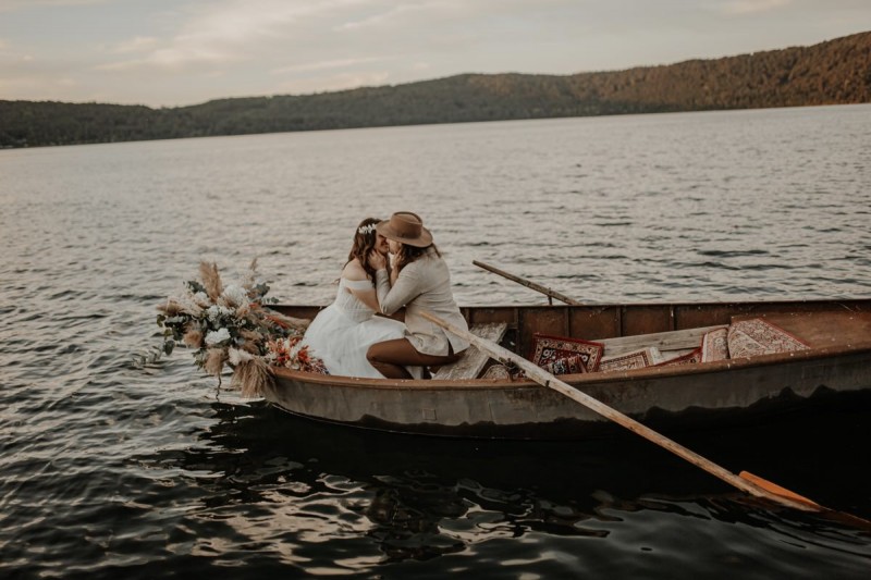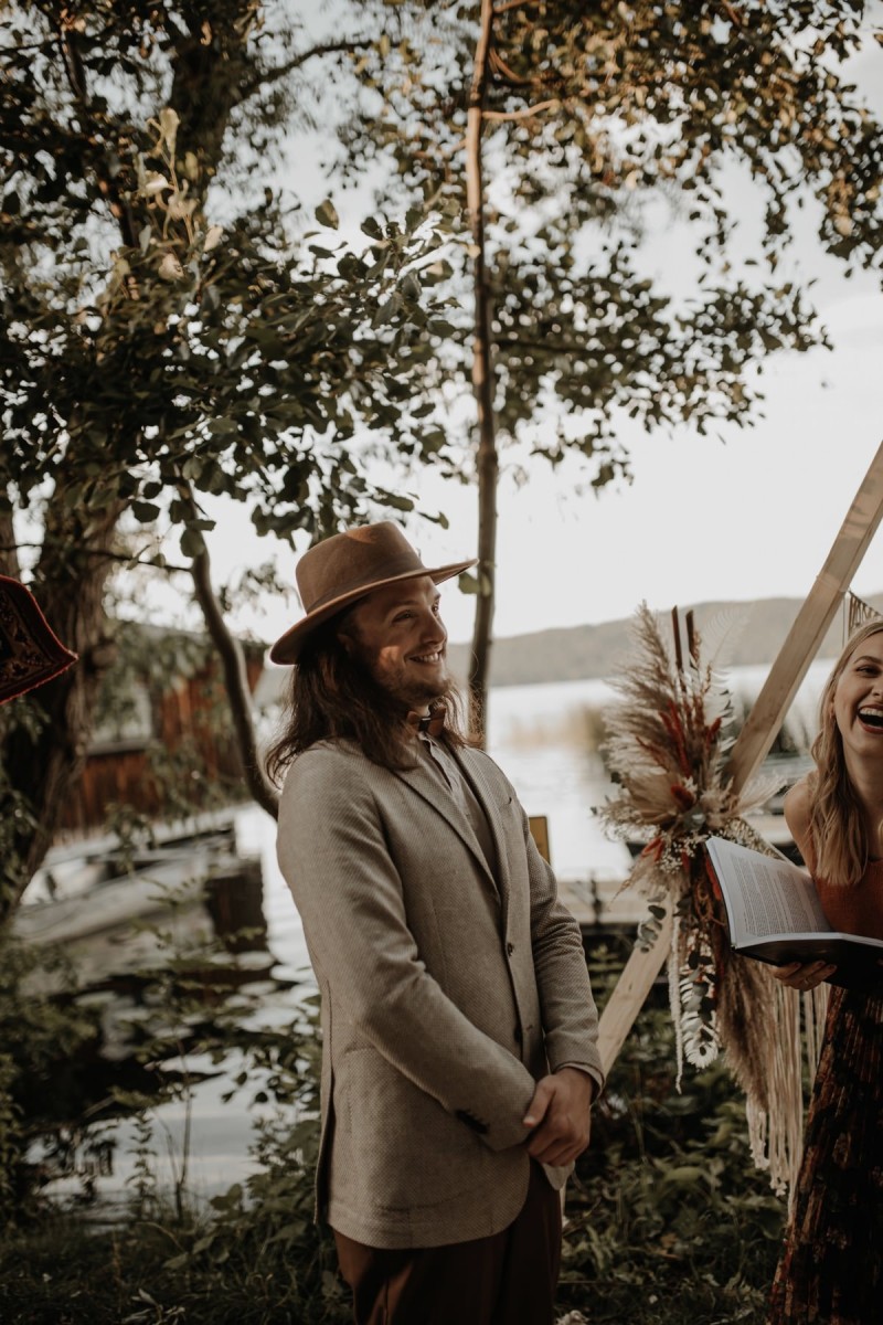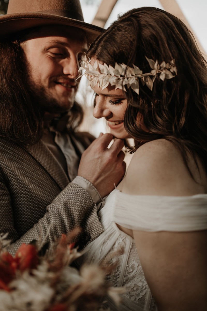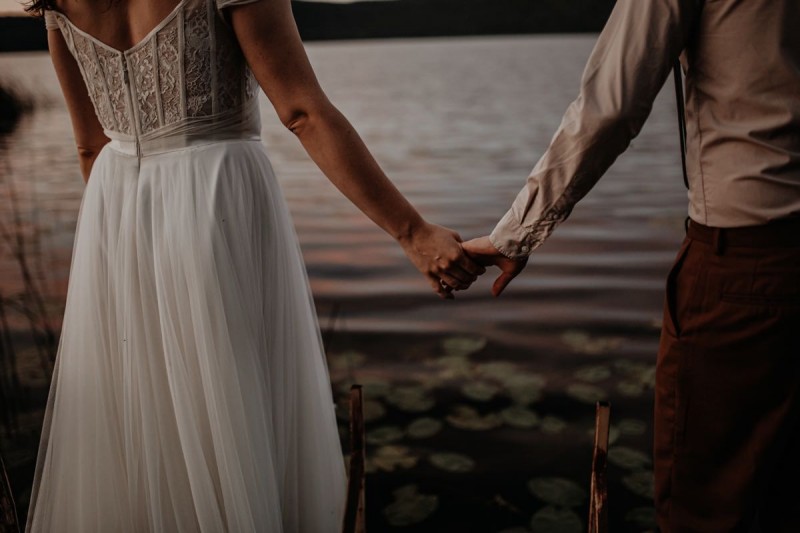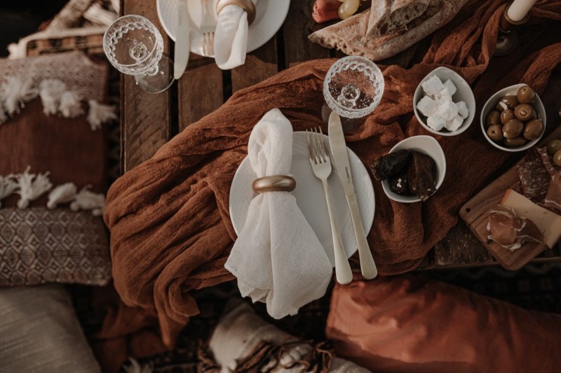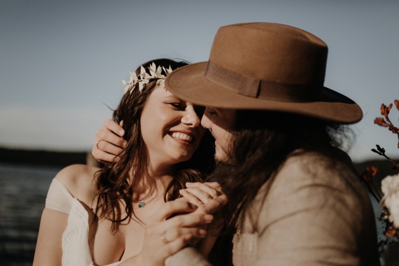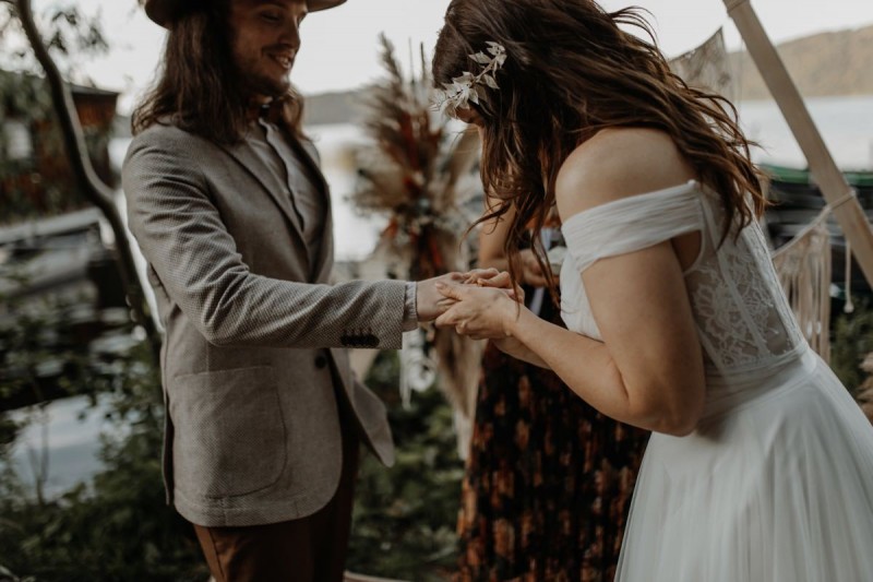 Nur du und ich auf einem verlassenen Bootssteg, die tiefstehende Sonne und die leichten Bewegungen des Seewassers. Klingt das nicht himmlisch? Ich würde sagen HELL YES! Und das ist nur der Beginn dieser wunderschönen Inspiration einer Elopement Wedding im Bohostil am schönen Laacher See! Wundervoll fotografiert von Hochzeitsfotografin Karina Wiebe, erwartete das bezaubernde Brautpaar Alina & Timm ein romantisches Picknick mit allerlei herzhaften Köstlichkeiten, auf dem Bootssteg am Seeufer. Kuschelig, dank Kissen und Decken, und romantisch, dank feinen Kerzenständern und frischen Blumen, inszenierte Hochzeitsplanerin From Sophie with love ein einmaliges Dinnersetting, mit einem Ausblick der Superlative. Hier begann für das Brautpaar ein außergewöhnlicher Tag, den sie so sicher nie vergessen werden. In einem eleganten Off-Shoulder Brautkleid mit opulent fließendem Rock von Audrey Wedding Salon und einem leichten Styling, kreiert von Styling by Sweta, stieß Alina mit ihrem Bräutigam Timm, der in einer braun-beigen Kombination aus Anzughose, lockerem Jacket und Hut glänzte, auf diesen besonderen Tag an. Neben den herzhaften Köstlichkeiten erwartete sie zudem eine Hochzeitstorte von Maggie’s Kuchen, dessen Cremedesign und Zuckerdekor seinesgleichen sucht. Doch ist dieses feine Plätzchen, wie bereits erwähnt, nur der Beginn dieser Wahnsinns Inspiration! Hochzeitsplanerin From Sophie with love hat das schöne Konzept dieser Inspiration kreiert und sich in der Planung so einiges einfallen lassen, das sie hier auch noch dekoriert hat. Denn nach den romantischen Stunden auf dem verlassenen Pier, erwartete das Brautpaar eine freie Trauzeremonie mit der lieben Sarah von Who is Karma – anyway, die diese intime Elopement Wedding perfekt machte. Vor einem großen, blumengeschmückten Traubogen aus Holz, mit Blick auf den See, wurde hier herzlich gelacht aber auch vor Freude geweint. Unterstützung bei der Dekoration dieses Elopements bekam die liebe Sophie von From Sophie with love von der Hochzeitsbouquetterie. Jess und ihr Team zauberten sowohl beim romantischen Dinnersetting, der opulenten Traulocation als auch beim Brautstrauß ganze Träume aus Trockenblumen. Passend zur Dekoration wurden vor allem erdige Töne gewählt, wie Braun, Beige und Creme, die mit warmen Rot- und zarten Weißtönen akzentuiert wurden. Ein Mix aus verschiedenen Strukturen gibt diesem harmonischen Konzept sowohl in der Floristik als auch in der Dekoration den herrlich rustikalen Bohocharm. Schon beim Dinnersetting setze From Sophie with love auf verschiedene Strukturen in den Details. Grobe, gehäkelte sowie glatte Stoffe treffen auf das unbehandelte Holz der Kisten und werden durch das glatte, glänzende Gold komplementiert. Wer noch nach Inspirationen für seine spätsommerliche oder herbstliche Bohohochzeit sucht, der ist hier in jedem Fall goldrichtig!