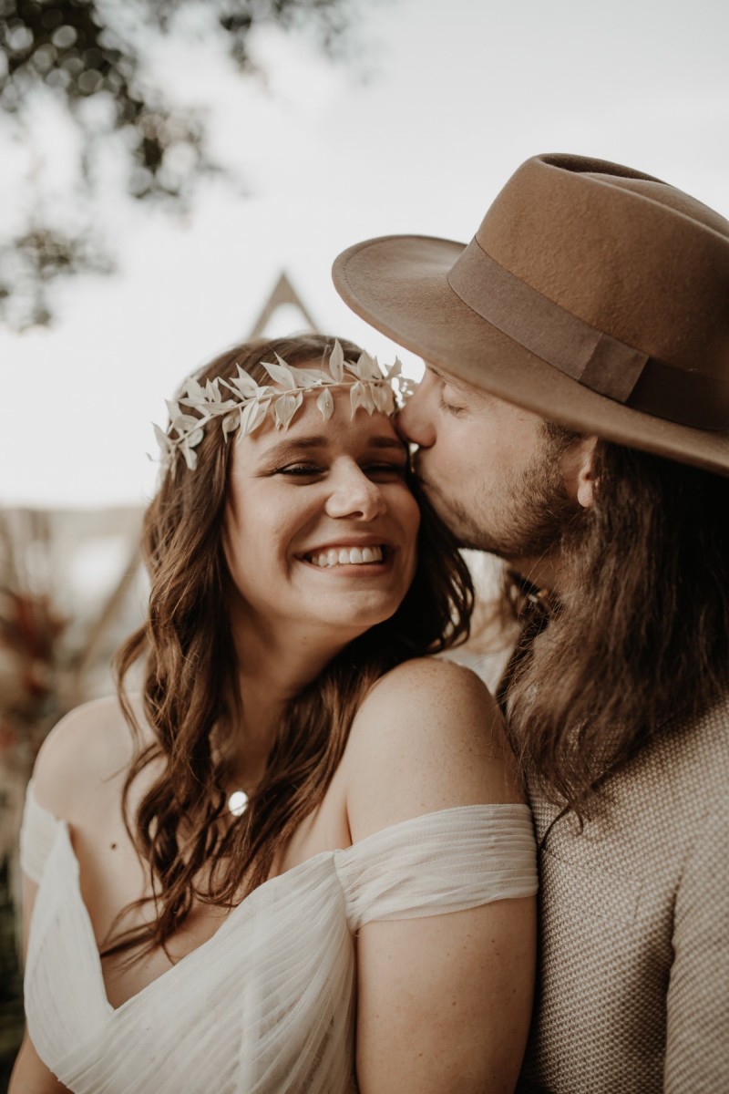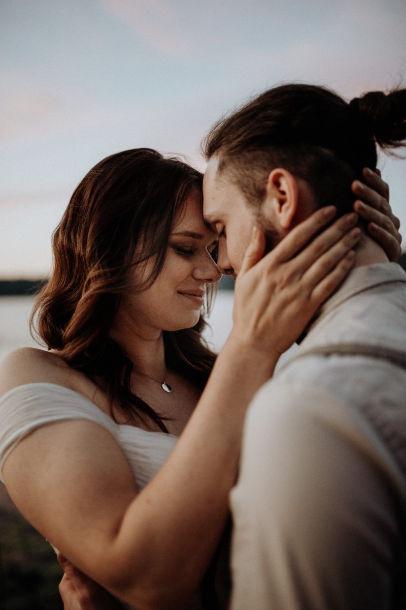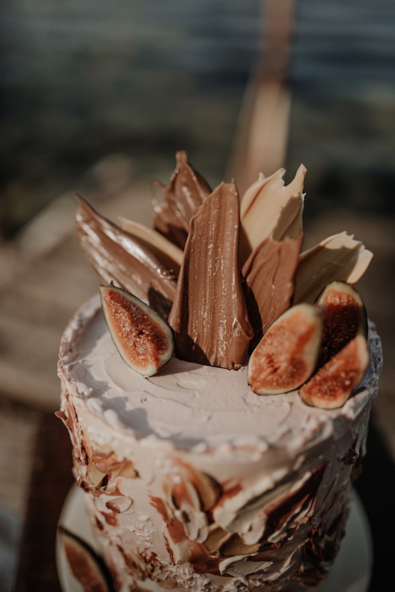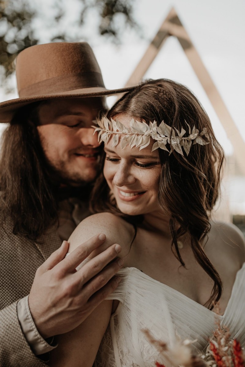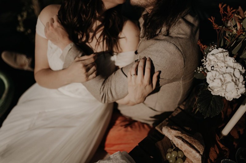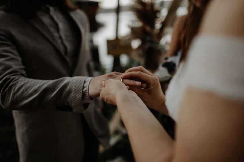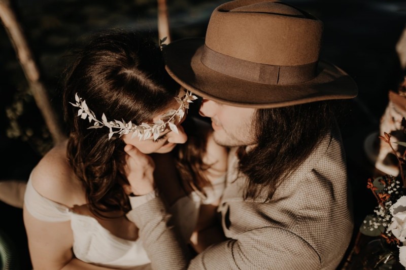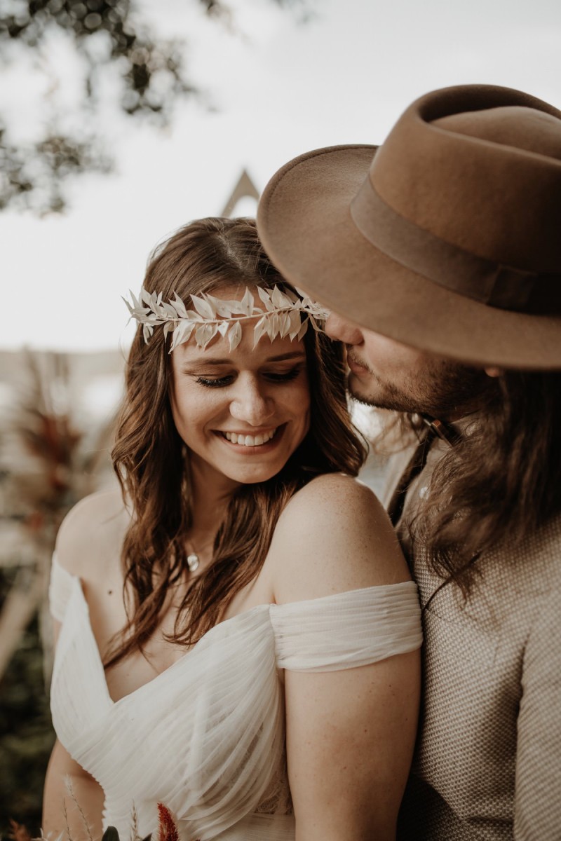 Nur du und ich auf einem verlassenen Bootssteg, die tiefstehende Sonne und die leichten Bewegungen des Seewassers. Klingt das nicht himmlisch? Ich würde sagen HELL YES! Und das ist nur der Beginn dieser wunderschönen Inspiration einer Elopement Wedding im Bohostil am schönen Laacher See! Wundervoll fotografiert von Hochzeitsfotografin Karina Wiebe, erwartete das bezaubernde Brautpaar Alina & Timm ein romantisches Picknick mit allerlei herzhaften Köstlichkeiten, auf dem Bootssteg am Seeufer. Kuschelig, dank Kissen und Decken, und romantisch, dank feinen Kerzenständern und frischen Blumen, inszenierte Hochzeitsplanerin From Sophie with love ein einmaliges Dinnersetting, mit einem Ausblick der Superlative. Hier begann für das Brautpaar ein außergewöhnlicher Tag, den sie so sicher nie vergessen werden. In einem eleganten Off-Shoulder Brautkleid mit opulent fließendem Rock von Audrey Wedding Salon und einem leichten Styling, kreiert von Styling by Sweta, stieß Alina mit ihrem Bräutigam Timm, der in einer braun-beigen Kombination aus Anzughose, lockerem Jacket und Hut glänzte, auf diesen besonderen Tag an. Neben den herzhaften Köstlichkeiten erwartete sie zudem eine Hochzeitstorte von Maggie’s Kuchen, dessen Cremedesign und Zuckerdekor seinesgleichen sucht. Doch ist dieses feine Plätzchen, wie bereits erwähnt, nur der Beginn dieser Wahnsinns Inspiration! Hochzeitsplanerin From Sophie with love hat das schöne Konzept dieser Inspiration kreiert und sich in der Planung so einiges einfallen lassen, das sie hier auch noch dekoriert hat. Denn nach den romantischen Stunden auf dem verlassenen Pier, erwartete das Brautpaar eine freie Trauzeremonie mit der lieben Sarah von Who is Karma – anyway, die diese intime Elopement Wedding perfekt machte. Vor einem großen, blumengeschmückten Traubogen aus Holz, mit Blick auf den See, wurde hier herzlich gelacht aber auch vor Freude geweint. Unterstützung bei der Dekoration dieses Elopements bekam die liebe Sophie von From Sophie with love von der Hochzeitsbouquetterie. Jess und ihr Team zauberten sowohl beim romantischen Dinnersetting, der opulenten Traulocation als auch beim Brautstrauß ganze Träume aus Trockenblumen. Passend zur Dekoration wurden vor allem erdige Töne gewählt, wie Braun, Beige und Creme, die mit warmen Rot- und zarten Weißtönen akzentuiert wurden. Ein Mix aus verschiedenen Strukturen gibt diesem harmonischen Konzept sowohl in der Floristik als auch in der Dekoration den herrlich rustikalen Bohocharm. Schon beim Dinnersetting setze From Sophie with love auf verschiedene Strukturen in den Details. Grobe, gehäkelte sowie glatte Stoffe treffen auf das unbehandelte Holz der Kisten und werden durch das glatte, glänzende Gold komplementiert. Wer noch nach Inspirationen für seine spätsommerliche oder herbstliche Bohohochzeit sucht, der ist hier in jedem Fall goldrichtig!
