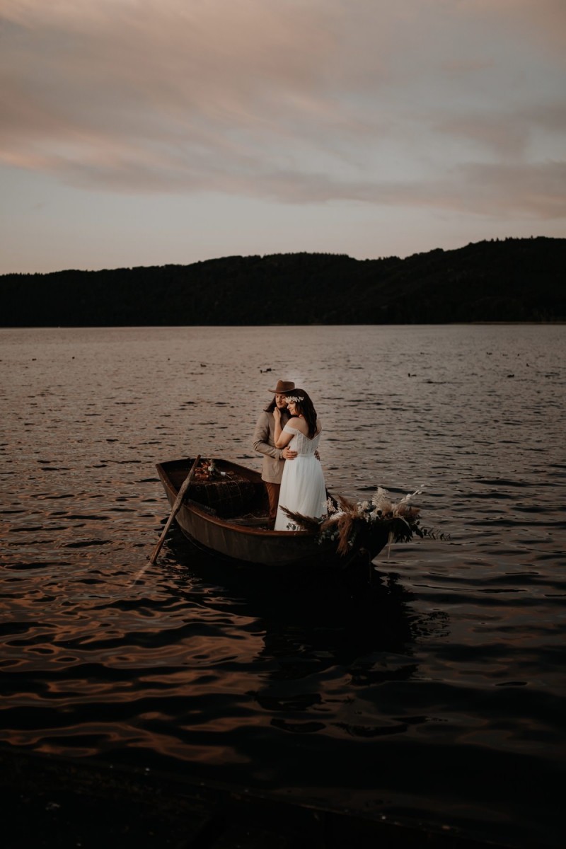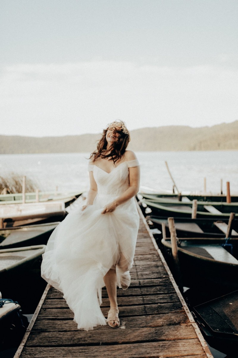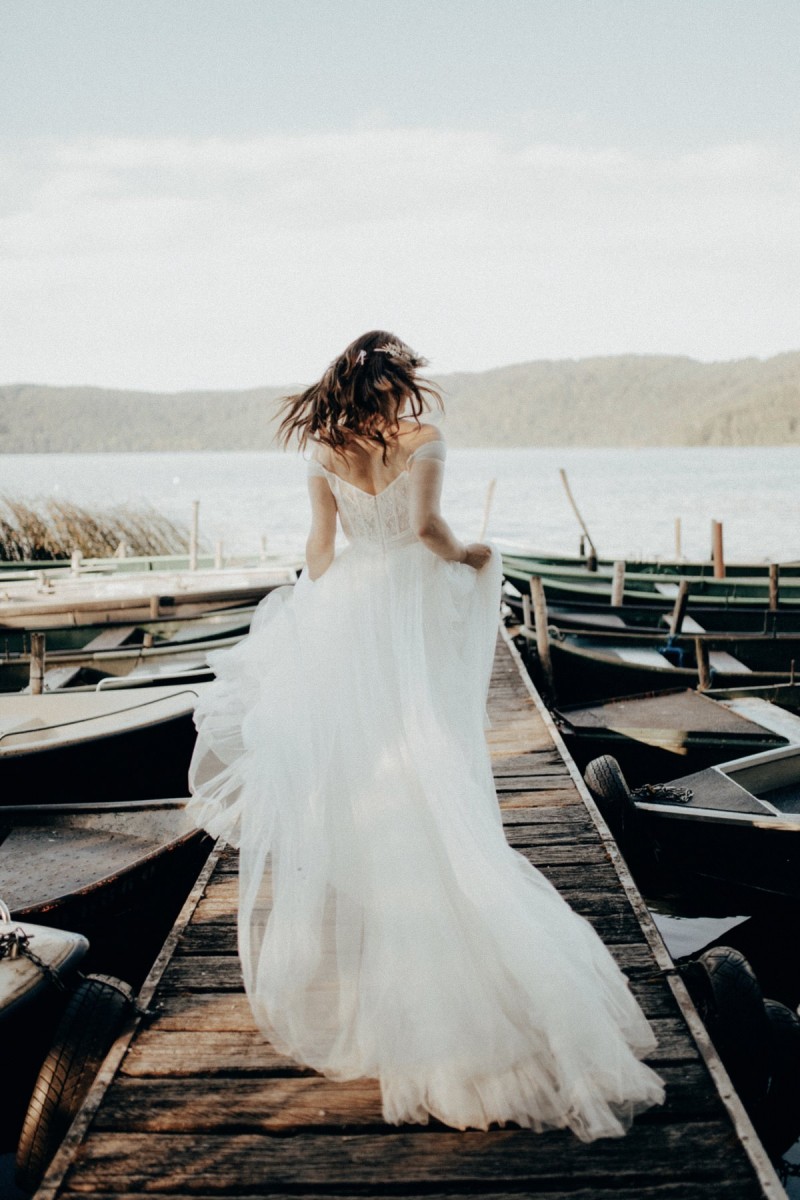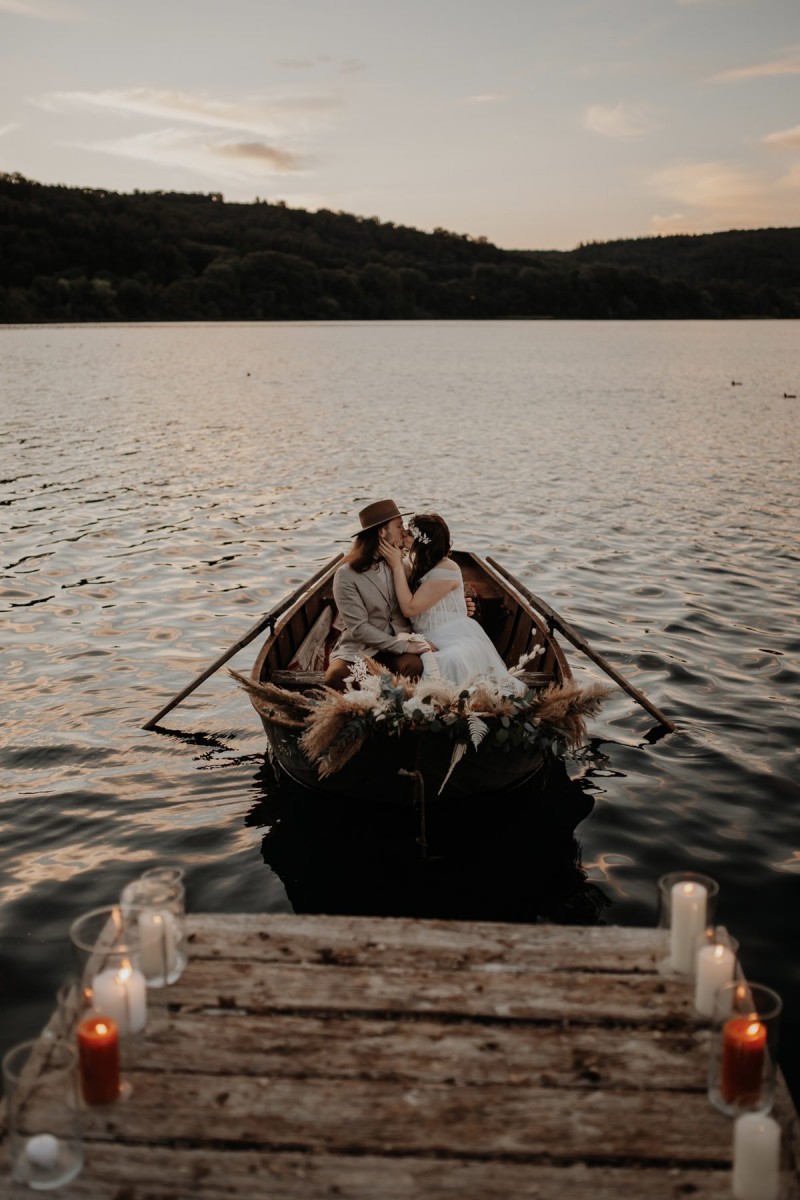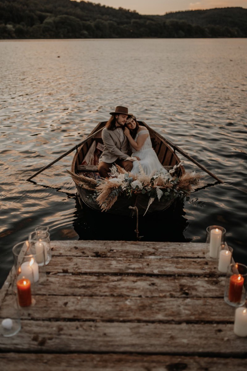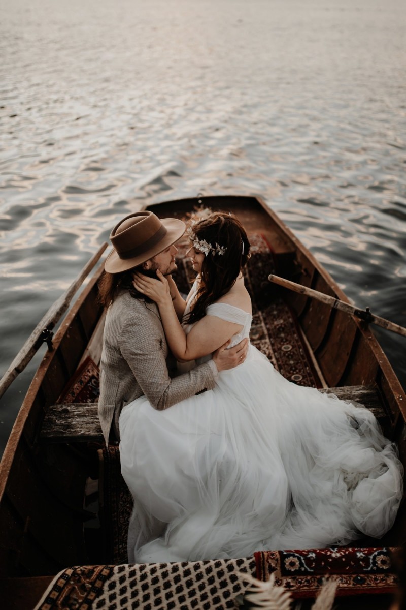 Und wer dachte, das wäre gerade der Schlusssatz gewesen – weit gefehlt! Wir legen noch eine Schippe drauf! Nach der romantischen Trauung bestiegen die beiden ein kleines, blumengeschmücktes Boot, das sie am Seeufer entlang trug. Nur die zwei, umgeben von ruhigem Wasser, den Bergen am Horizont und ein Bootssteg, der mit flackernden Kerzen auf sie wartete. Und wie kann man nach all den Highlights für uns, sowie die beiden, den Hochzeitstag gebührend abschließen? Stichwort: TRASH THE DRESS! So wild und frei wie ihre Elopement Wedding am See, sprang das Brautpaar Hand in Hand in der Abenddämmerung in den See. Ein grandioser Anblick! Aber seht selbst ihr Lieben! Genießt es!