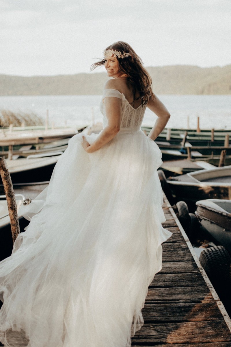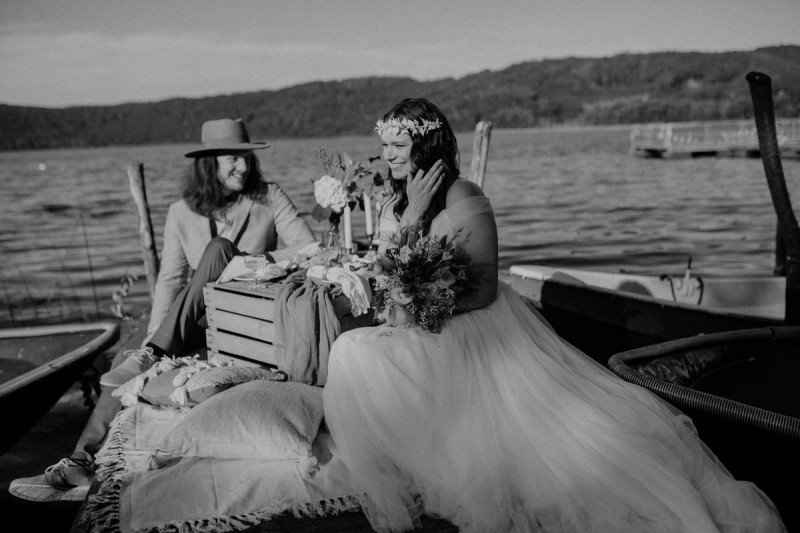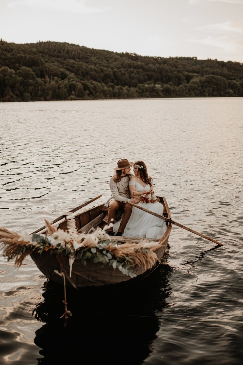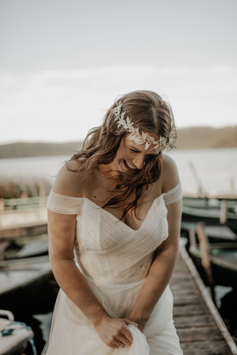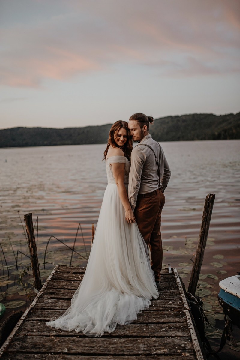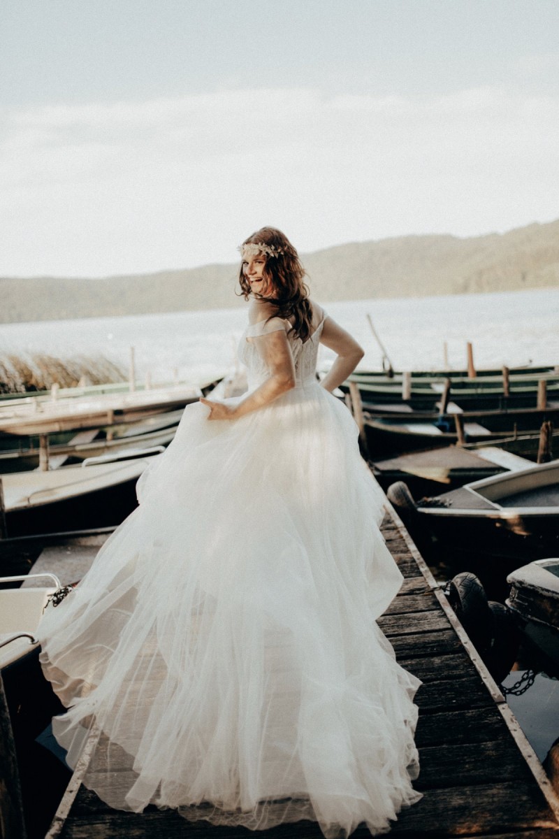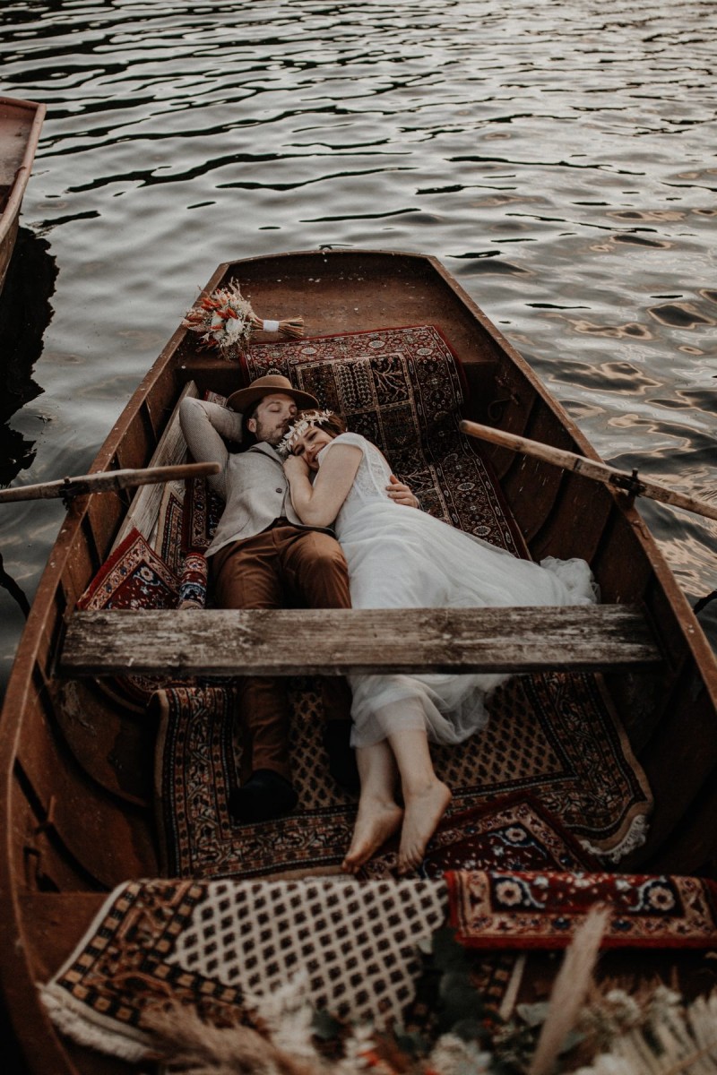 Und wer dachte, das wäre gerade der Schlusssatz gewesen – weit gefehlt! Wir legen noch eine Schippe drauf! Nach der romantischen Trauung bestiegen die beiden ein kleines, blumengeschmücktes Boot, das sie am Seeufer entlang trug. Nur die zwei, umgeben von ruhigem Wasser, den Bergen am Horizont und ein Bootssteg, der mit flackernden Kerzen auf sie wartete. Und wie kann man nach all den Highlights für uns, sowie die beiden, den Hochzeitstag gebührend abschließen? Stichwort: TRASH THE DRESS! So wild und frei wie ihre Elopement Wedding am See, sprang das Brautpaar Hand in Hand in der Abenddämmerung in den See. Ein grandioser Anblick! Aber seht selbst ihr Lieben! Genießt es!