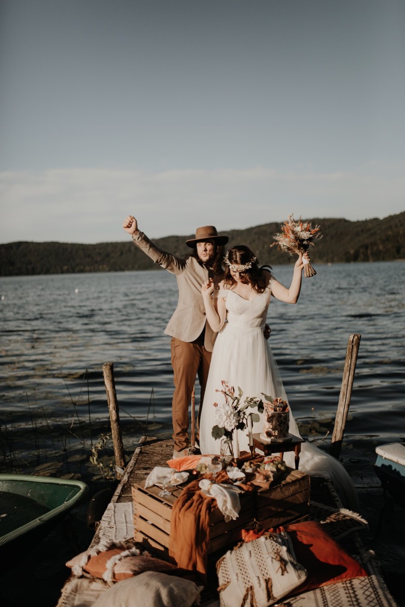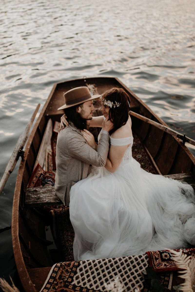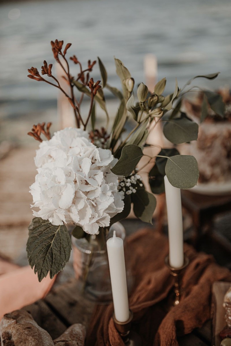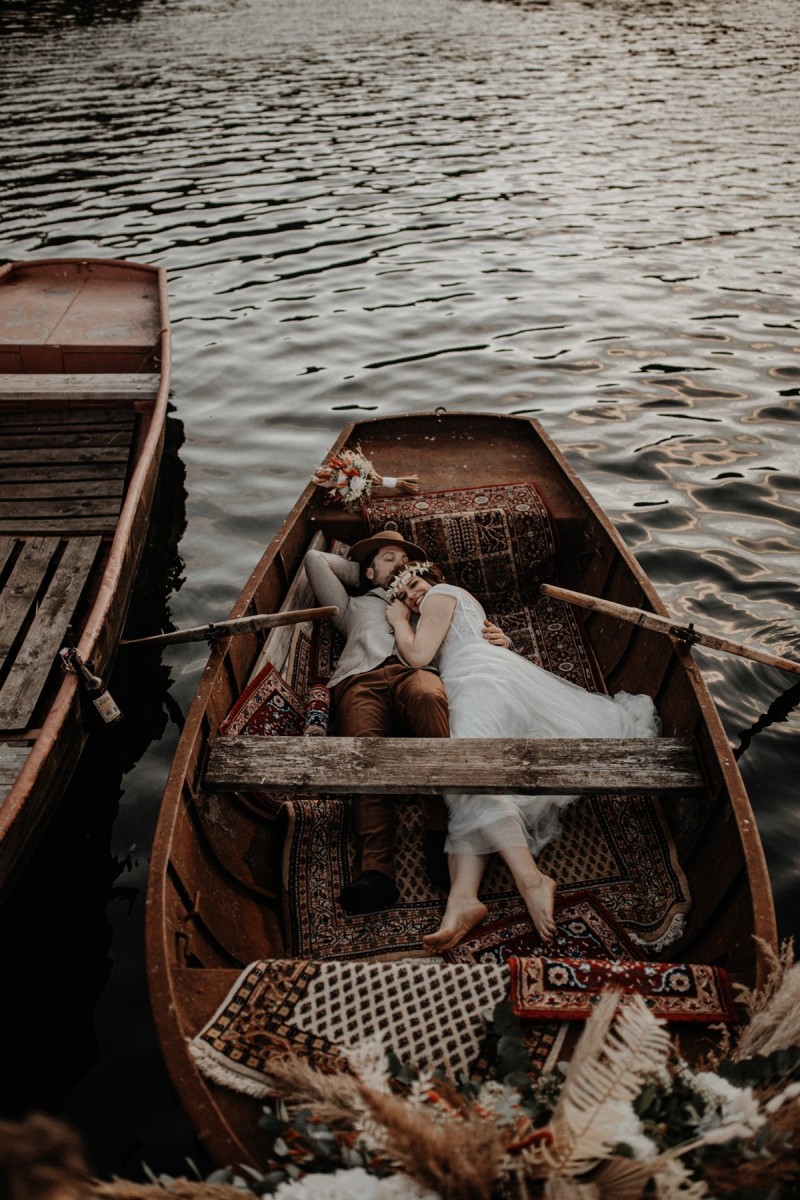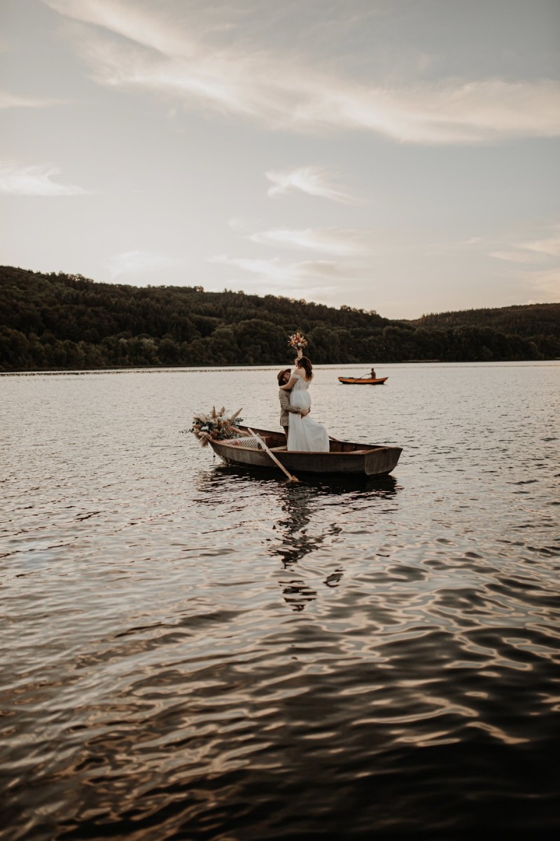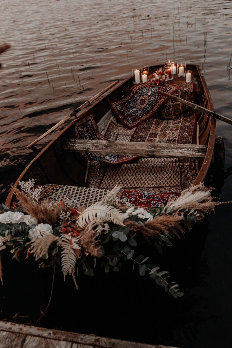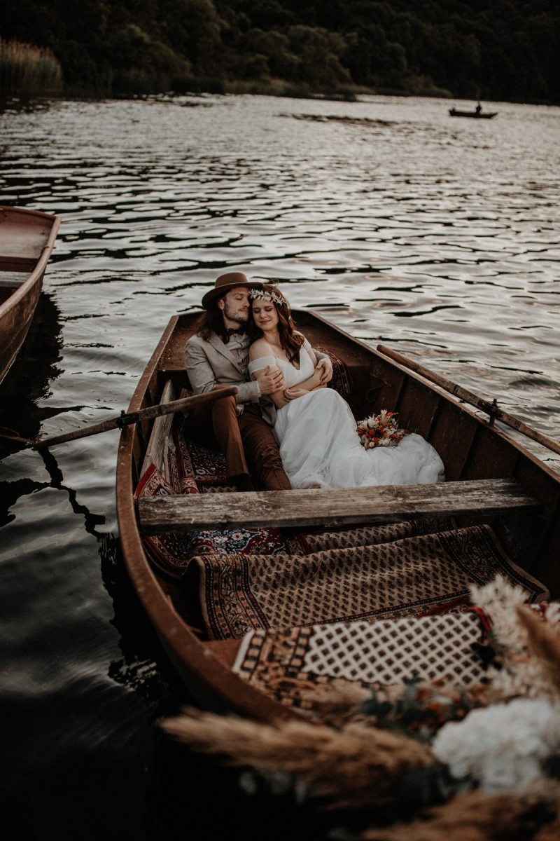 Und wer dachte, das wäre gerade der Schlusssatz gewesen – weit gefehlt! Wir legen noch eine Schippe drauf! Nach der romantischen Trauung bestiegen die beiden ein kleines, blumengeschmücktes Boot, das sie am Seeufer entlang trug. Nur die zwei, umgeben von ruhigem Wasser, den Bergen am Horizont und ein Bootssteg, der mit flackernden Kerzen auf sie wartete. Und wie kann man nach all den Highlights für uns, sowie die beiden, den Hochzeitstag gebührend abschließen? Stichwort: TRASH THE DRESS! So wild und frei wie ihre Elopement Wedding am See, sprang das Brautpaar Hand in Hand in der Abenddämmerung in den See. Ein grandioser Anblick! Aber seht selbst ihr Lieben! Genießt es!