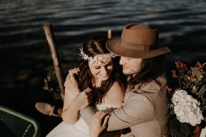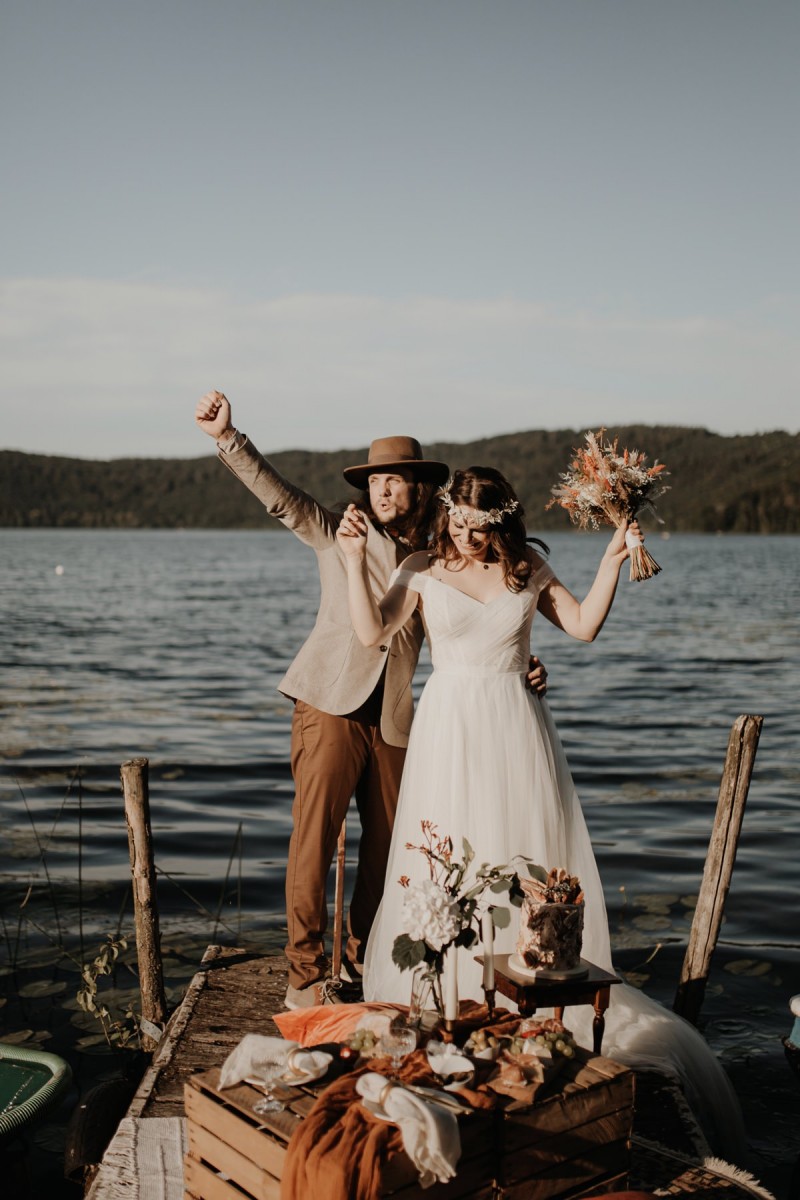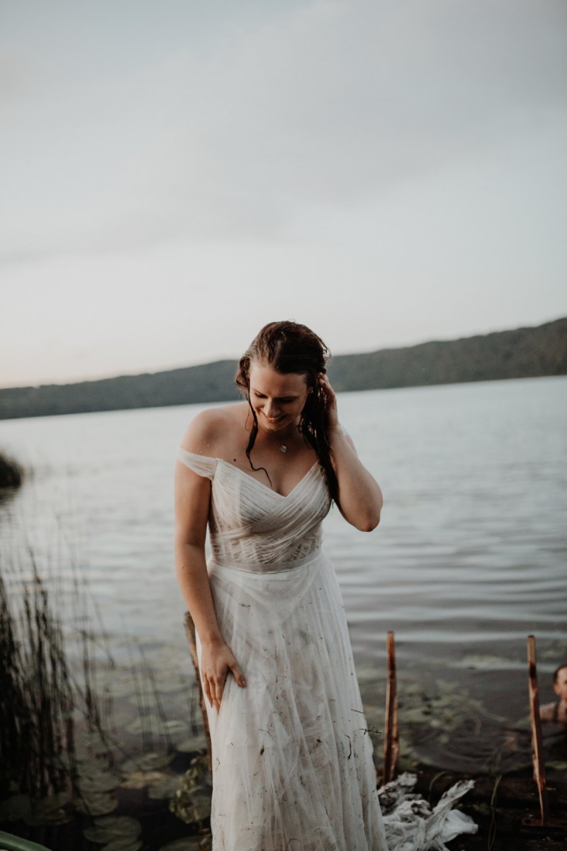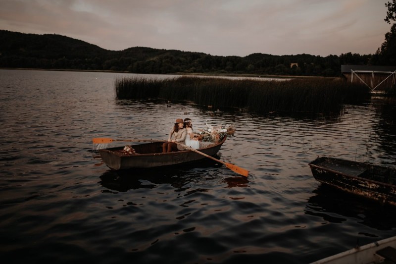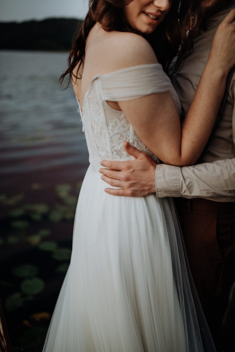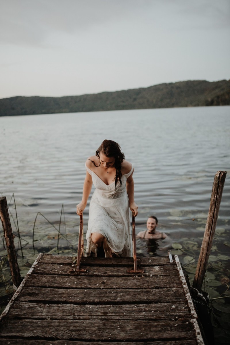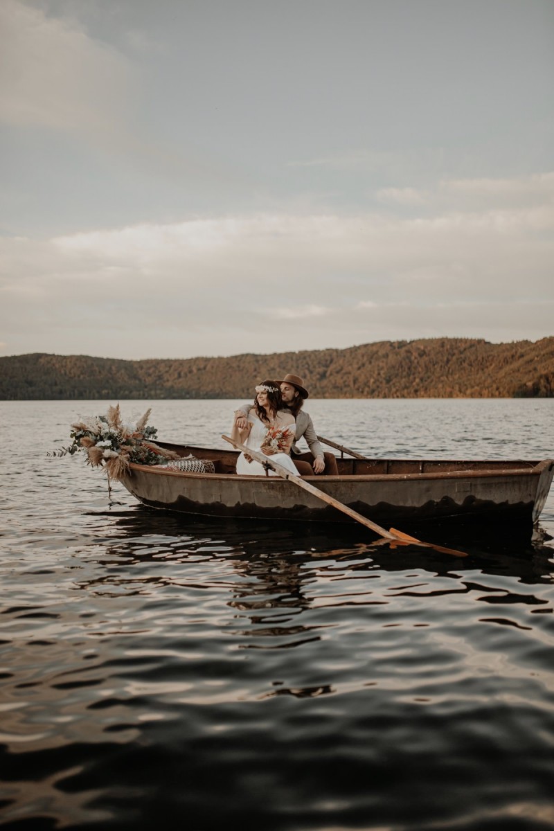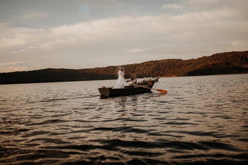 Und wer dachte, das wäre gerade der Schlusssatz gewesen – weit gefehlt! Wir legen noch eine Schippe drauf! Nach der romantischen Trauung bestiegen die beiden ein kleines, blumengeschmücktes Boot, das sie am Seeufer entlang trug. Nur die zwei, umgeben von ruhigem Wasser, den Bergen am Horizont und ein Bootssteg, der mit flackernden Kerzen auf sie wartete. Und wie kann man nach all den Highlights für uns, sowie die beiden, den Hochzeitstag gebührend abschließen? Stichwort: TRASH THE DRESS! So wild und frei wie ihre Elopement Wedding am See, sprang das Brautpaar Hand in Hand in der Abenddämmerung in den See. Ein grandioser Anblick! Aber seht selbst ihr Lieben! Genießt es!