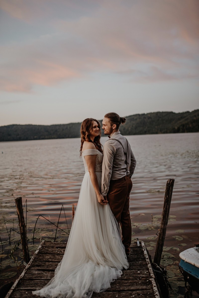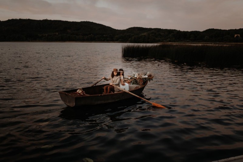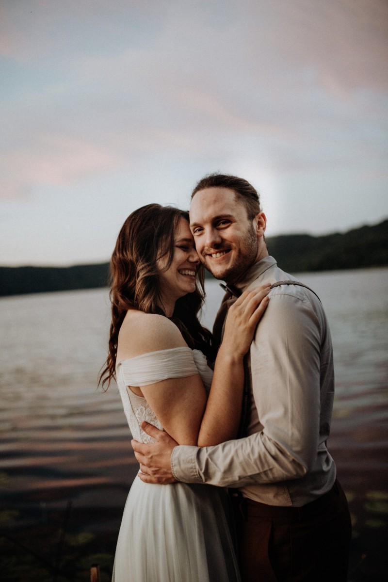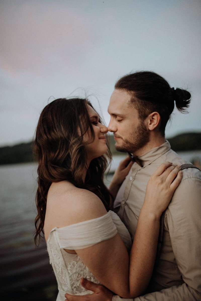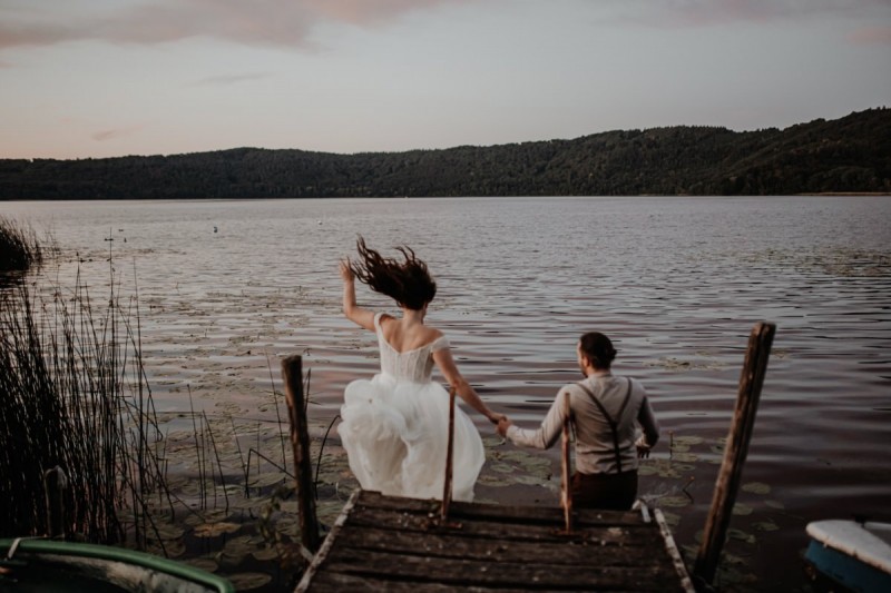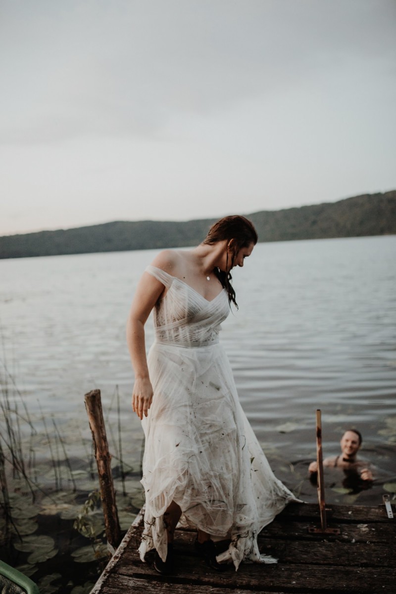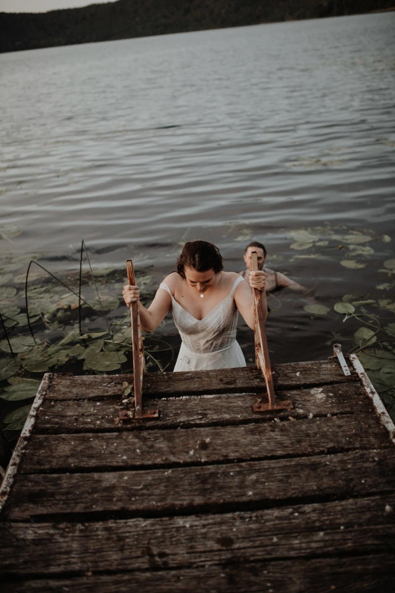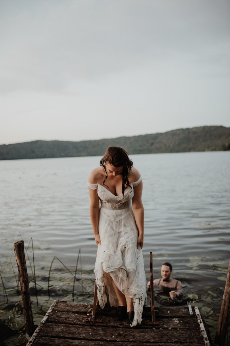 Und wer dachte, das wäre gerade der Schlusssatz gewesen – weit gefehlt! Wir legen noch eine Schippe drauf! Nach der romantischen Trauung bestiegen die beiden ein kleines, blumengeschmücktes Boot, das sie am Seeufer entlang trug. Nur die zwei, umgeben von ruhigem Wasser, den Bergen am Horizont und ein Bootssteg, der mit flackernden Kerzen auf sie wartete. Und wie kann man nach all den Highlights für uns, sowie die beiden, den Hochzeitstag gebührend abschließen? Stichwort: TRASH THE DRESS! So wild und frei wie ihre Elopement Wedding am See, sprang das Brautpaar Hand in Hand in der Abenddämmerung in den See. Ein grandioser Anblick! Aber seht selbst ihr Lieben! Genießt es!