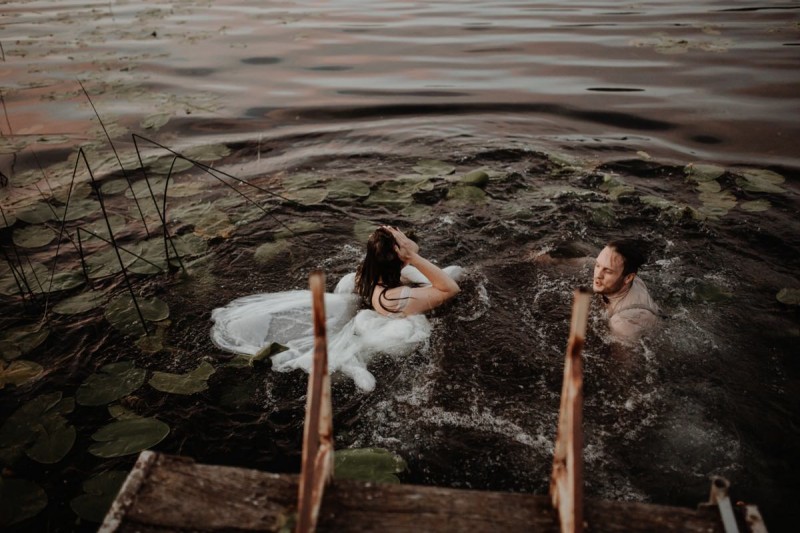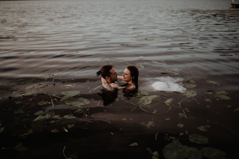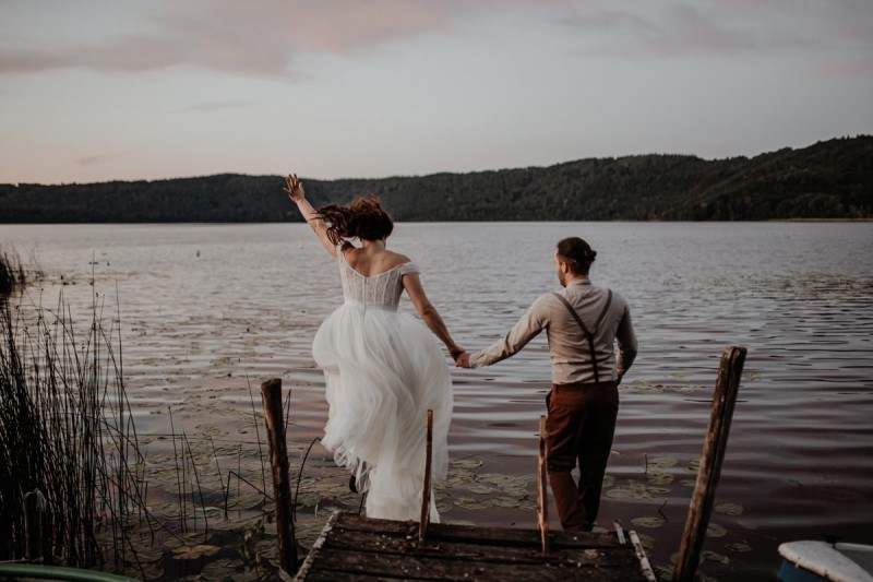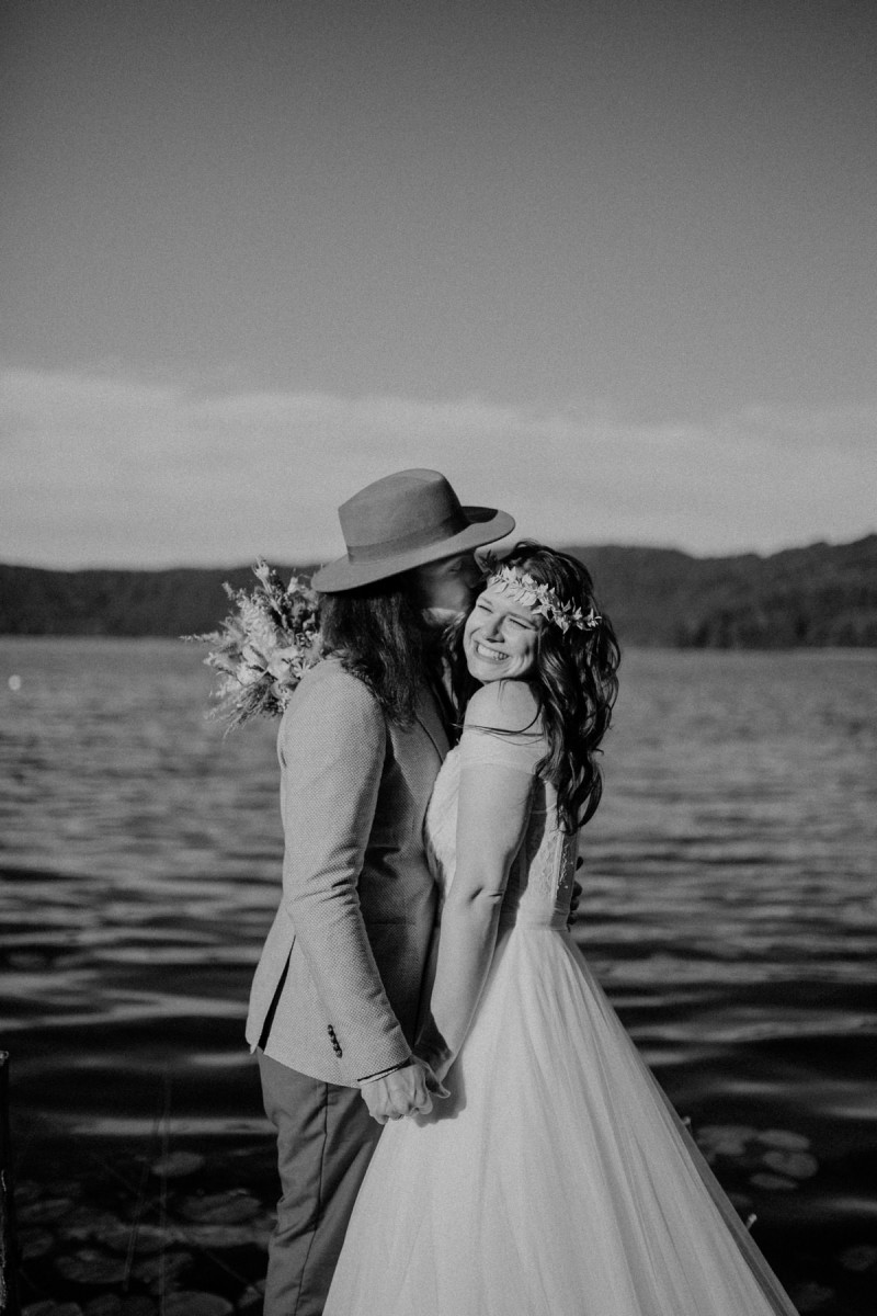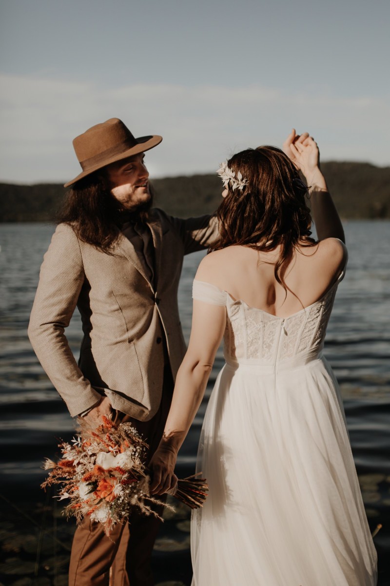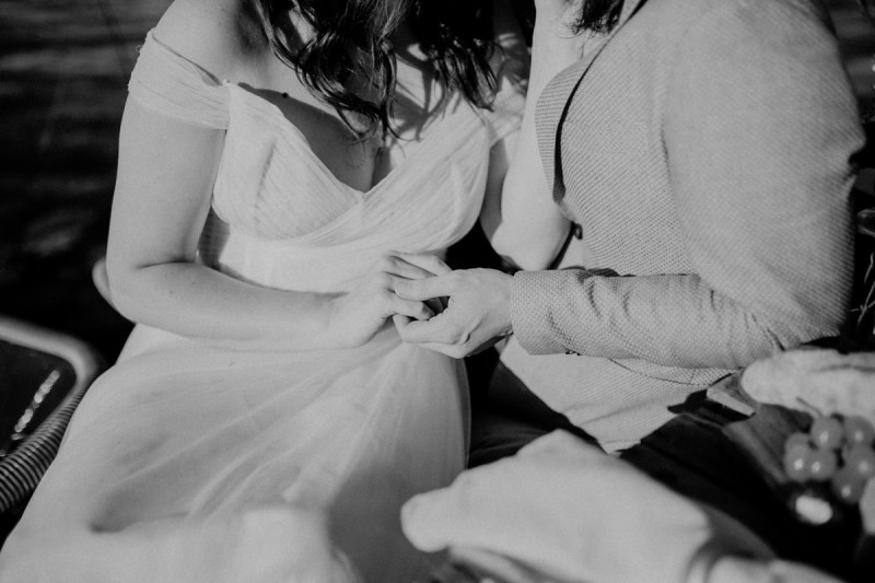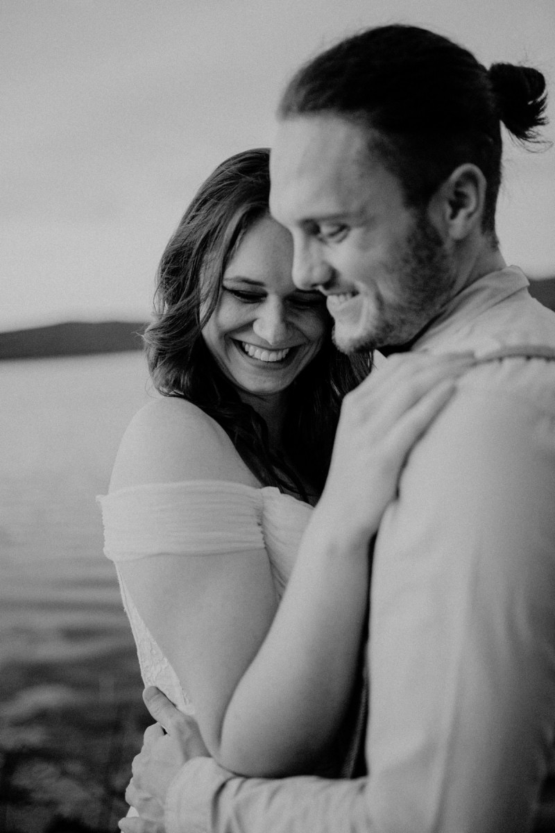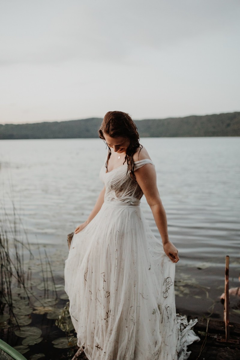 Und wer dachte, das wäre gerade der Schlusssatz gewesen – weit gefehlt! Wir legen noch eine Schippe drauf! Nach der romantischen Trauung bestiegen die beiden ein kleines, blumengeschmücktes Boot, das sie am Seeufer entlang trug. Nur die zwei, umgeben von ruhigem Wasser, den Bergen am Horizont und ein Bootssteg, der mit flackernden Kerzen auf sie wartete. Und wie kann man nach all den Highlights für uns, sowie die beiden, den Hochzeitstag gebührend abschließen? Stichwort: TRASH THE DRESS! So wild und frei wie ihre Elopement Wedding am See, sprang das Brautpaar Hand in Hand in der Abenddämmerung in den See. Ein grandioser Anblick! Aber seht selbst ihr Lieben! Genießt es!