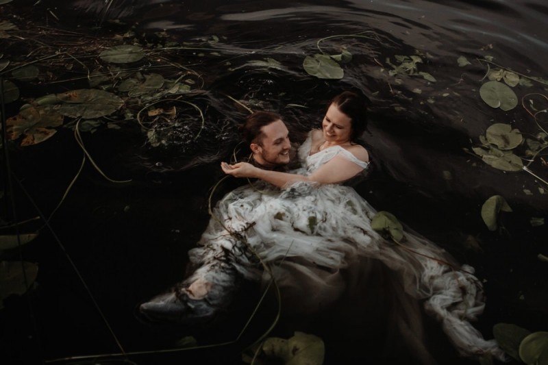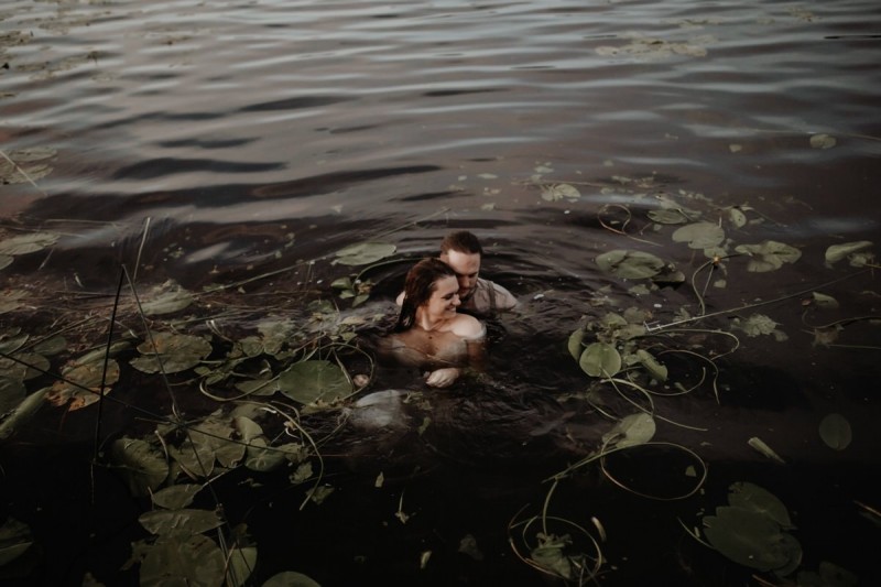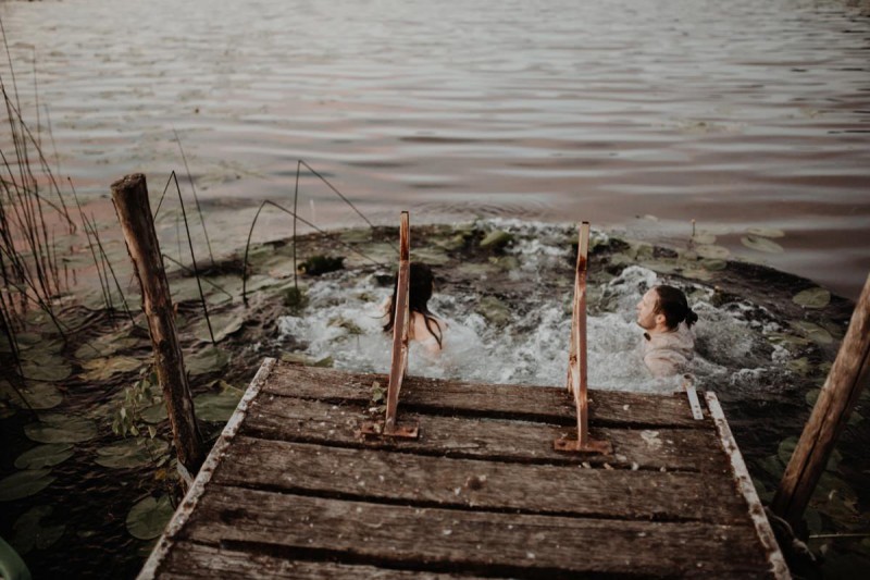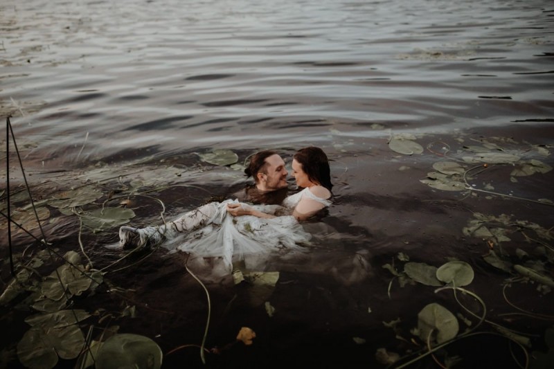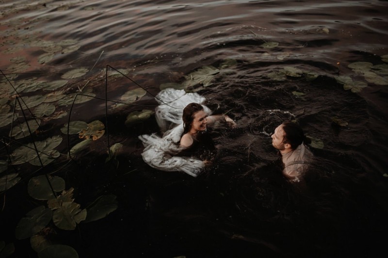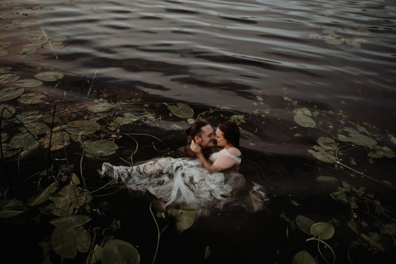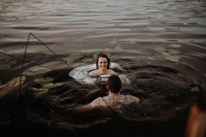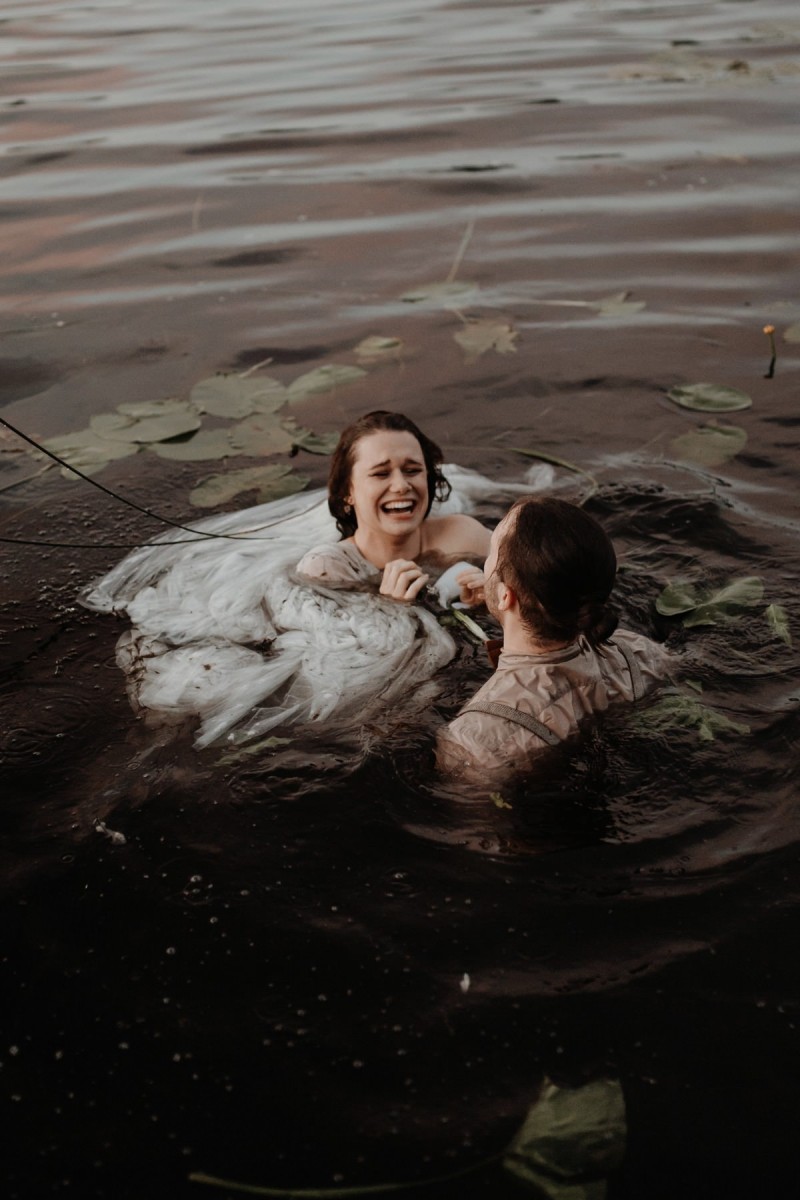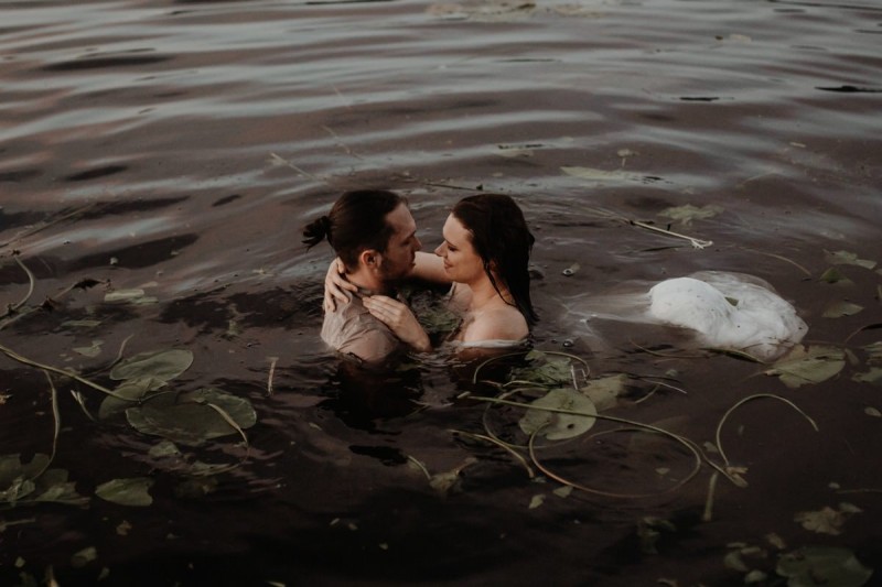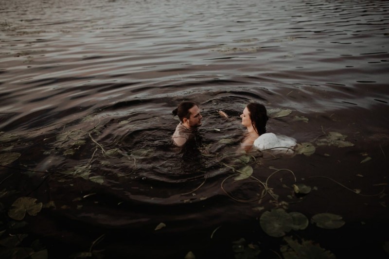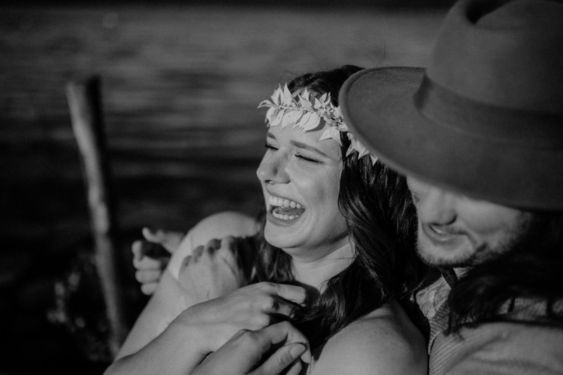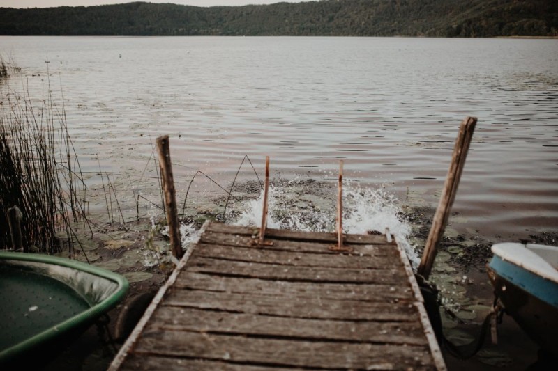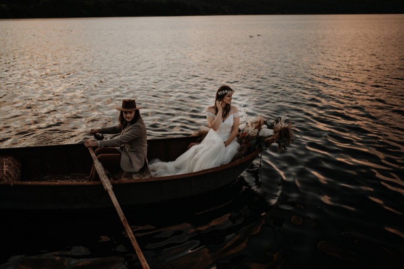 Und wer dachte, das wäre gerade der Schlusssatz gewesen – weit gefehlt! Wir legen noch eine Schippe drauf! Nach der romantischen Trauung bestiegen die beiden ein kleines, blumengeschmücktes Boot, das sie am Seeufer entlang trug. Nur die zwei, umgeben von ruhigem Wasser, den Bergen am Horizont und ein Bootssteg, der mit flackernden Kerzen auf sie wartete. Und wie kann man nach all den Highlights für uns, sowie die beiden, den Hochzeitstag gebührend abschließen? Stichwort: TRASH THE DRESS! So wild und frei wie ihre Elopement Wedding am See, sprang das Brautpaar Hand in Hand in der Abenddämmerung in den See. Ein grandioser Anblick! Aber seht selbst ihr Lieben! Genießt es!