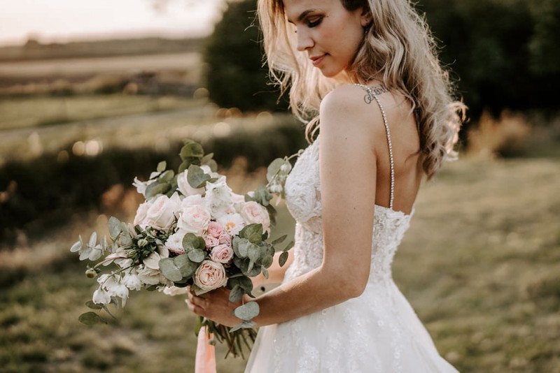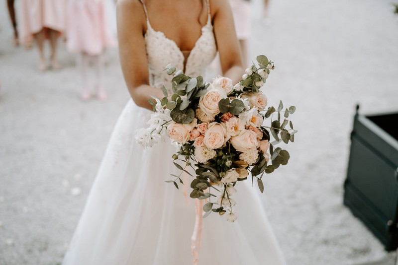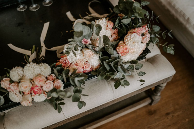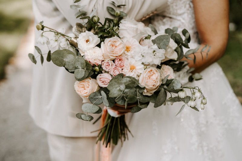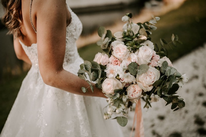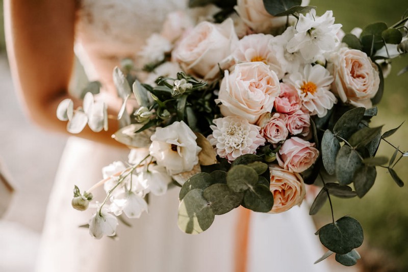 Diese feine Brautstrauß Inspiration entstammt einer romantischen Hochzeit im Schloss Gastrop. Die einmalige Schlossromantik findet sich im wunderschönen Brautstrauß der hübschen Braut wieder. Große David Austin Roses und verzweigte Garden Roses treffen hier auf zarte Dahlien und Butterfly-Ranunkeln. Der weiße Rittersporn gibt dem Strauß eine wilde Raffinesse, die durch den großblättrigen Eukalyptus perfekt abgerundet wird. Ein wilder und zugleich zarter Brautstrauß, der die edle Schlossromantik mit federleichten Bohovibes vereint.